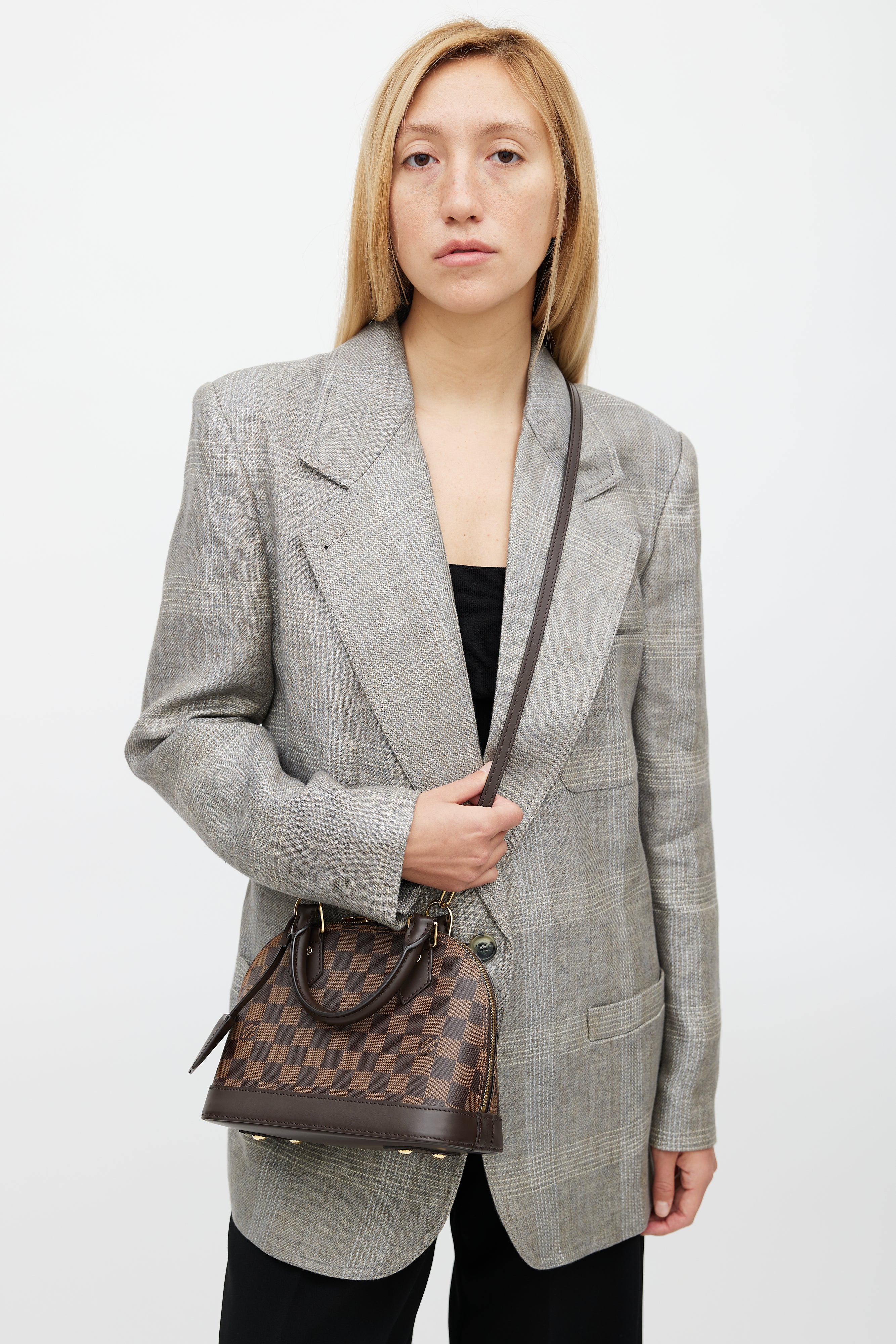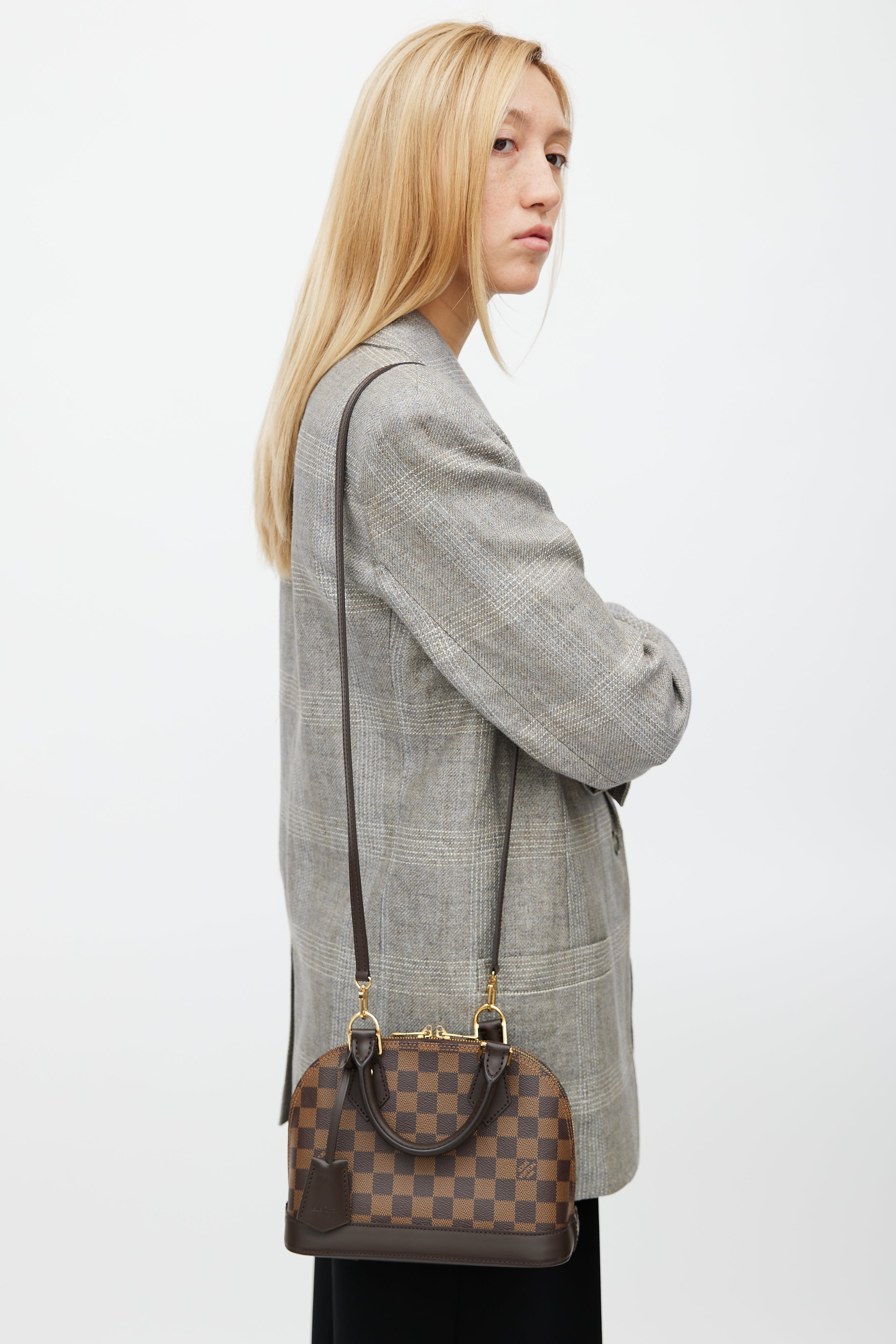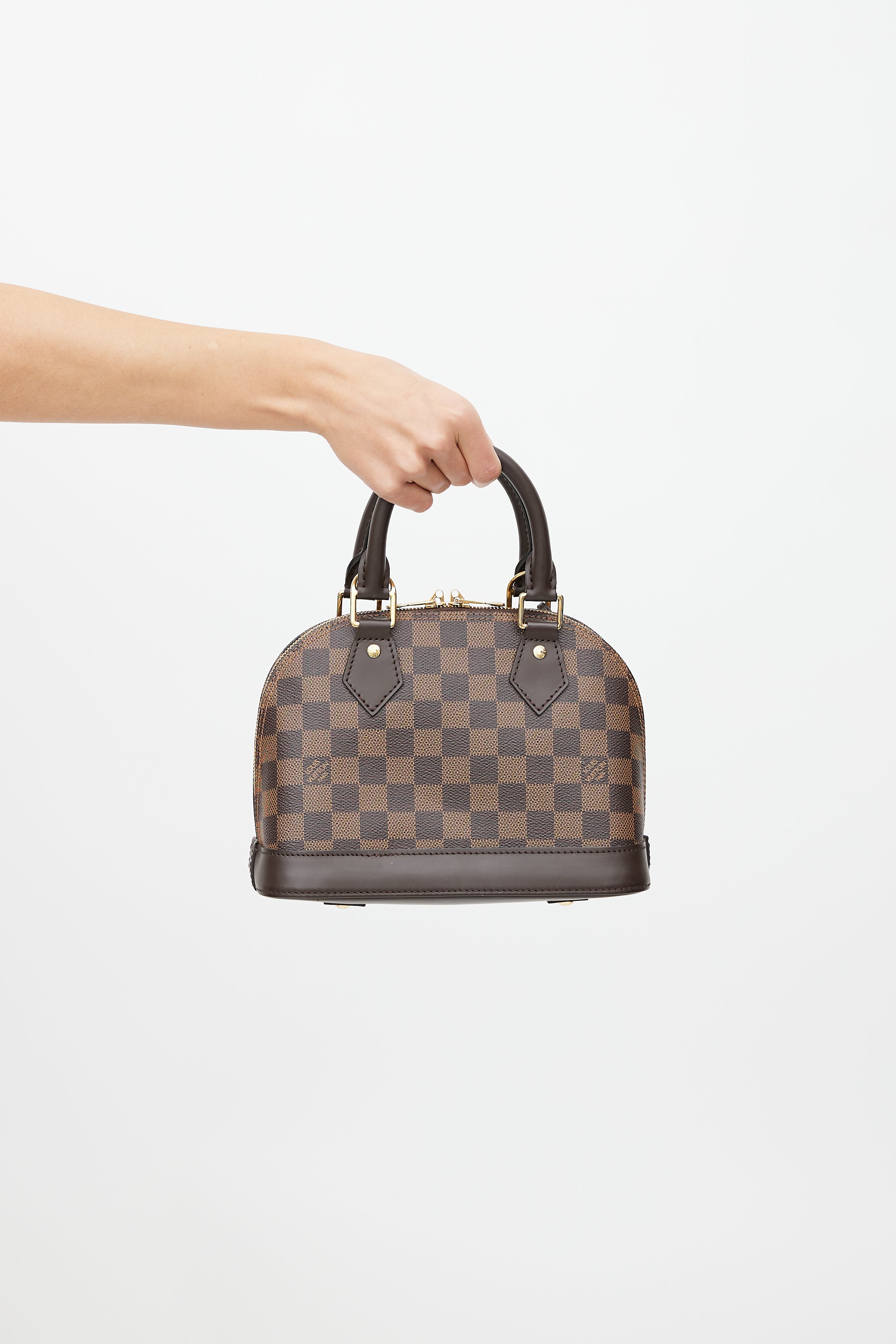 Pre-owned Louis Vuitton brown Alma BB crossbody bag featuring Damier Ebene coated canvas, brown smooth leather trim, two rolled top handles, detachable key and clochette, gold tone hardware, metal protective feet, zip closure at top, detachable fixed shoulder strap, red microfibre lining, and one slip pocket inside. Comes with original dust bag and box.