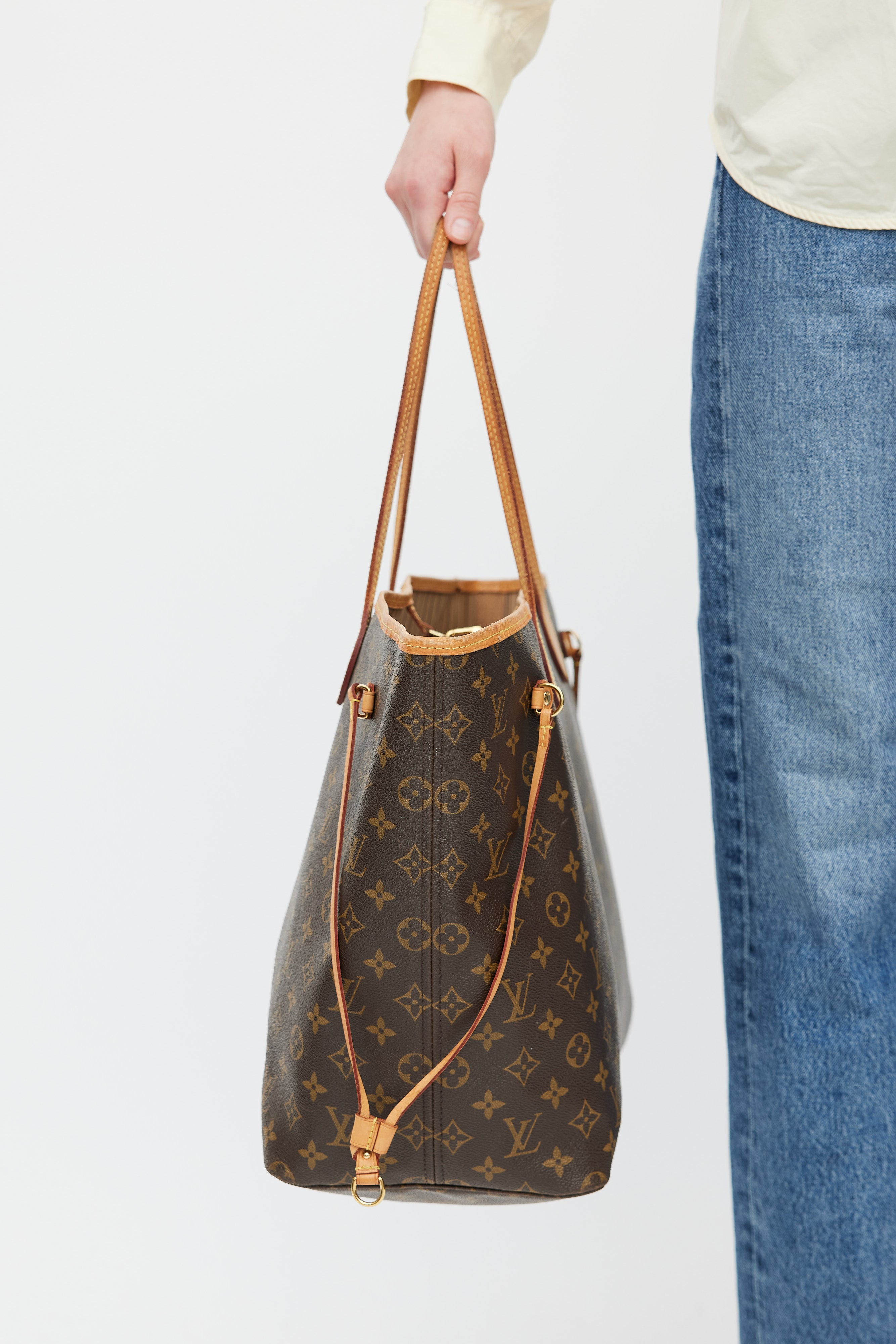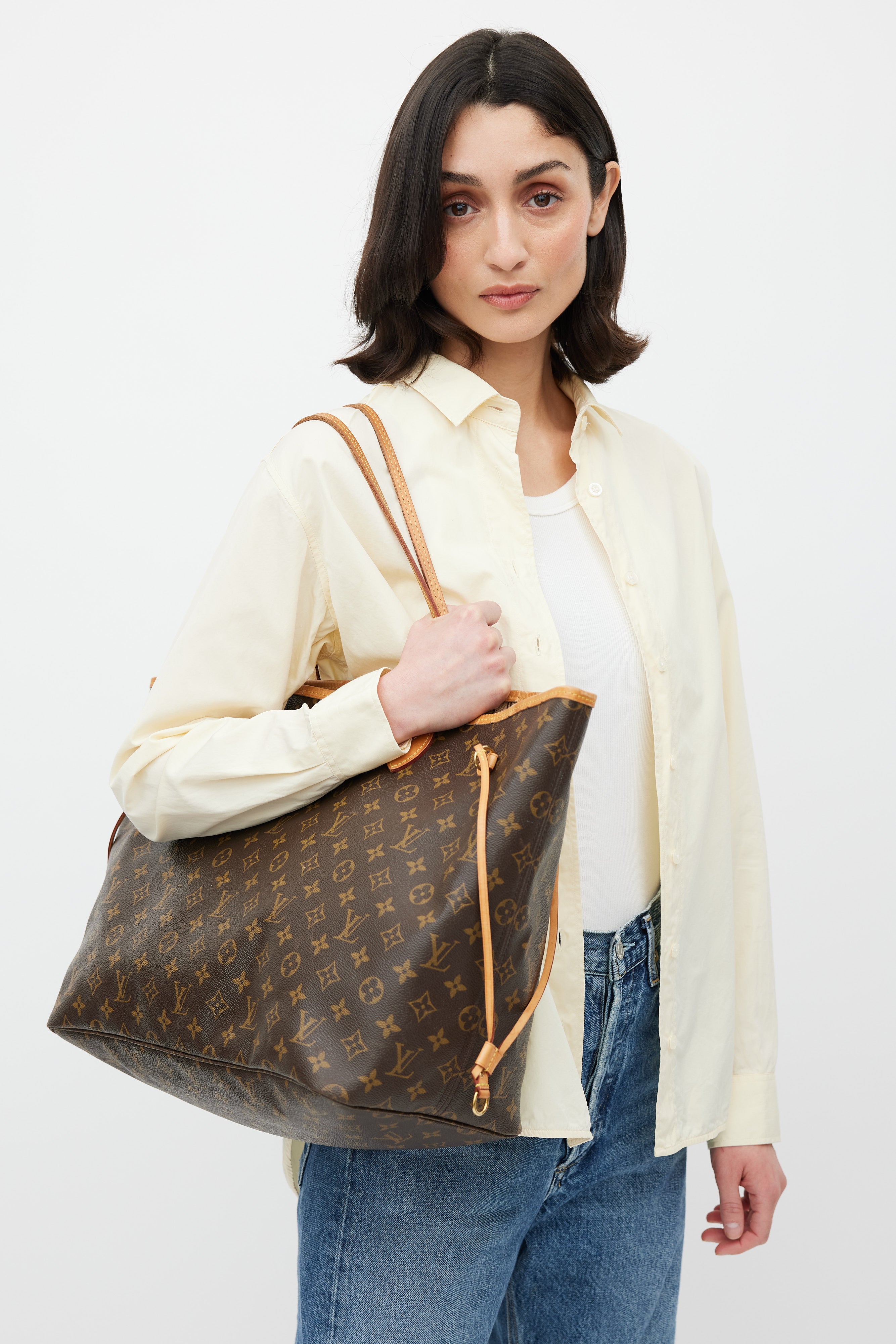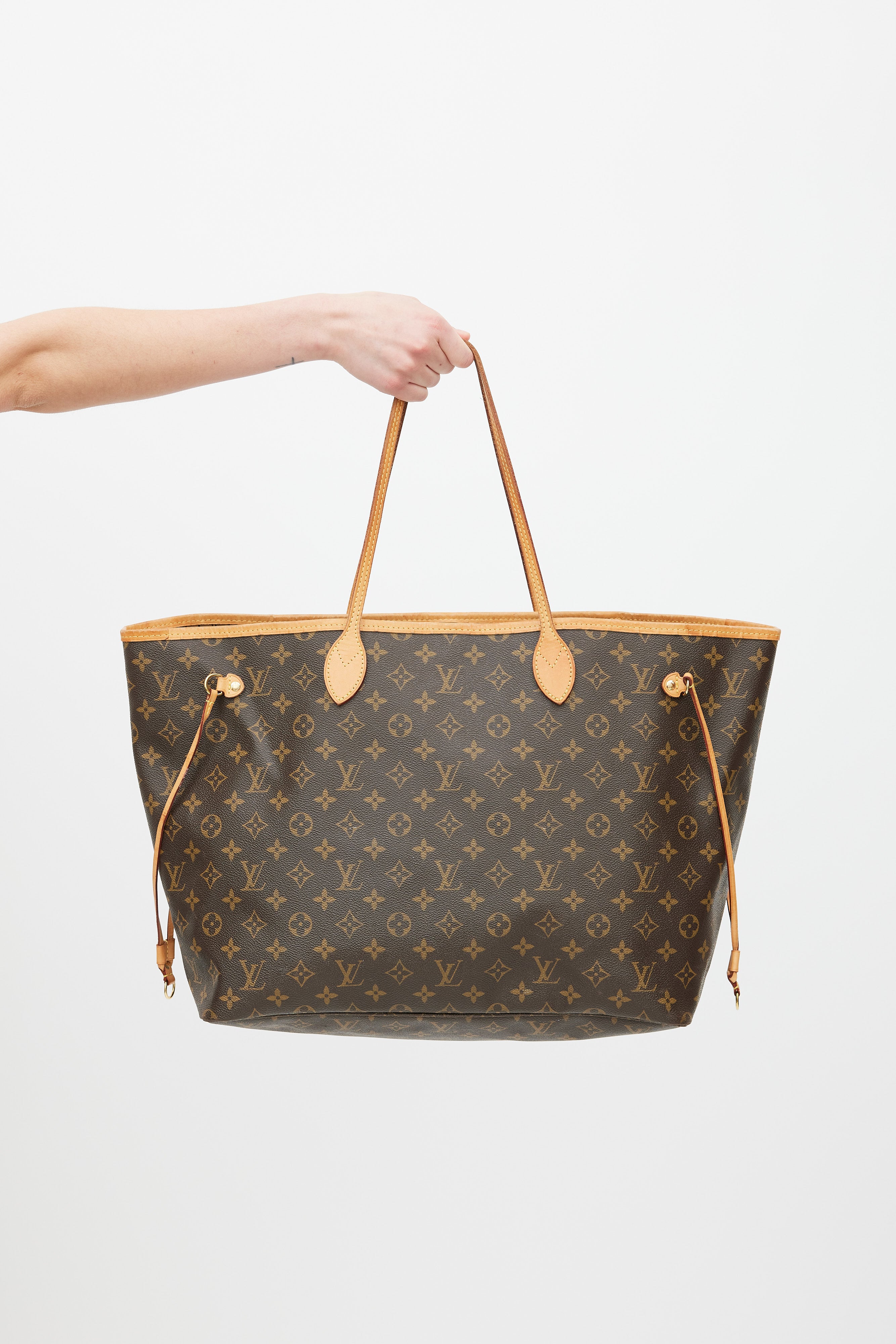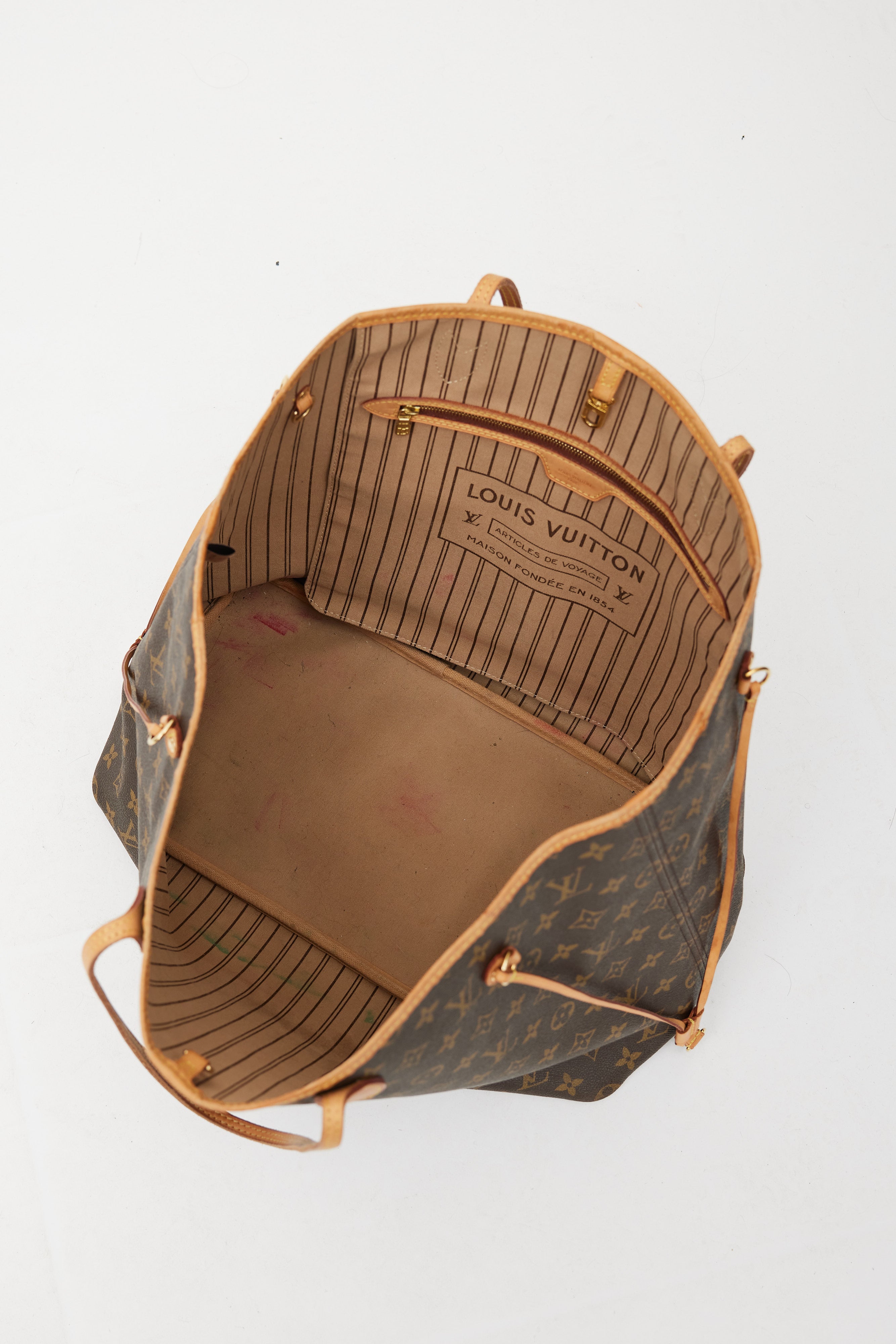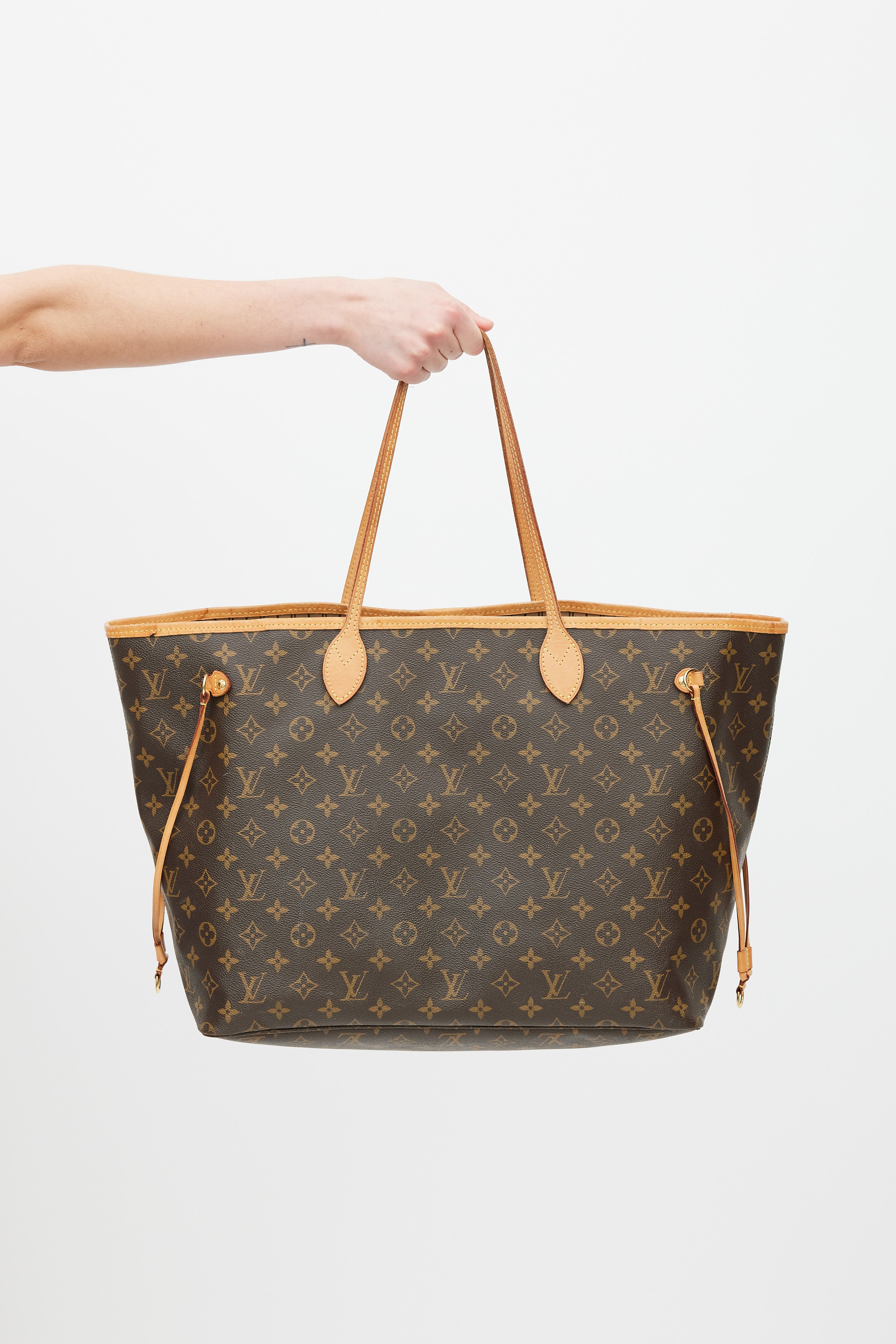Pre-owned Louis Vuitton brown Neverfull tote bag featuring gold tone hardware, iconic monogram coated canvas at exterior, four side laces, natural cowhide-leather trim, zipped pouch at interior, and hook closure.