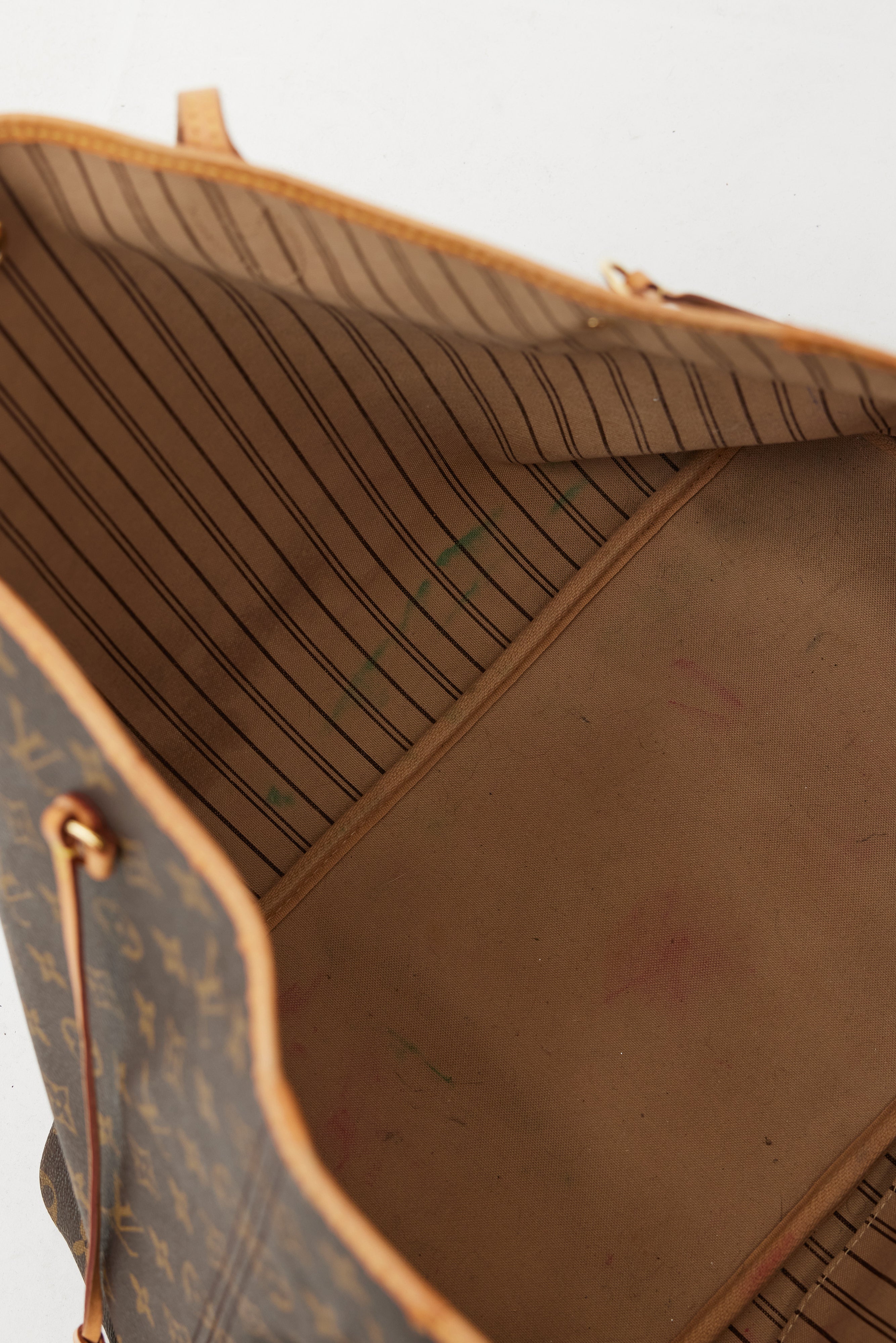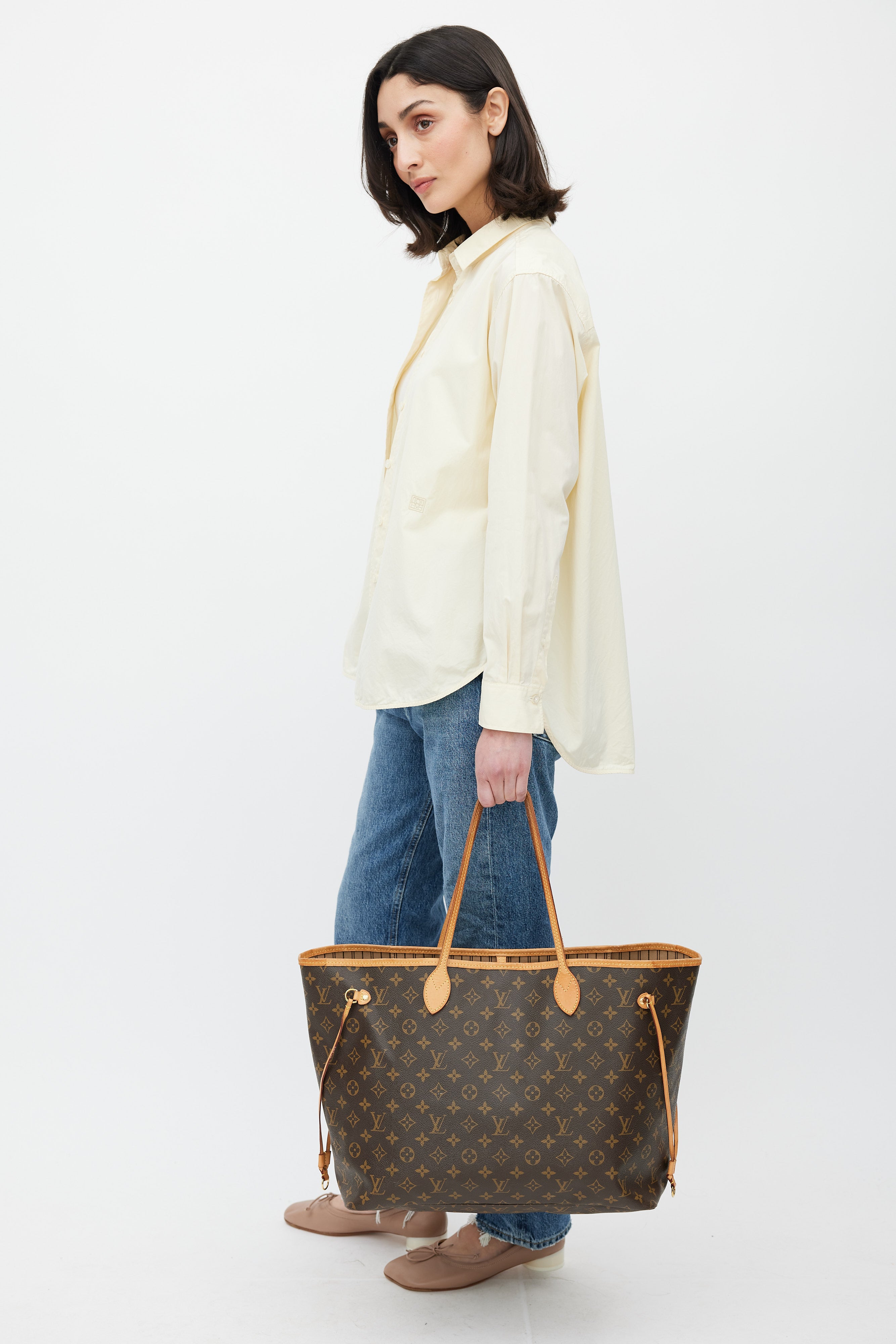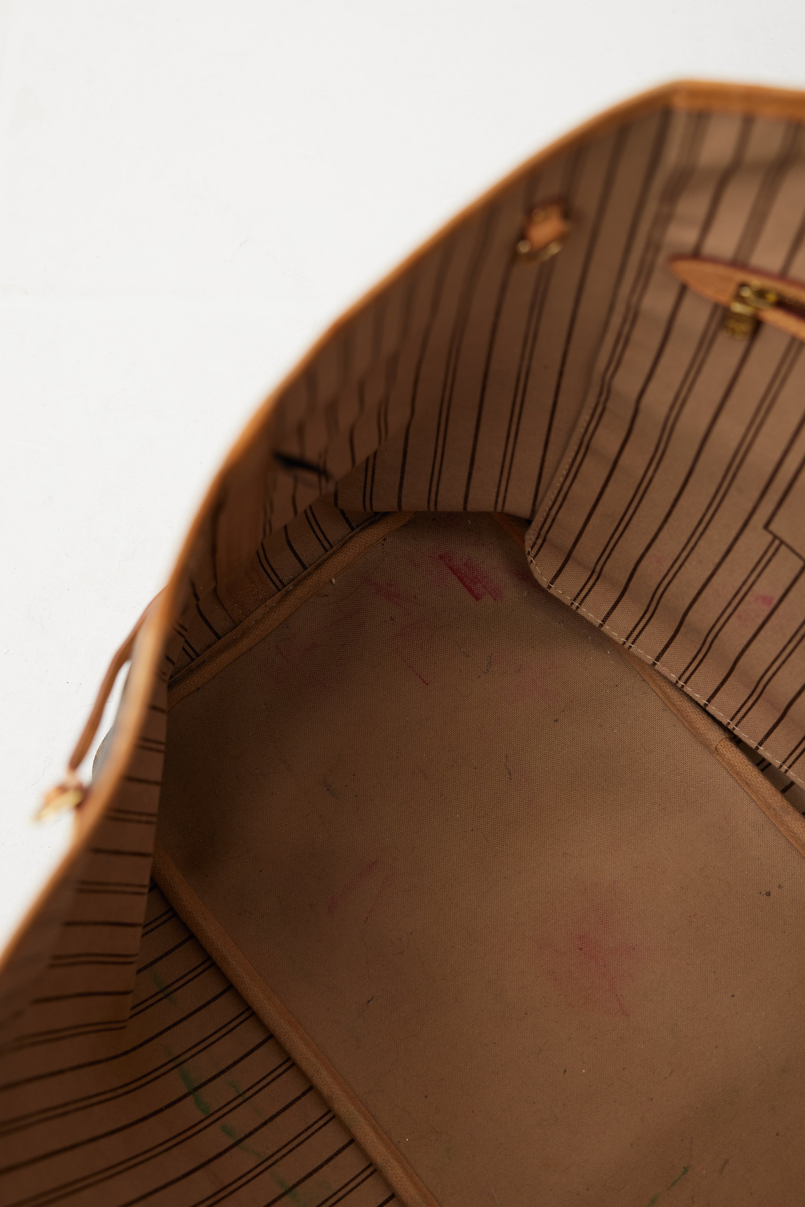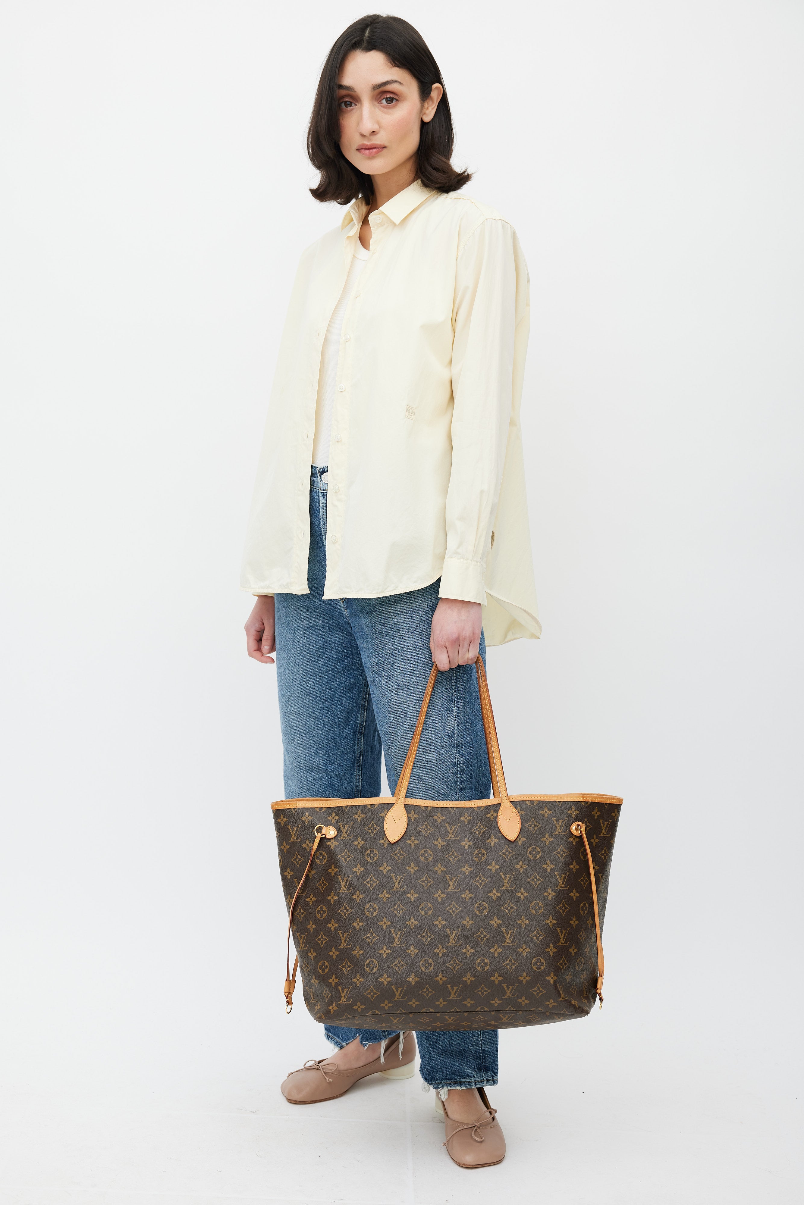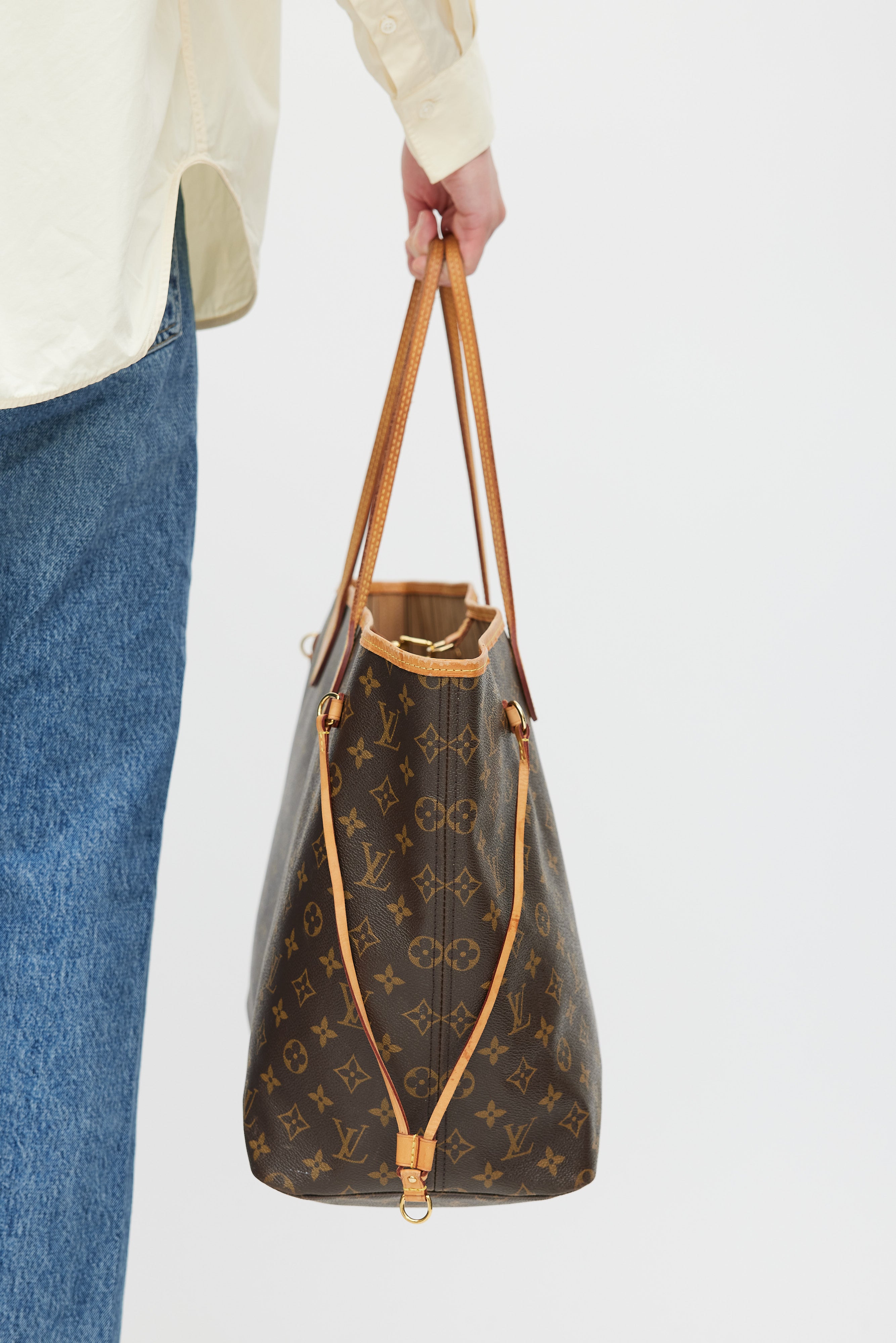 Pre-owned Louis Vuitton brown Neverfull tote bag featuring gold tone hardware, iconic monogram coated canvas at exterior, four side laces, natural cowhide-leather trim, zipped pouch at interior, and hook closure.