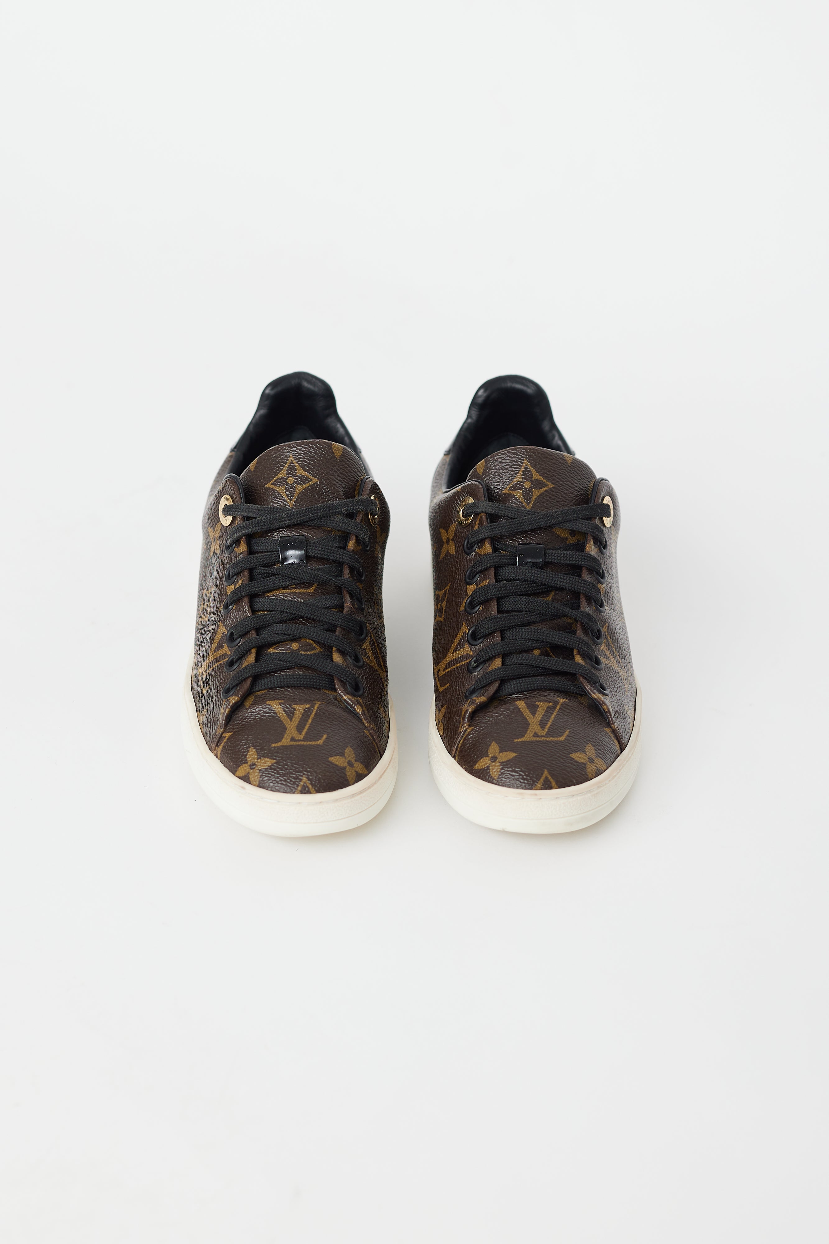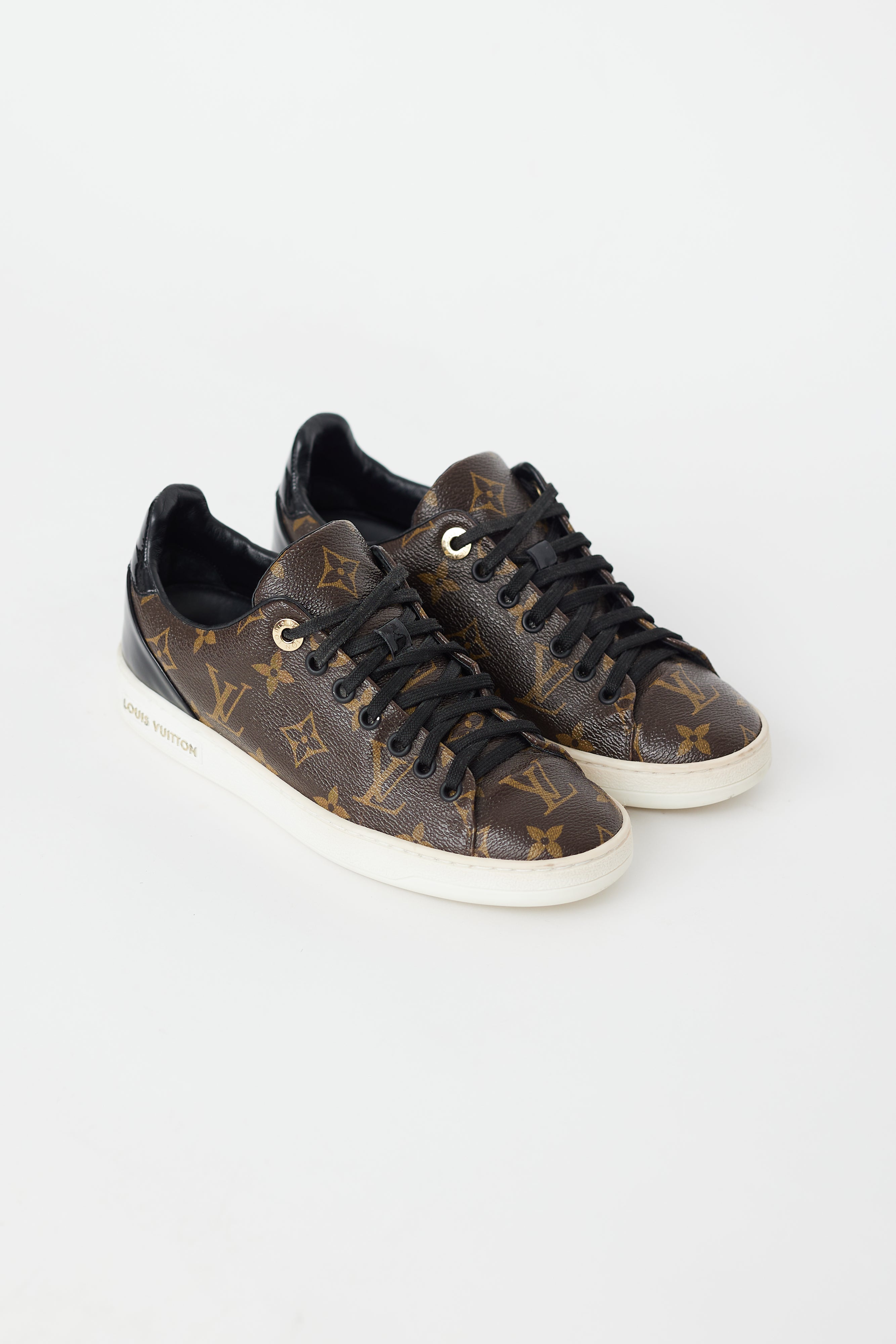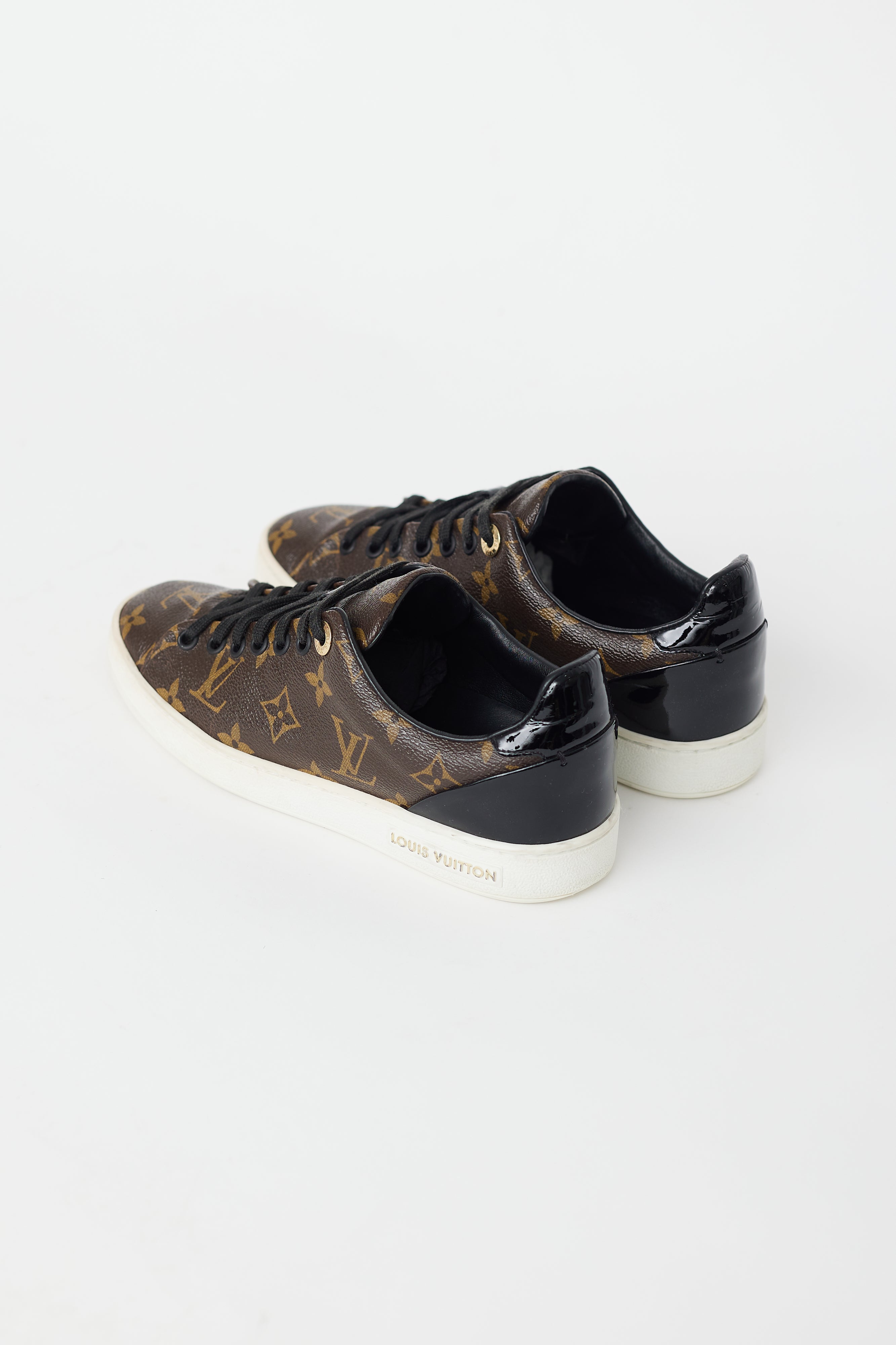 Pre-owned Louis Vuitton brown Frontrow sneakers featuring rounded toe, Monogram coated canvas upper, lace up front, black patent leather heel counter, and gold tone logo at outer midsole. Comes with original dust bag.