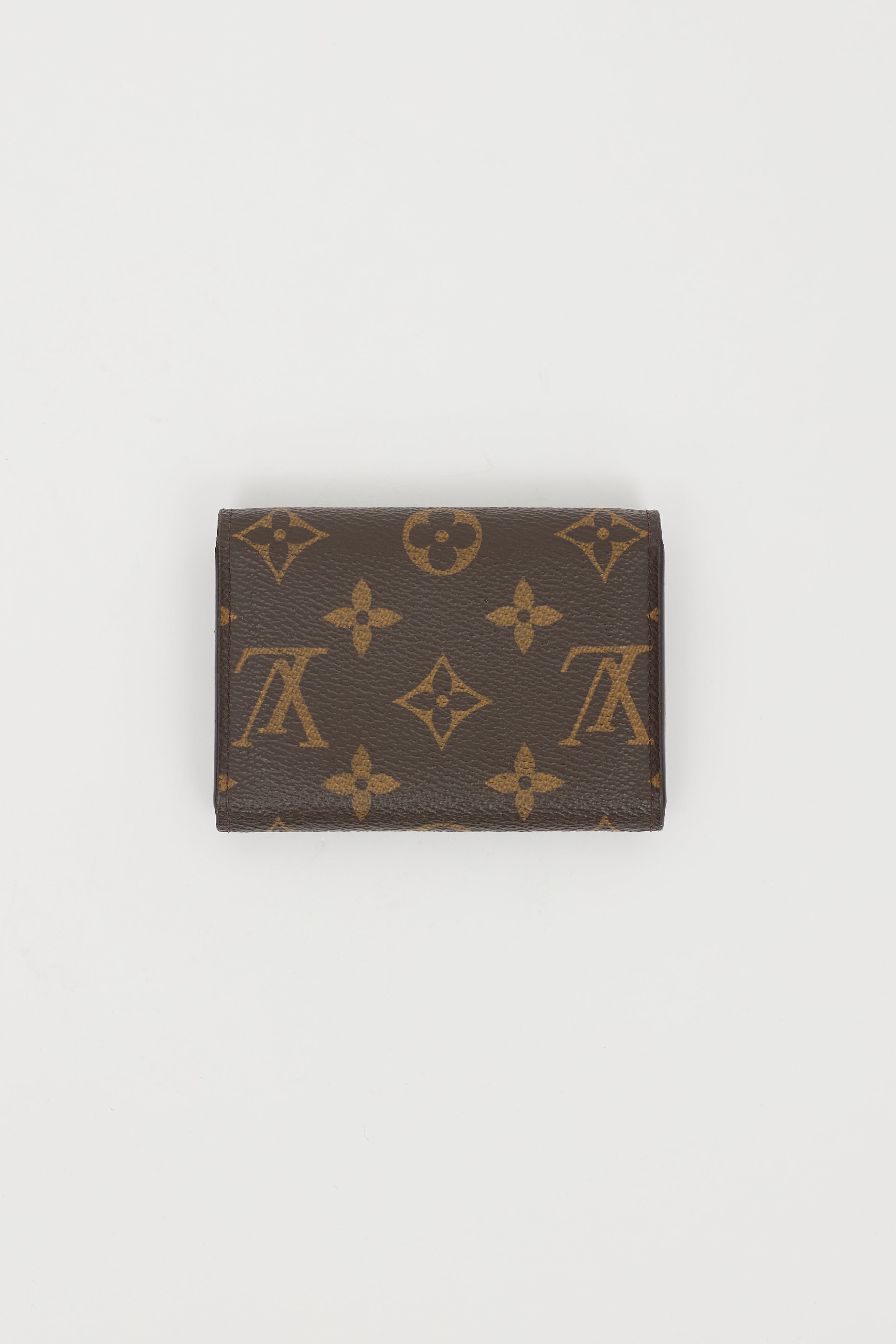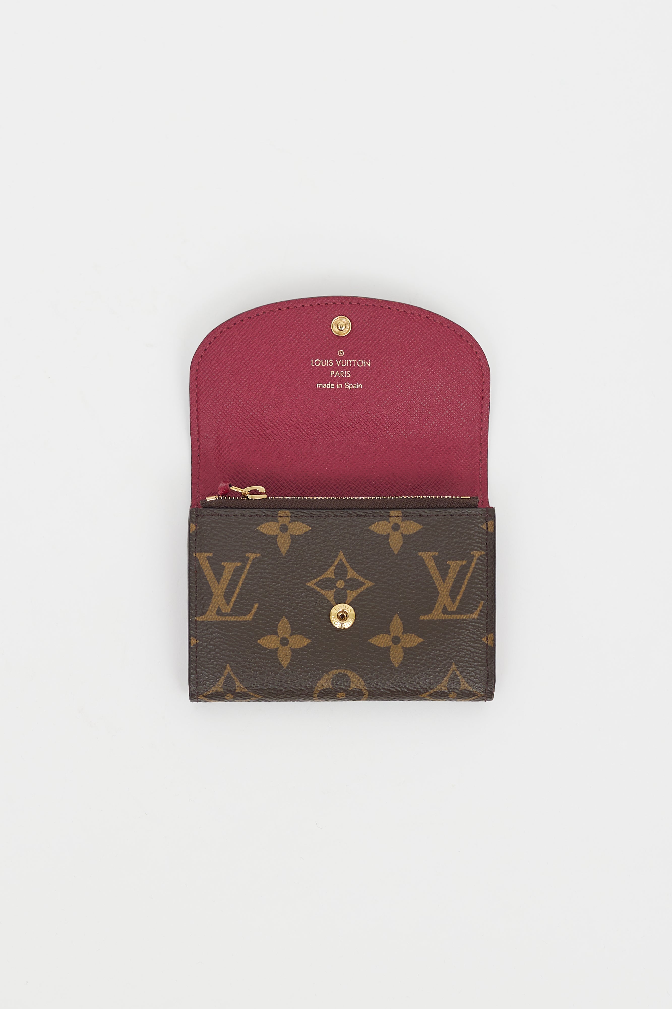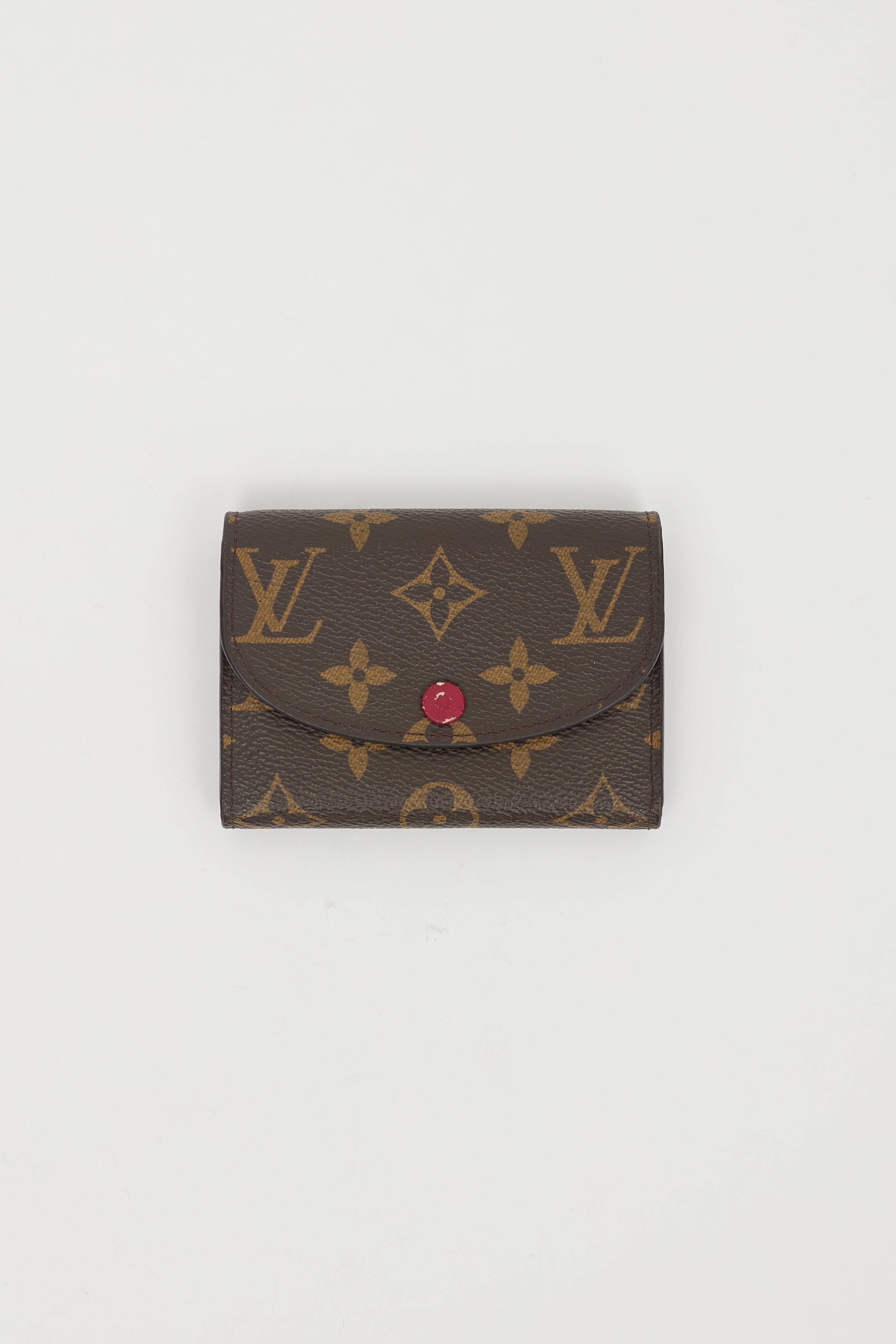 Pre-owned Louis Vuitton brown Rosalie coin purse featuring Monogram coated canvas, snap button closure, burgundy leather lining, one main compartment, one zip pocket, and three card slots. Comes with original dust bag and box.