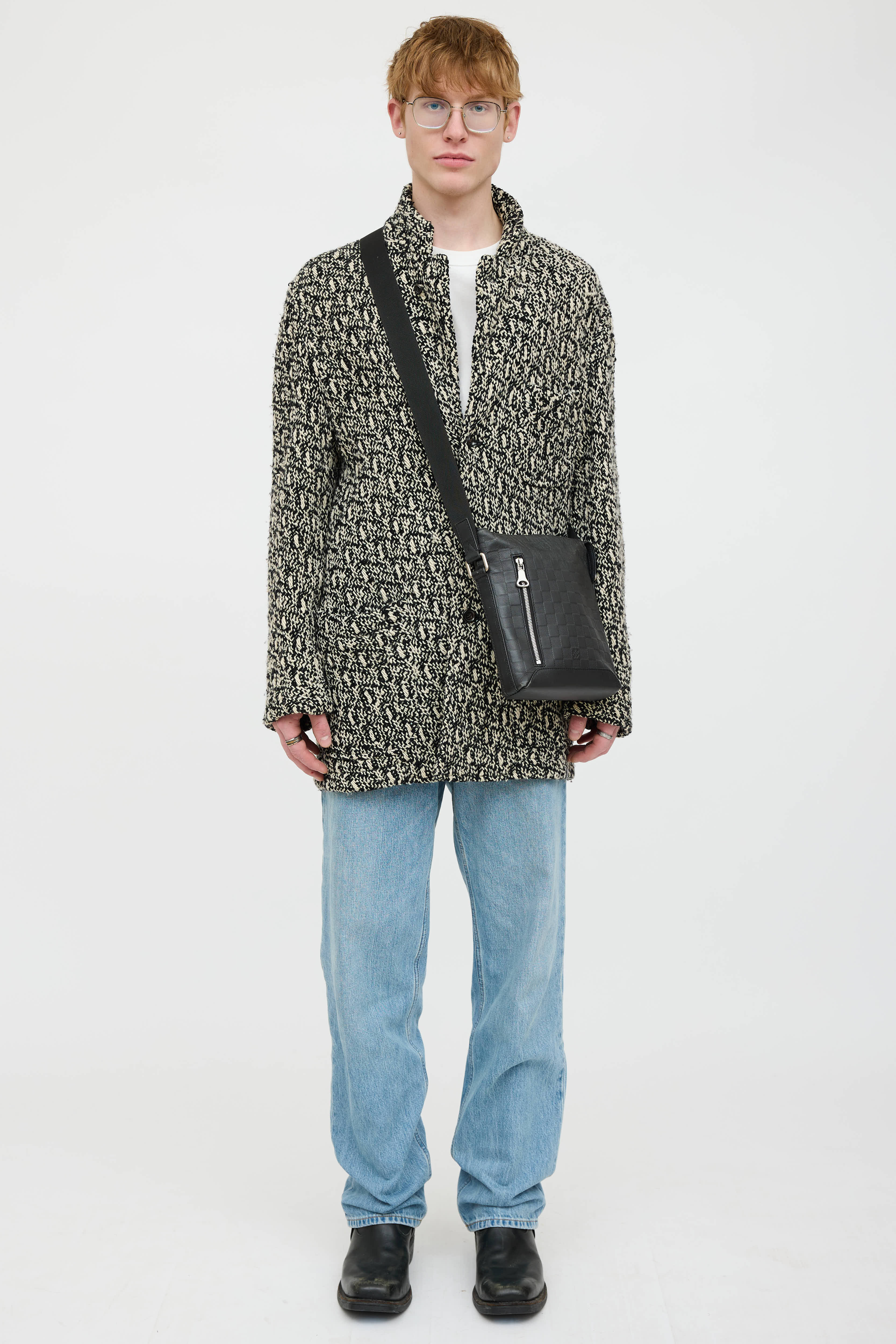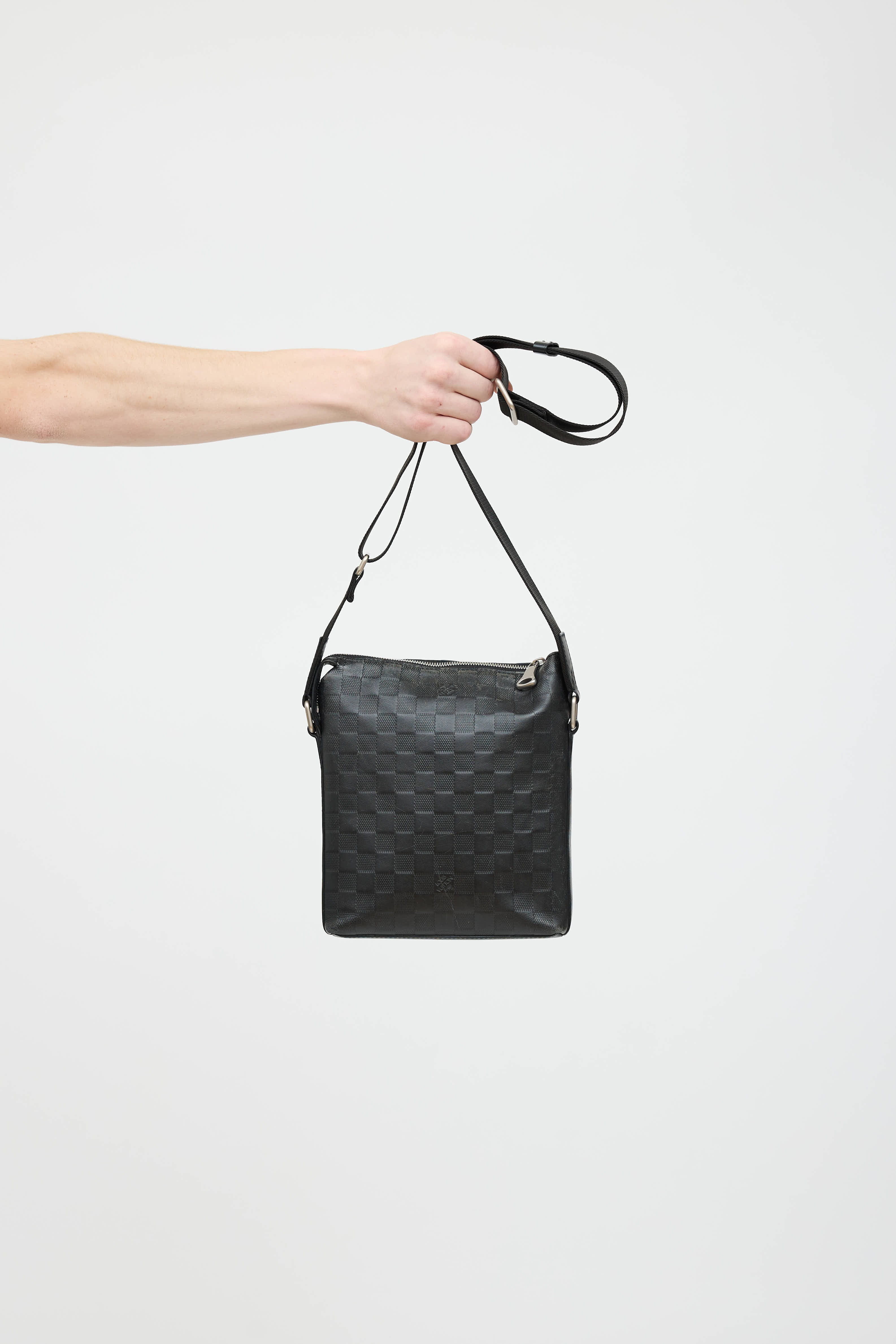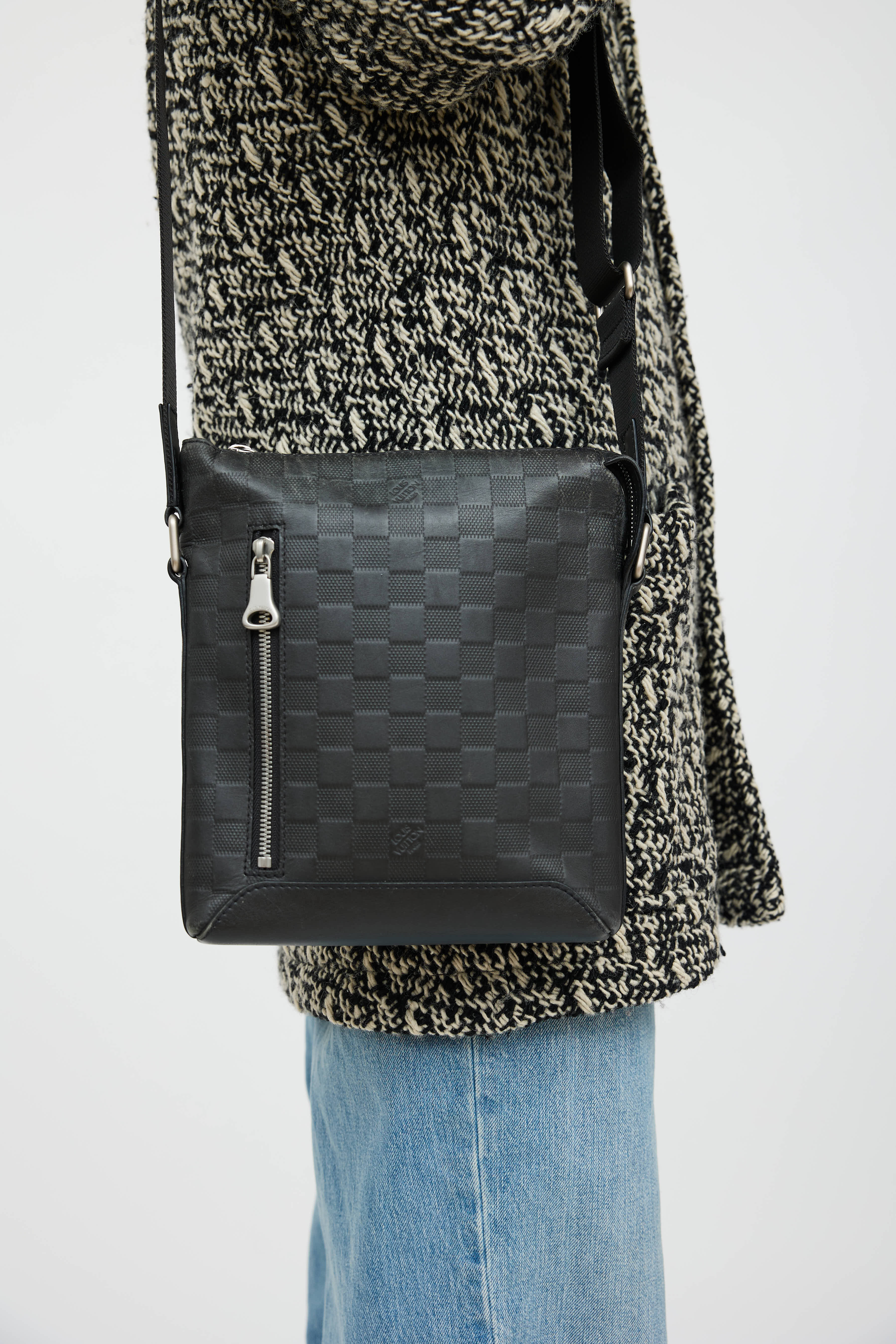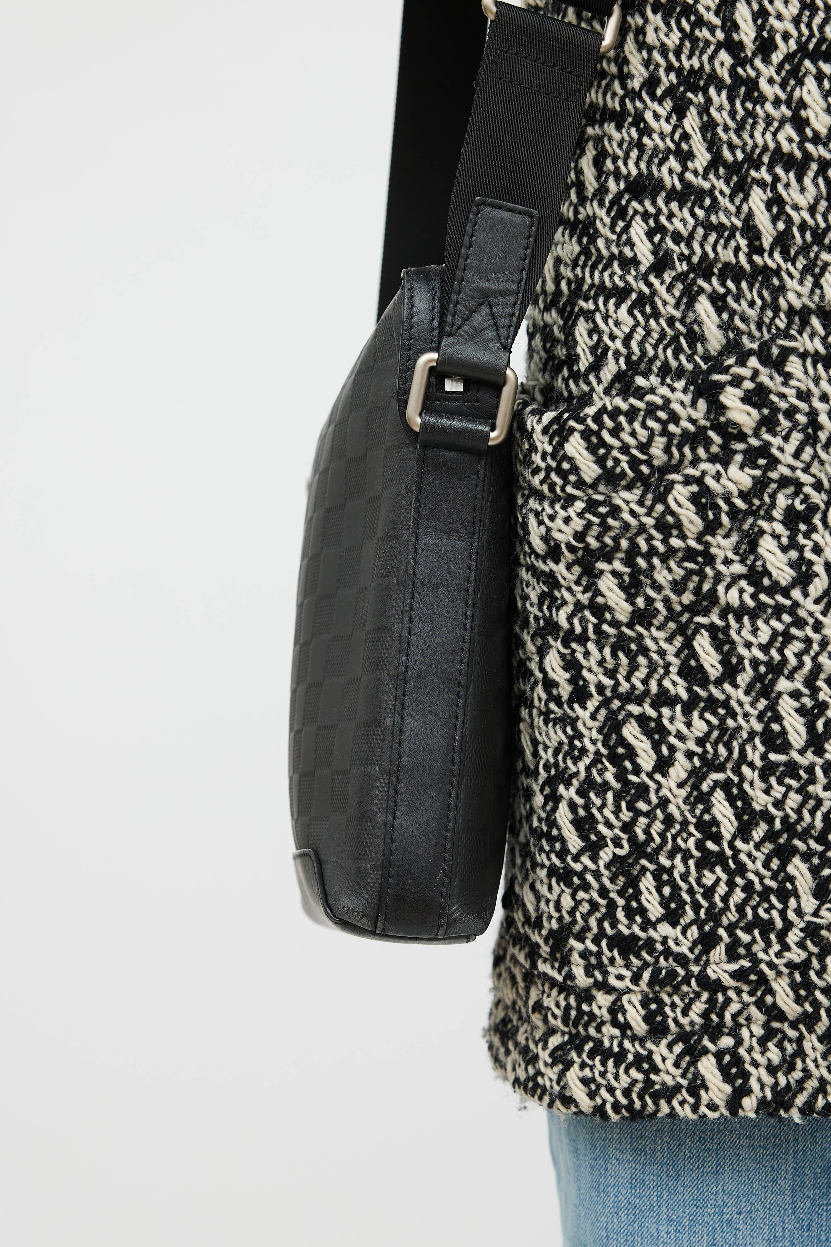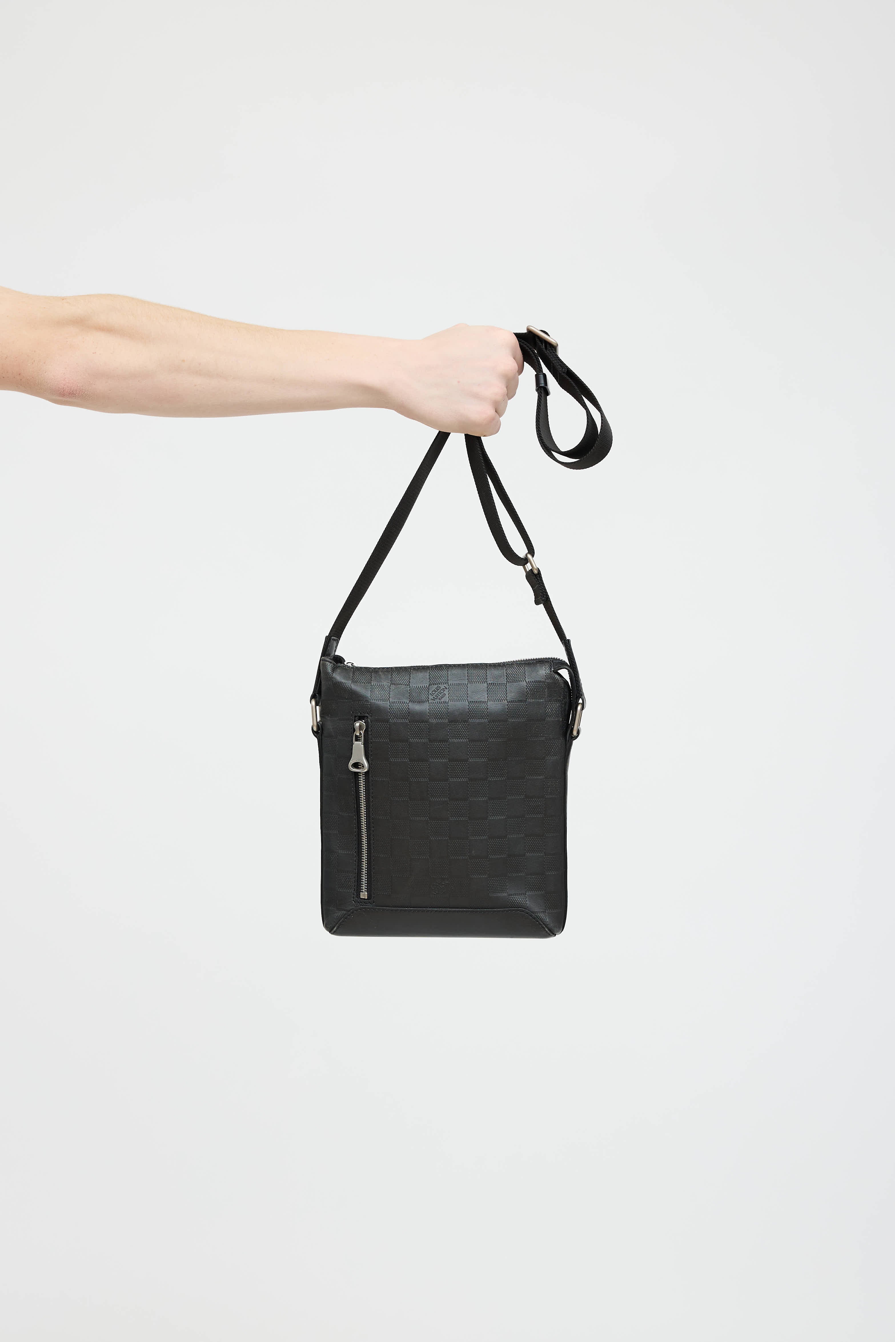Pre-owned Louis Vuitton black Discovery messenger bag featuring adjustable webbed crossbody strap, silver tone hardware, zip pocket at front, top zip closure with one main compartment, and one slip pocket.