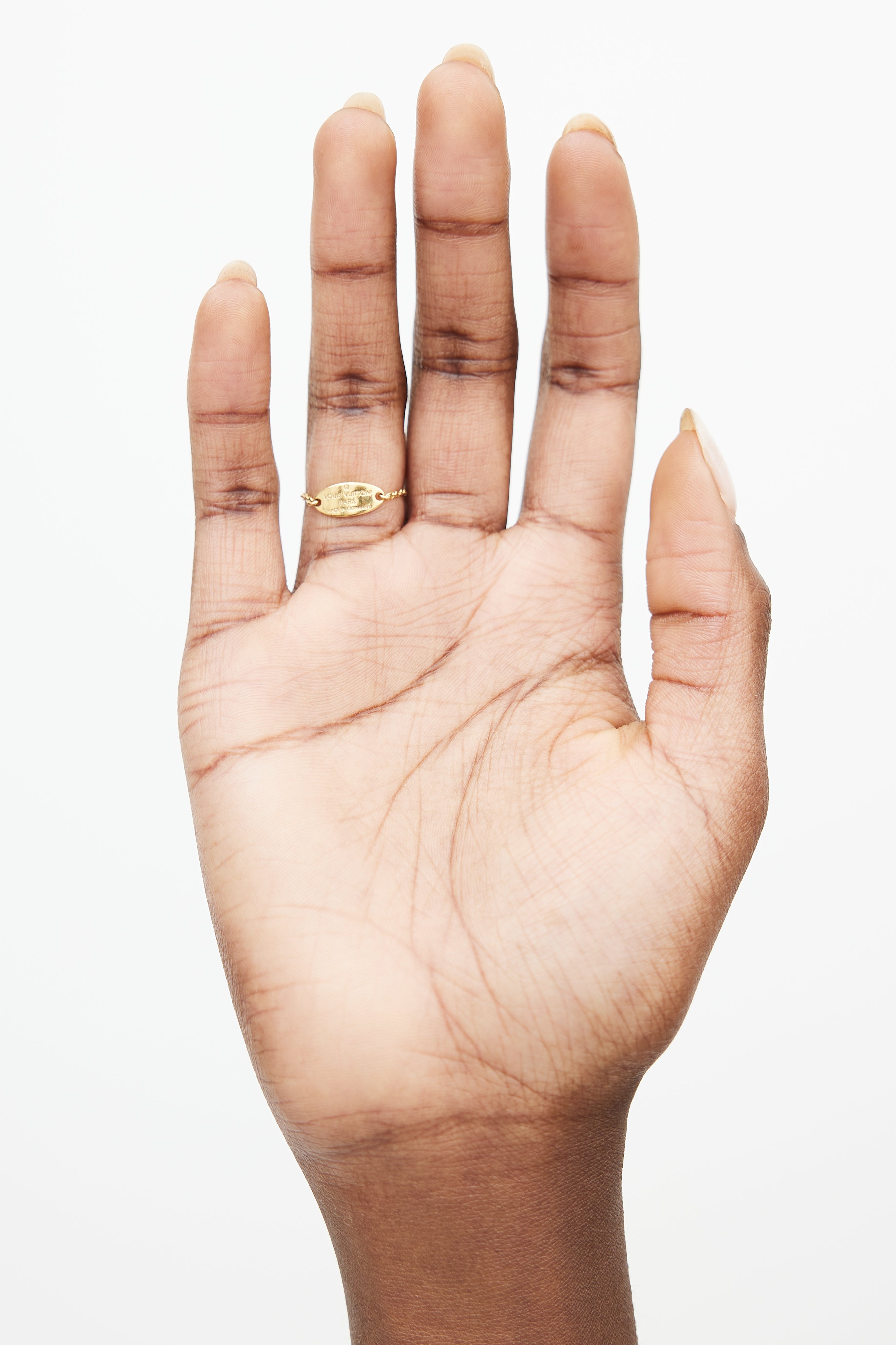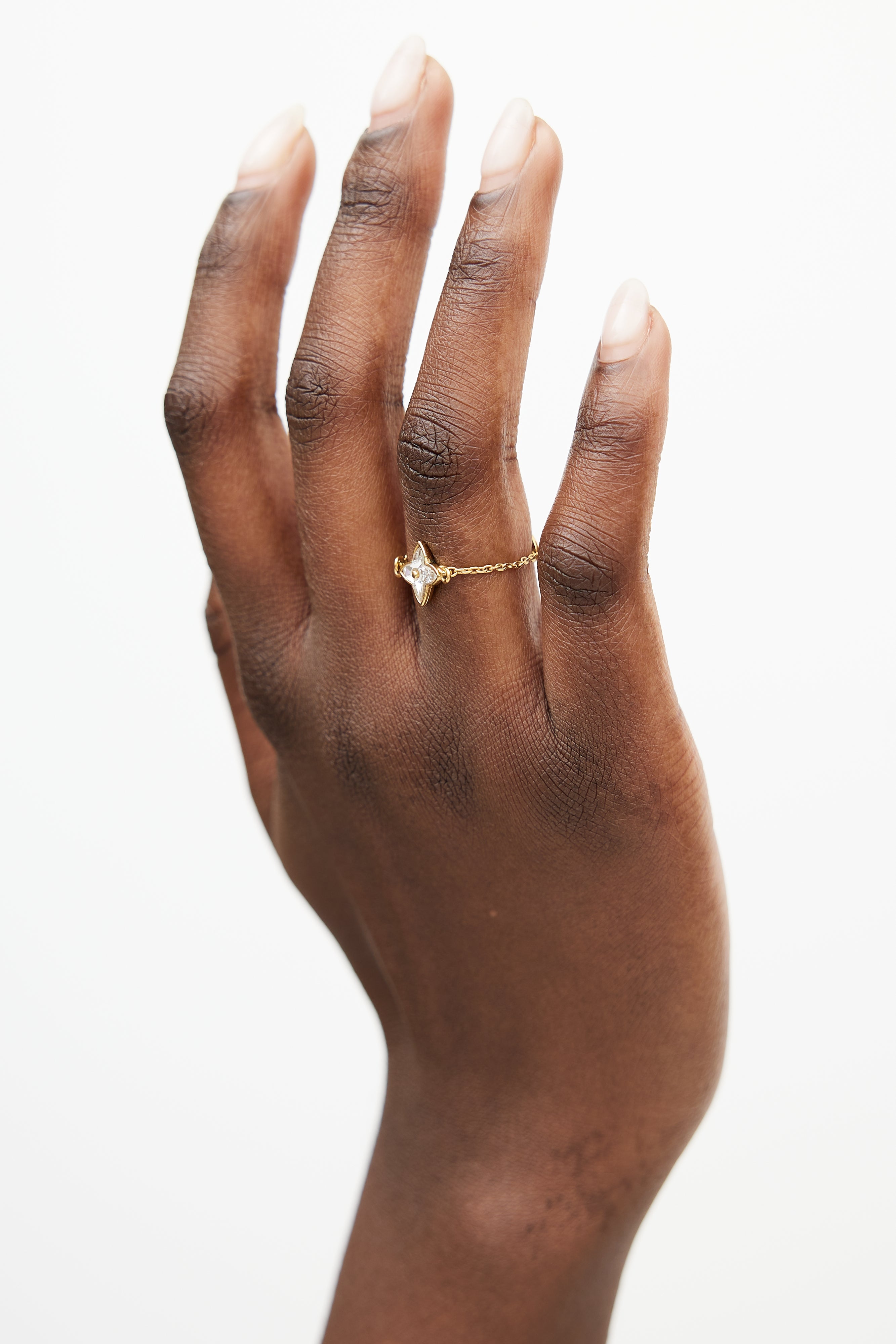 Pre-owned Louis Vuitton gold ring featuring monogram flower charm, engraved logo tag charm, and chain link.