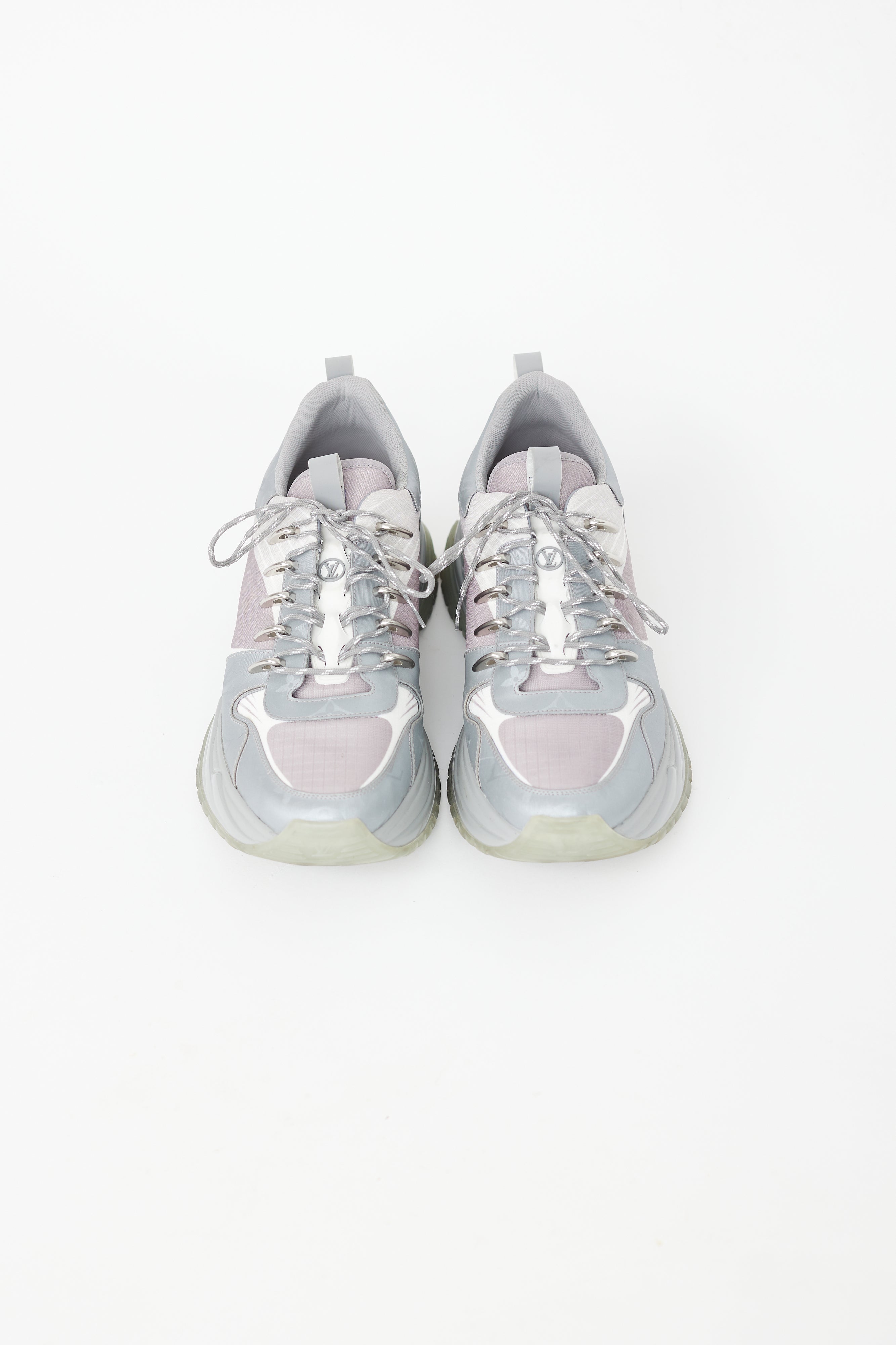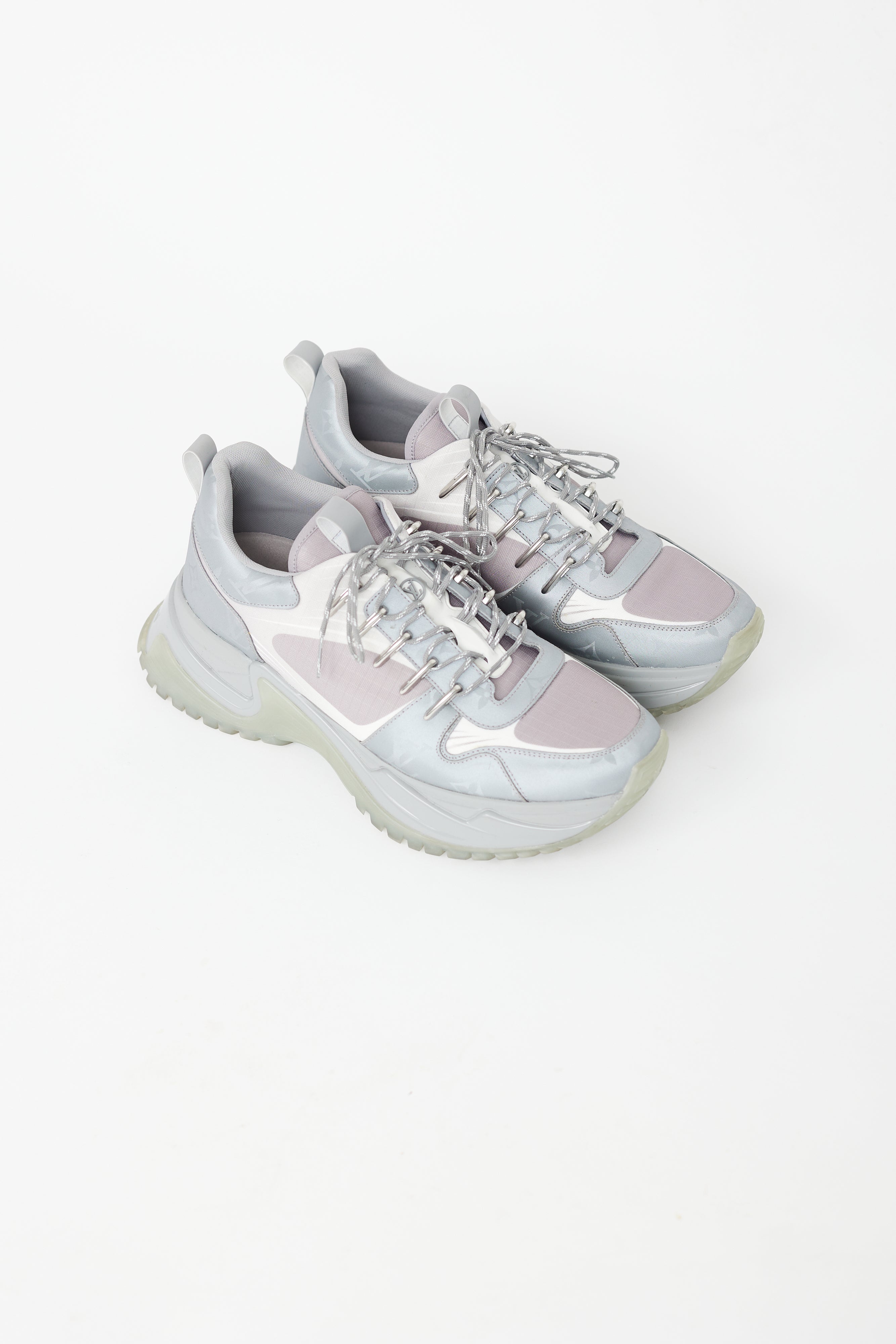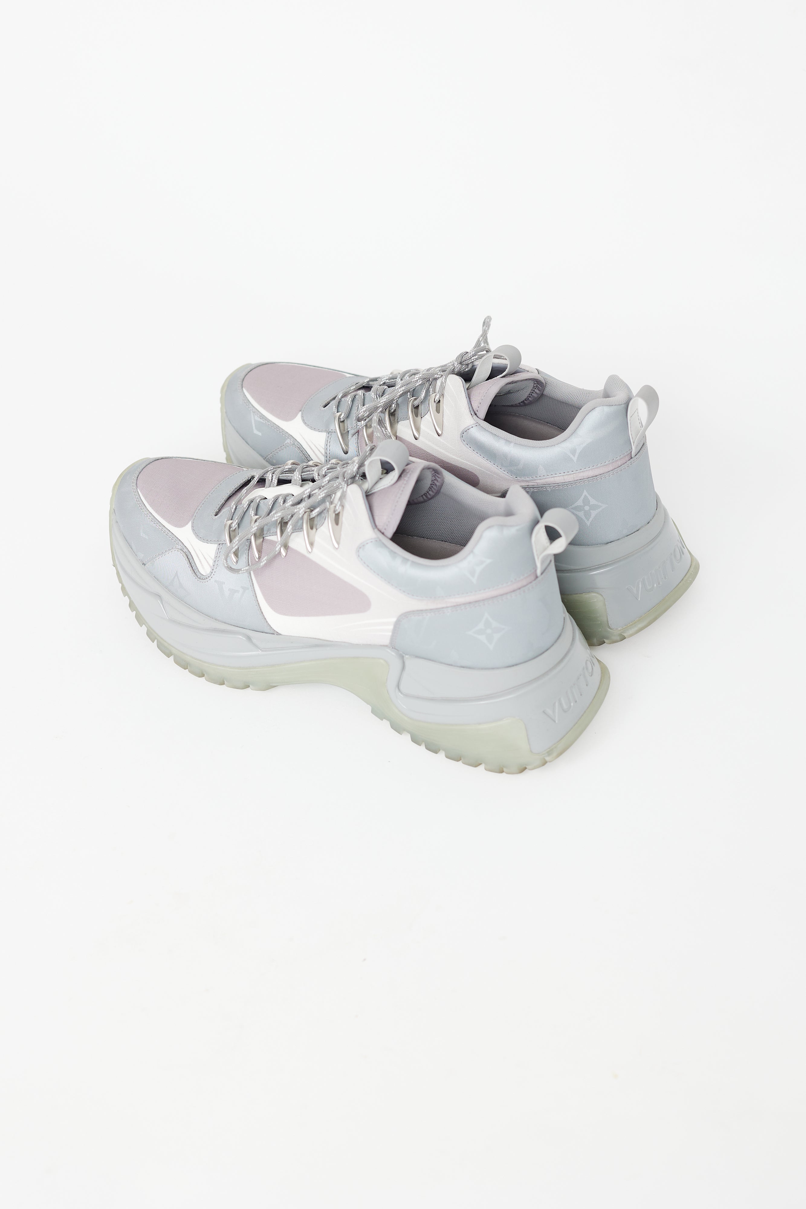 Pre-owned Louis Vuitton grey and white Run Away Pulse sneakers featuring an almond toe, lace up vamp with silver tone hardware, grey tonal monogrammed LV logos throughout and leather pull tabs at tongue and counter.