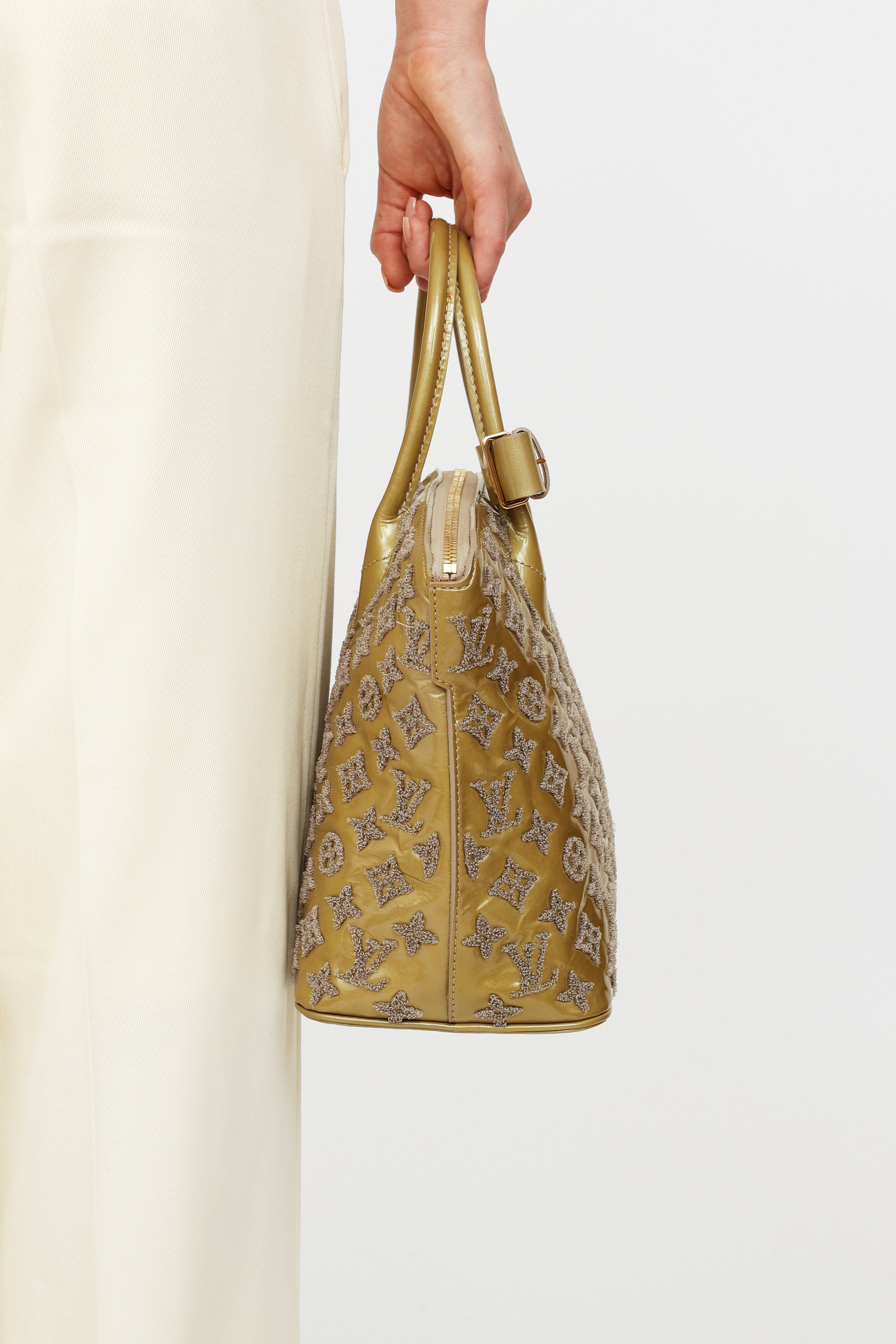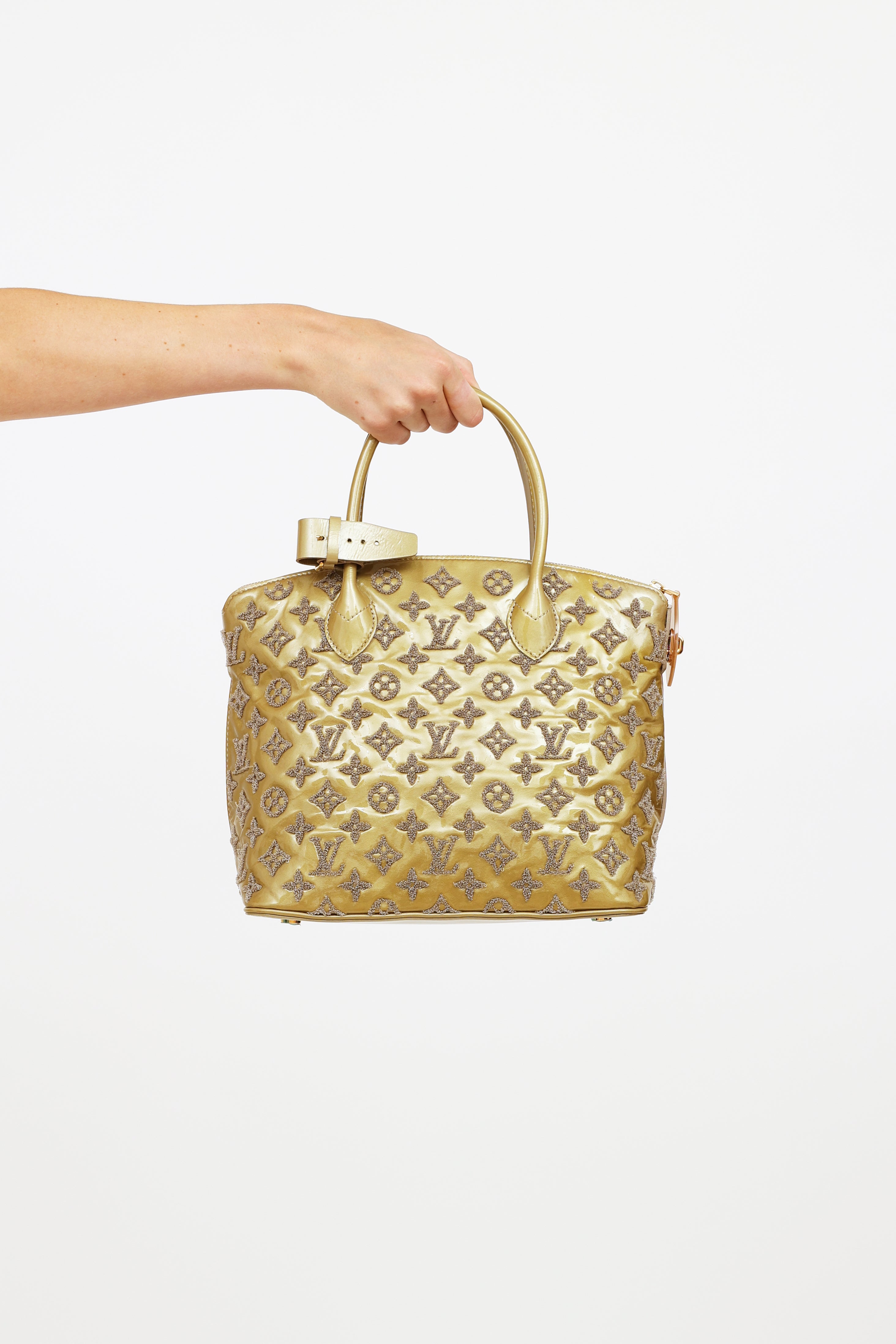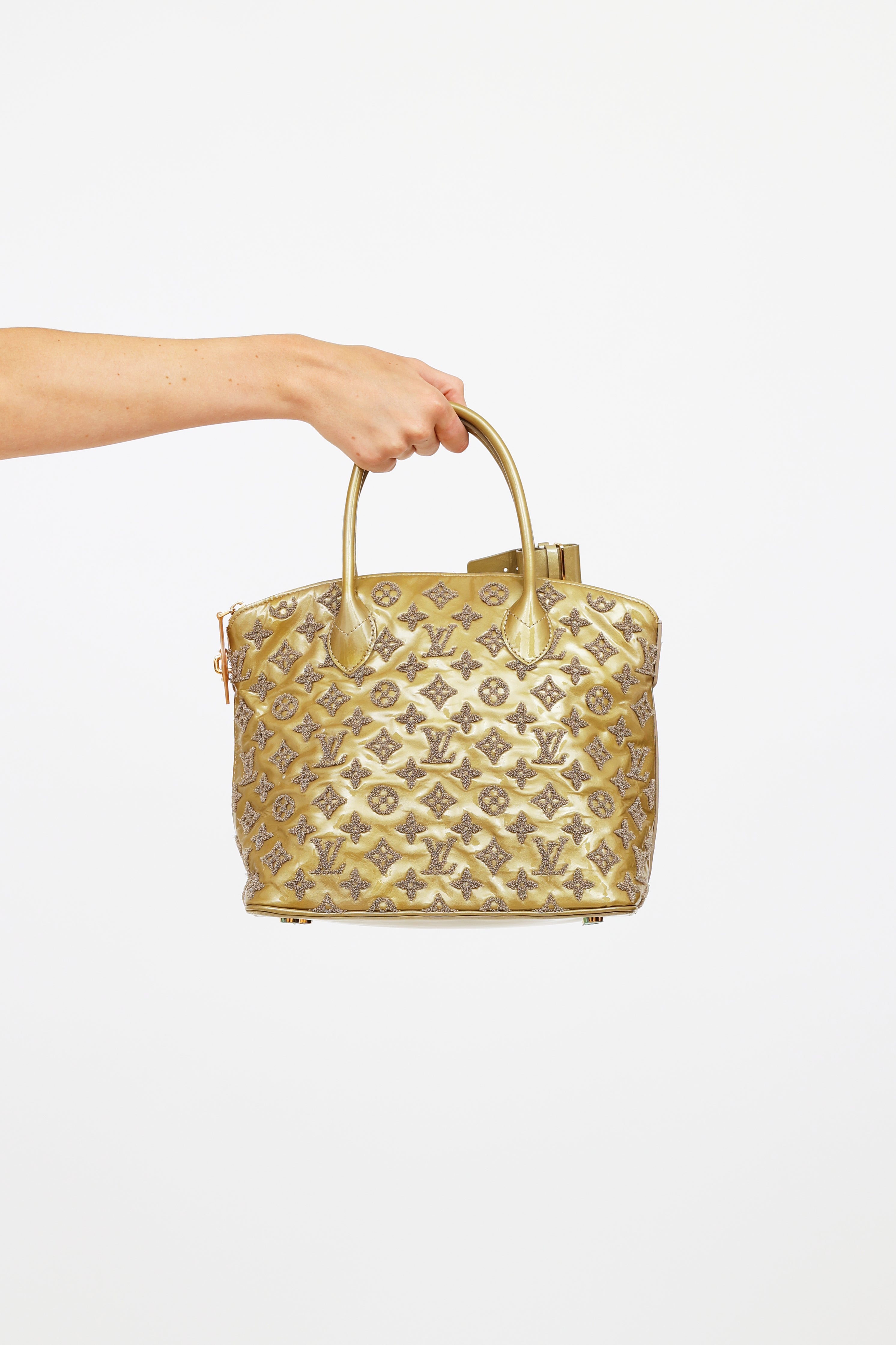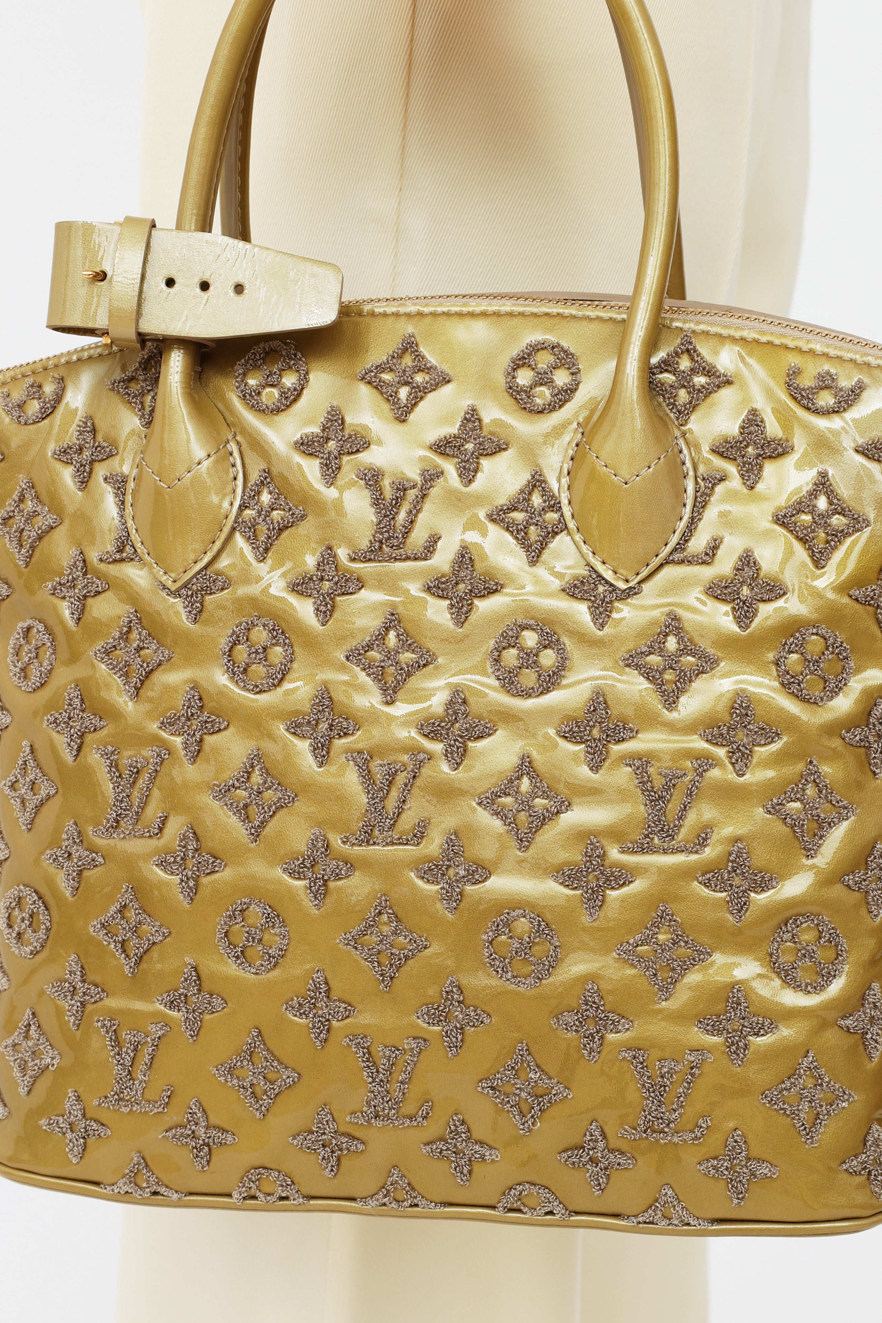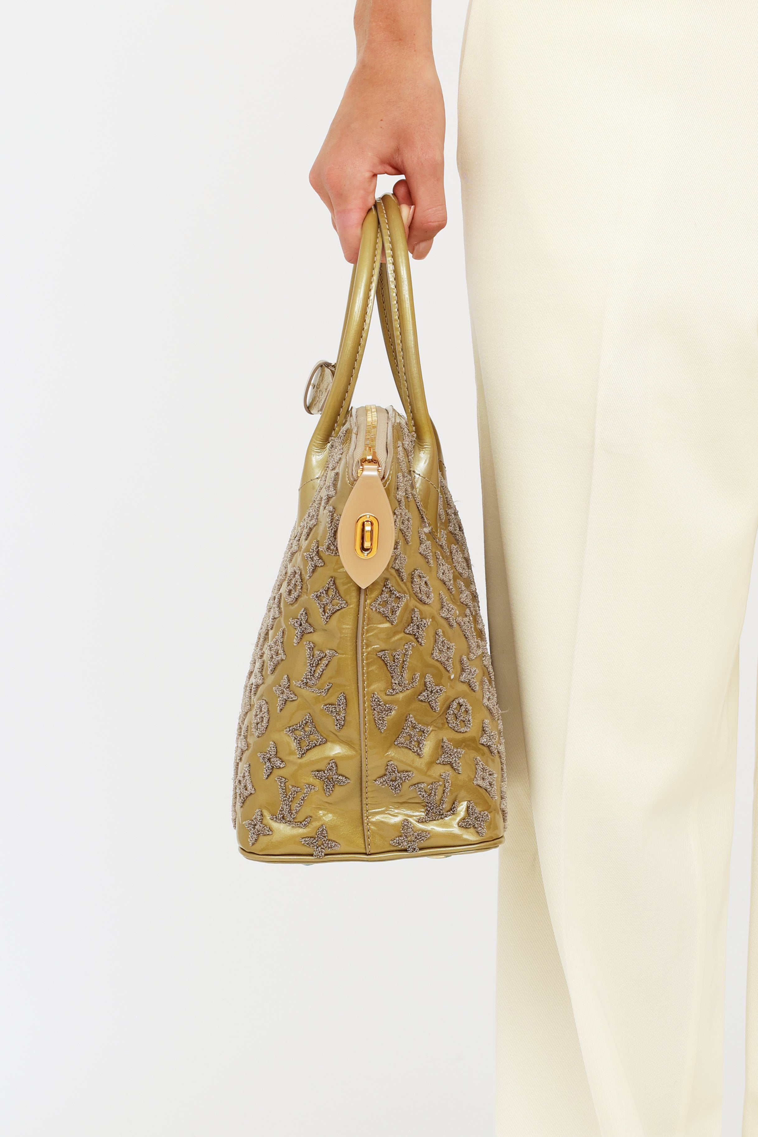 Pre-owned Louis Vuitton Gris Fascination Lockit bag featuring green Vernis outer with grey terrycloth monogram print throughout, dual rolled top handles, zip closure at top, four protective metal feet at bottom and gold-tone hardware. Interior features one main compartment and one slip pocket. Fall-Winter 2011-12.