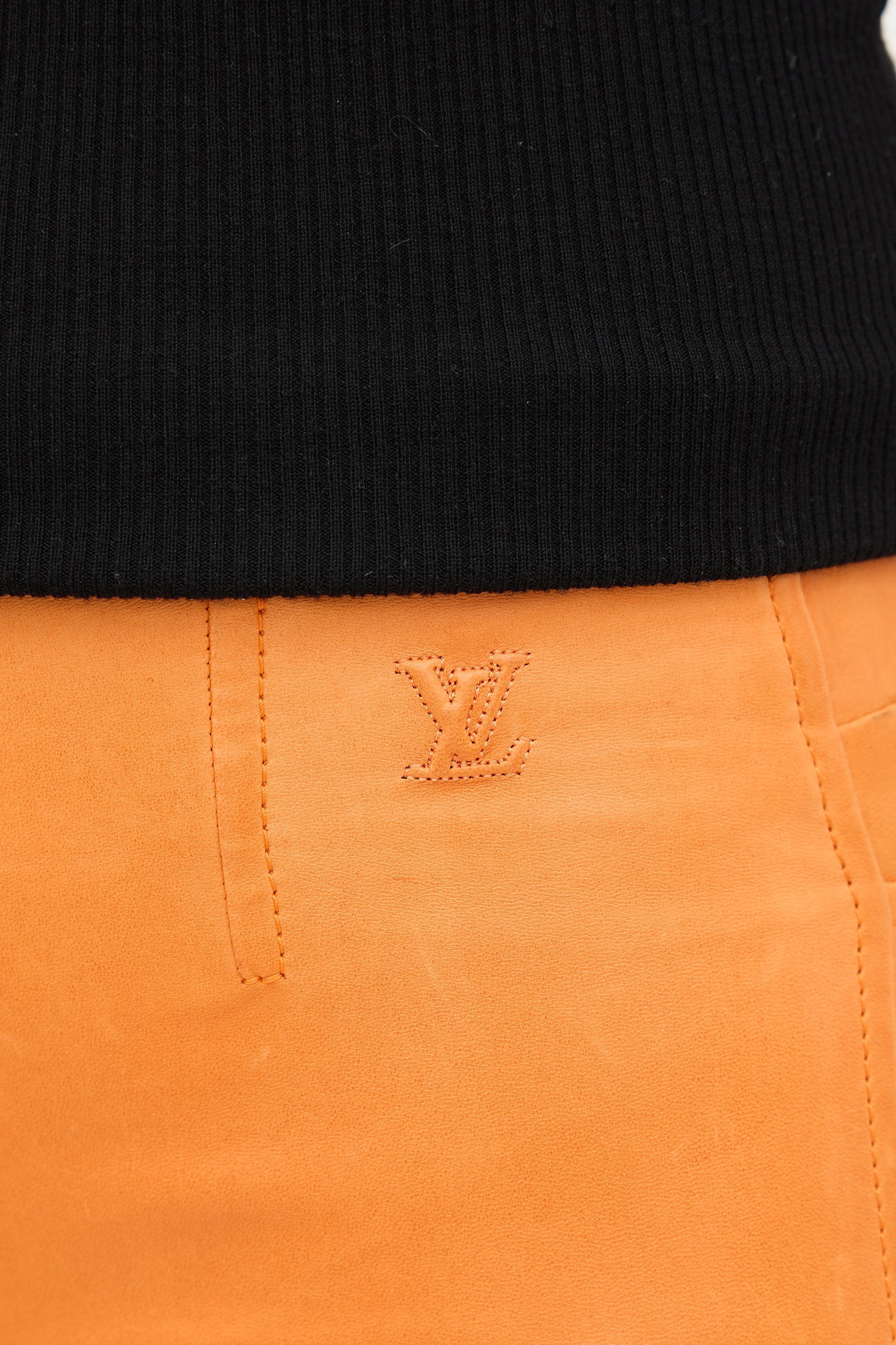 Pre-owned Louis Vuitton orange leather leggings featuring mid rise, stitched logo at left hip, and elasticized waistband.