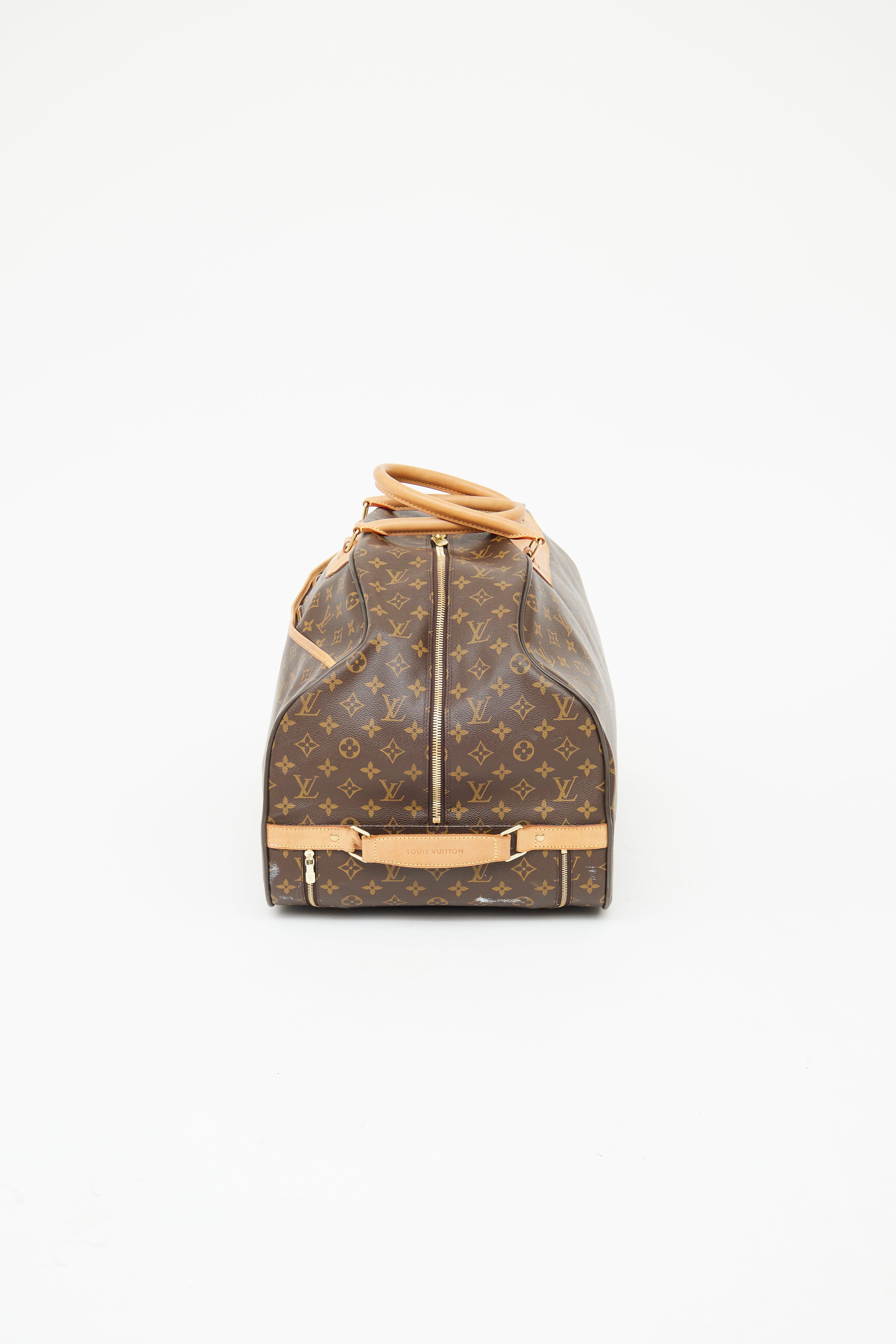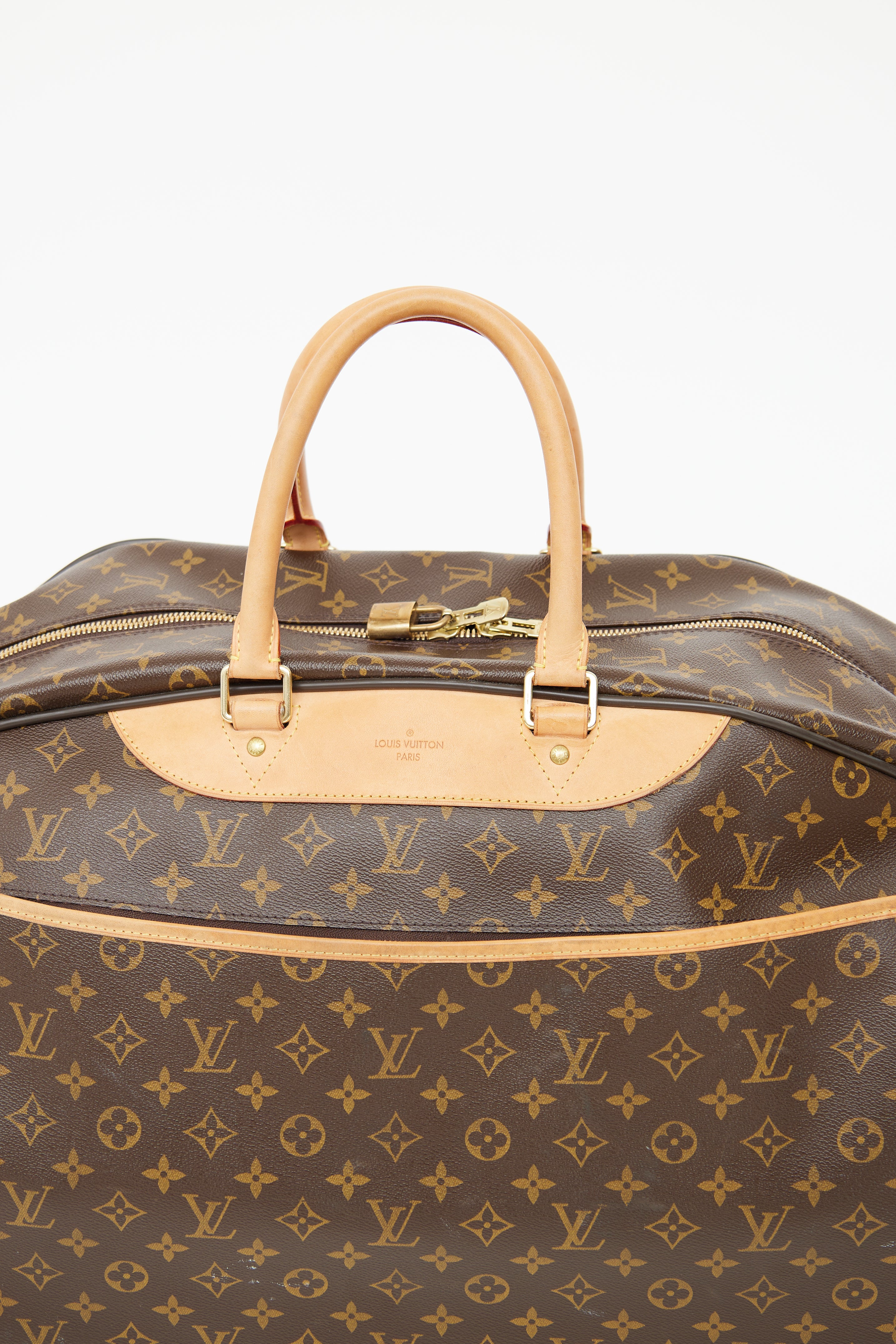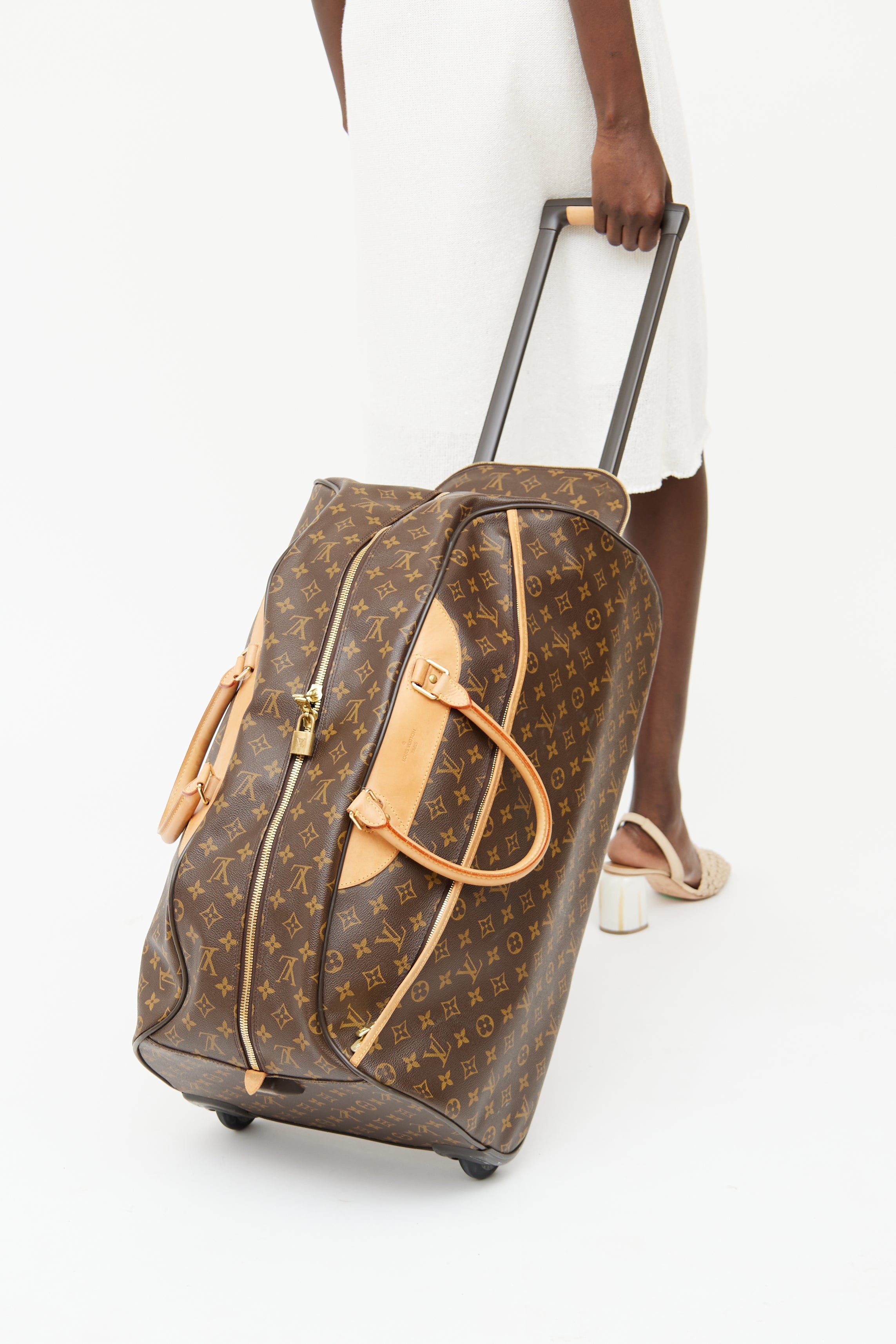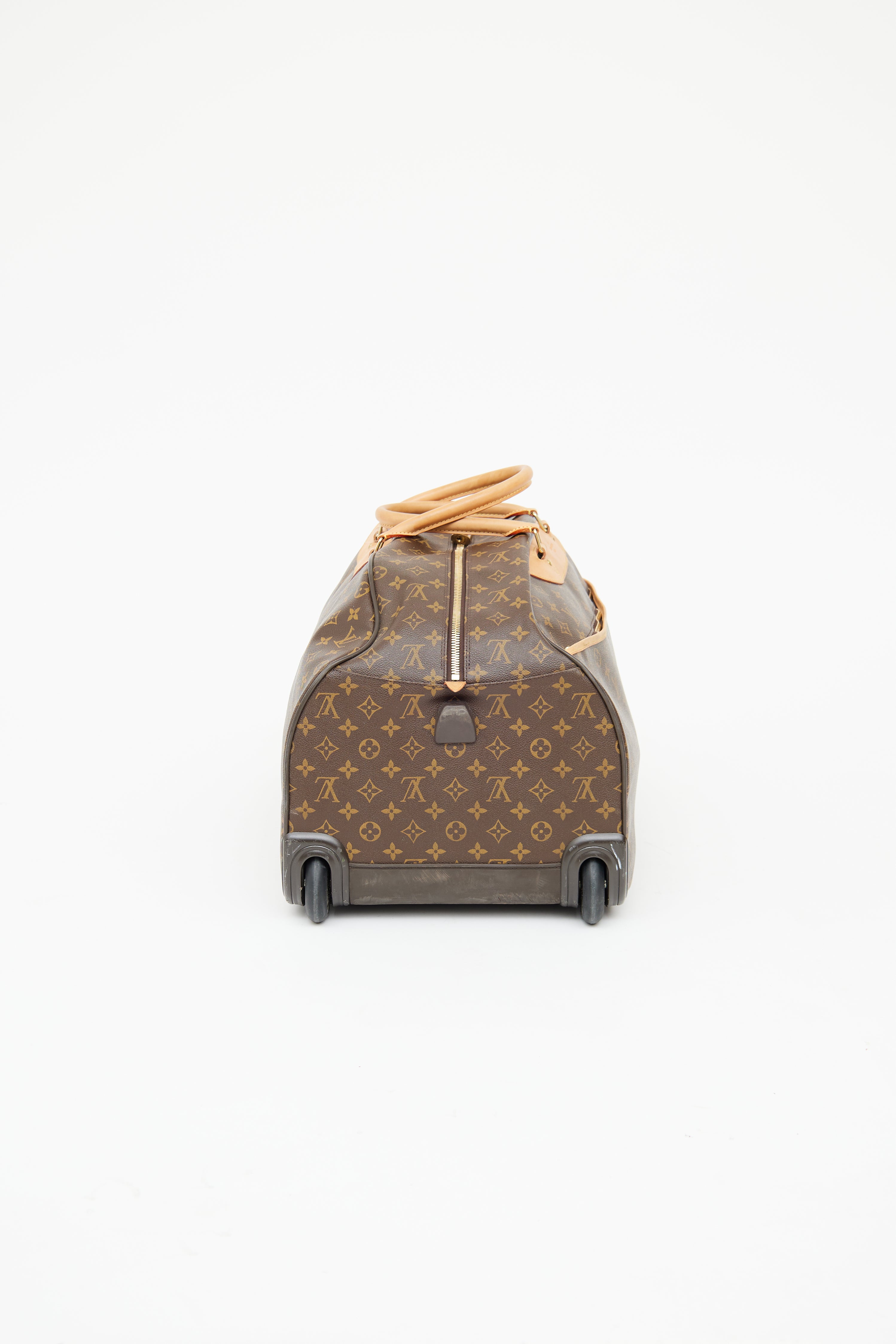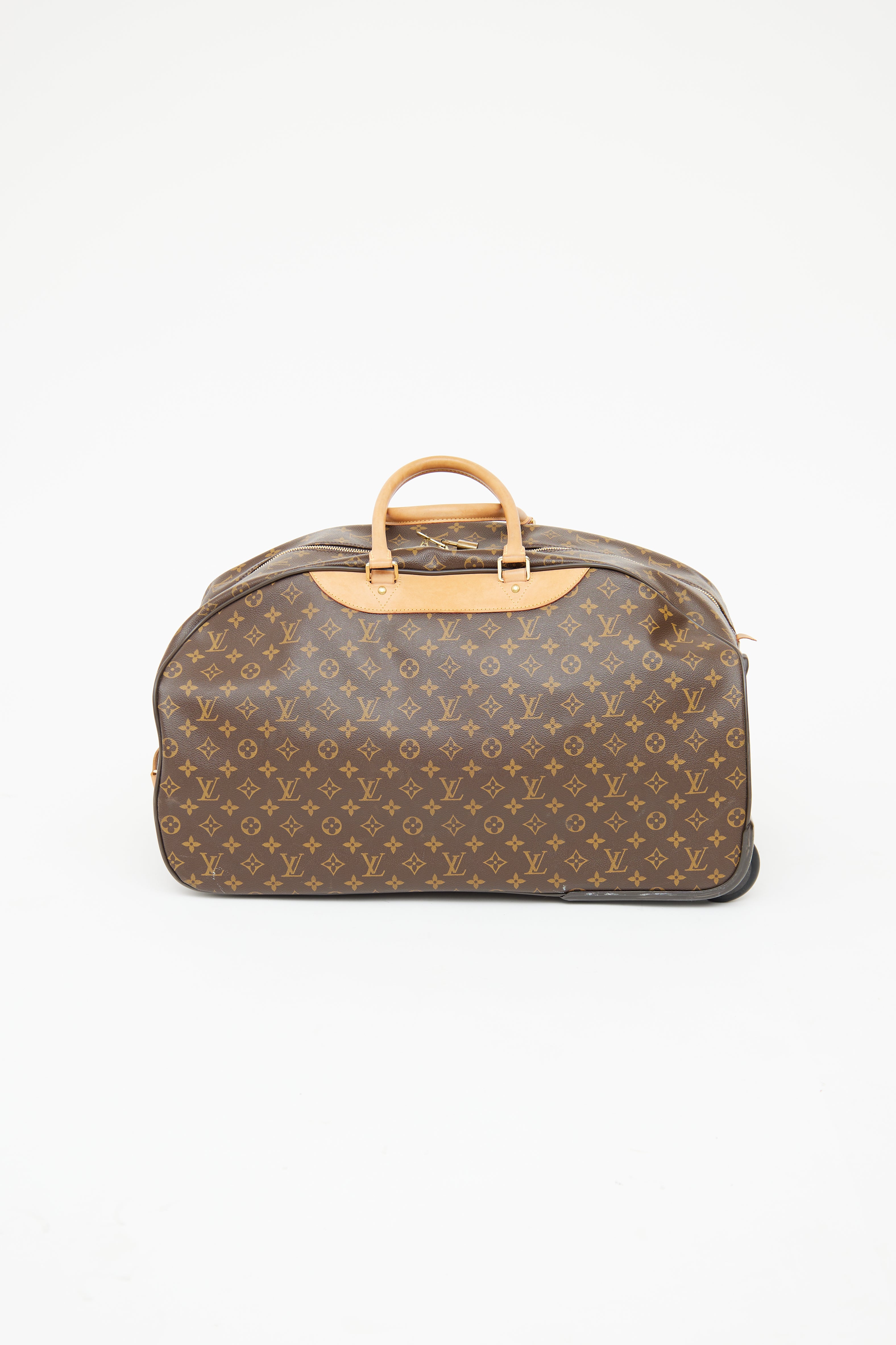 Pre-owned Louis Vuitton Monogram Eole 50 Roller bag featuring dual rolled top handles, top zip closure with an embossed plaque lock, side zip closure pocket, monogram coated canvas, top flat leather handle, concealed adjustable handle bar, dual wheels at bottom, canvas lined interior, and dual interior slip pockets.