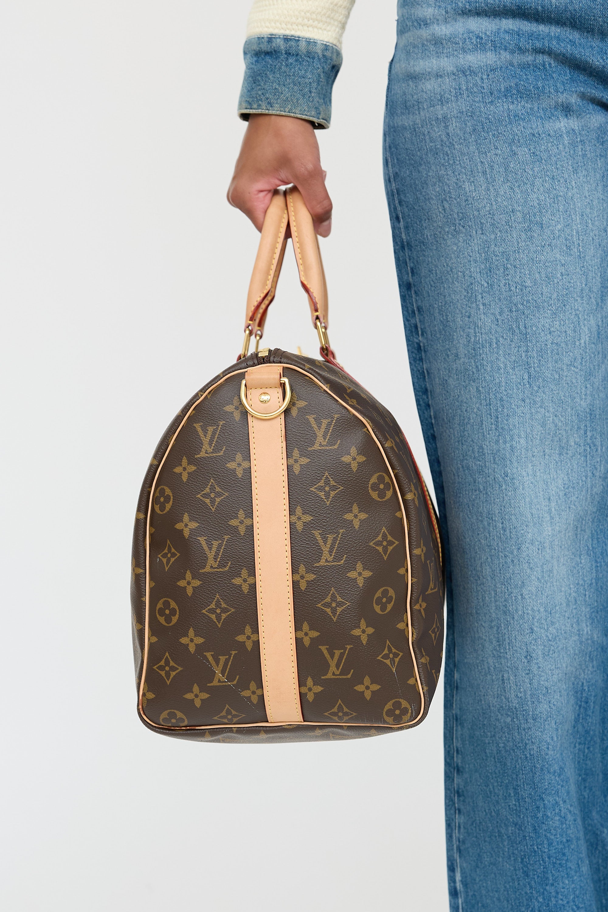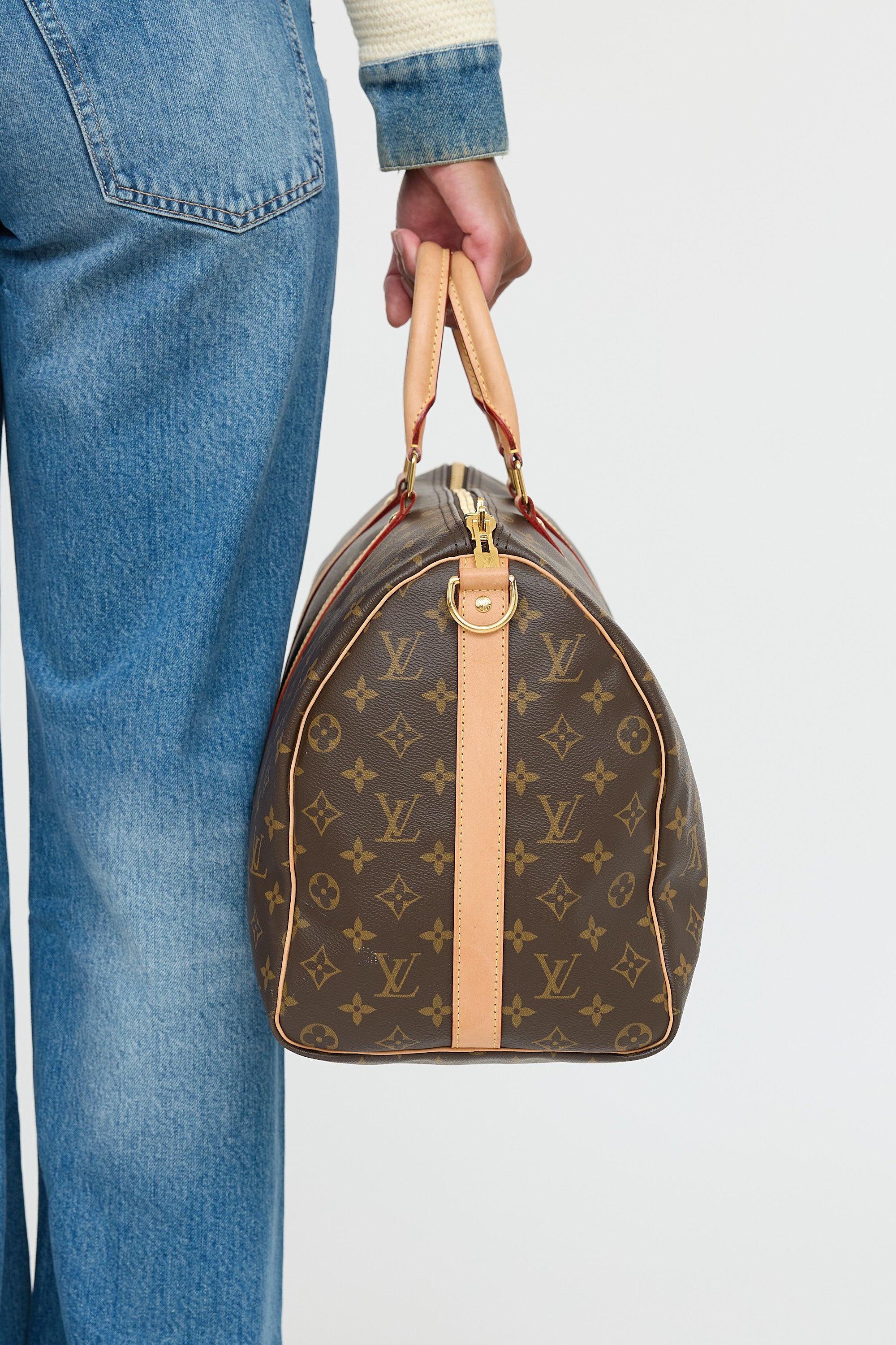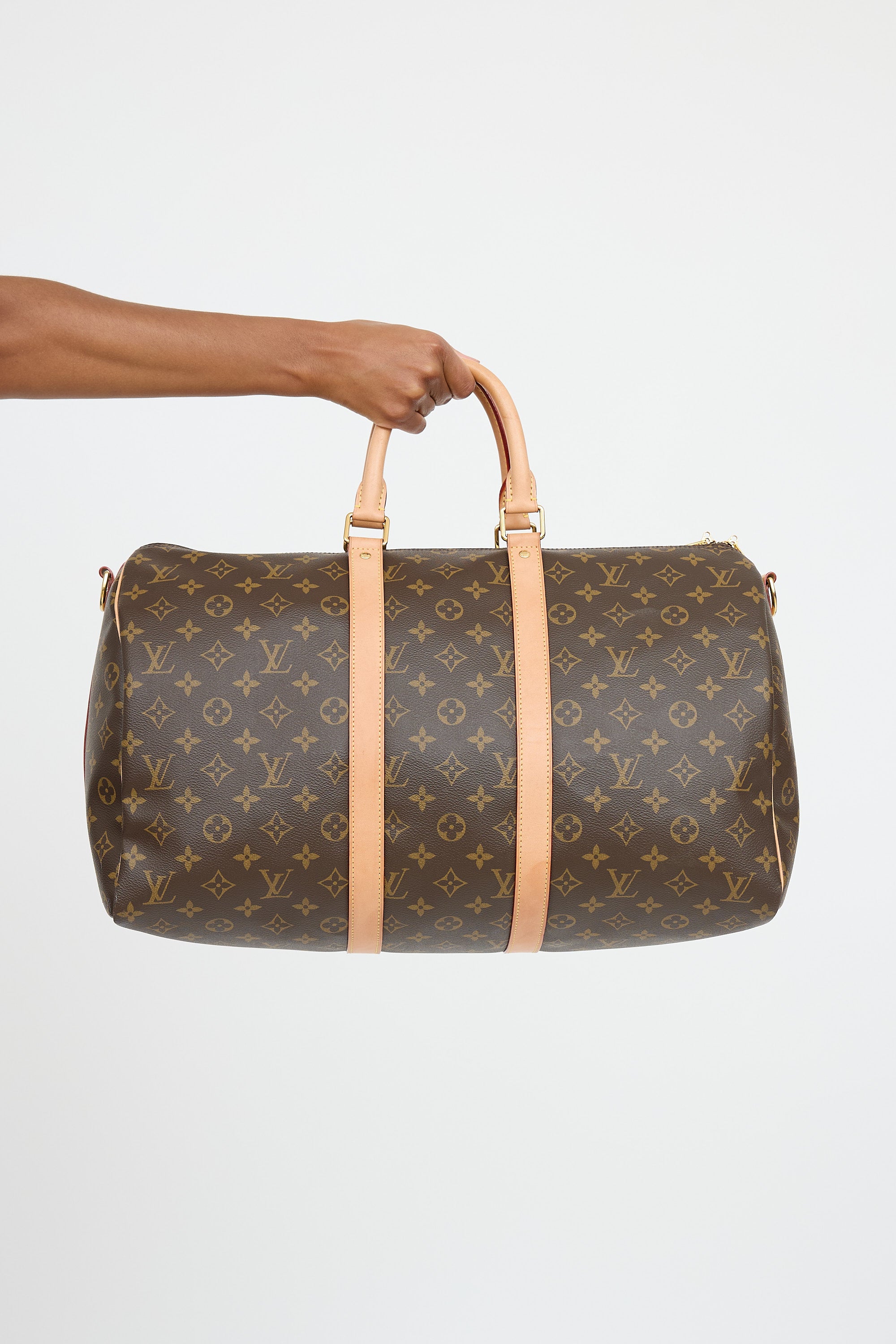 Pre-owned Louis Vuitton brown Monogram Keepall Bandoulière 45 duffle bag featuring brown monogram coated canvas exterior, vachetta leather trim, dual rolled top handles, detachable and adjustable shoulder strap, top zipper closure with lock, detachable bag tag and gold-tone hardware, and one main compartment with one zip pocket.