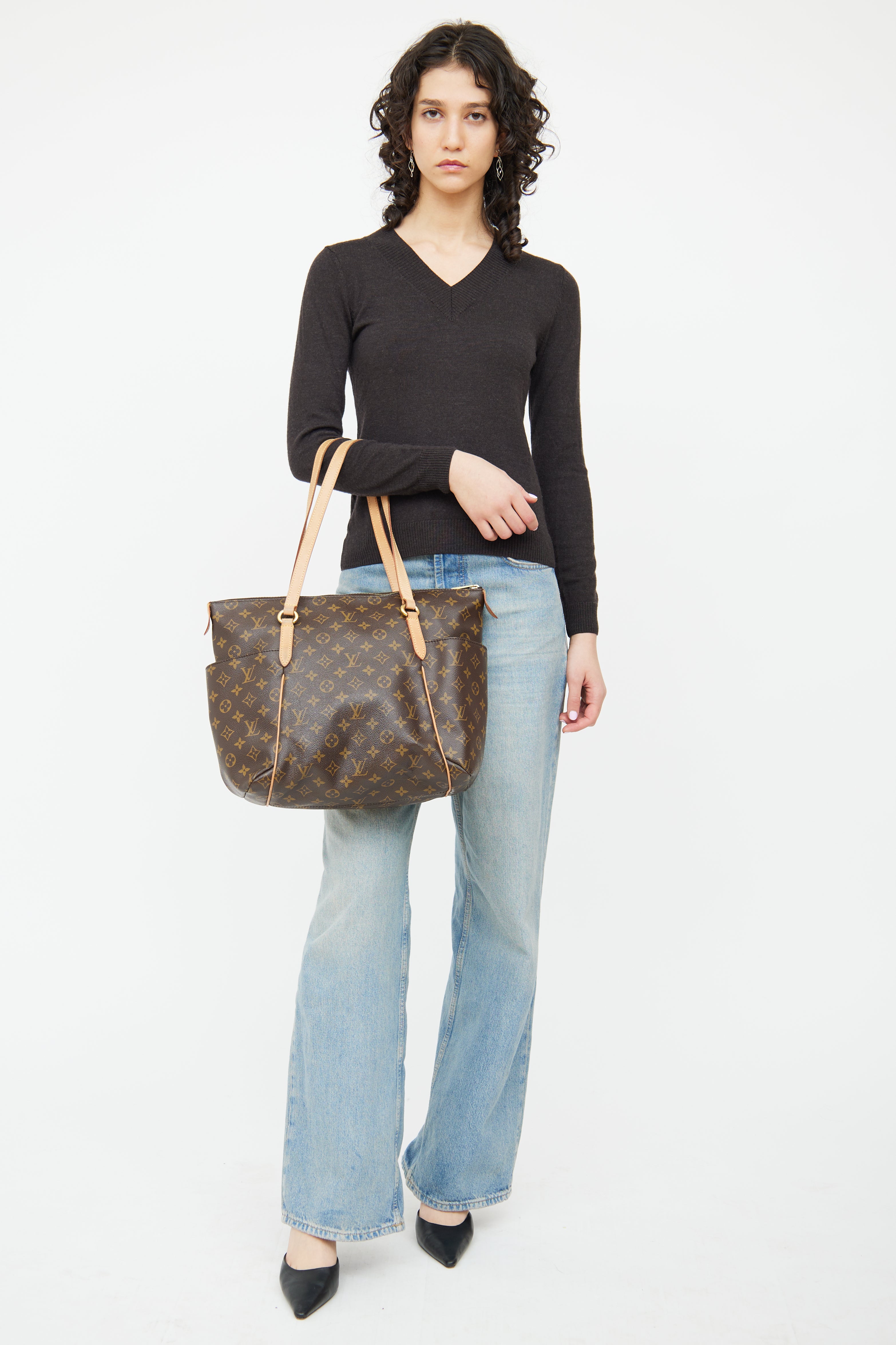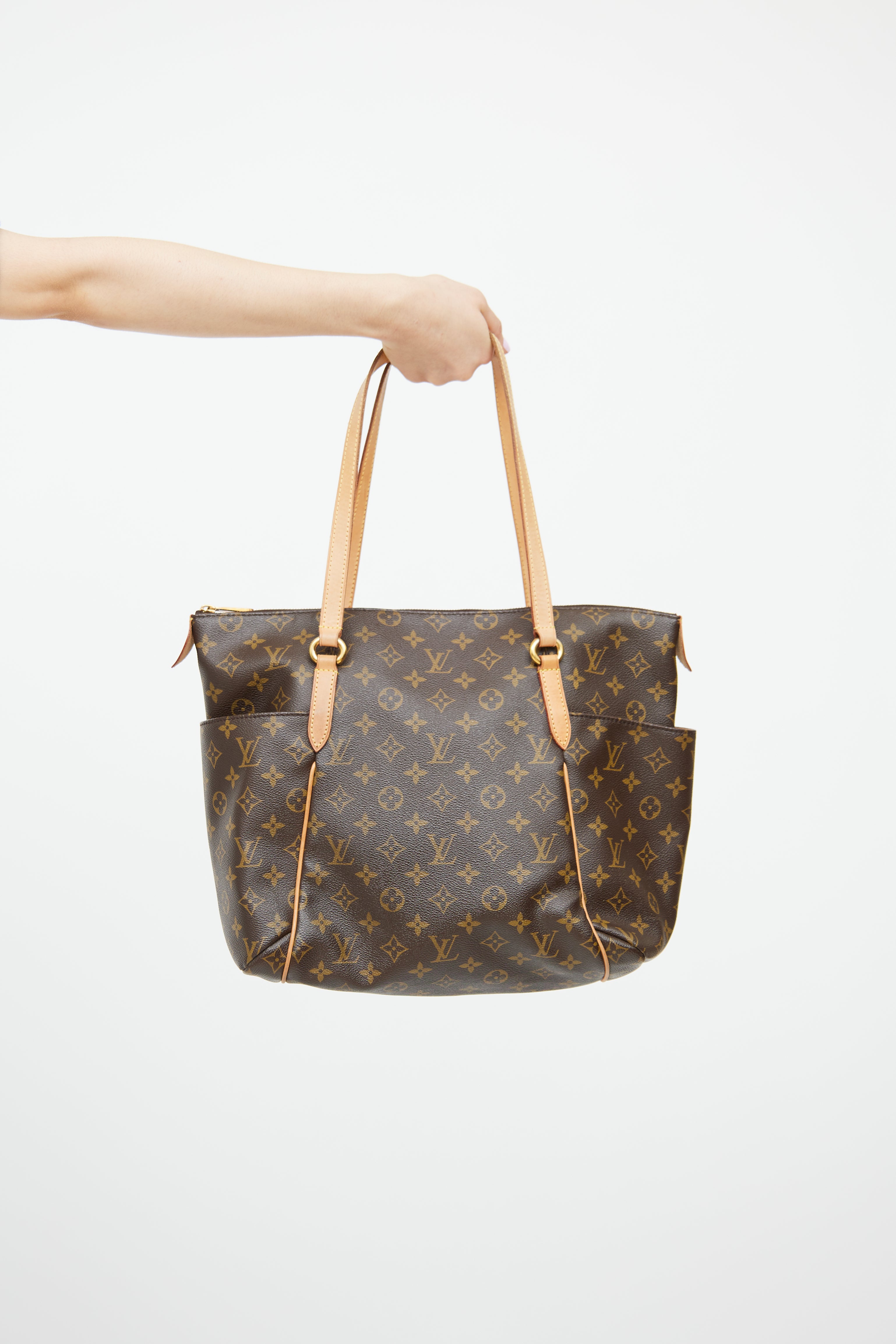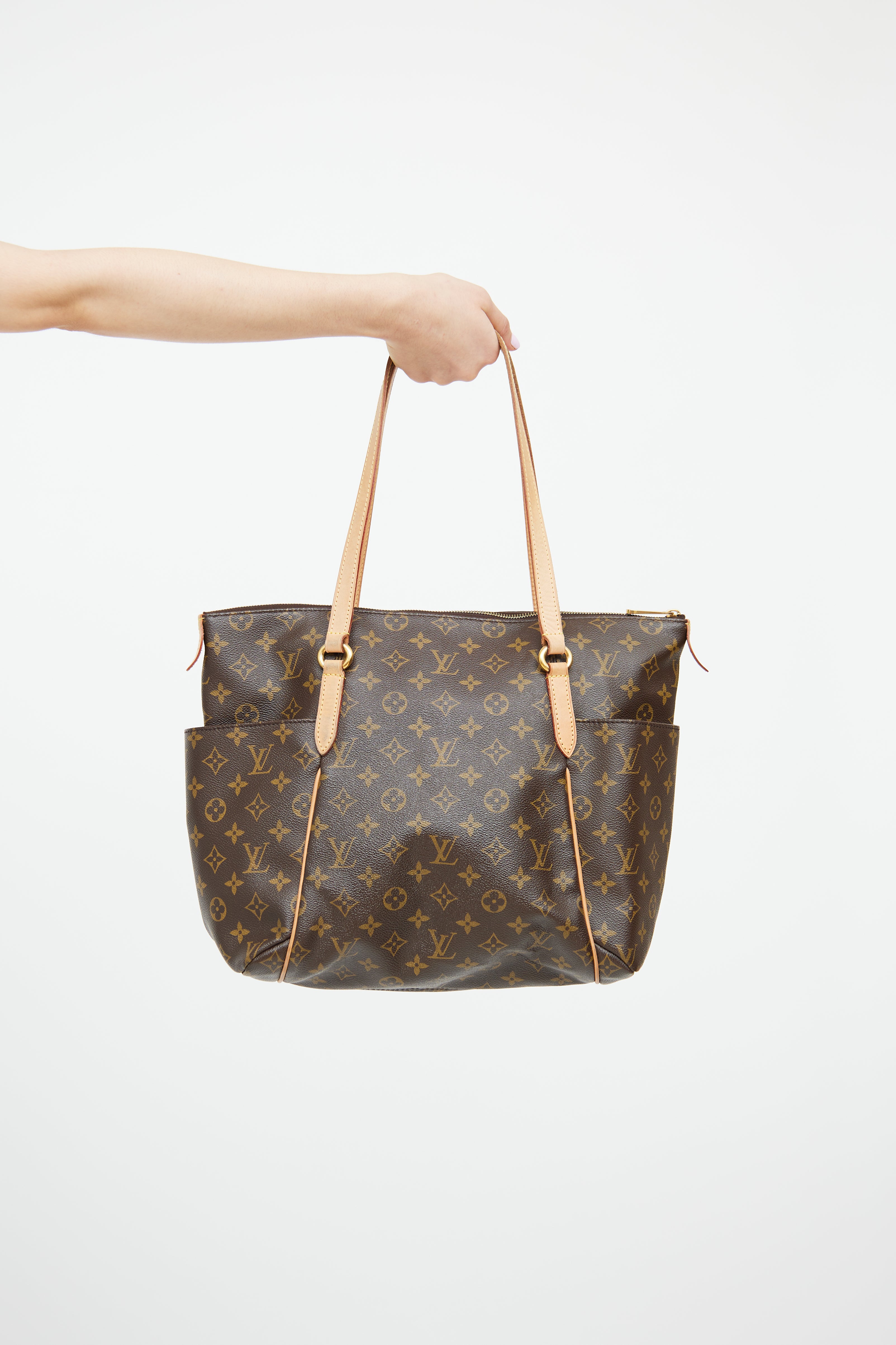 Pre-owned Louis Vuitton brown monogram Totally tote bag featuring brown coated canvas with monogram print, leather top handles, two slip pockets on outer sides, top zip closure, one main compartment with three slip pockets.
