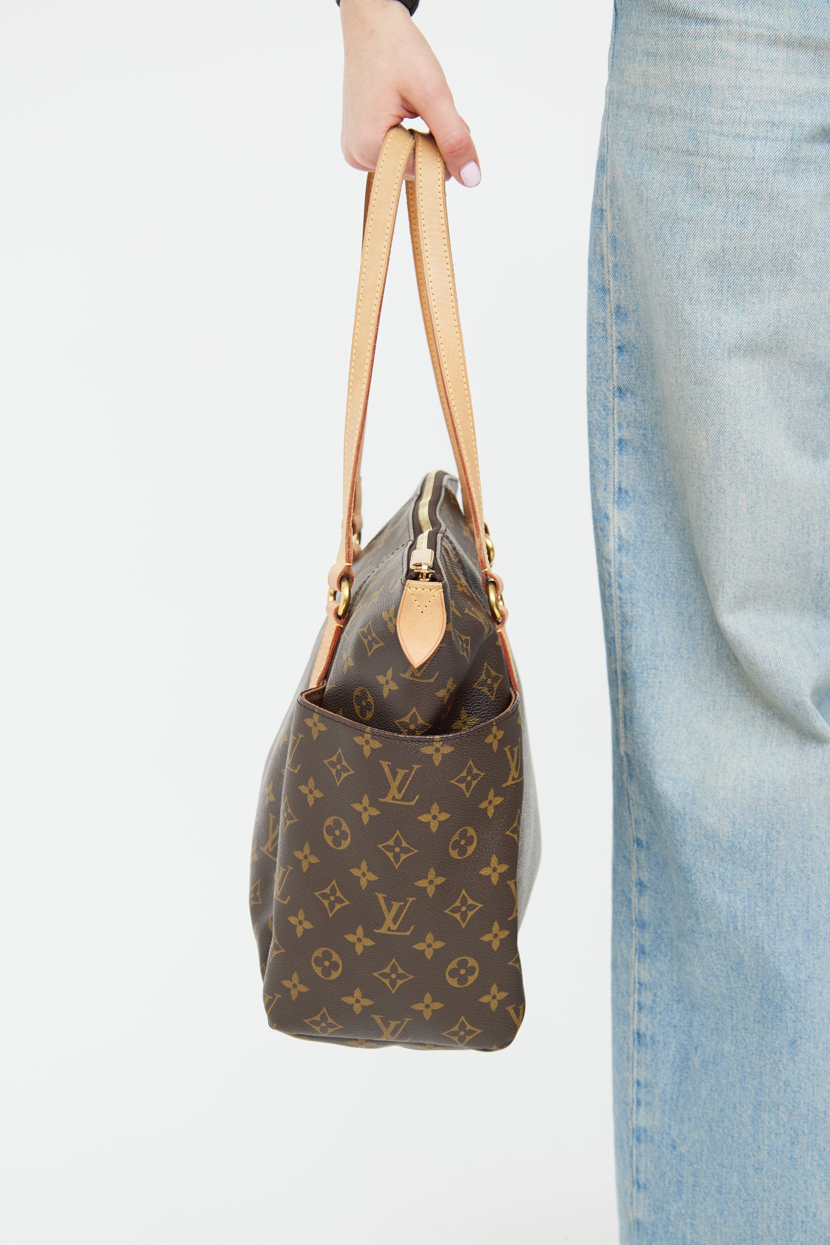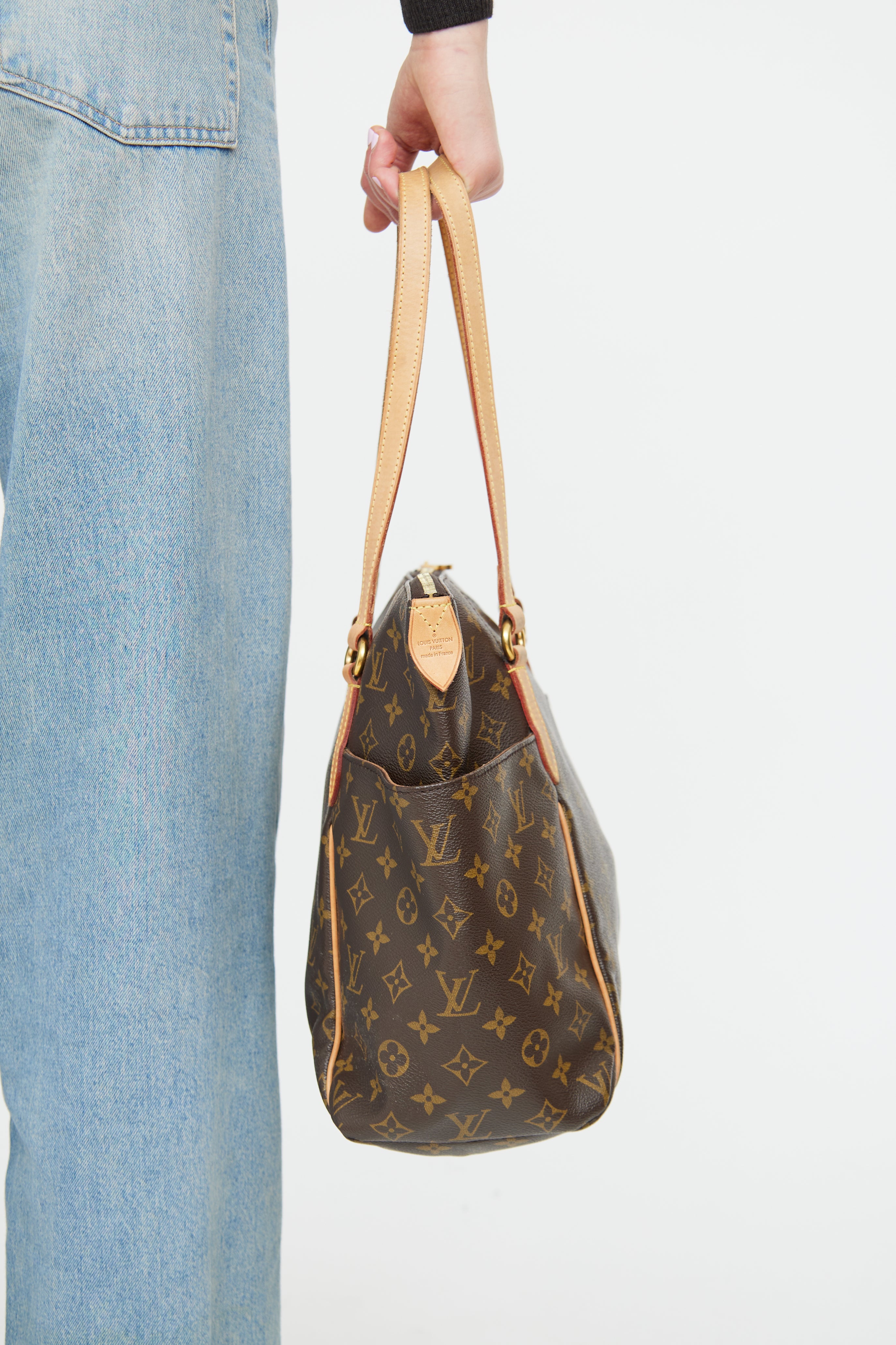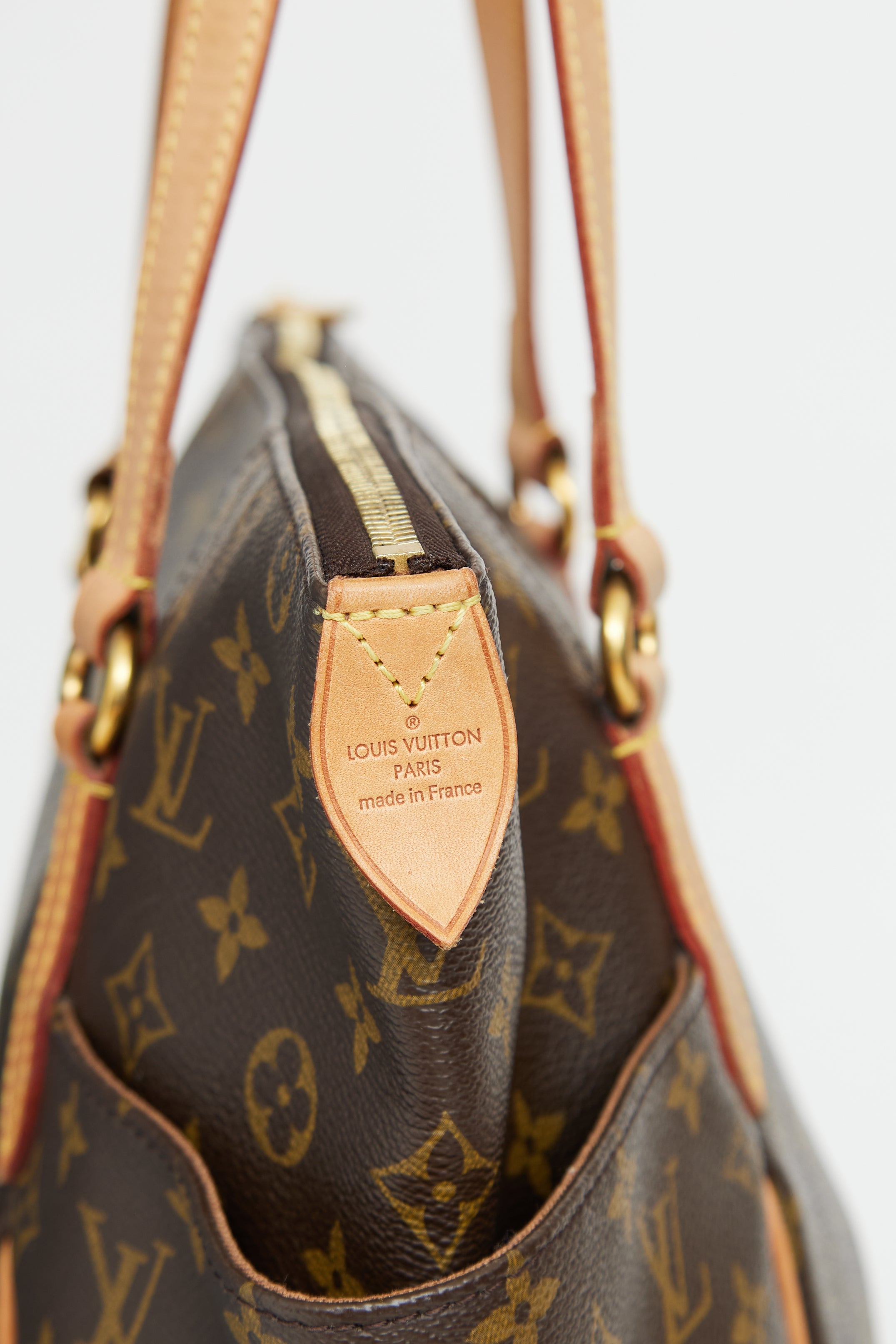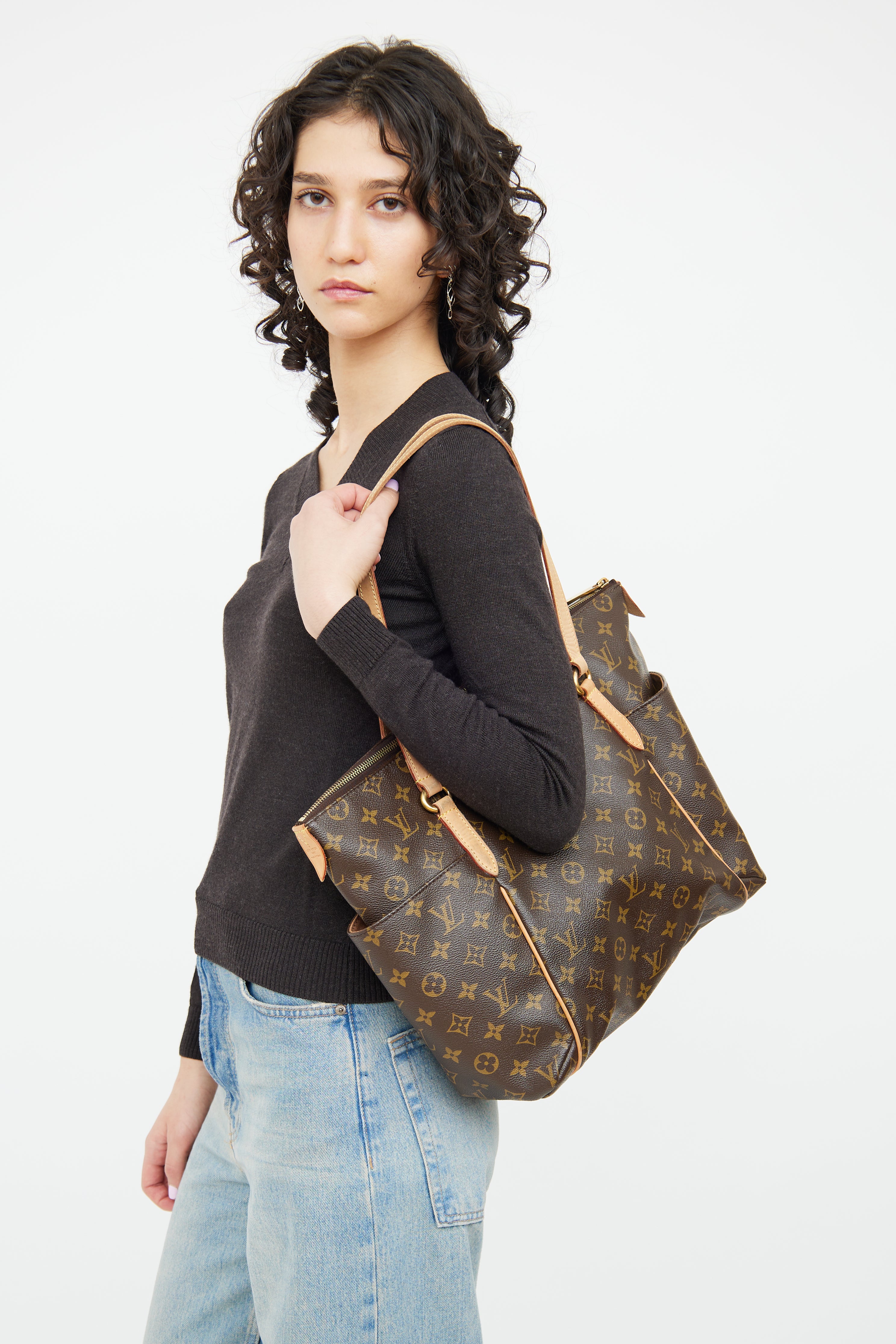 Pre-owned Louis Vuitton brown monogram Totally tote bag featuring brown coated canvas with monogram print, leather top handles, two slip pockets on outer sides, top zip closure, one main compartment with three slip pockets.