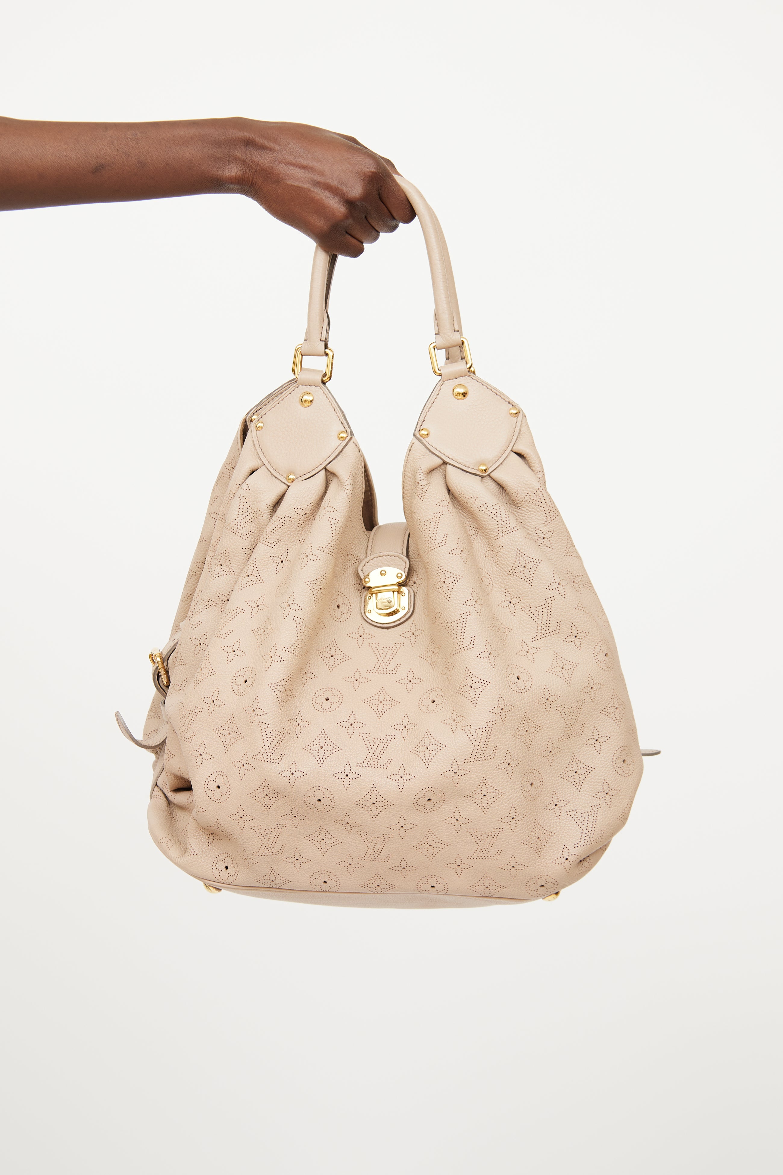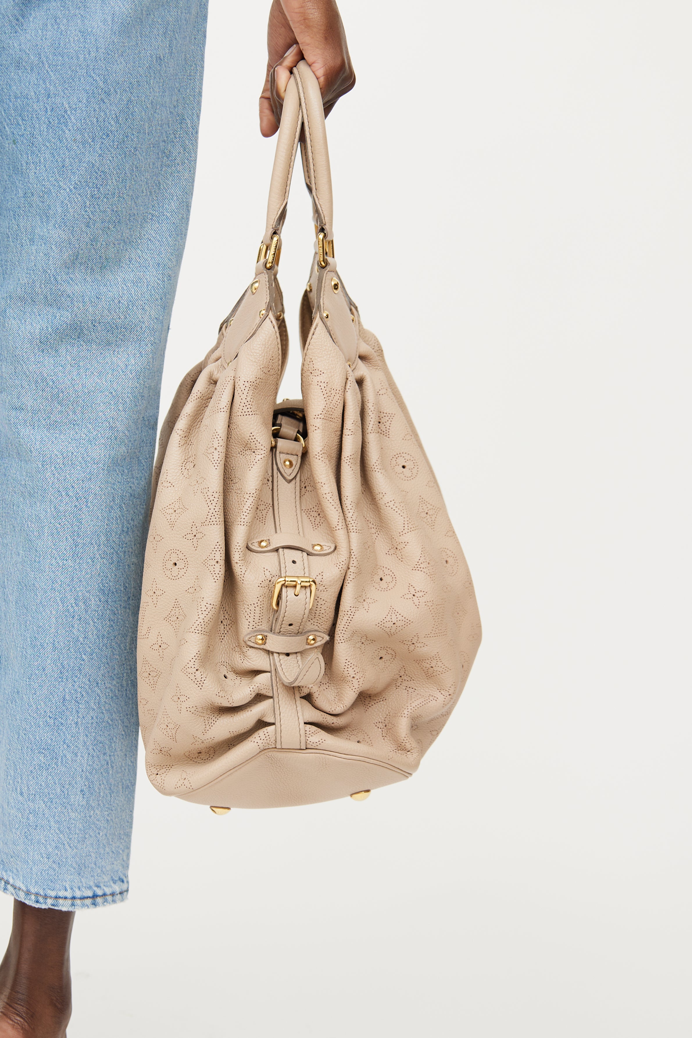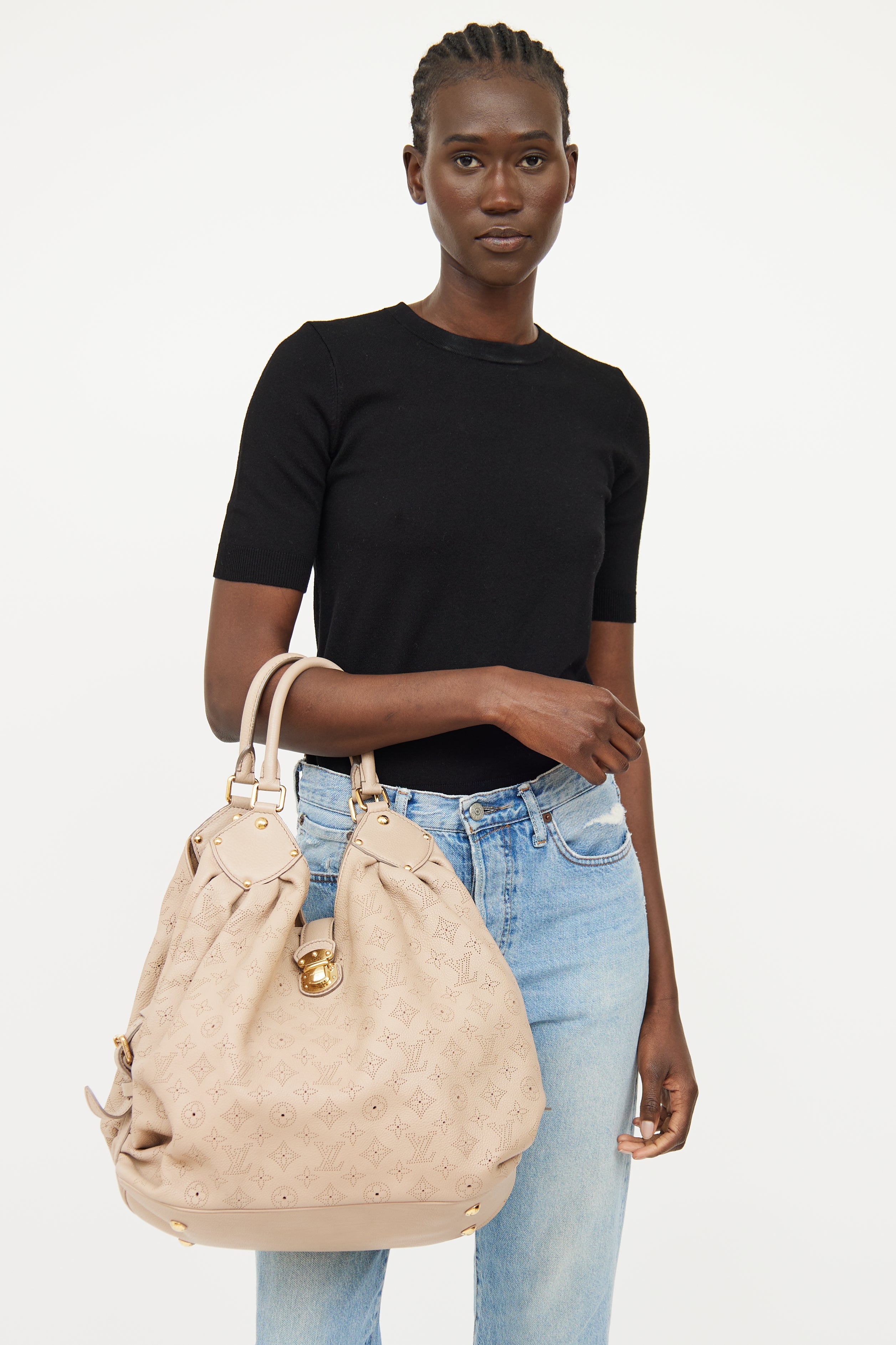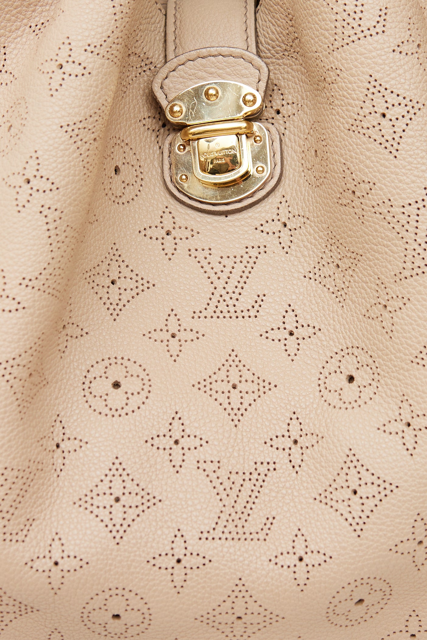Pre-owned Louis Vuitton pink Mahina Solar shoulder bag featuring relaxed silhouette with pleating, perforated monogram print, pebbled leather, adjustable side straps with square buckles, dual rolled top handles, stud details throughout, brown microfiber interior with single zip pocket, top strap with clip closure at side, top strap with push closure, and gold-tone hardware.