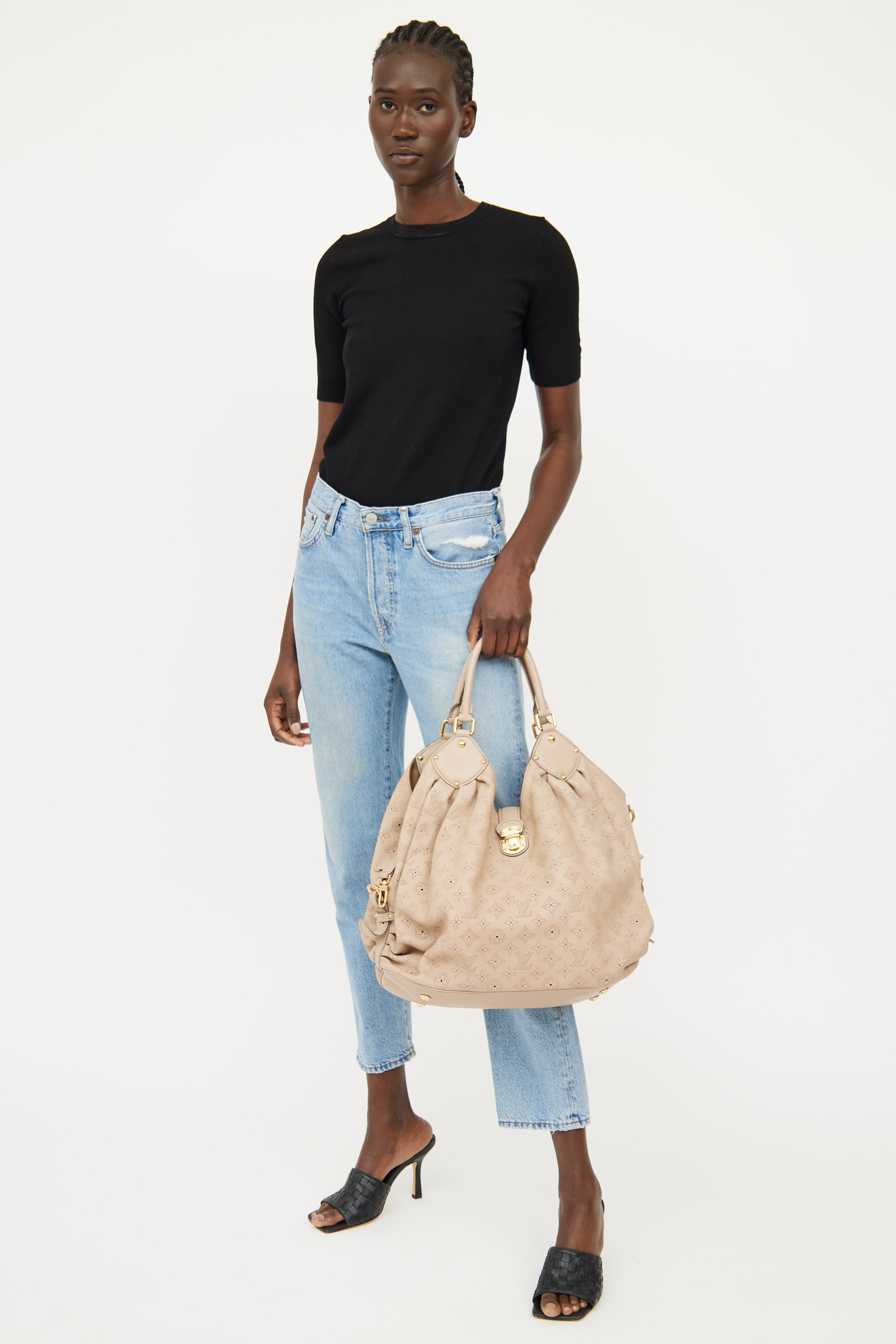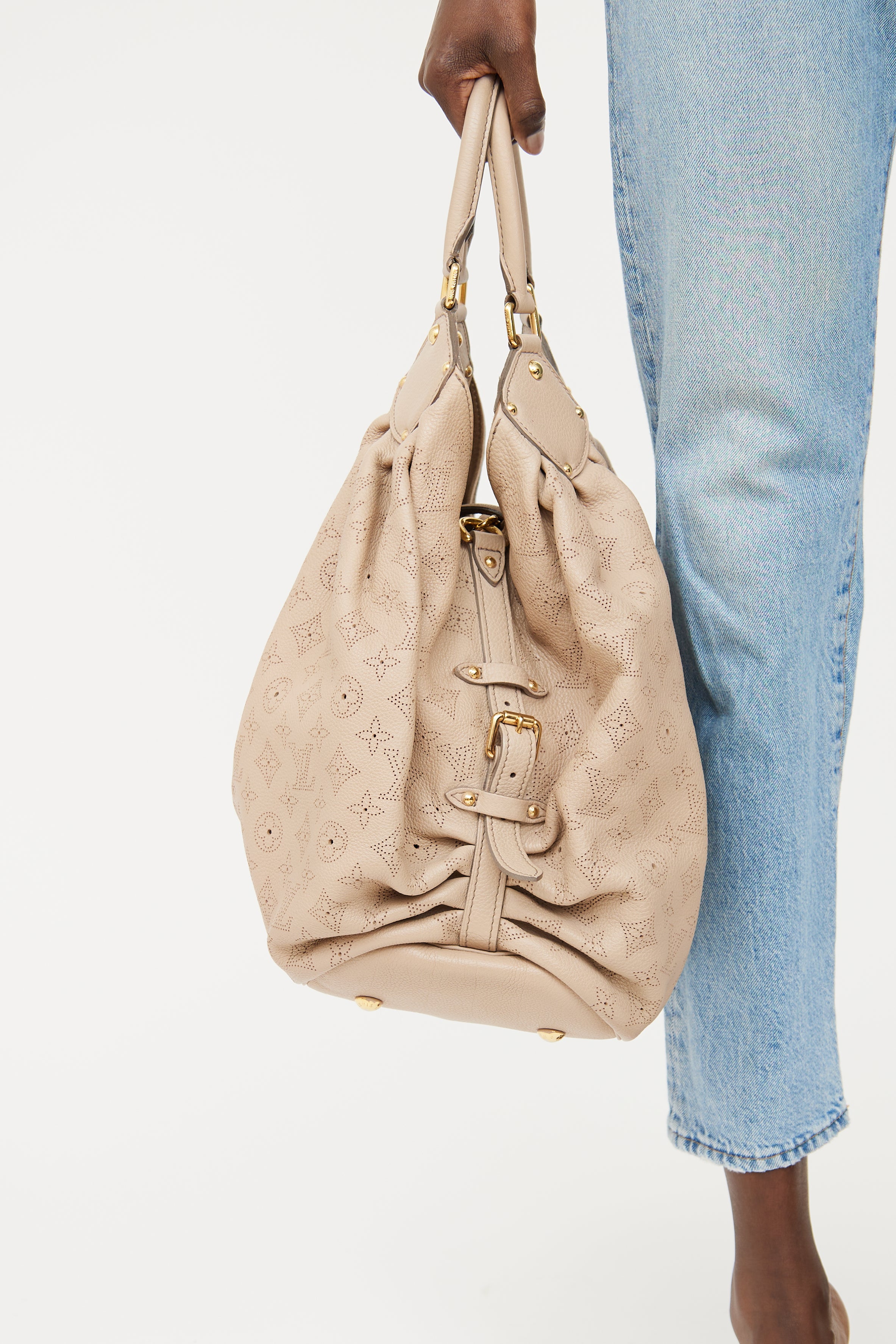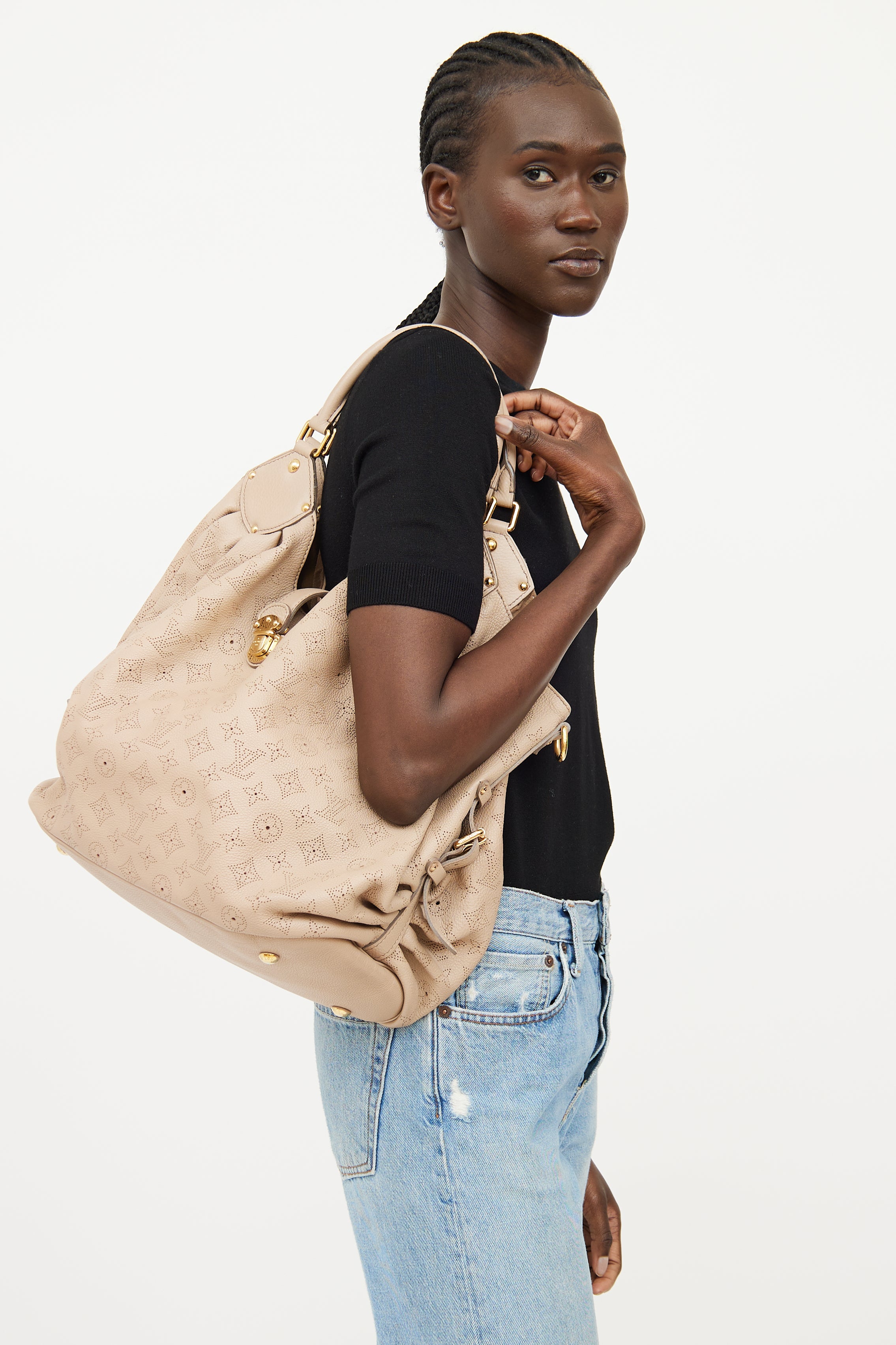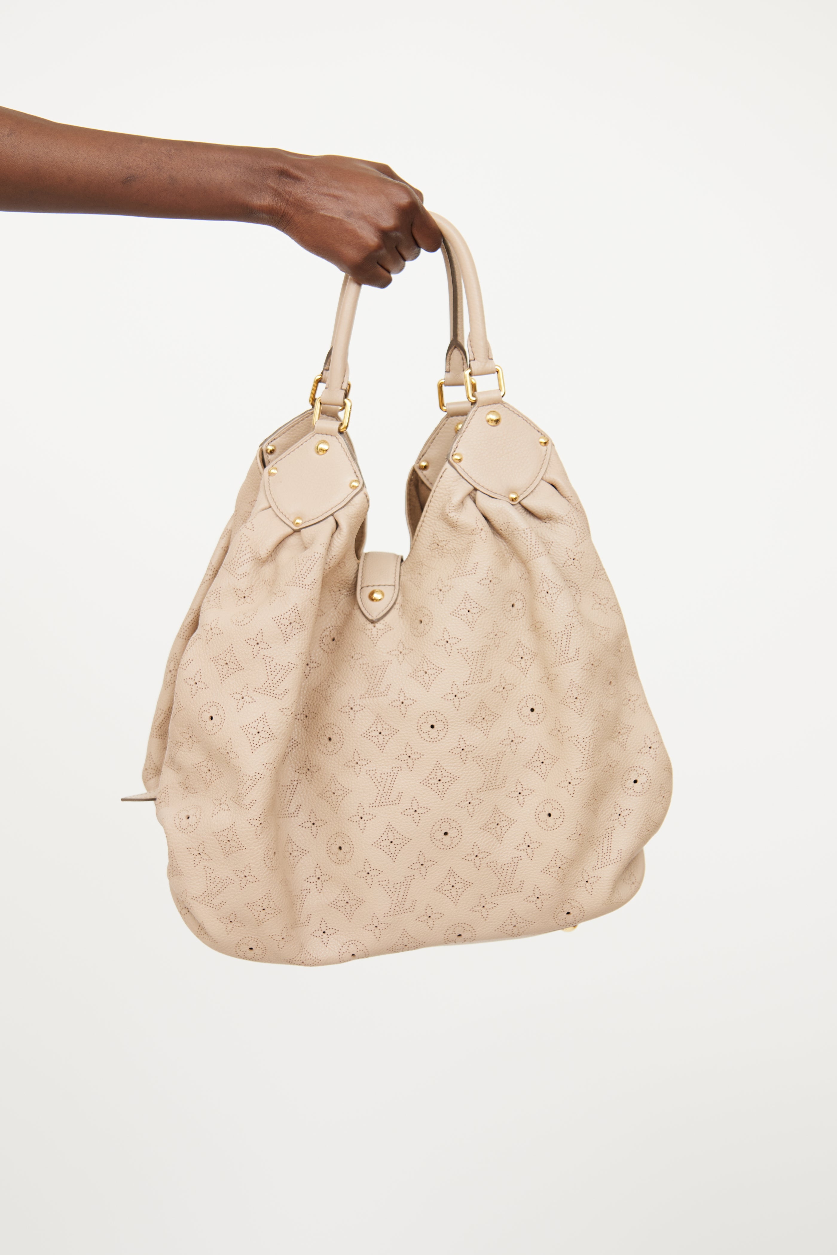 Pre-owned Louis Vuitton pink Mahina Solar shoulder bag featuring relaxed silhouette with pleating, perforated monogram print, pebbled leather, adjustable side straps with square buckles, dual rolled top handles, stud details throughout, brown microfiber interior with single zip pocket, top strap with clip closure at side, top strap with push closure, and gold-tone hardware.