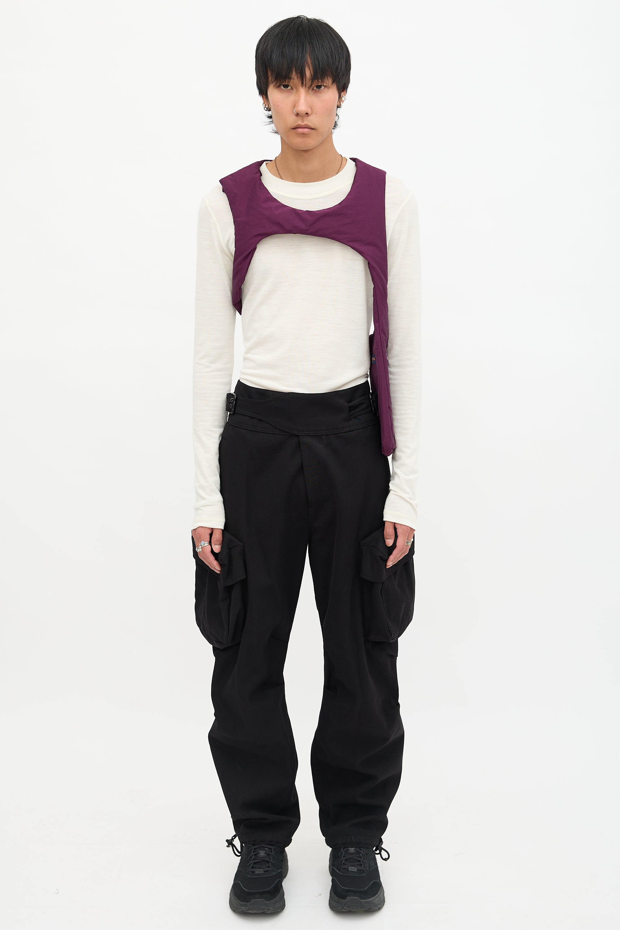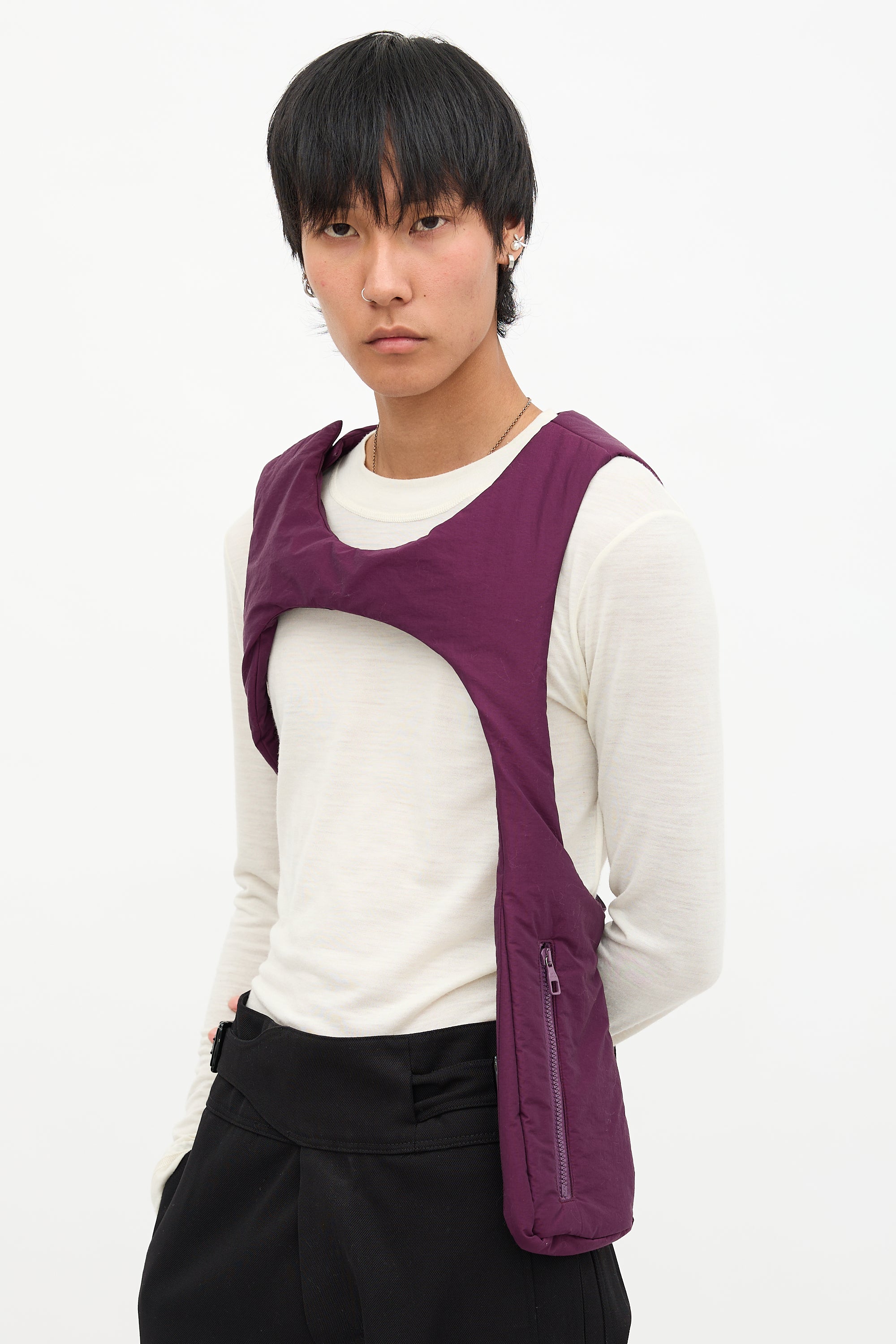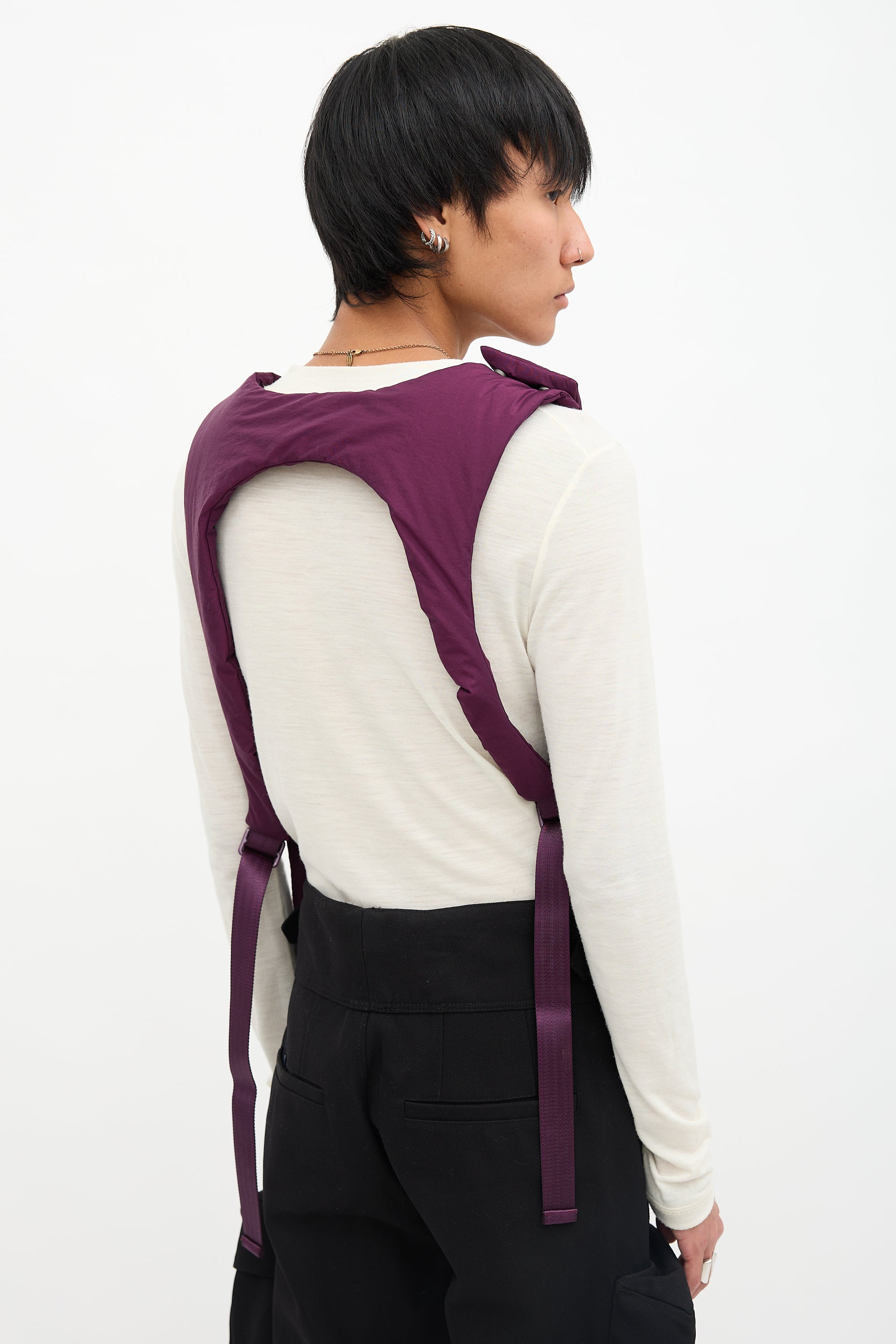 Pre-owned Louis Vuitton Spring Summer 2019 purple technical fabric padded harness vest featuring snap closure at right shoulder, zip pocket at left side, and adjustable grosgrain straps at underarms. Virgil Abloh era design.