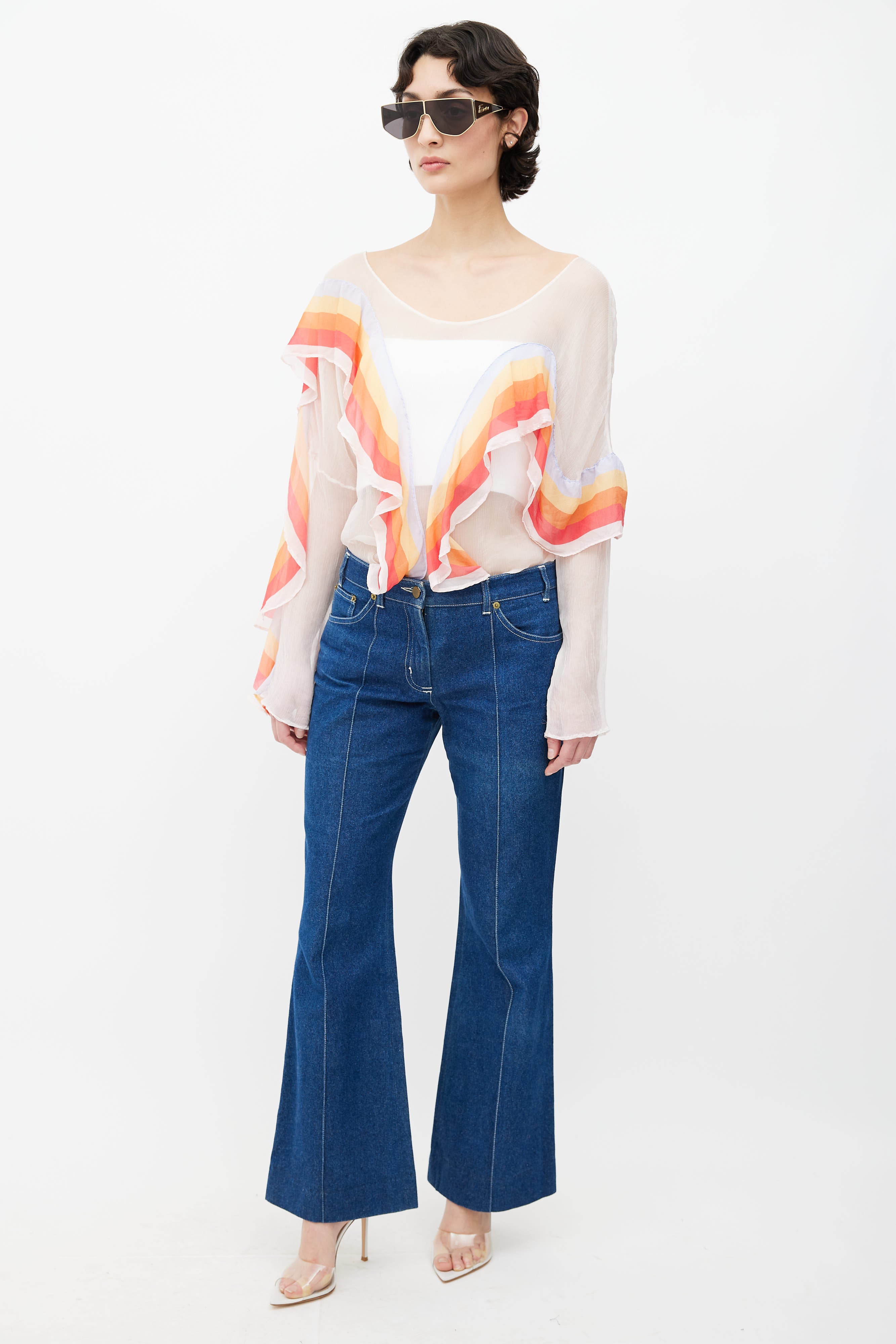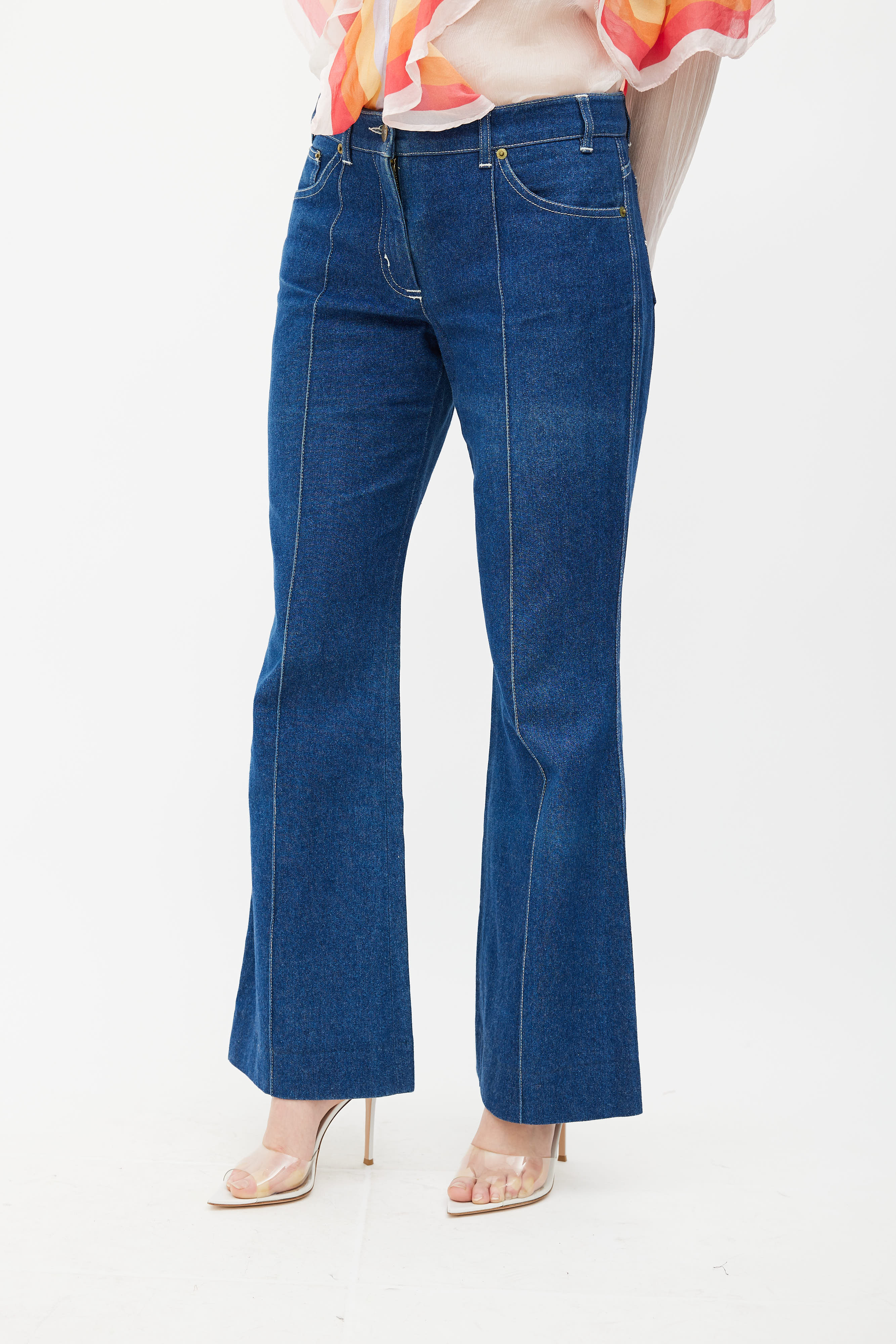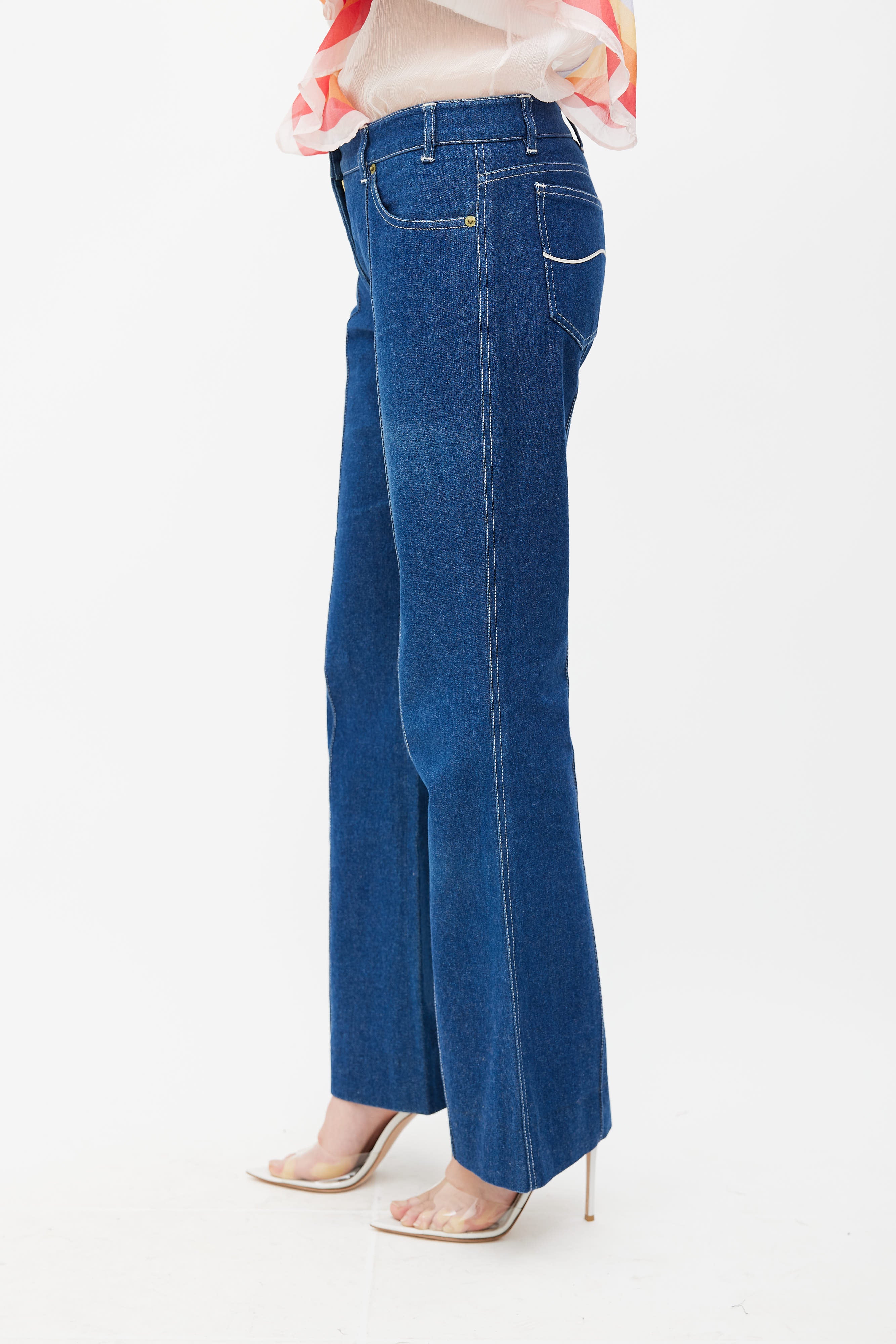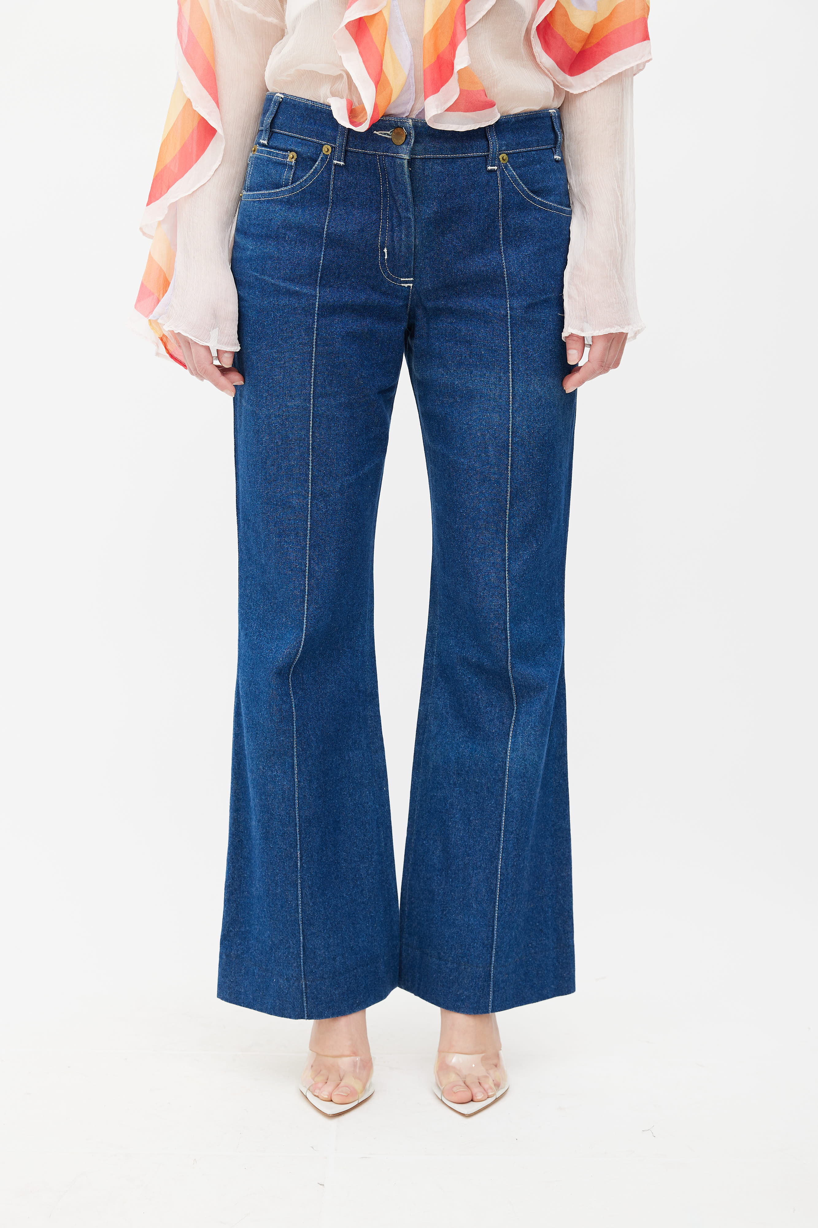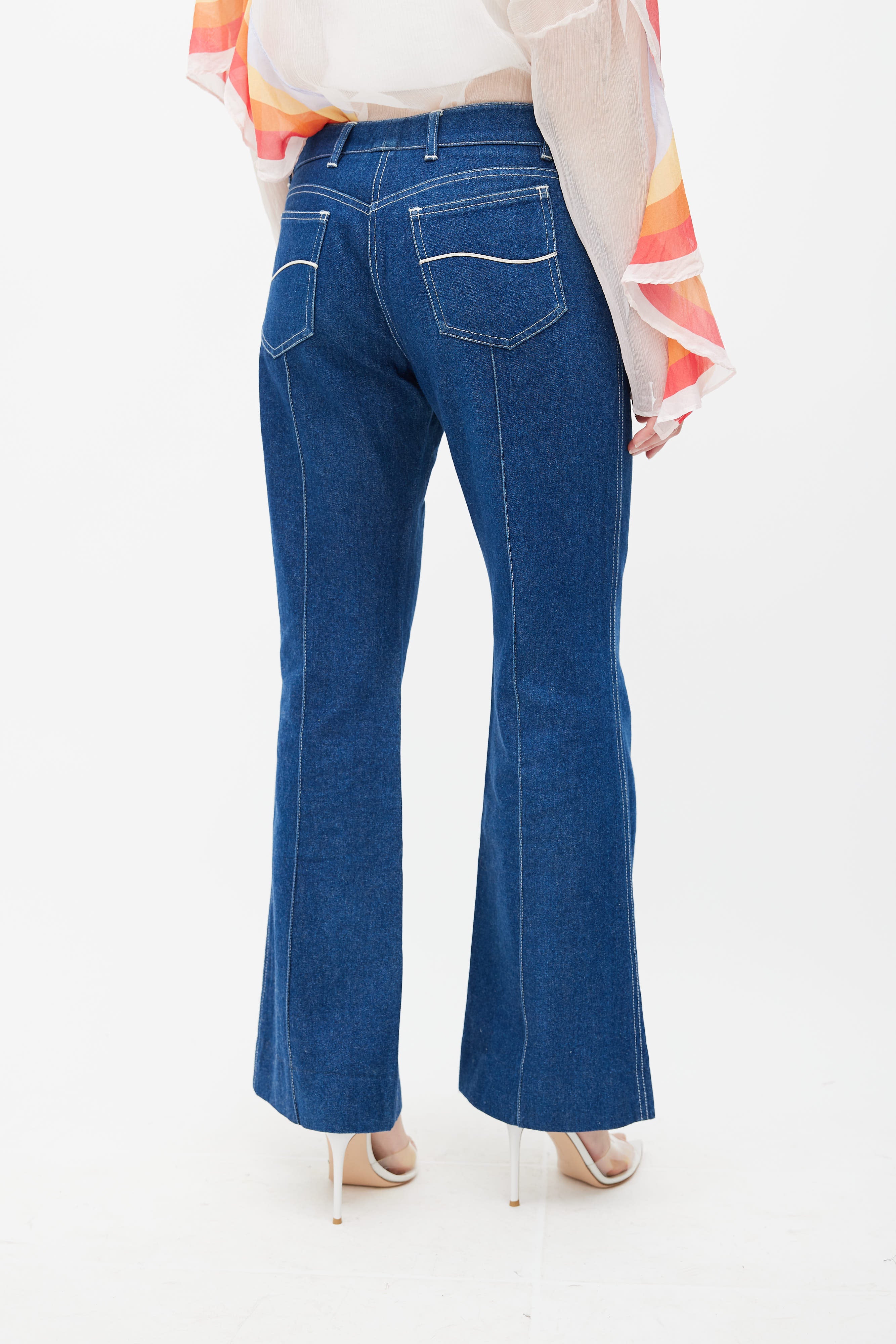 Pre-owned Chloé blue mid wash wide leg jeans featuring belt loops, zip fly, five pockets styling, contrast stitching, and white cords detail at back pockets.