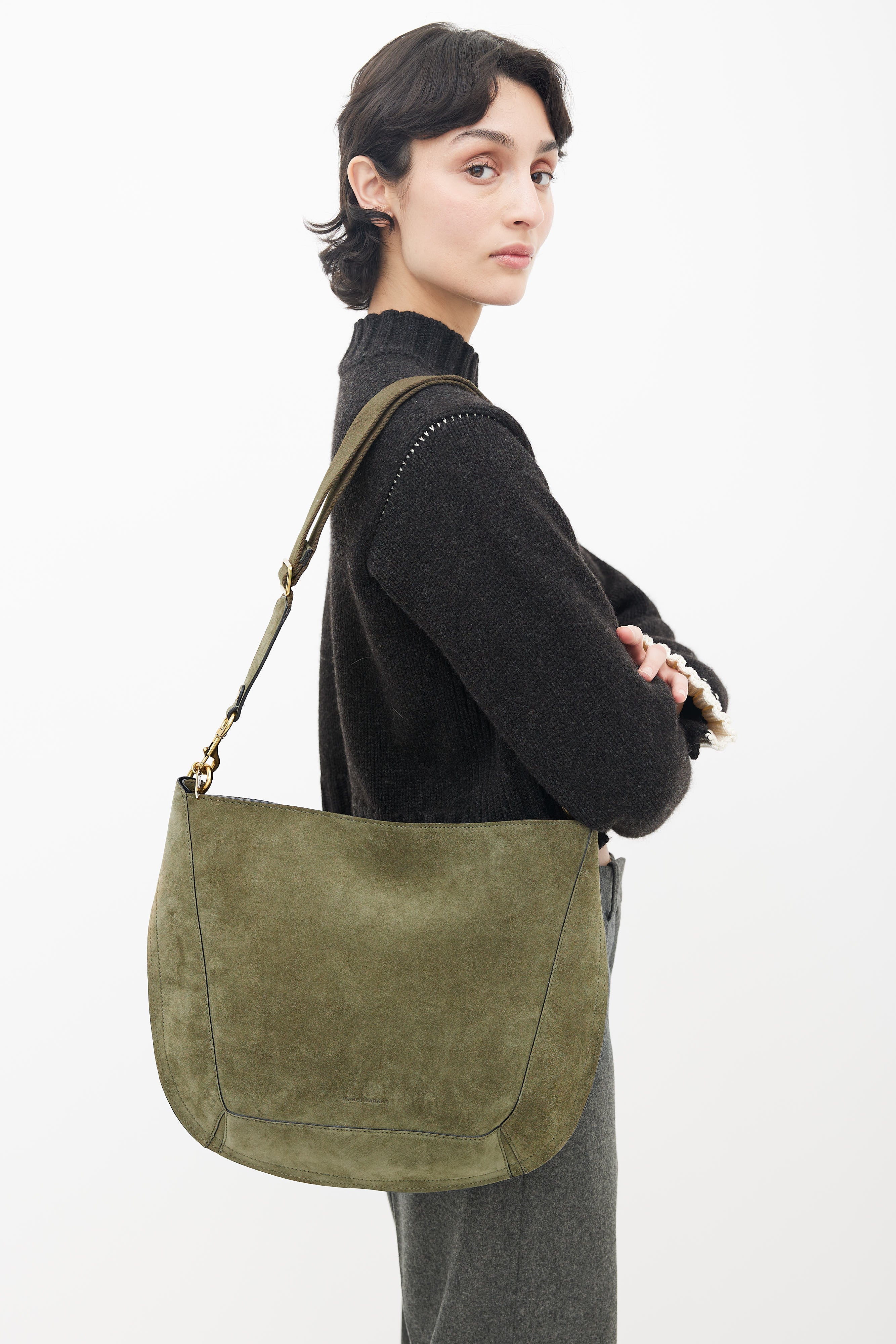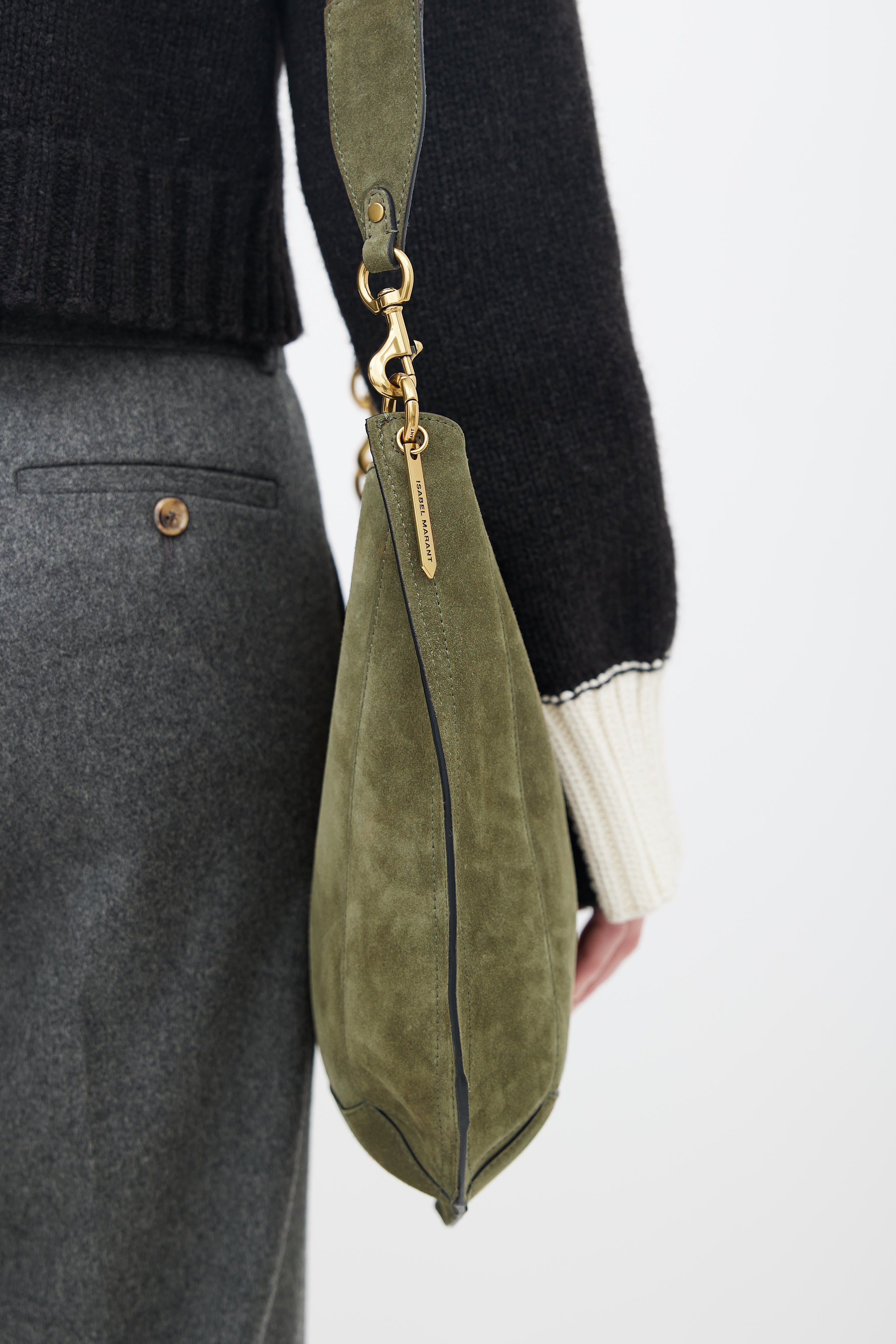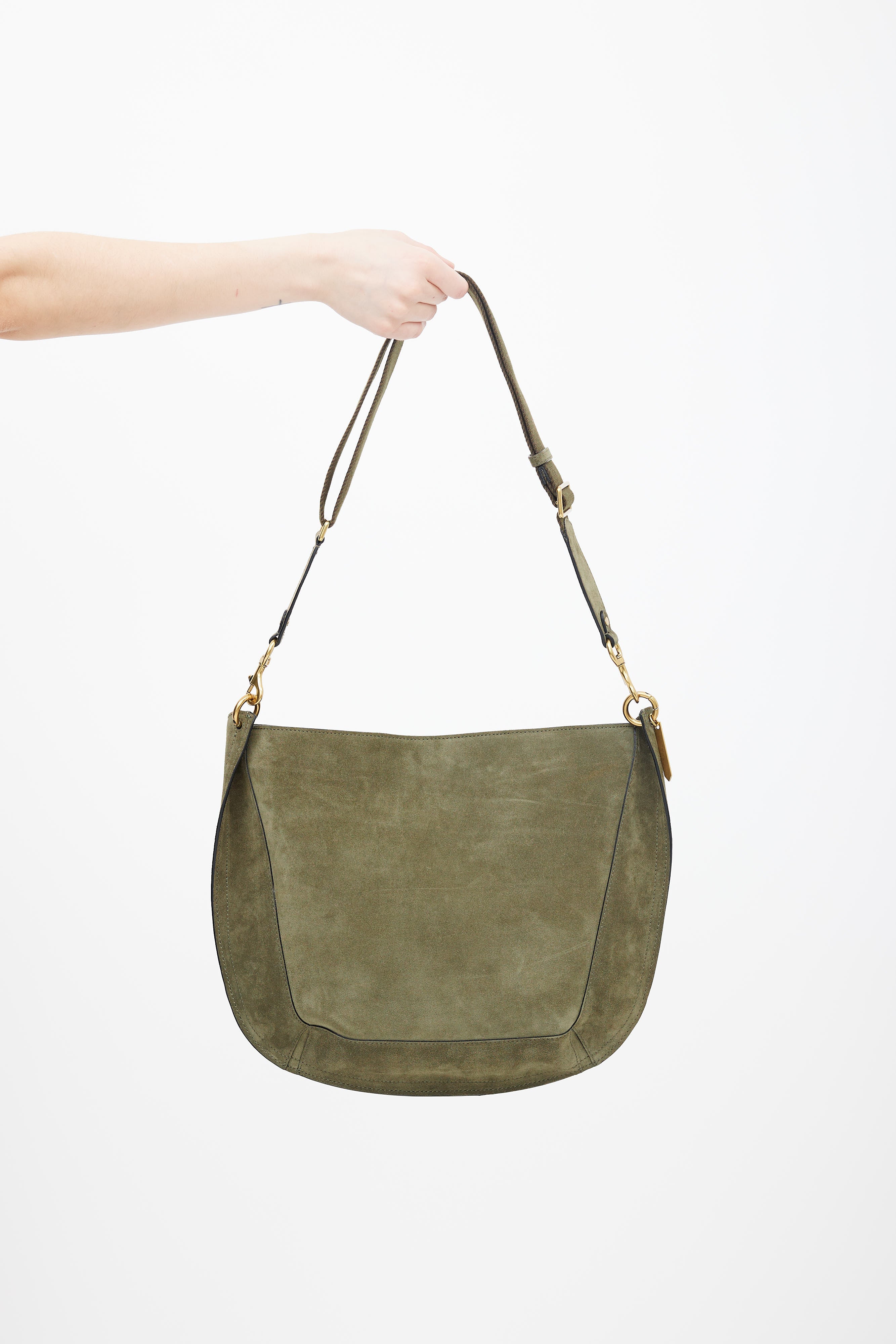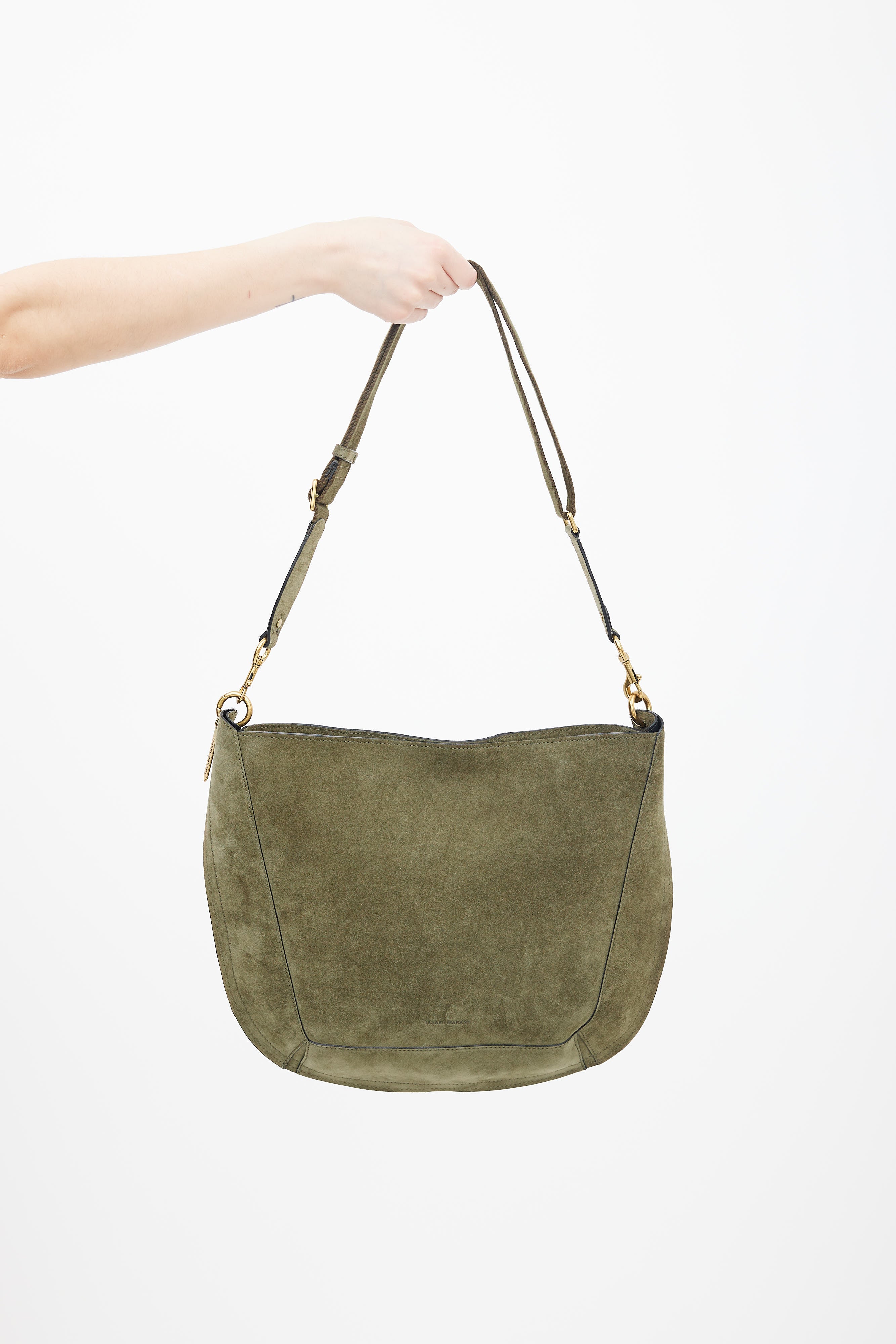 Pre-owned Isabel Marant Basko shoulder bag in green featuring embossed logo at front, top zip closure, single main compartment, gold tone hardware, detachable shoulder strap, and logo charm at side.