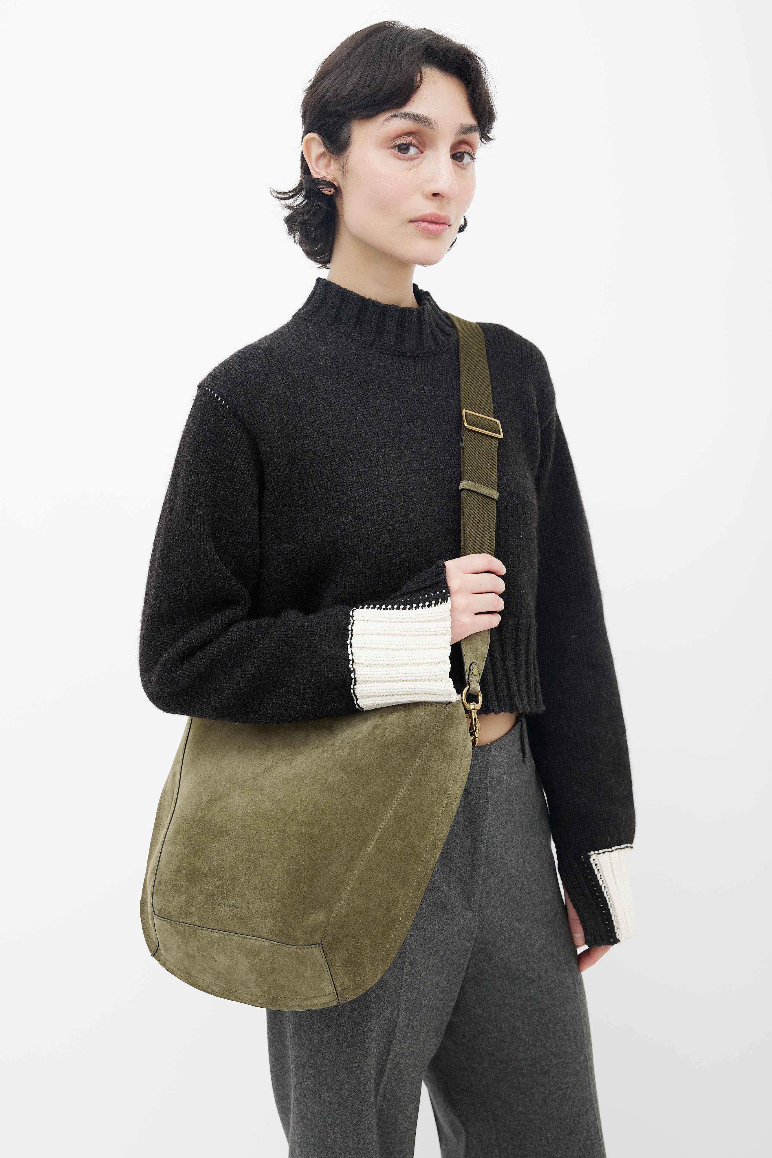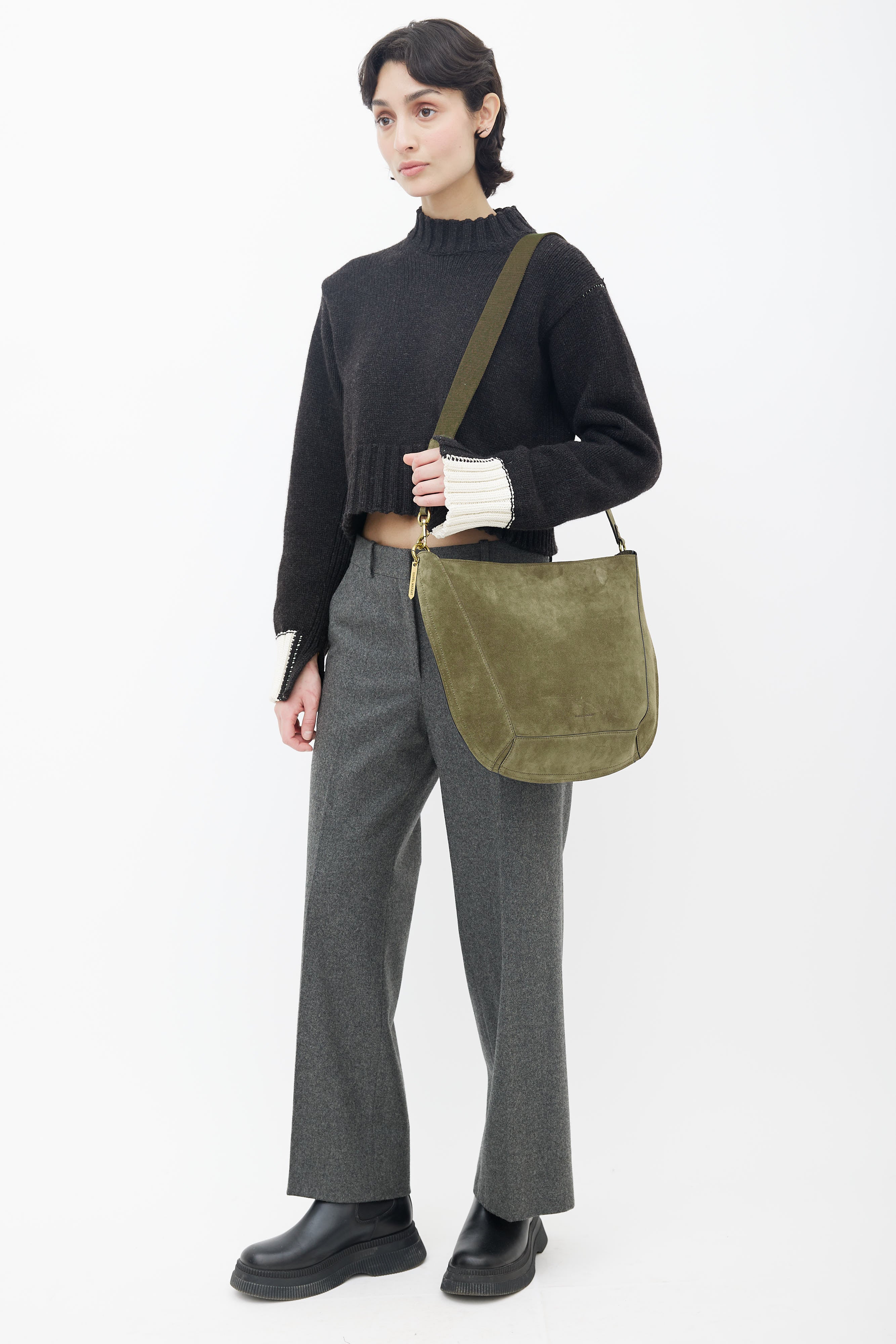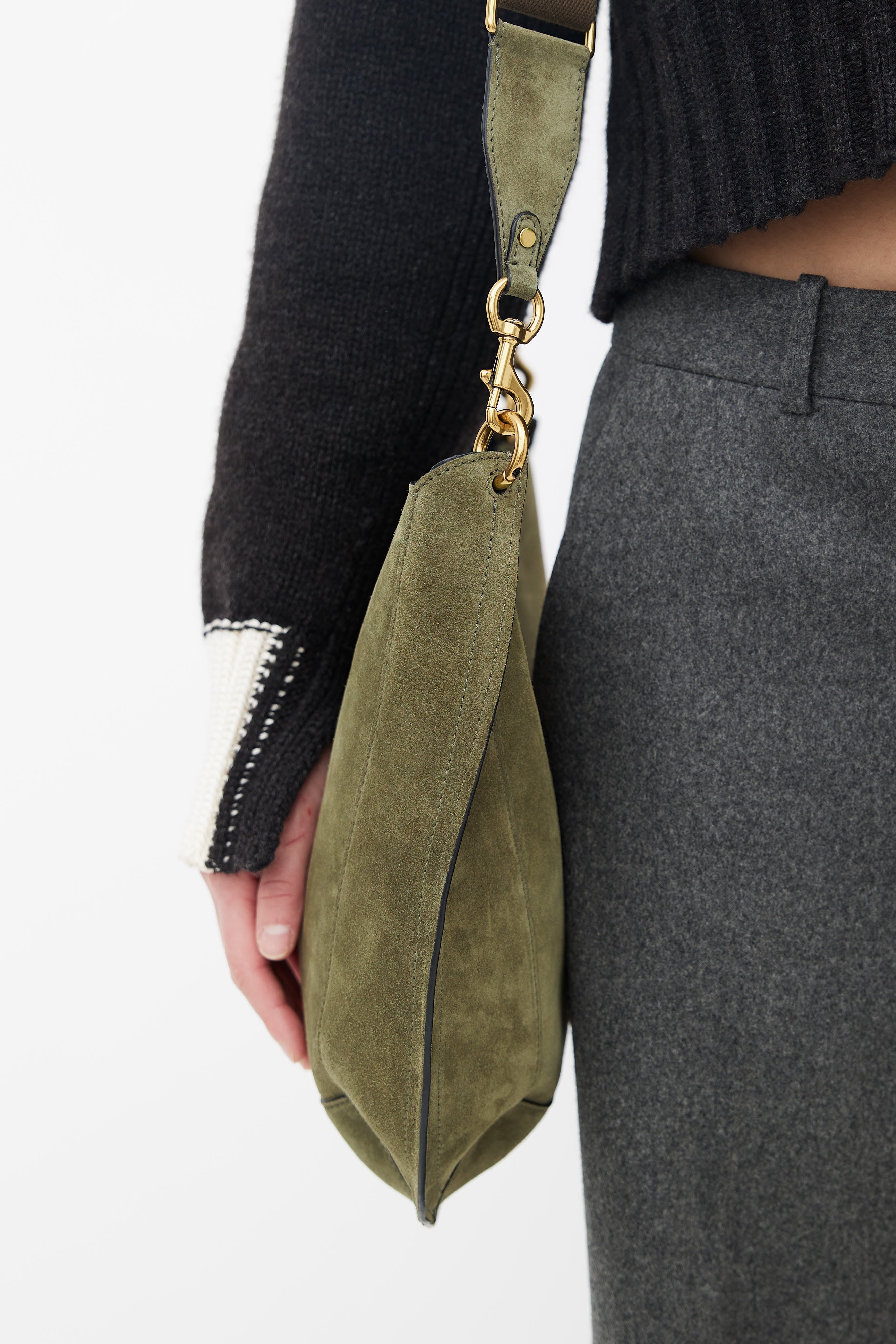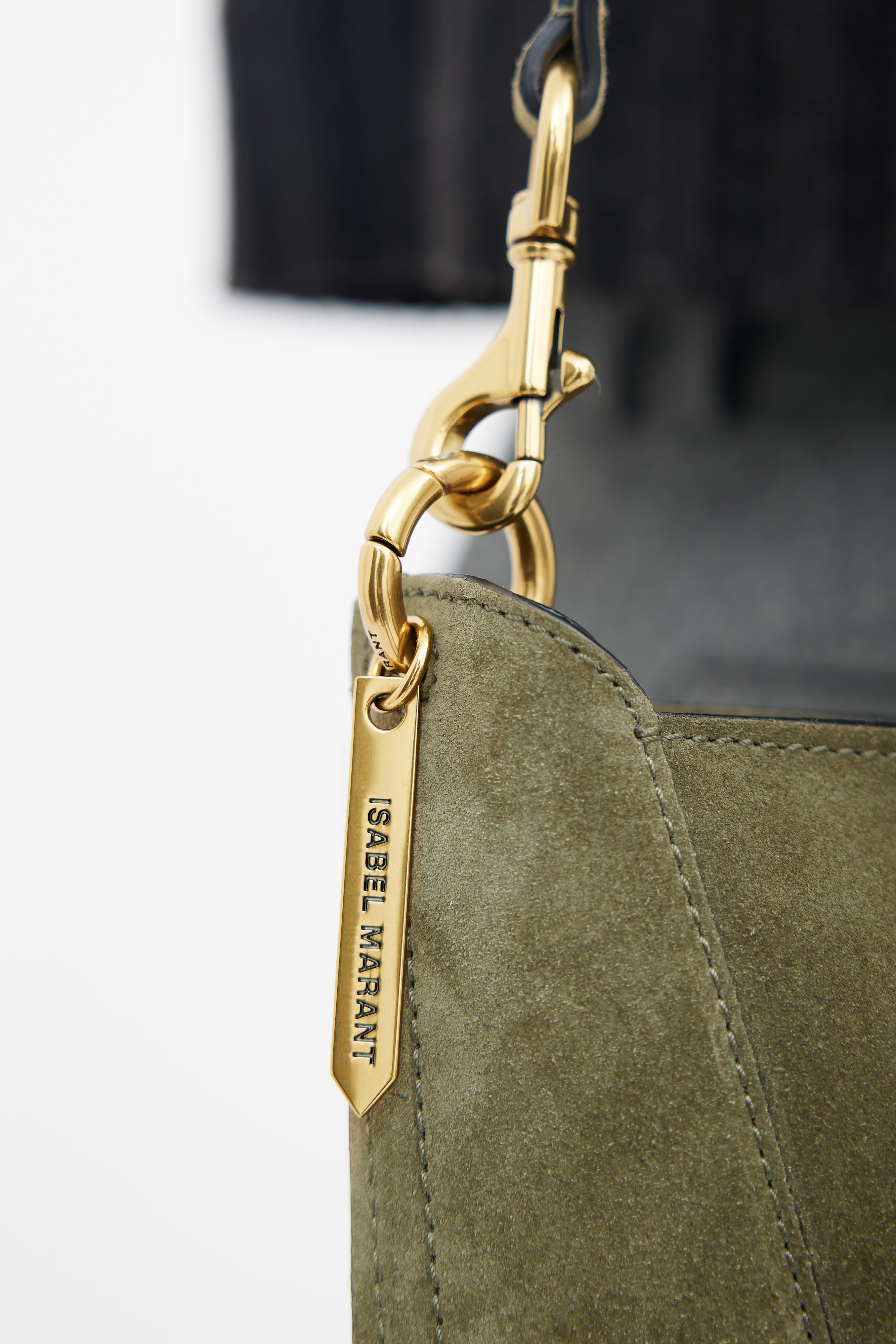 Pre-owned Isabel Marant Basko shoulder bag in green featuring embossed logo at front, top zip closure, single main compartment, gold tone hardware, detachable shoulder strap, and logo charm at side.