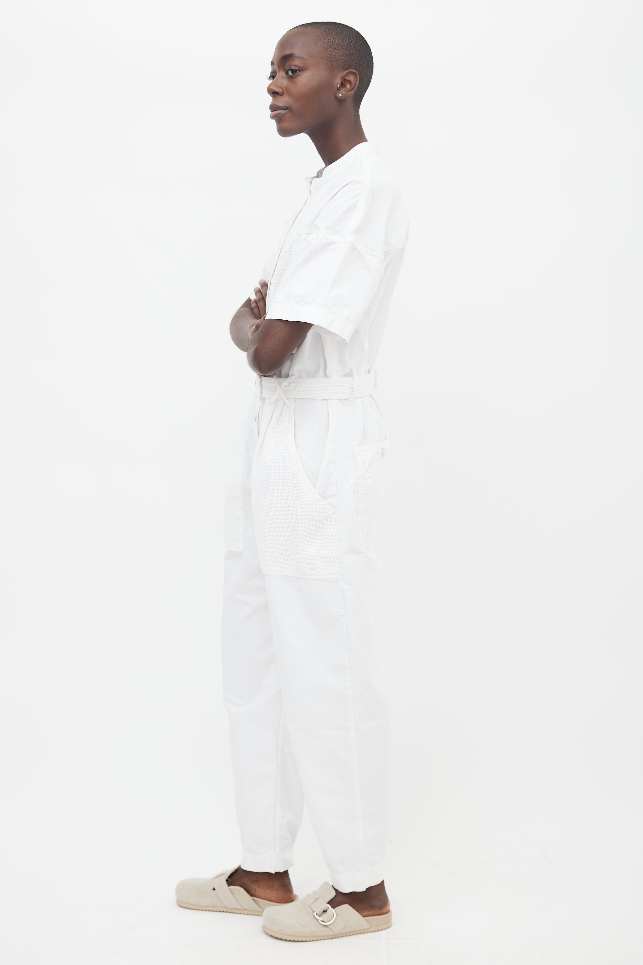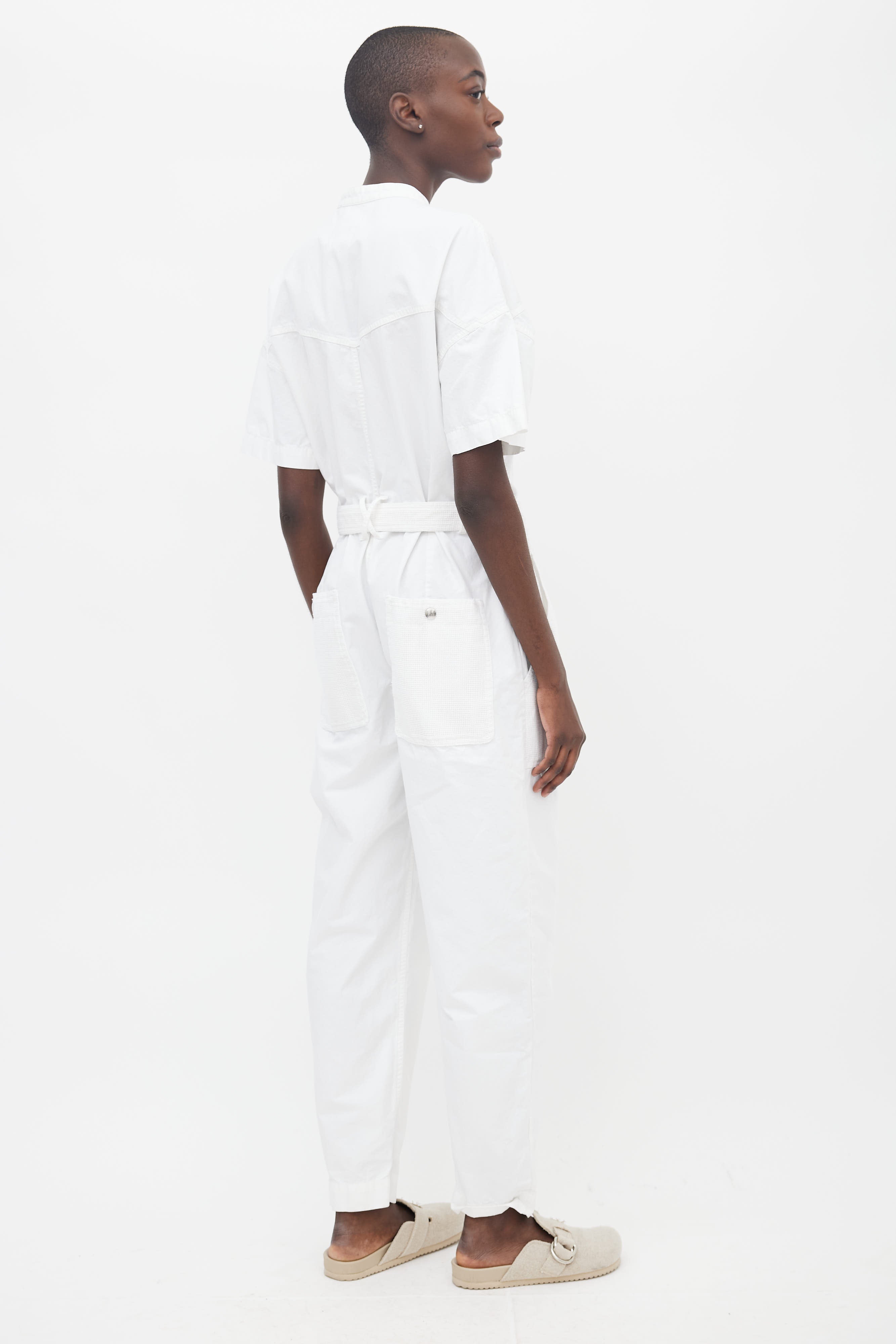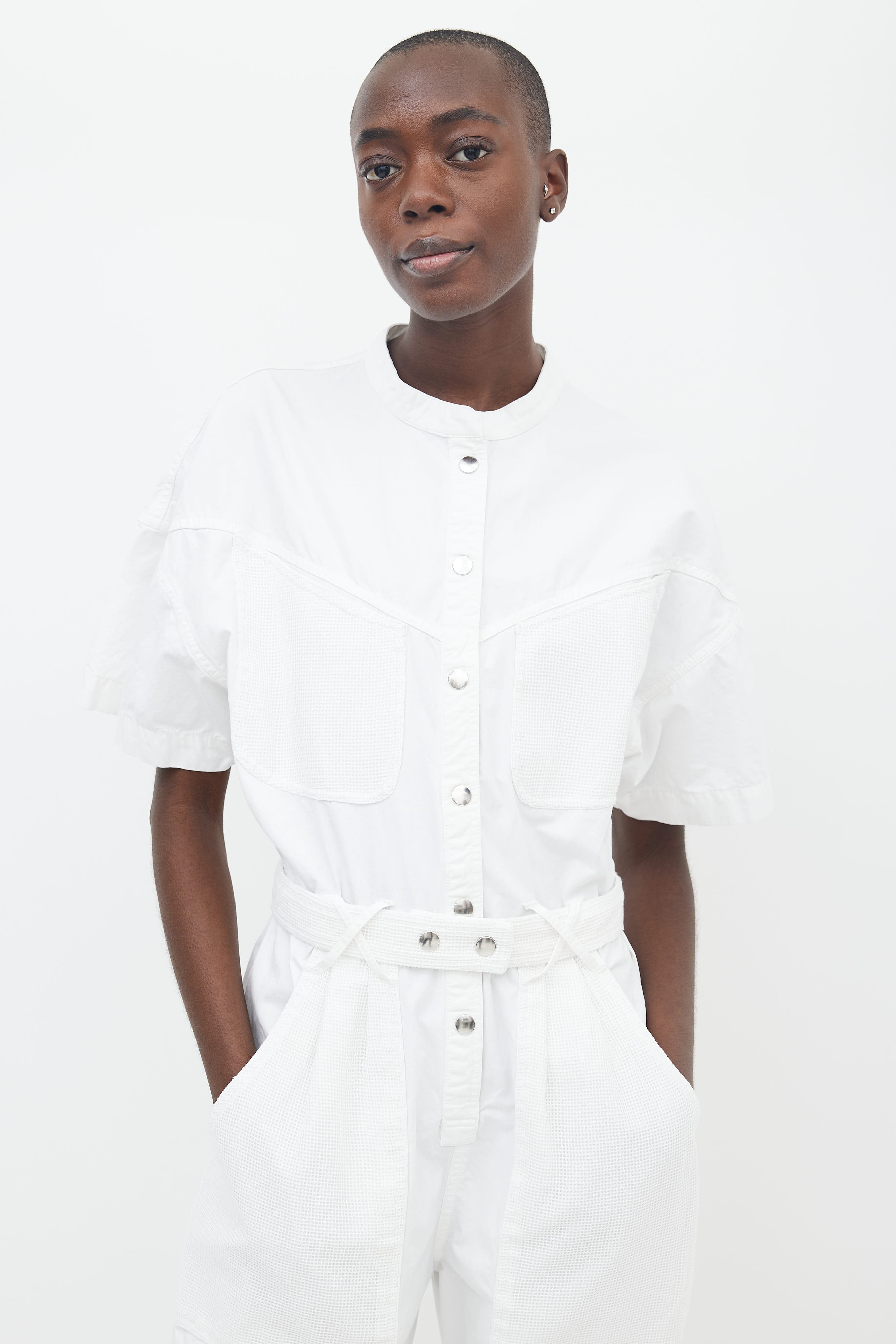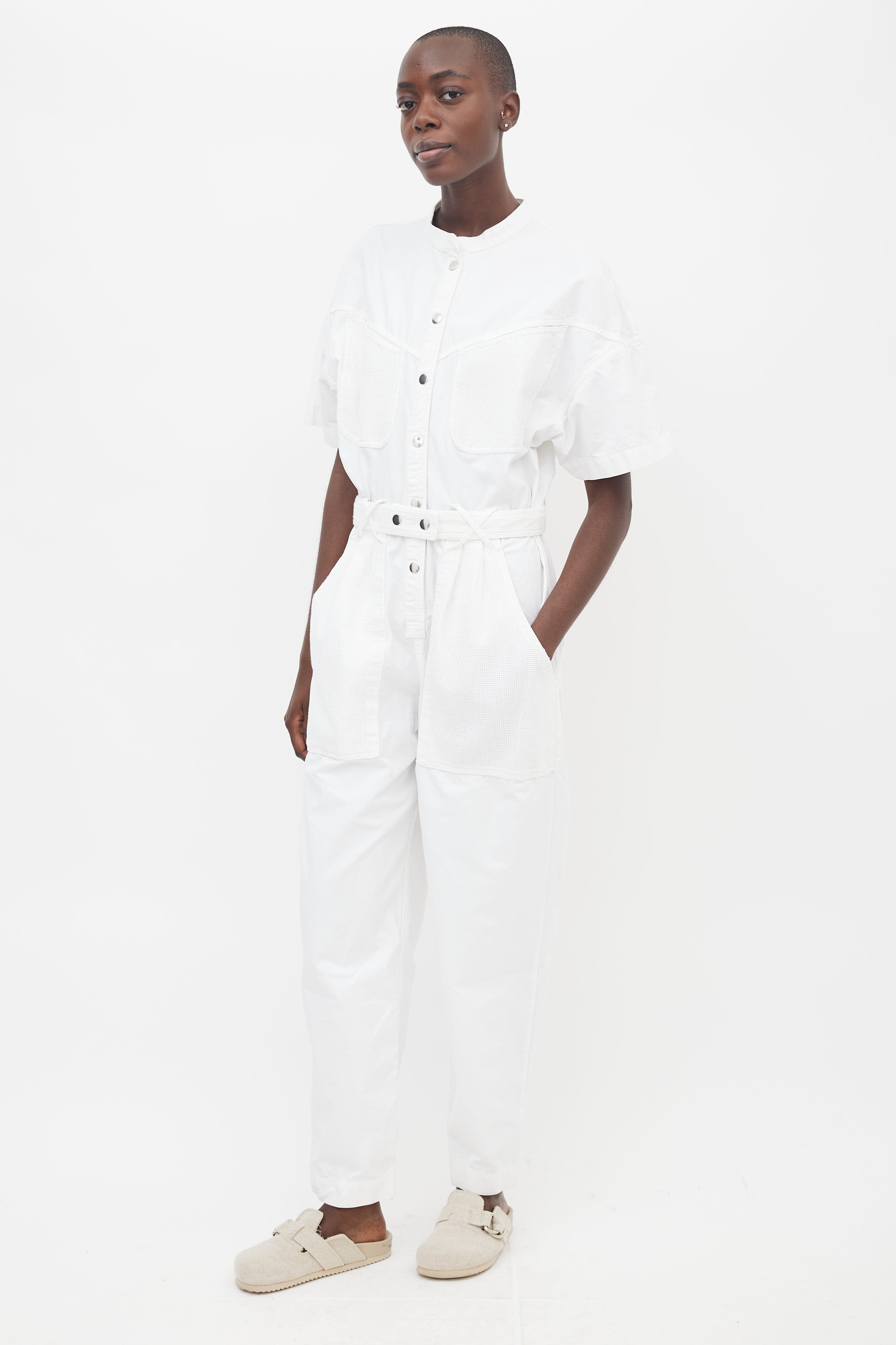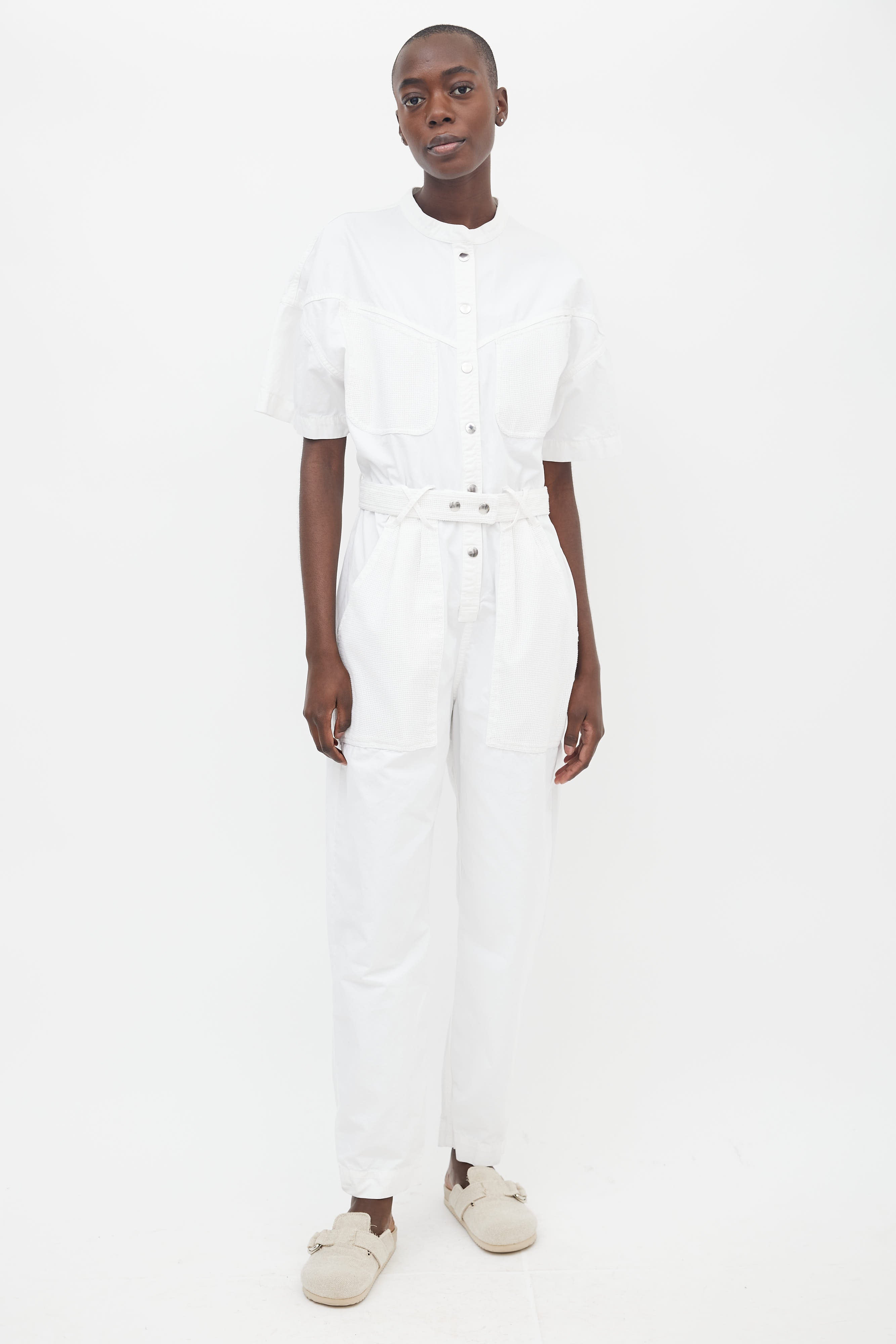 Pre-owned Isabel Marant white cotton jumpsuit featuring banded collar, drop shoulder, short sleeves, silver-tone snap button closure at front, four pockets at front with white mesh details, snap button belt at waist, two back pocket with mesh details and a straight leg.