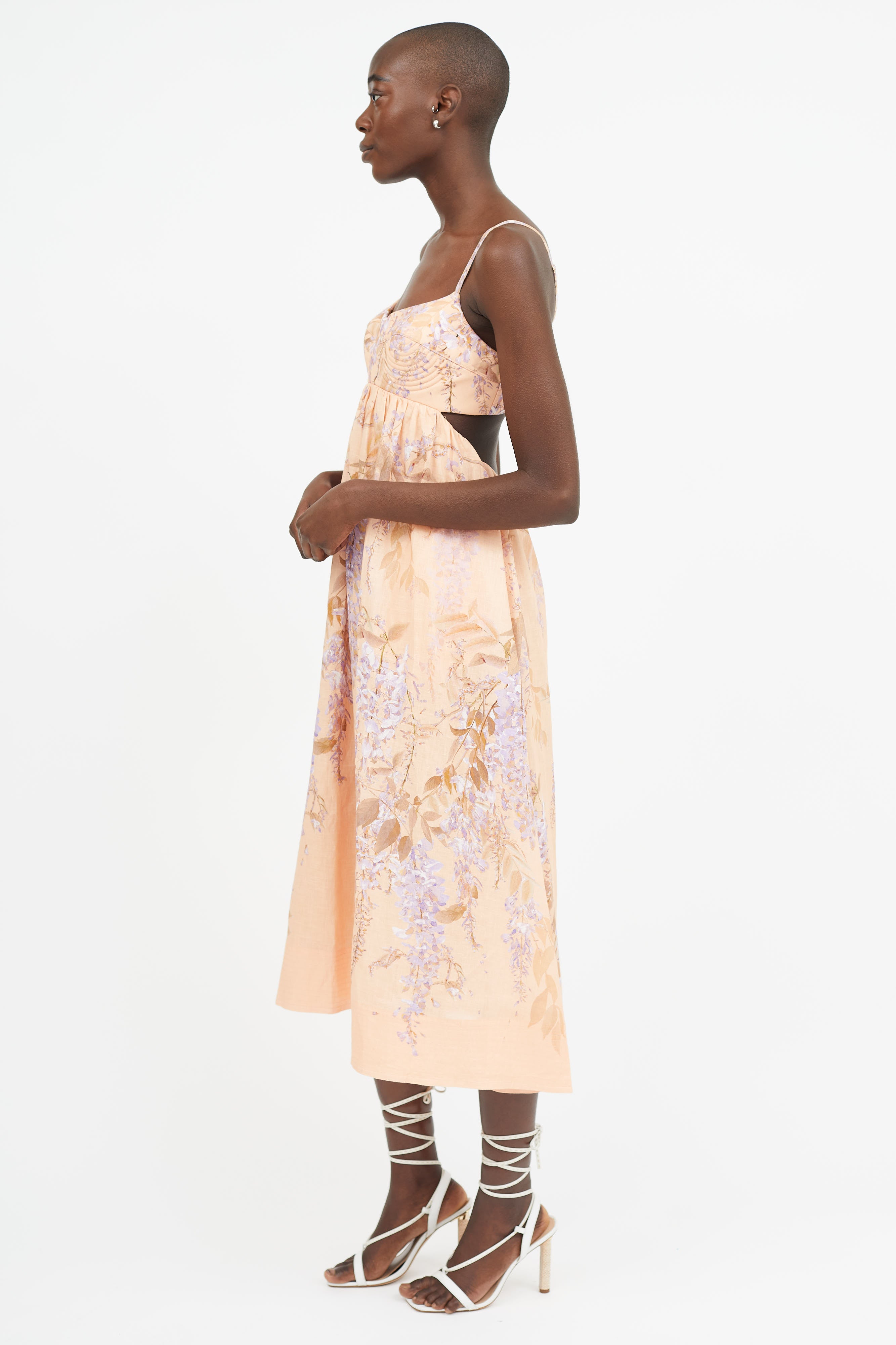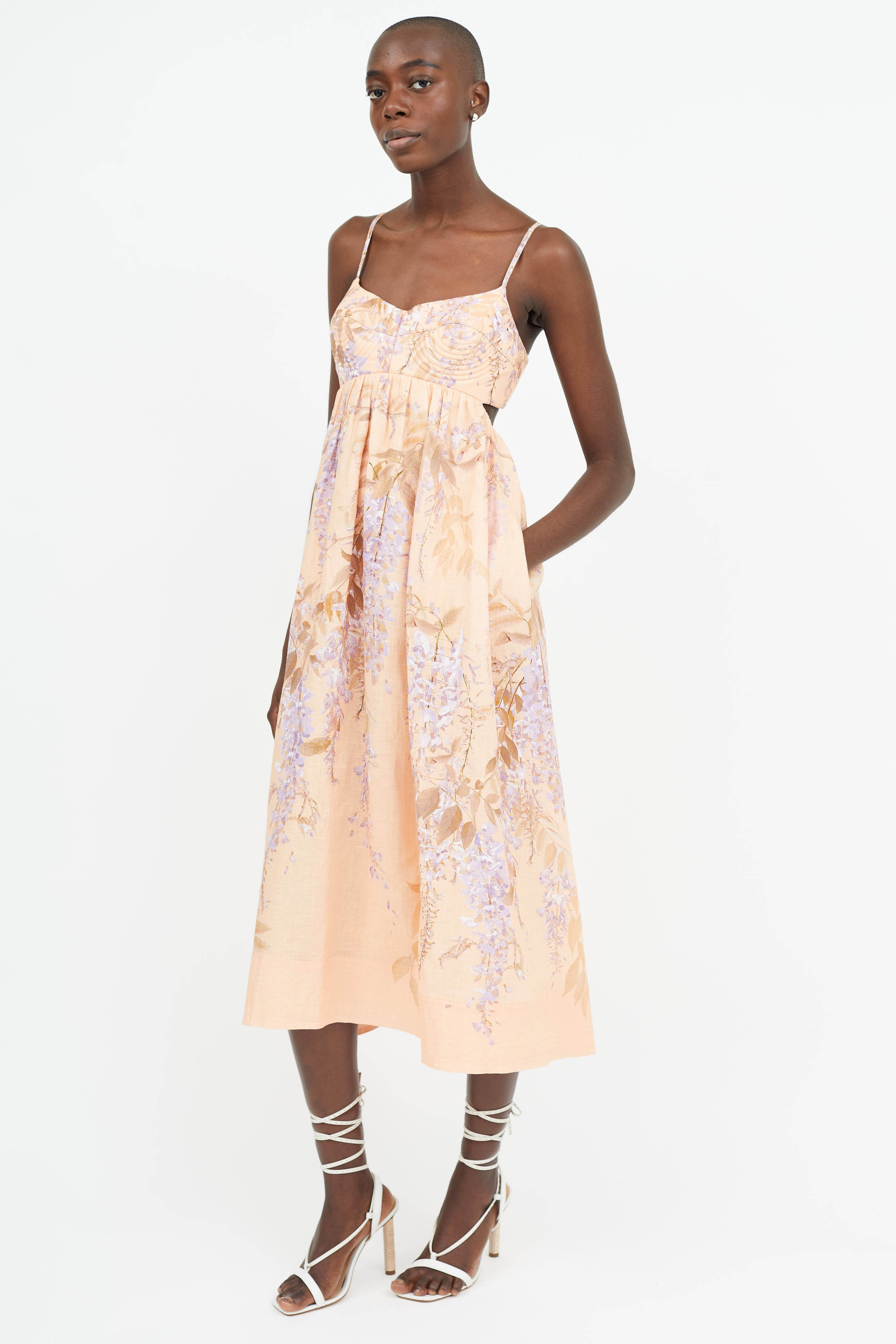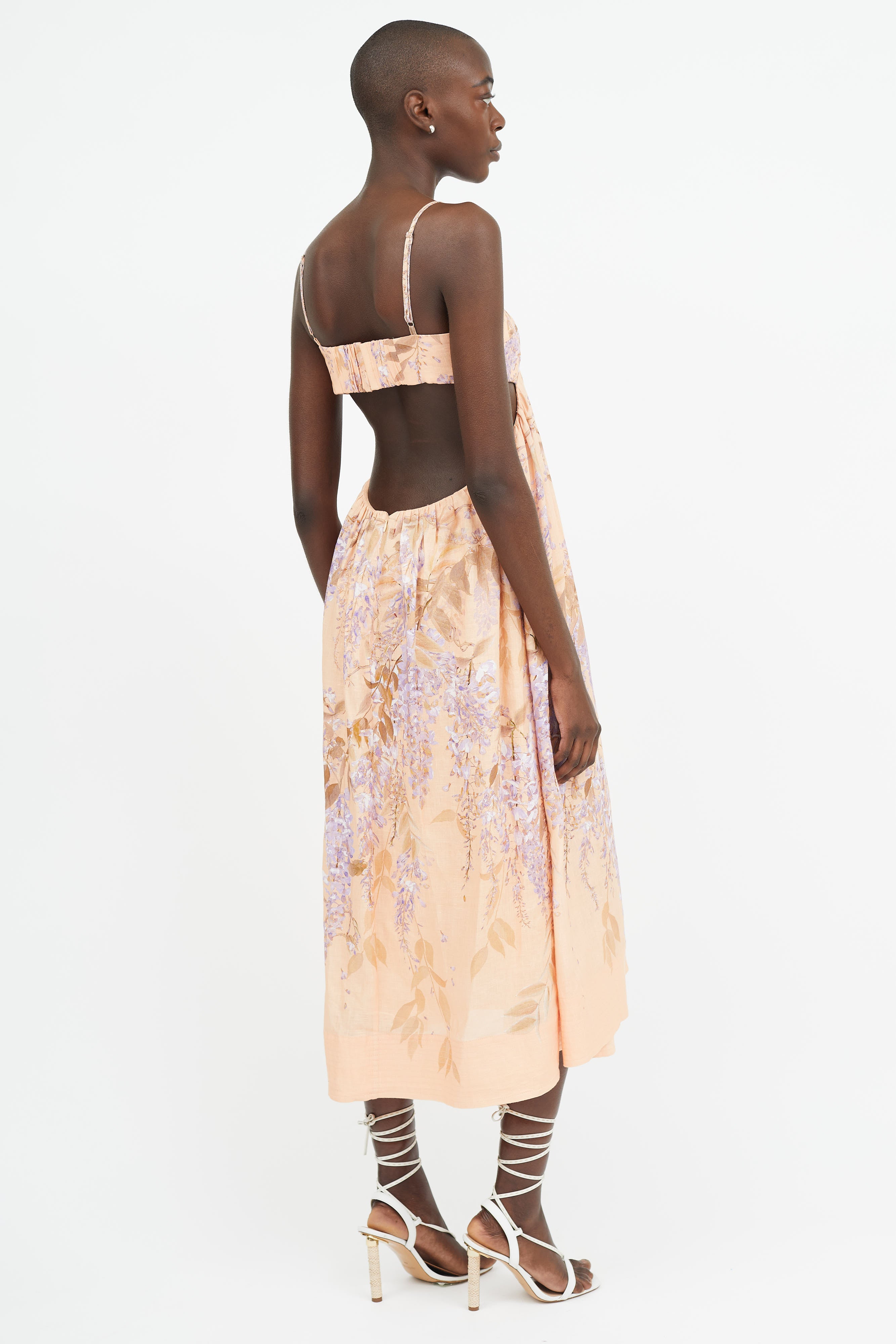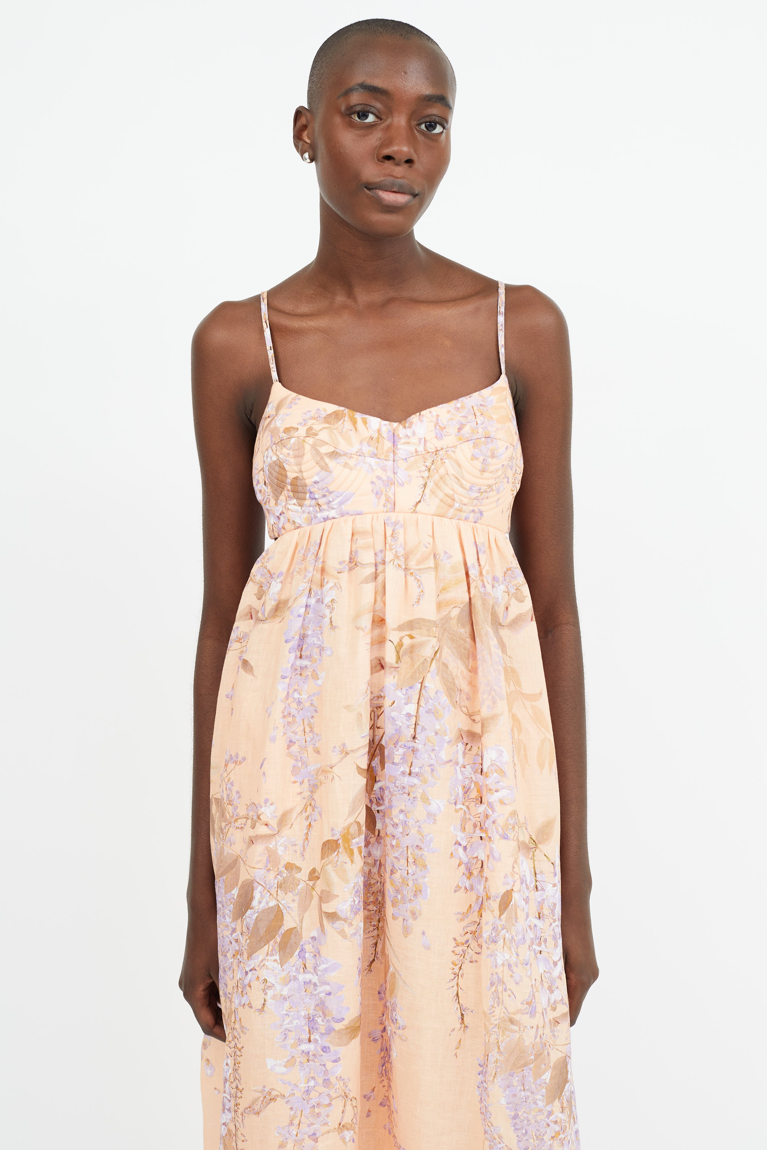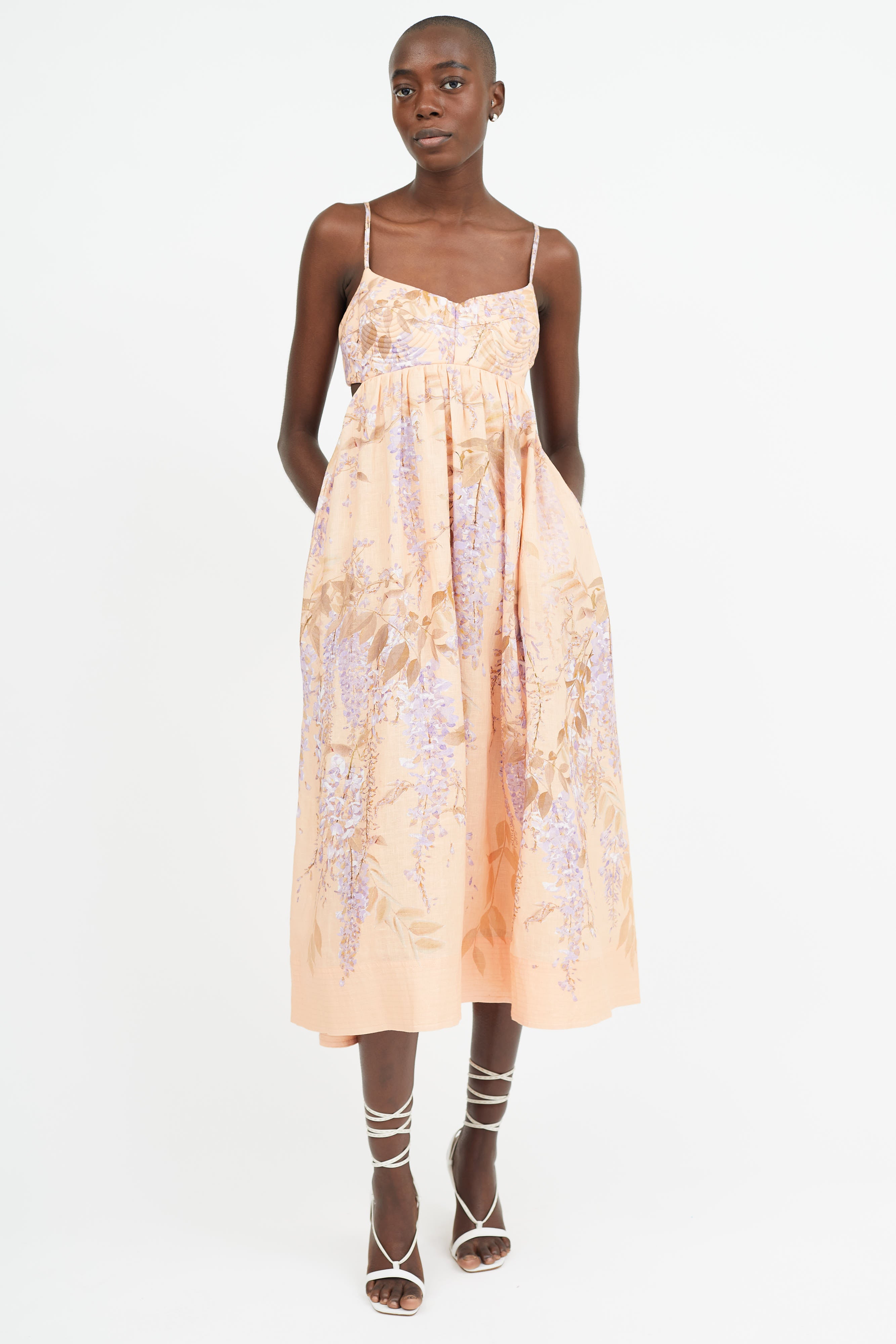Pre-owned Zimmerman orange and purple dress featuring a purple floral print throughout, sweetheart neckline, quilted bodice with tonal spaghetti straps, empire waistline, lined skirt interior, hook and eye bra closure, and concealed zip at back. Clipped to fit model.