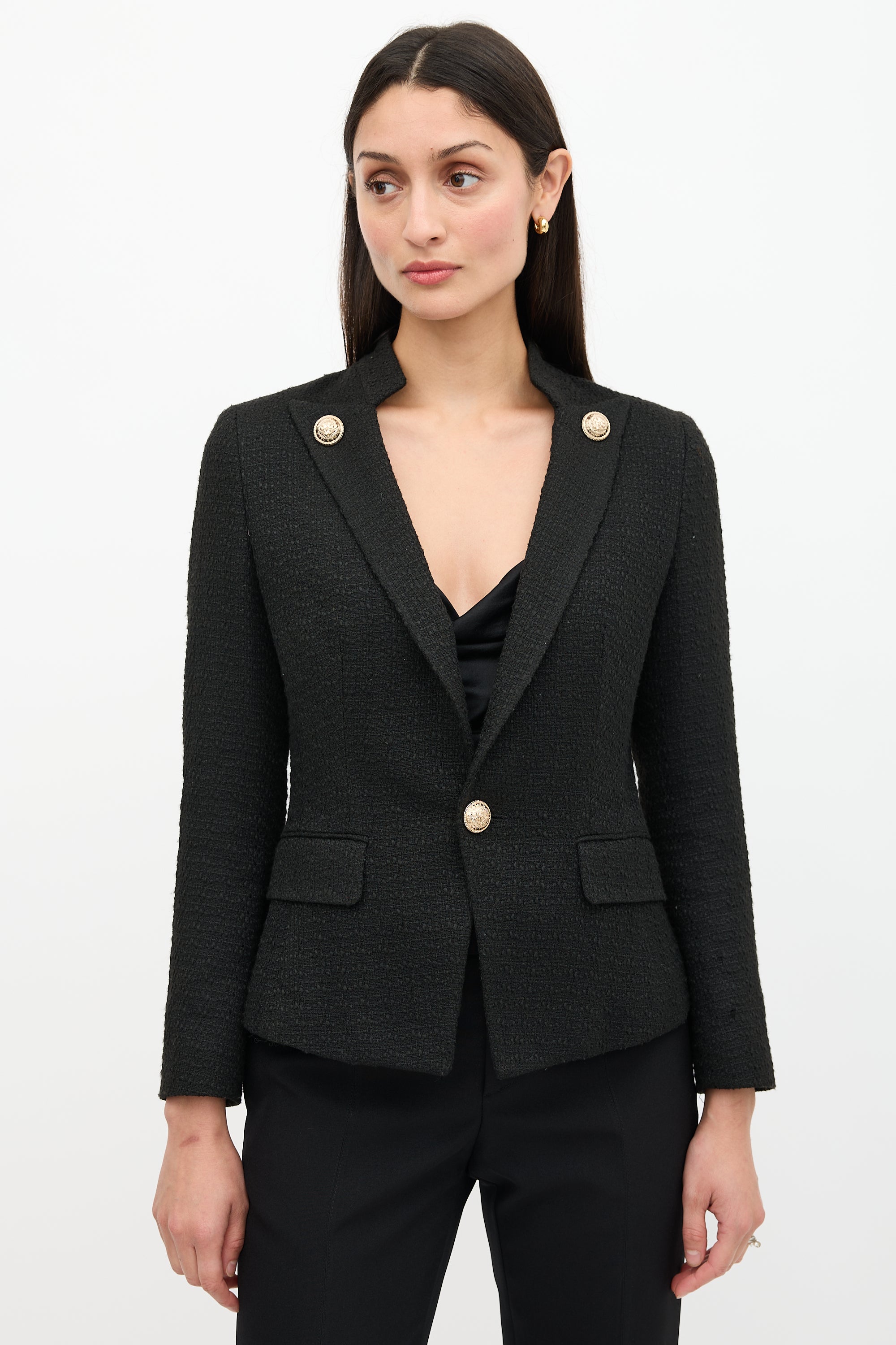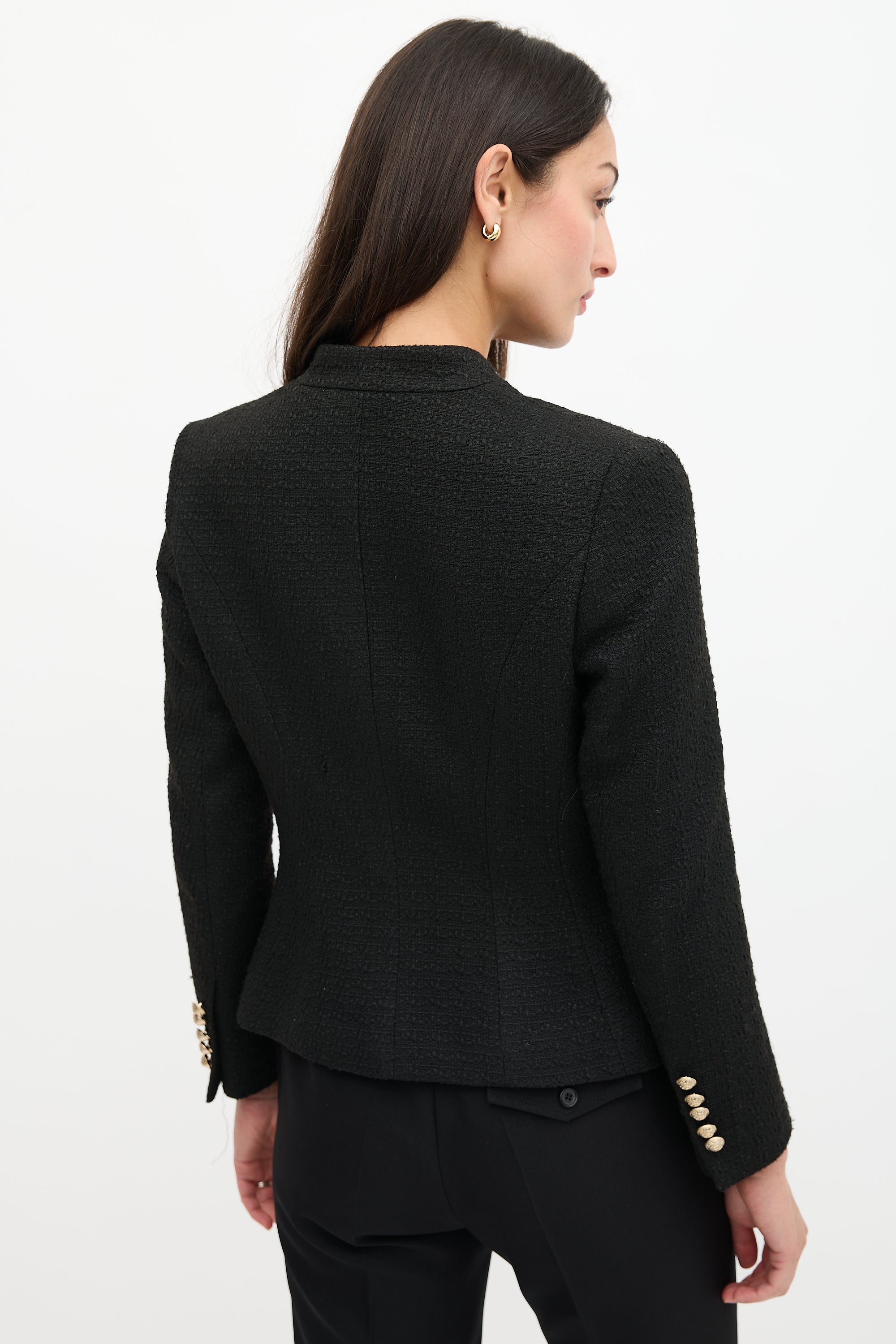 Pre-owned Balmain black tweed blazer featuring a stand collar with a buttoned lapel, gold tone embellished hardware, single button closure, two flap pockets, and buttoned cuffs. Lined.