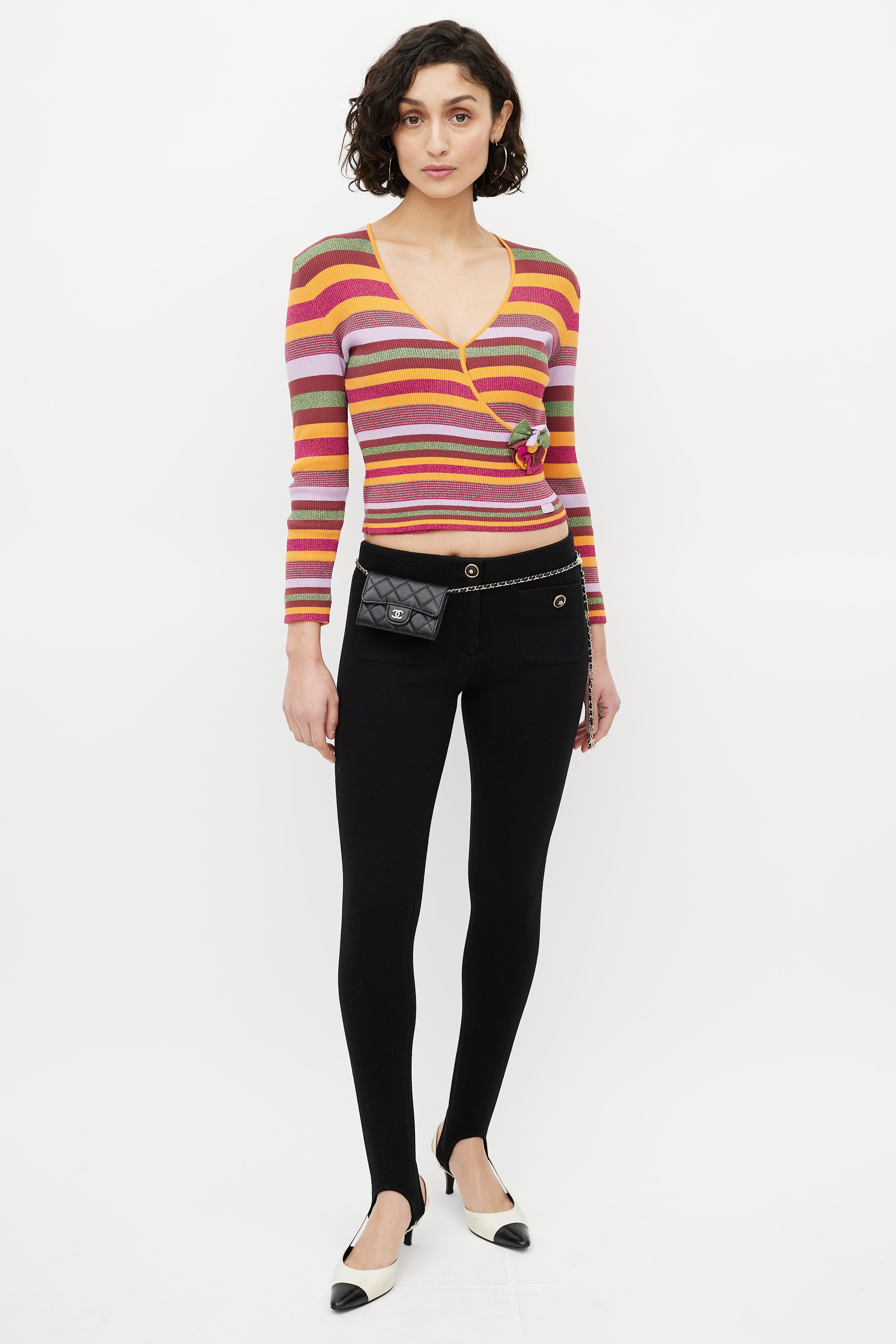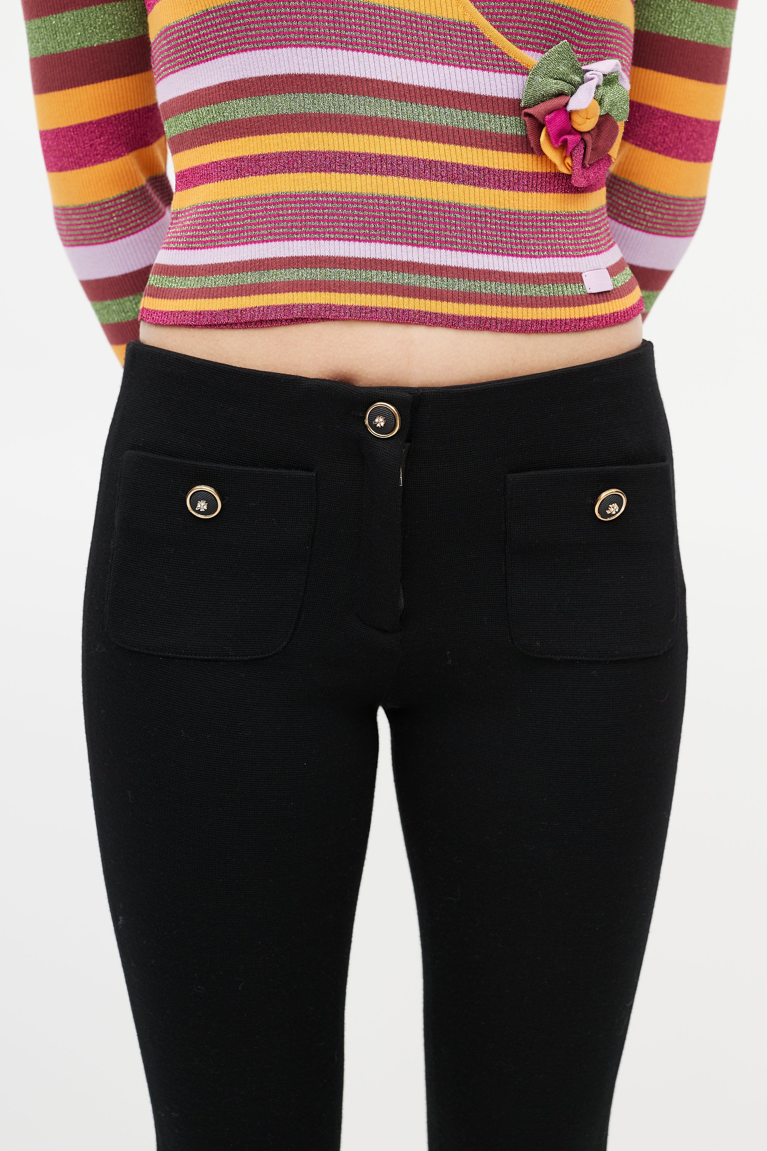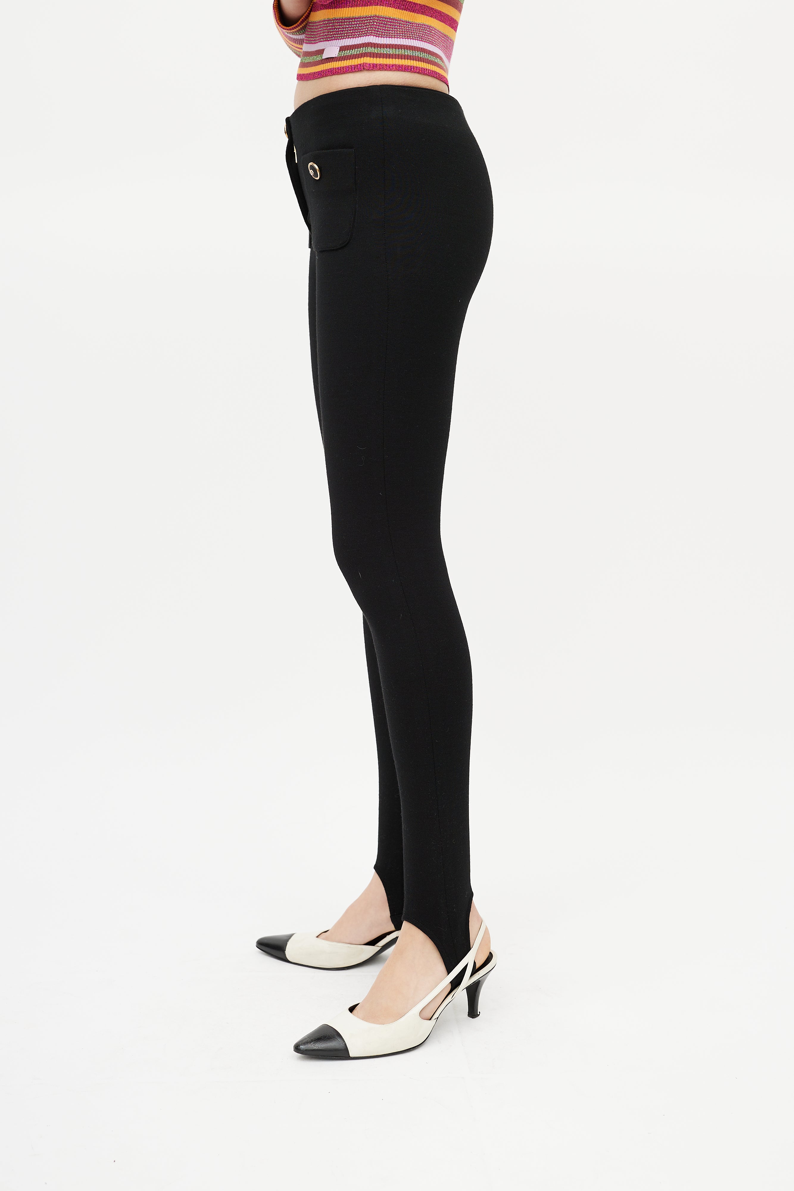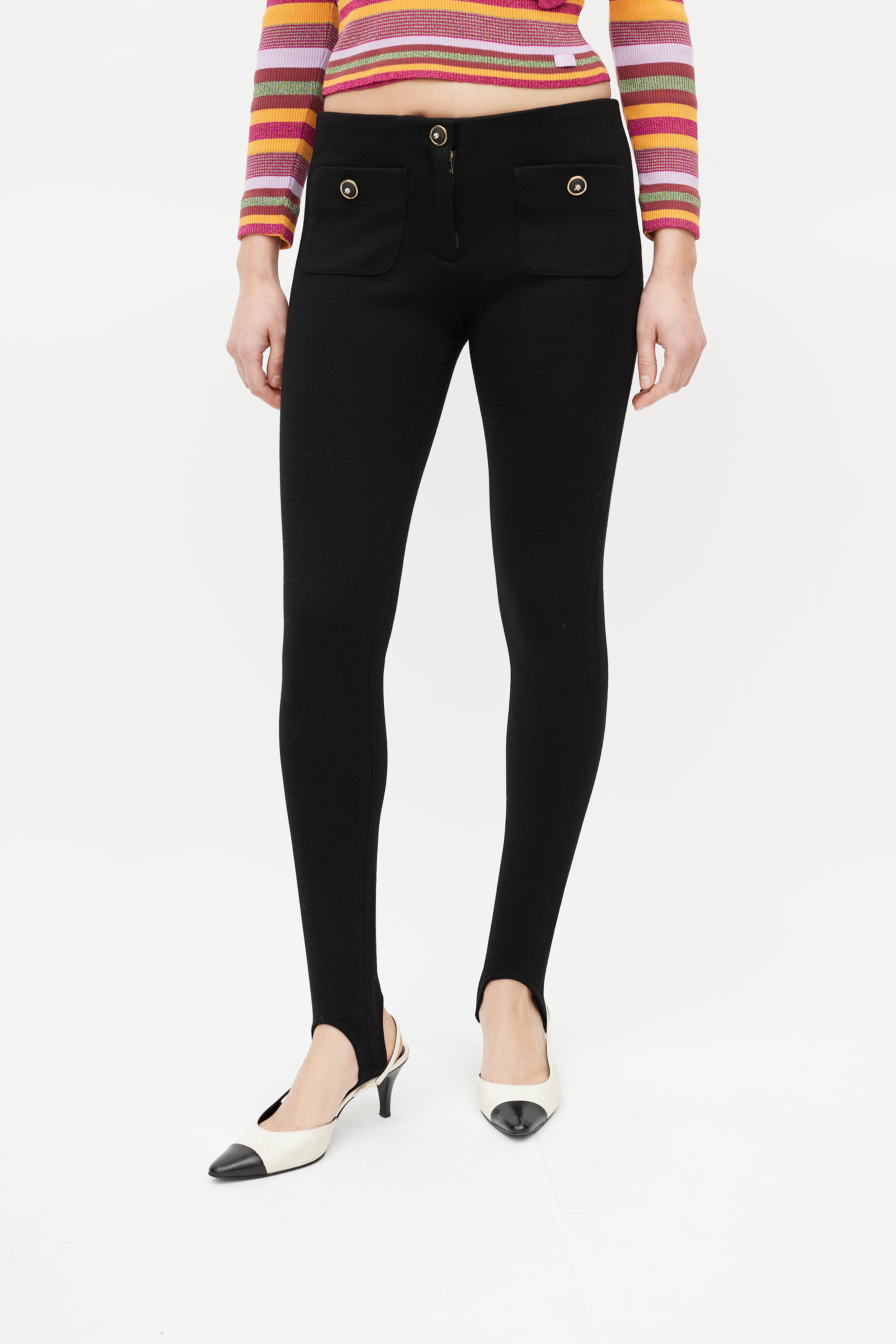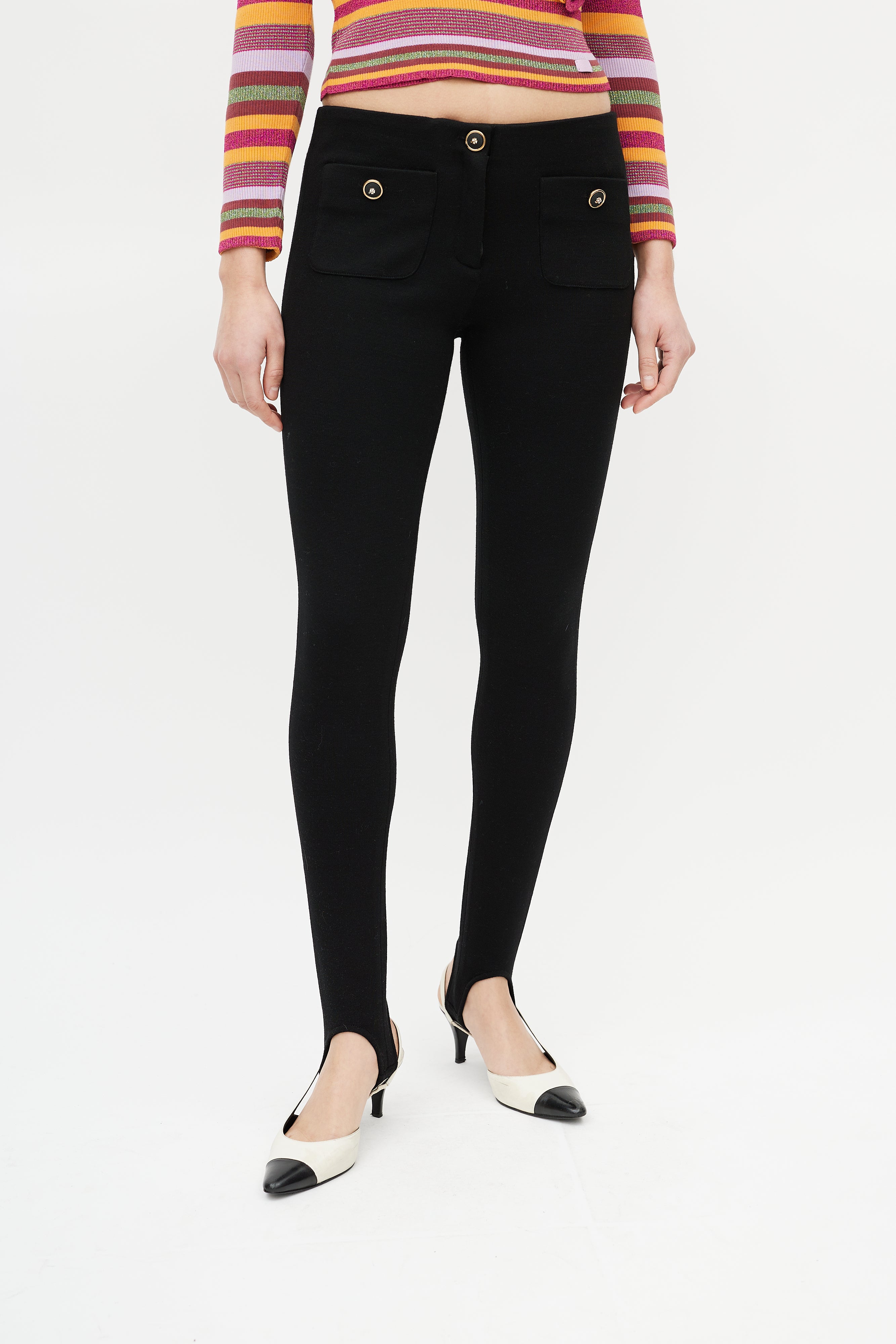 Pre-owned Chanel black pants featuring zip fly, two patch pockets at front, stirrup, and gold CC buttons with crystal embellished clover leaf. Styled with belt bag, not included.
