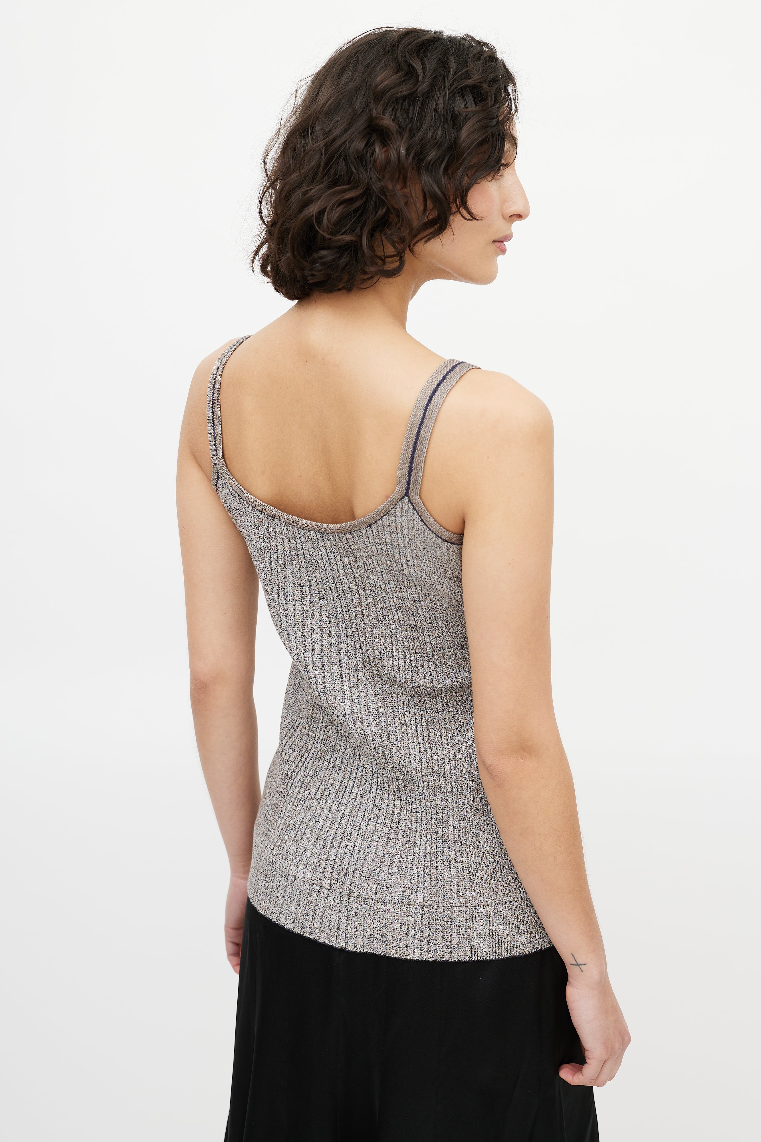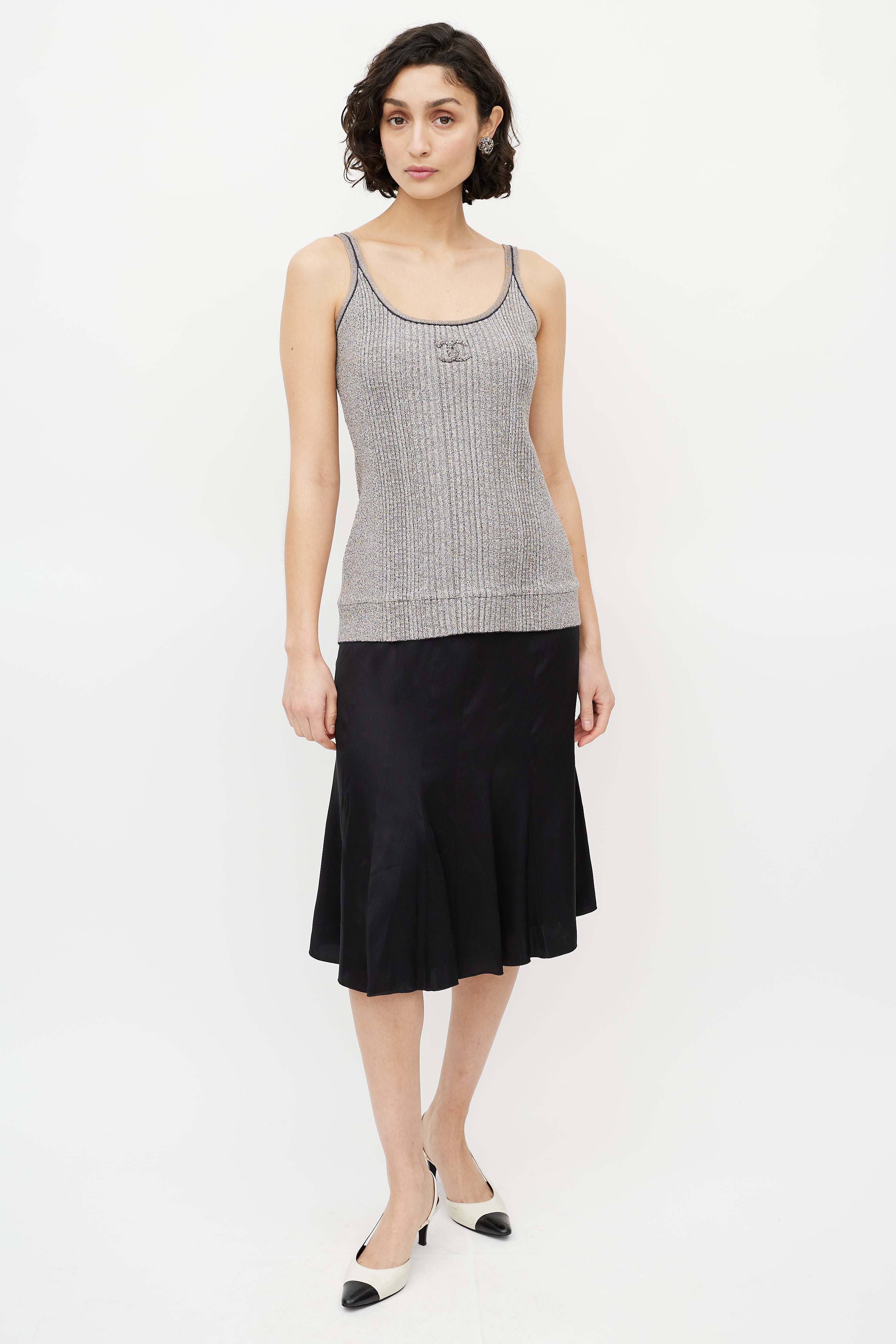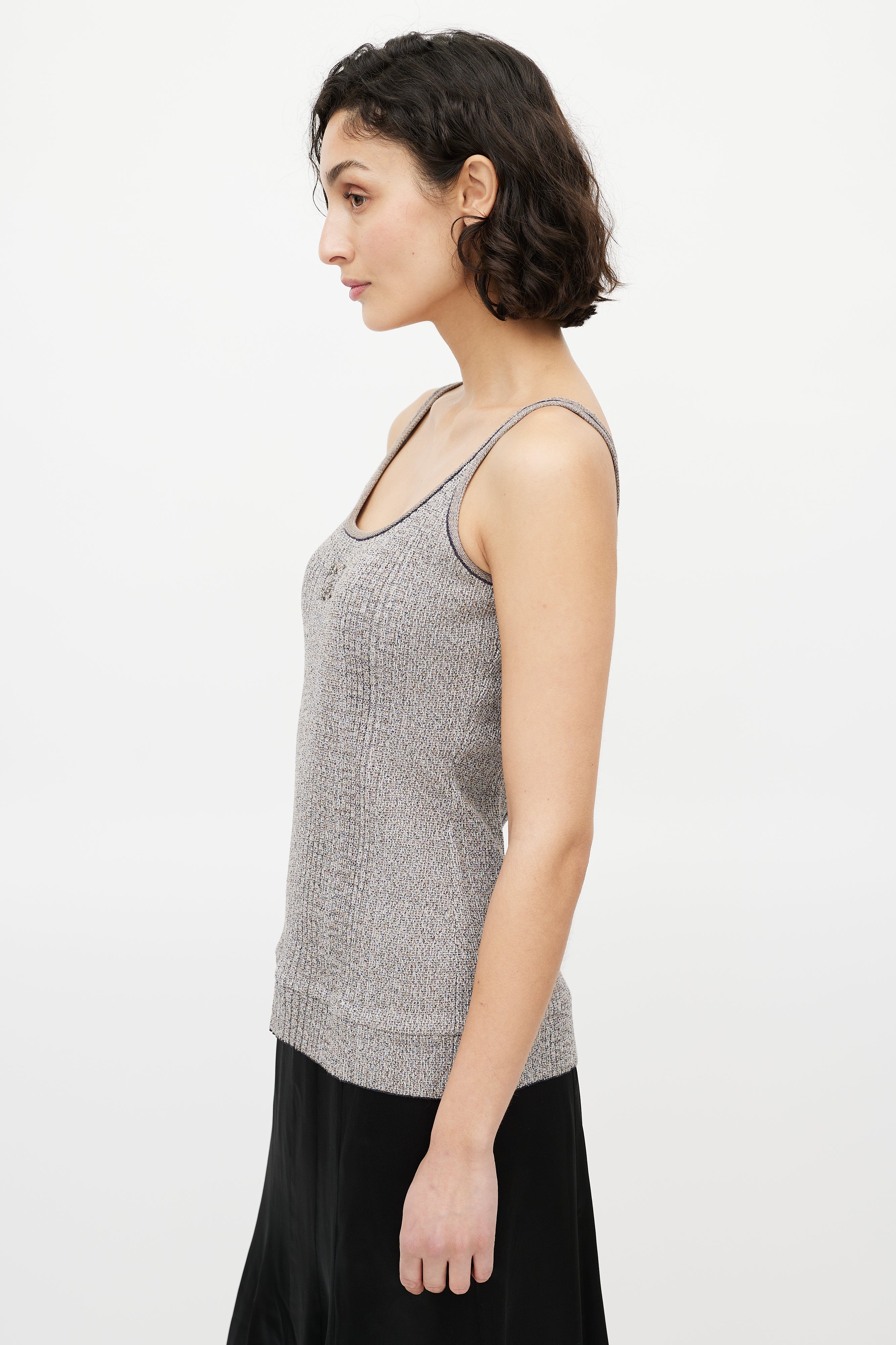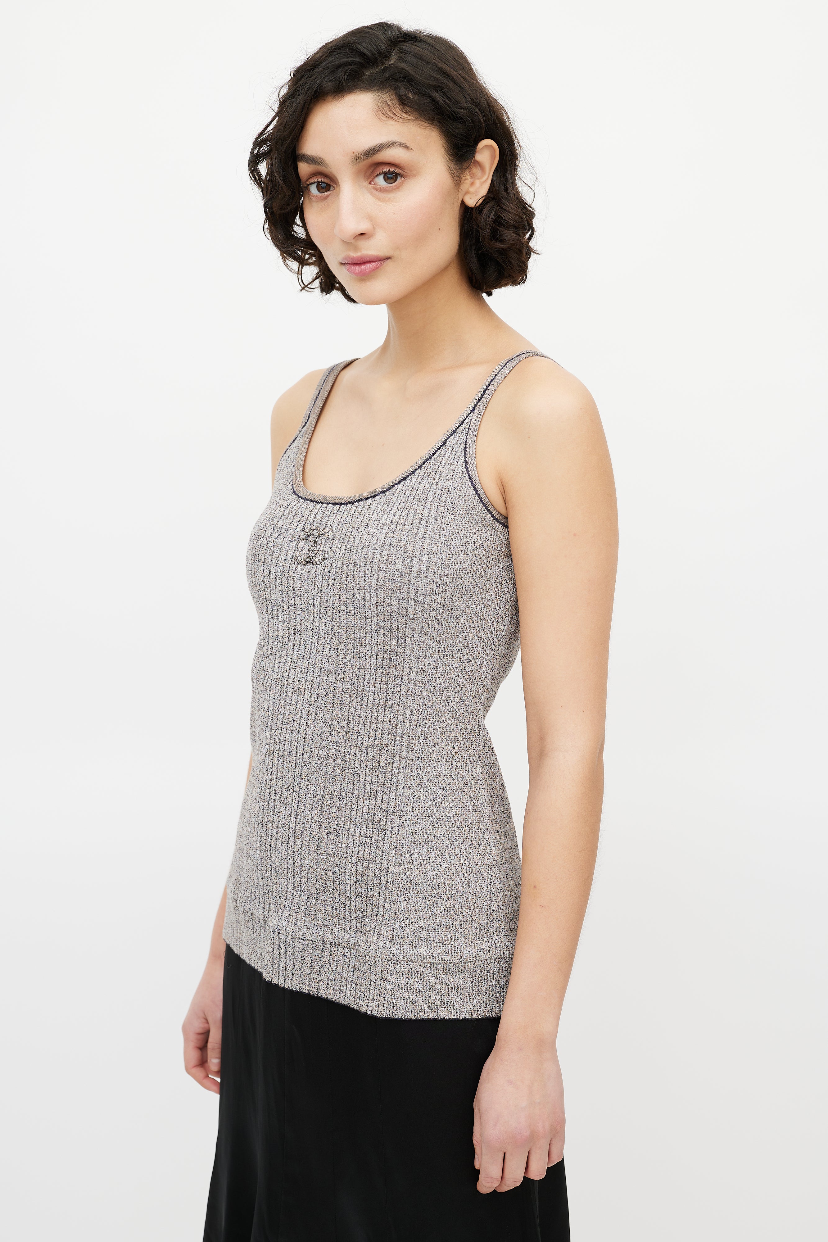 Pre-owned Spring 2011 Chanel grey metallic tank top featuring ribbed knit, CC logo at chest with chain embellishment, scoop neckline, and black trim. Part of a matching cardigan set. Cardigan not included.