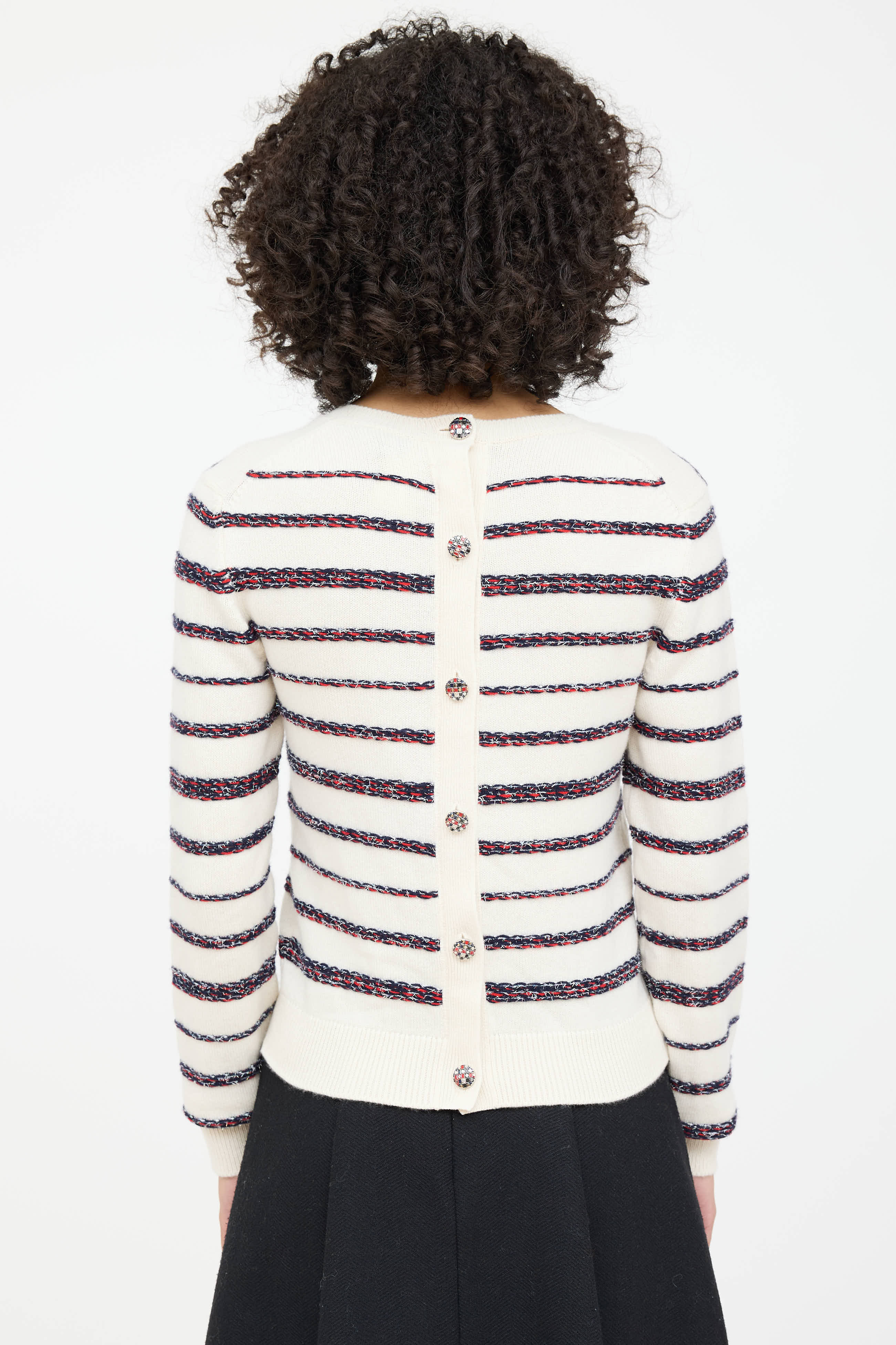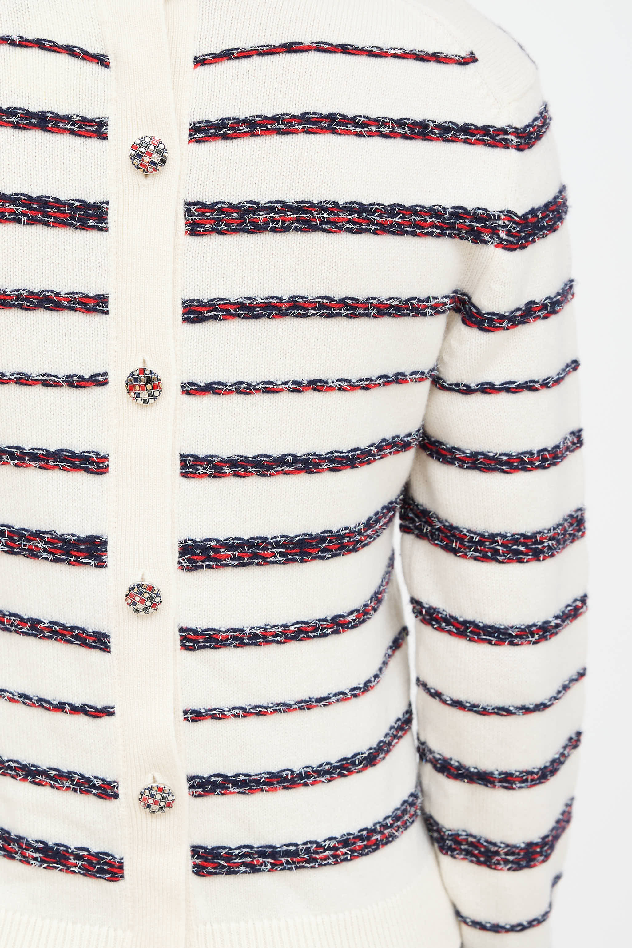 Pre-owned Chanel Spring 2020 cream cashmere knit sweater featuring a multicolour metallic woven striped pattern throughout, crew neckline, long sleeves, ribbed hem, and button detailing at back.