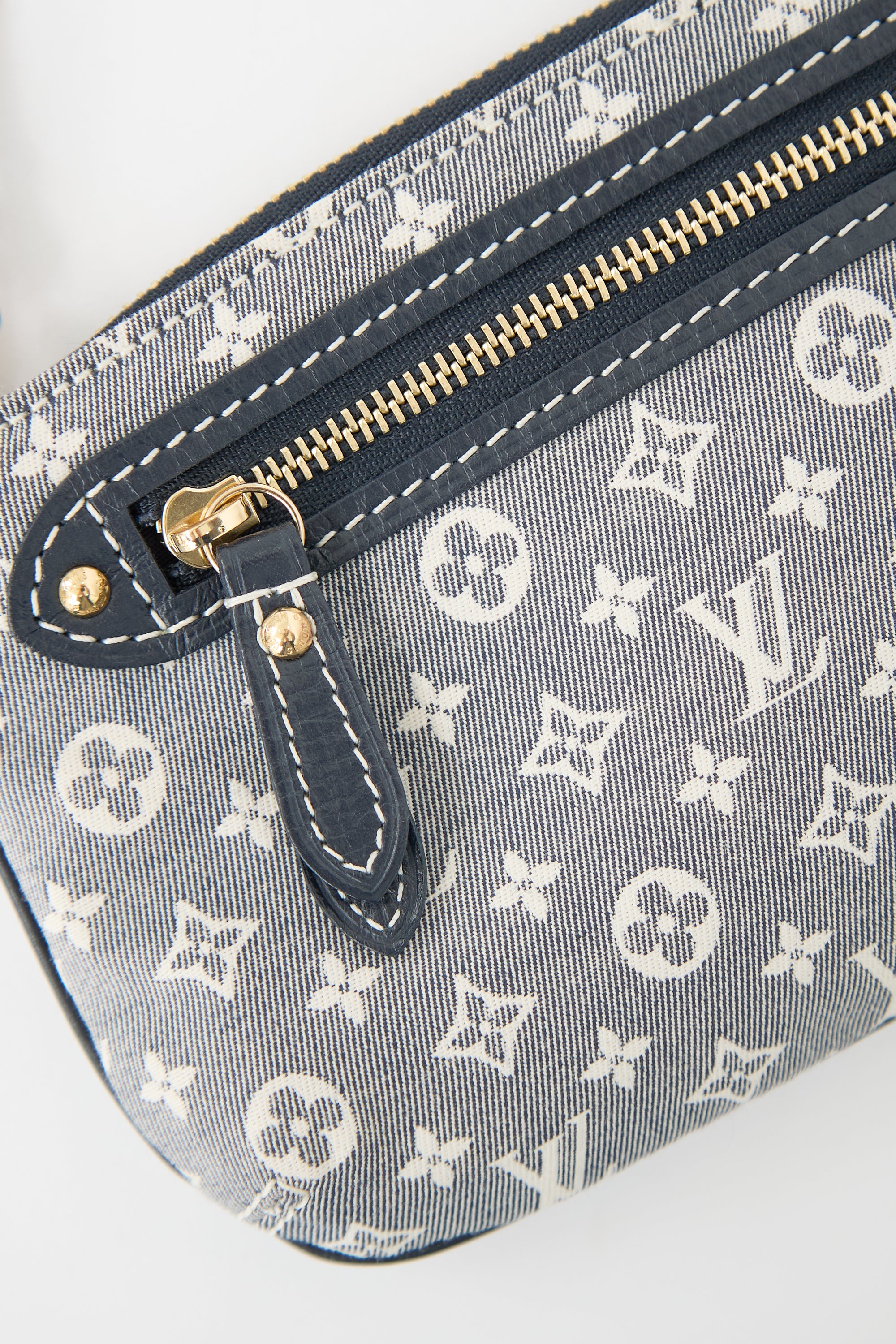 Pre-owned Louis Vuitton navy and white mini Lin Pochette featuring Monogram Idylle, navy leather piping and trim, gold tone hardware, chain strap with clasp at end, front zip pocket, top zip closure, and one lined main compartment. Comes with original box, sleeve, and care guide.