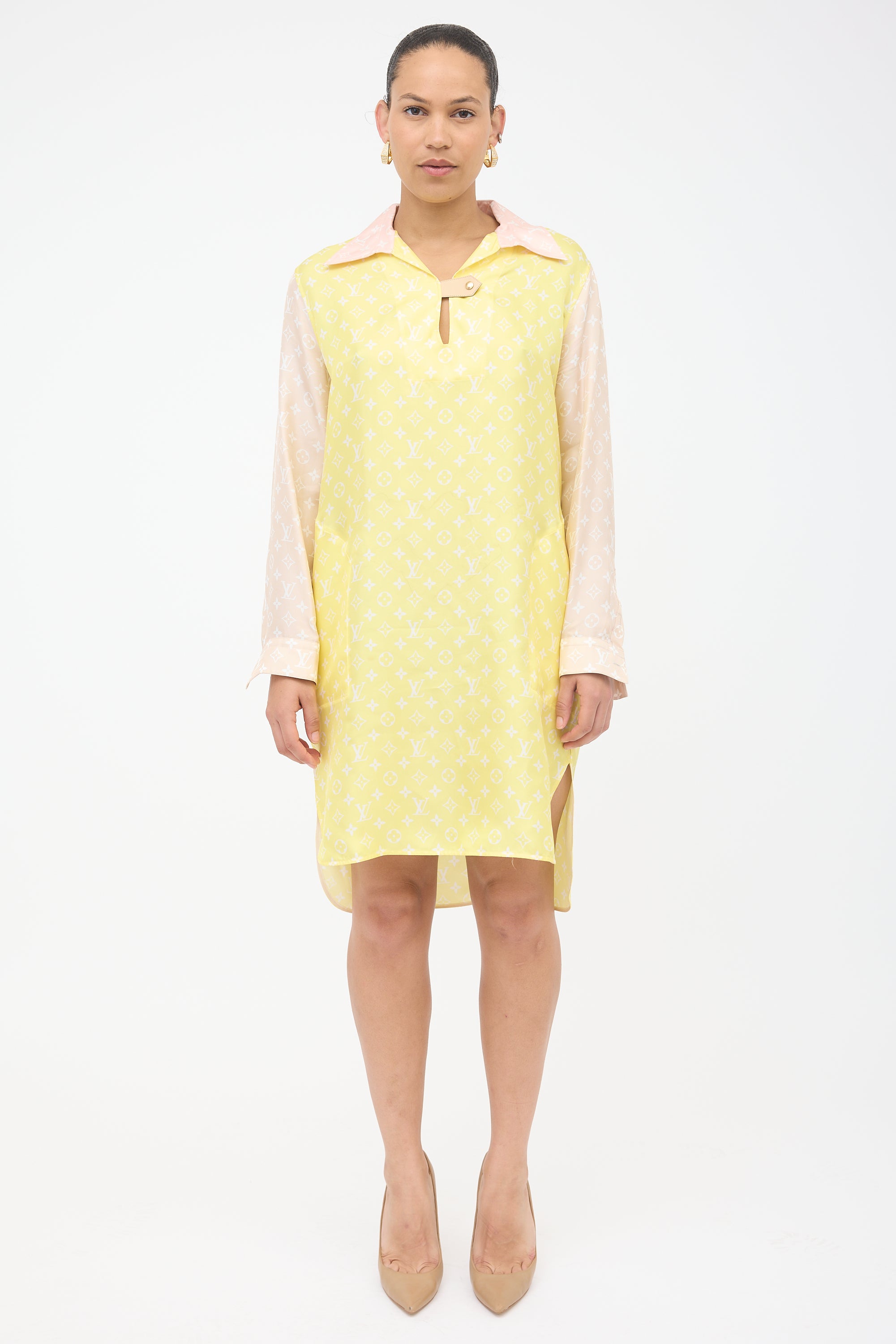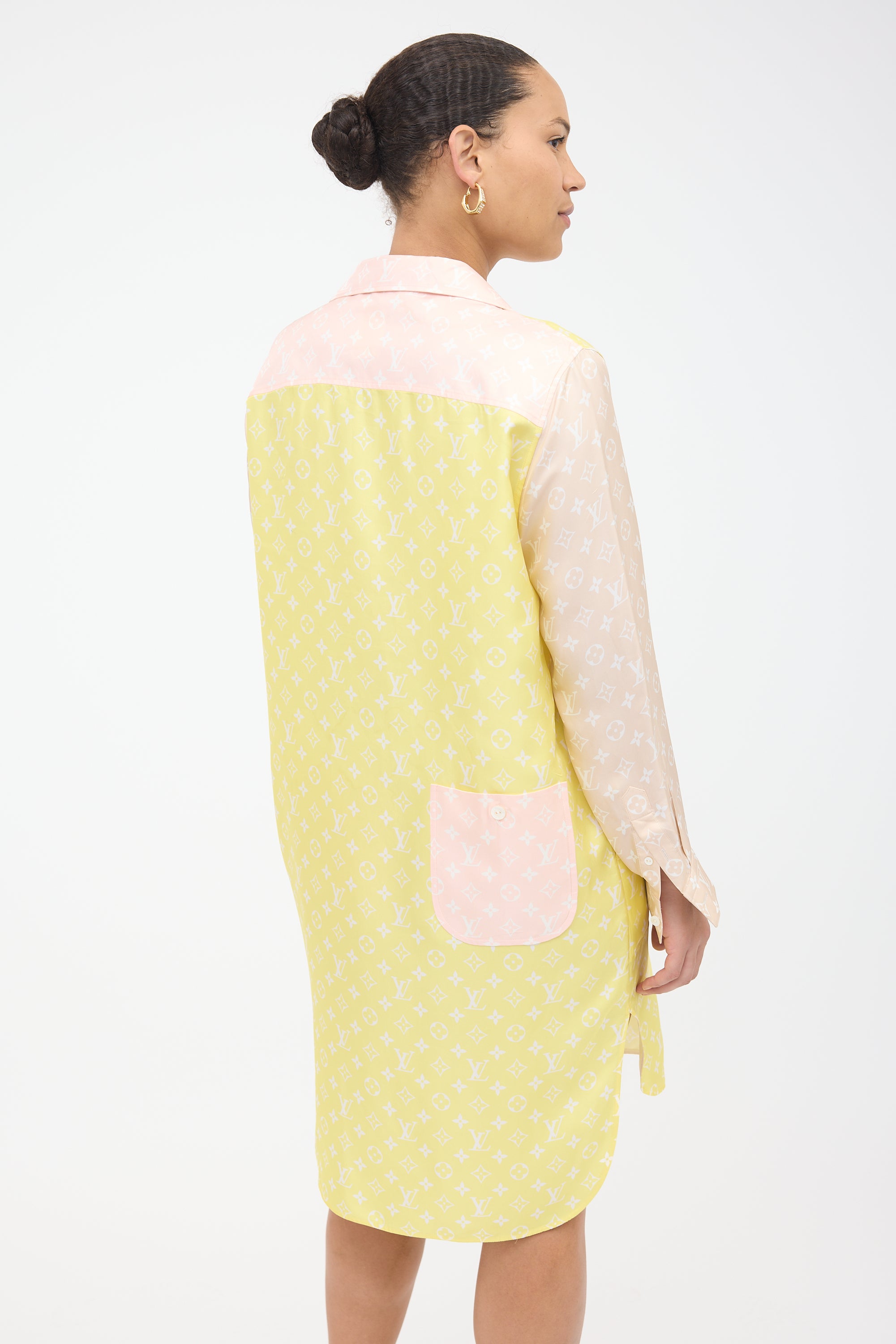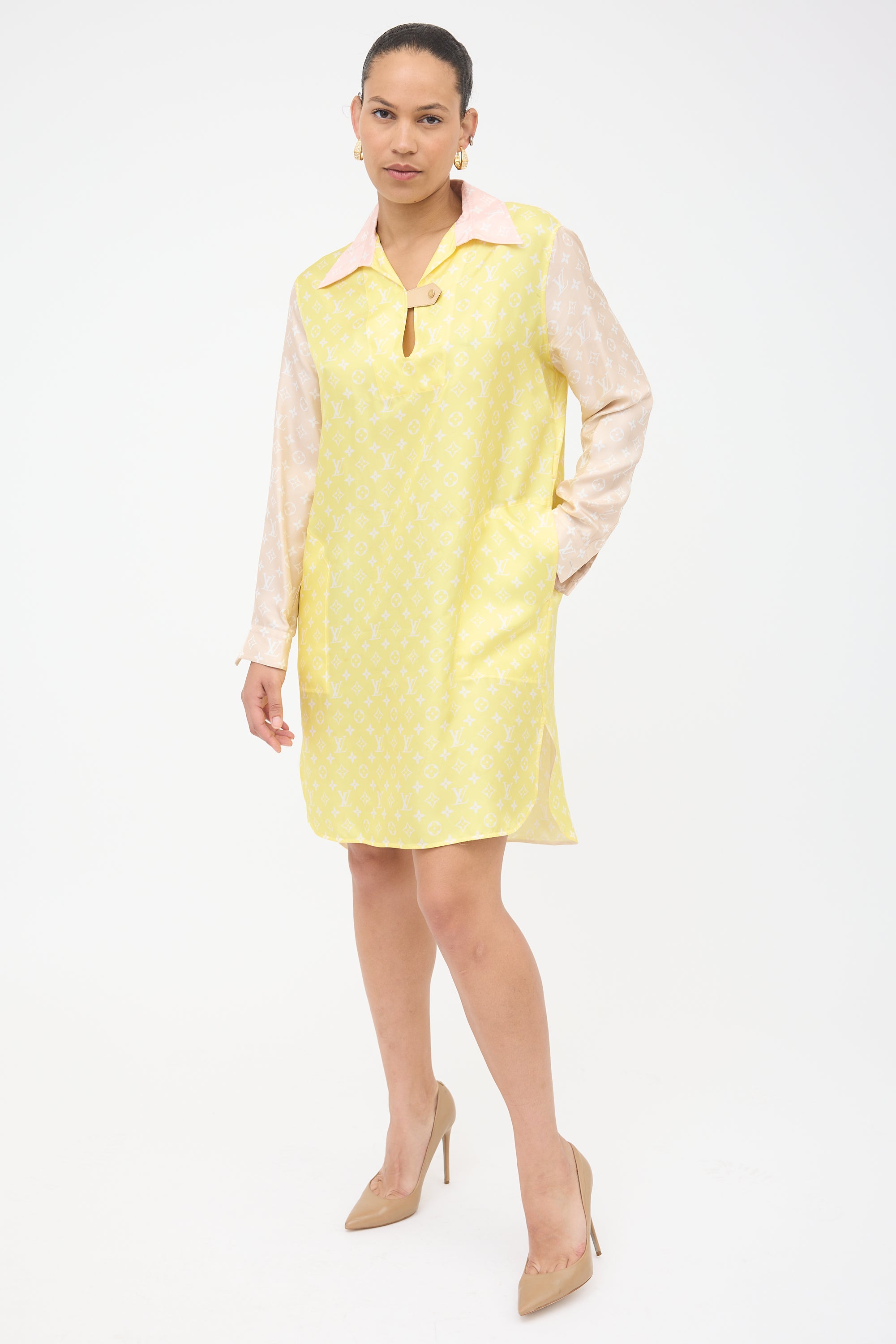Pre-owned Louis Vuitton yellow and pink silk shirt dress featuring a white monogram throughout, point collar, V-neckline with brown leather strap and snap button detail, two slip pockets at hip, one buttoned patch pocket at back, and buttoned cuffs.