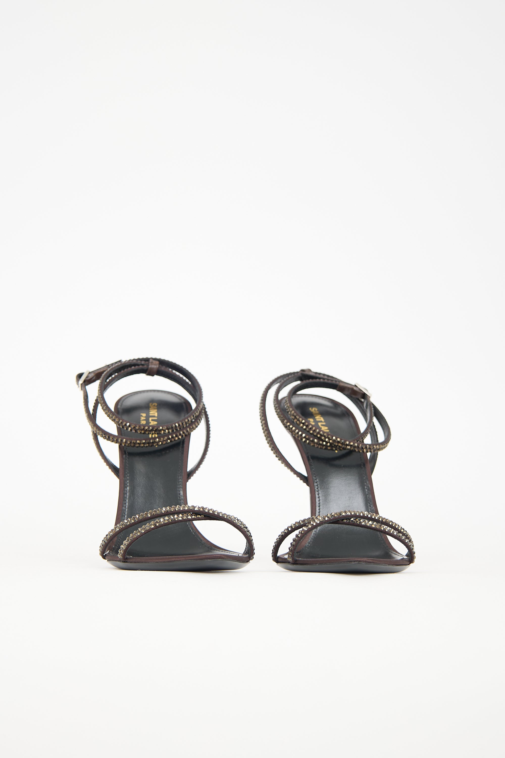 Pre-owned Saint Laurent brown satin Ava sandals featuring pointed toe, rhinestone embellished thin strappy upper, adjustable wraparound ankle strap, and covered stiletto heel. Comes with original box.