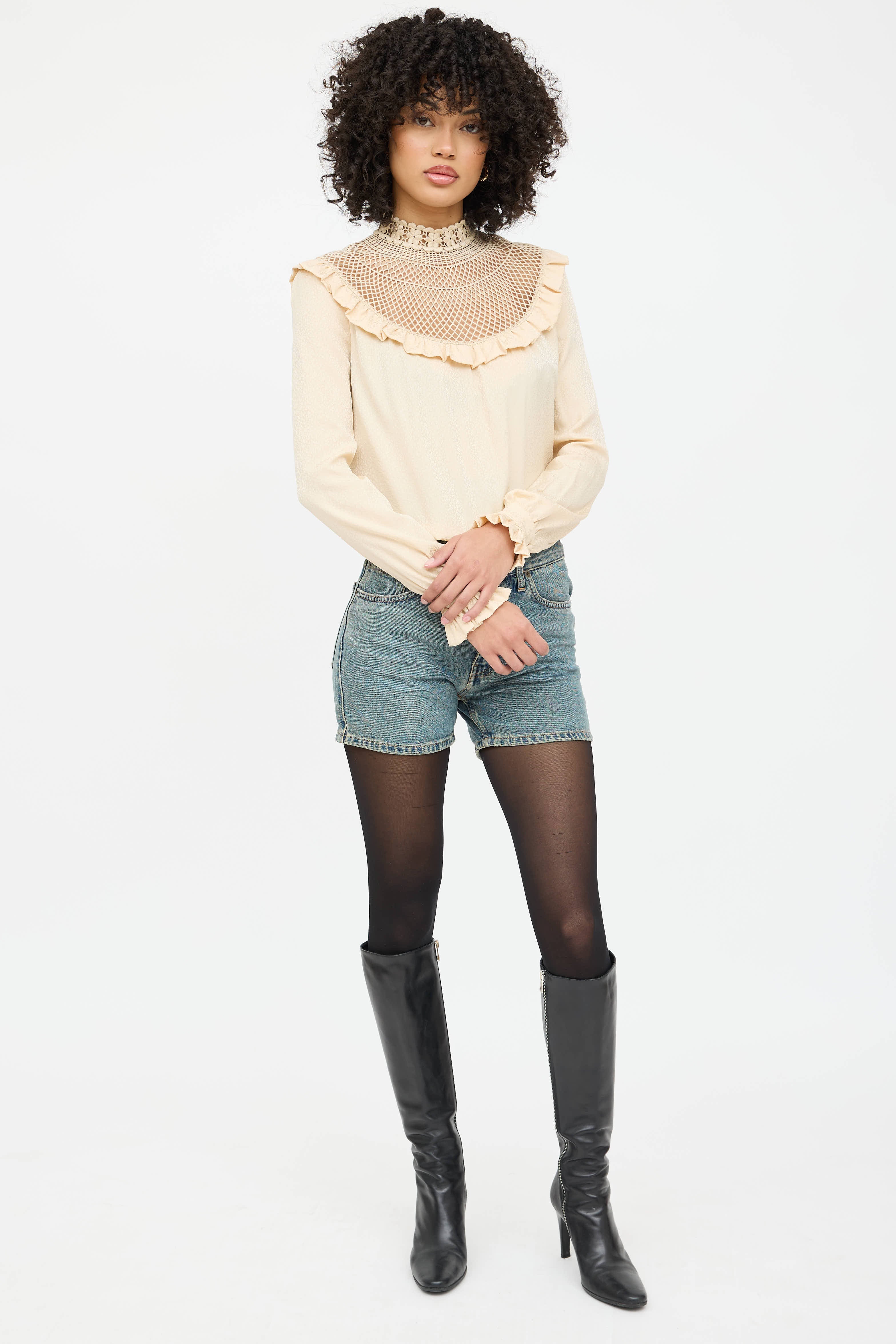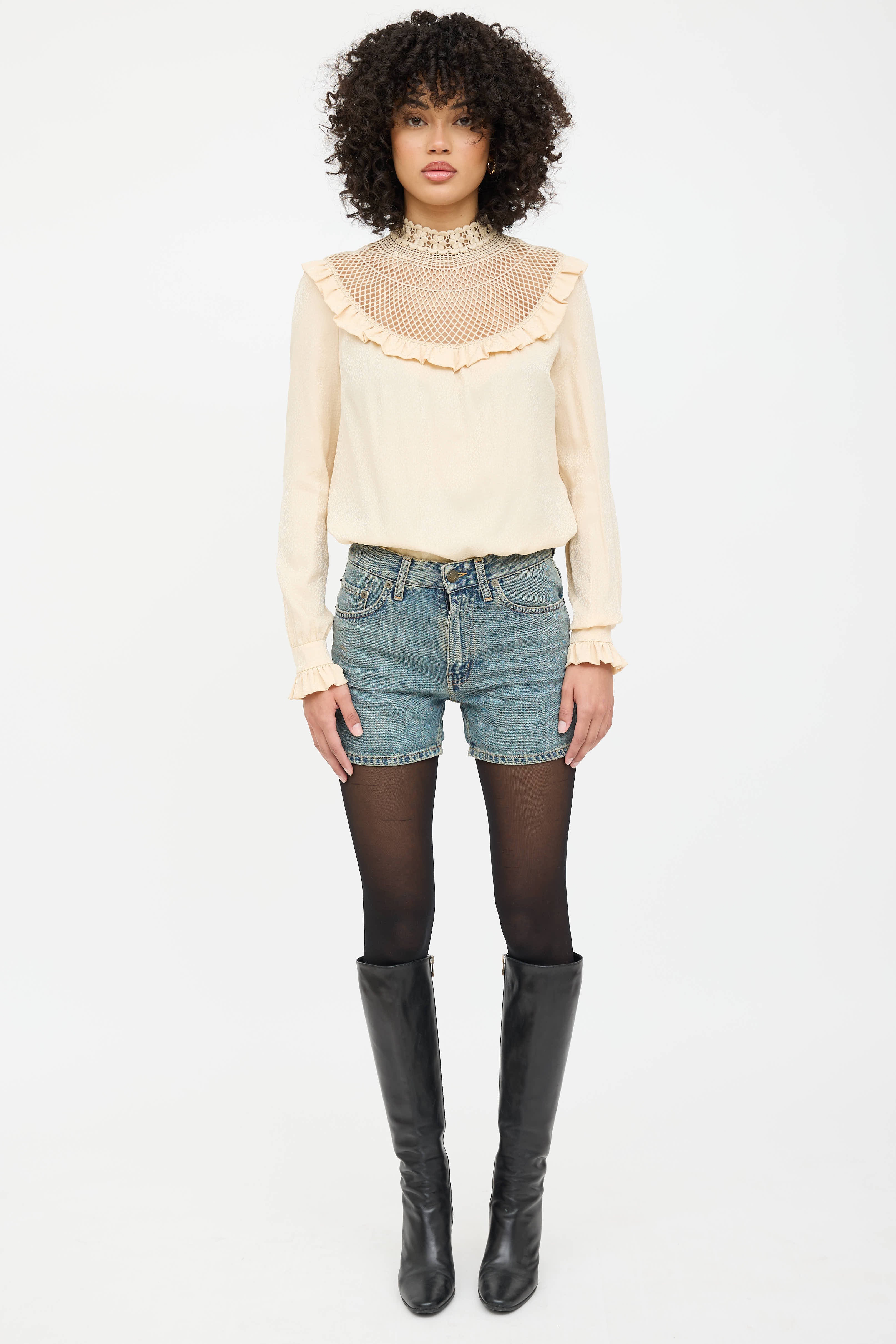 Pre-owned Saint Laurent beige silk blouse featuring a round neckline, crochet lace insert at bust, long sleeves with ruffled buttoned cuffs, and wrapped button closure at neck.