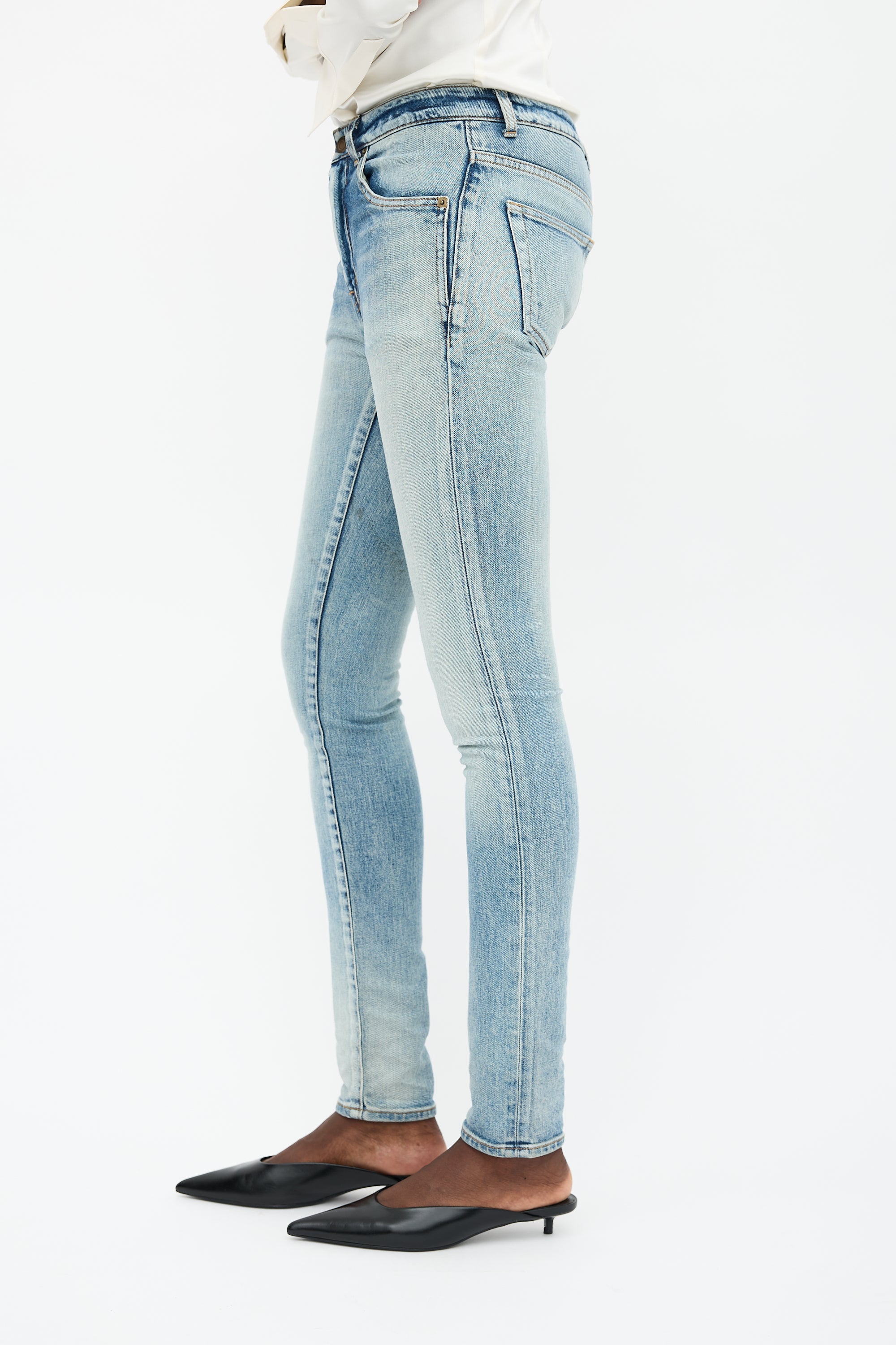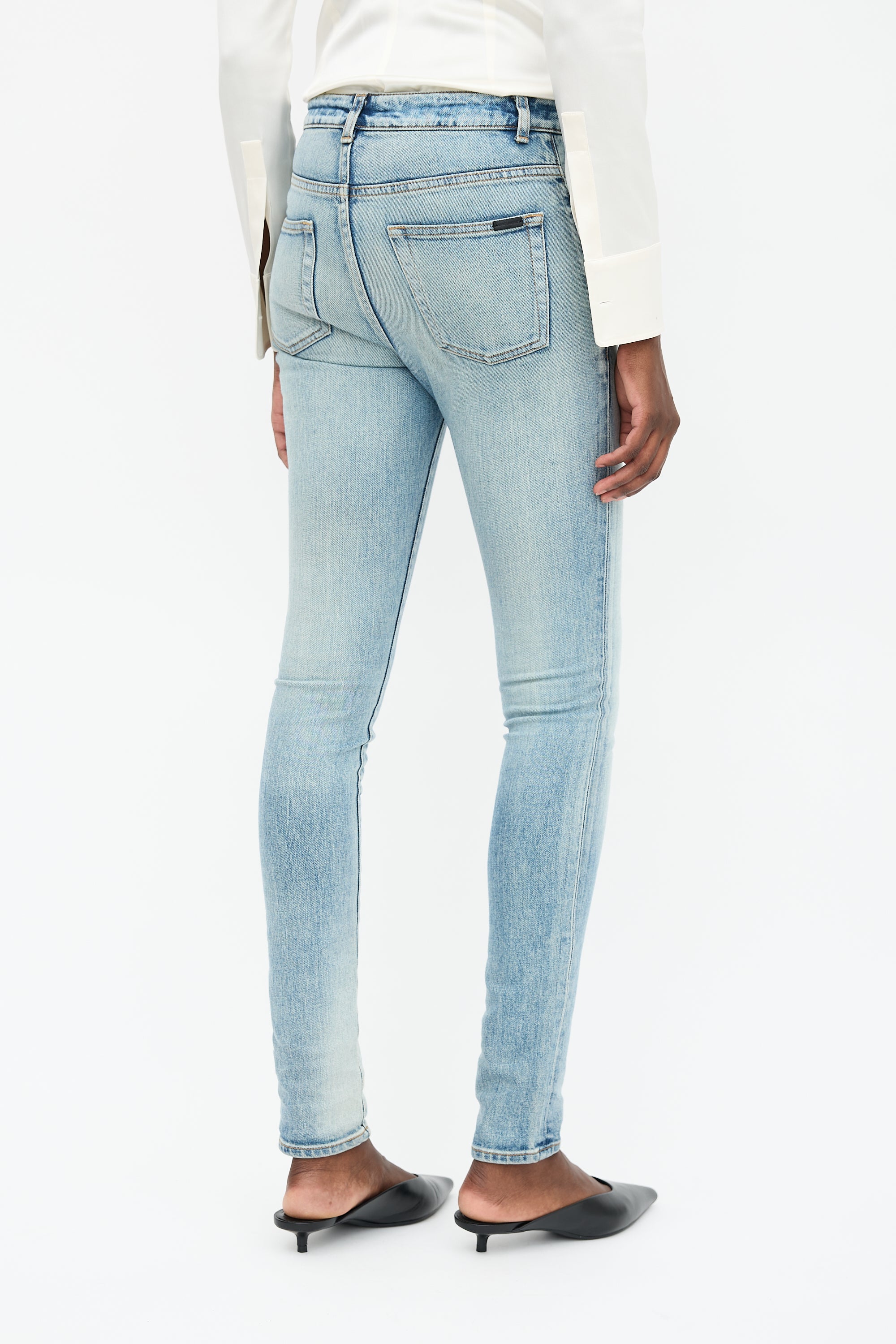 Pre-owned Saint Laurent light wash jeans featuring a mid rise, five pocket styling, zip fly with button fastening, intentional distressing, and slim leg.