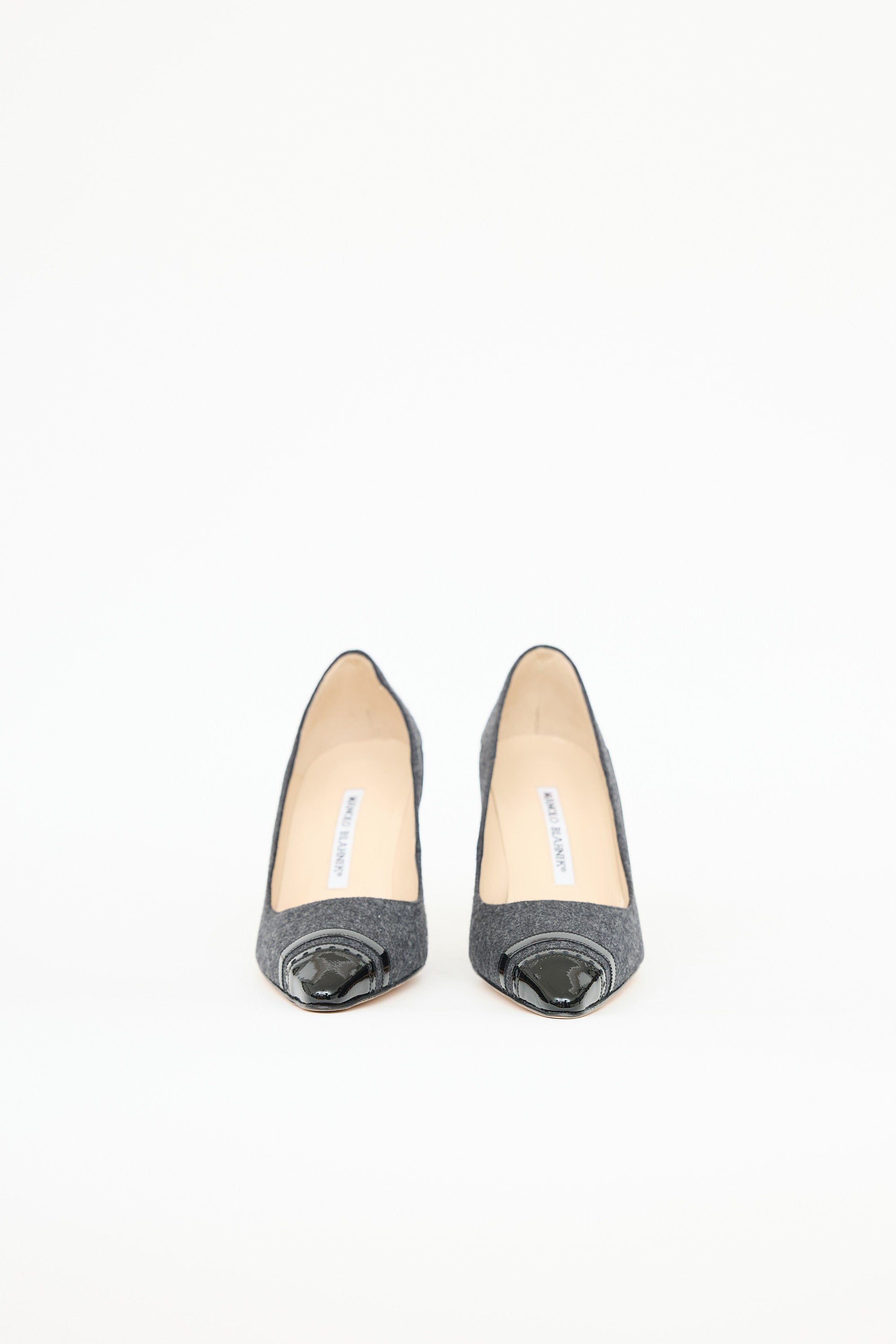 Pre-owned Manolo Blahnik dark grey wool pumps featuring pointed toe with black patent toe cap, and patent eyelet trim at back of heel.