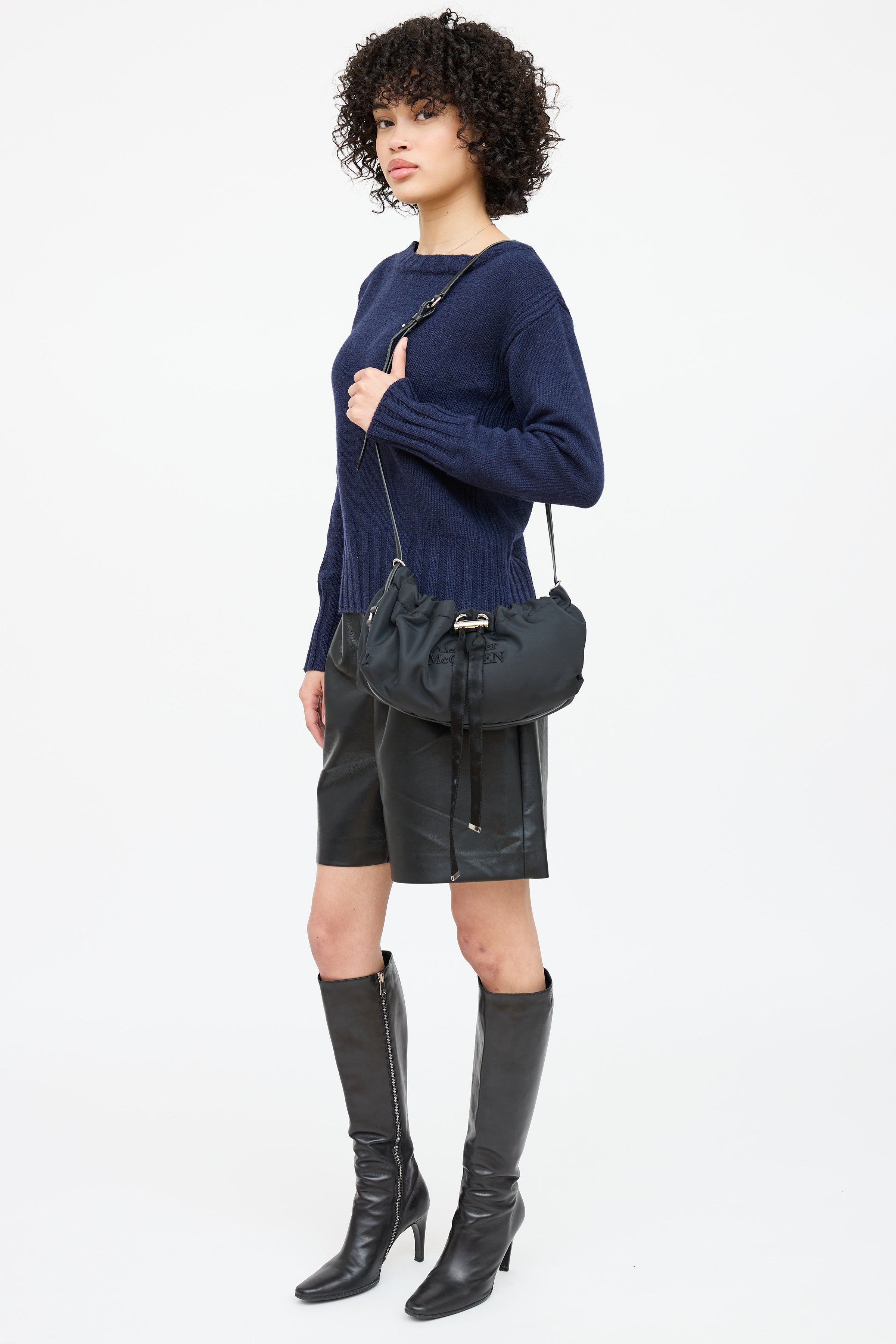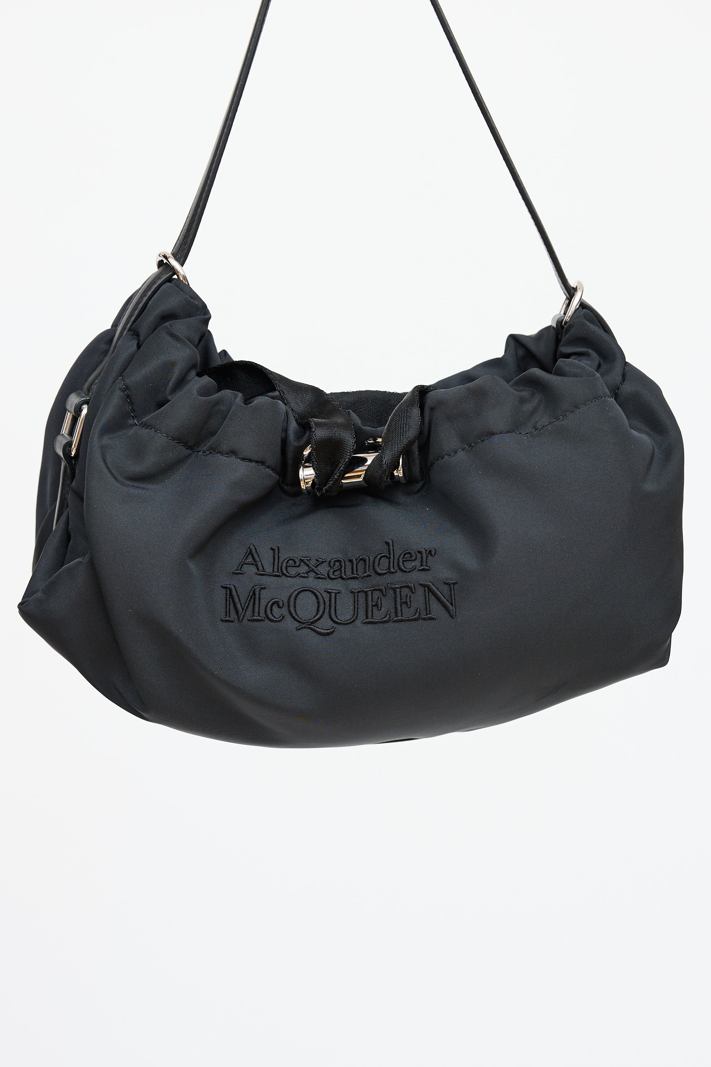 Pre-owned Alexander McQueen black Bundle crossbody bag featuring singular shoulder strap with adjustable push pin closure, drawstring top with magnetic snap closure, sliver tone hardware toggle, embroidered logo at front, leather trim base, orange nylon lining, and one main compartment with one card slot.