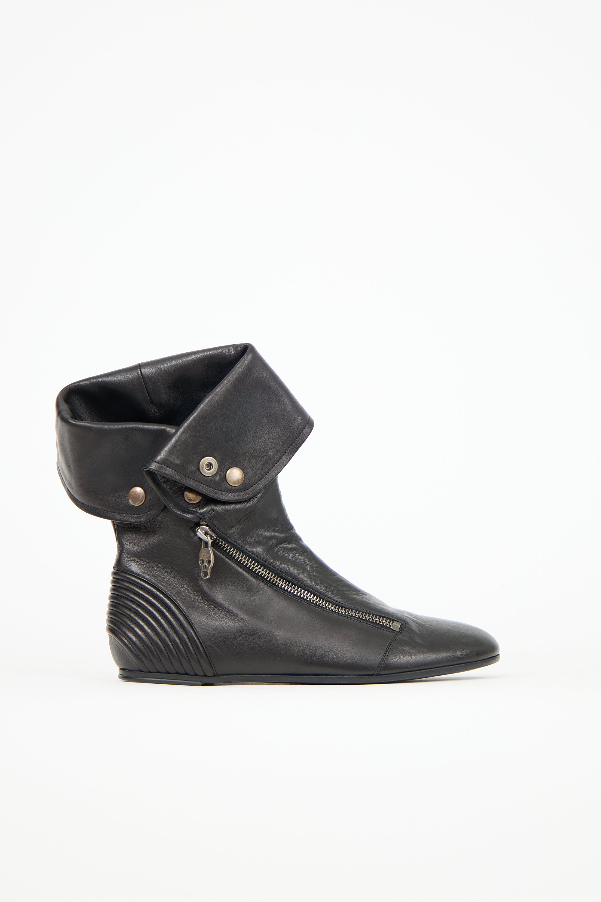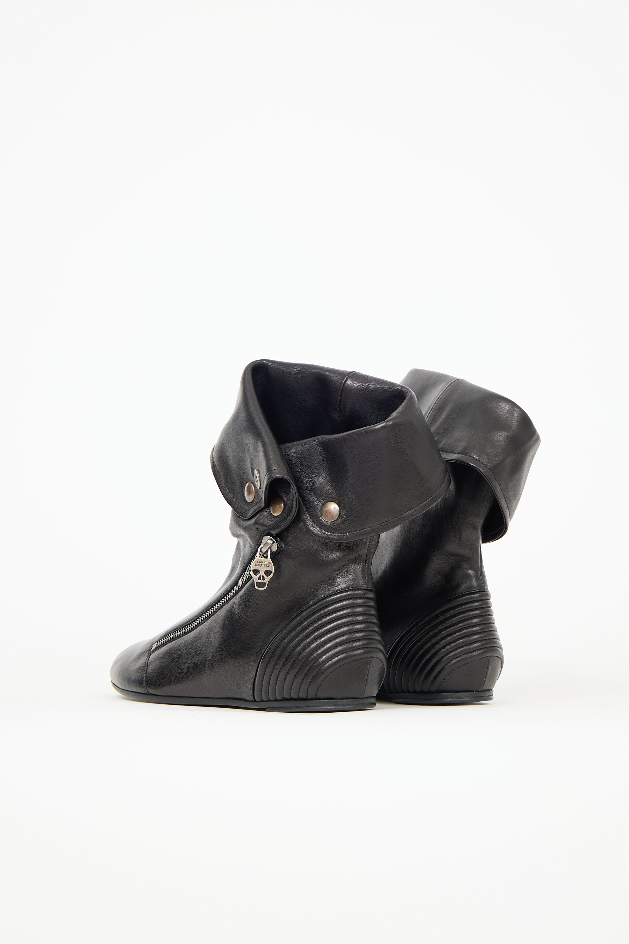 Pre-owned Alexander McQueen black leather Faithful boots featuring rounded toe, side zip and snap button closure, fold over shaft, and flat sole.