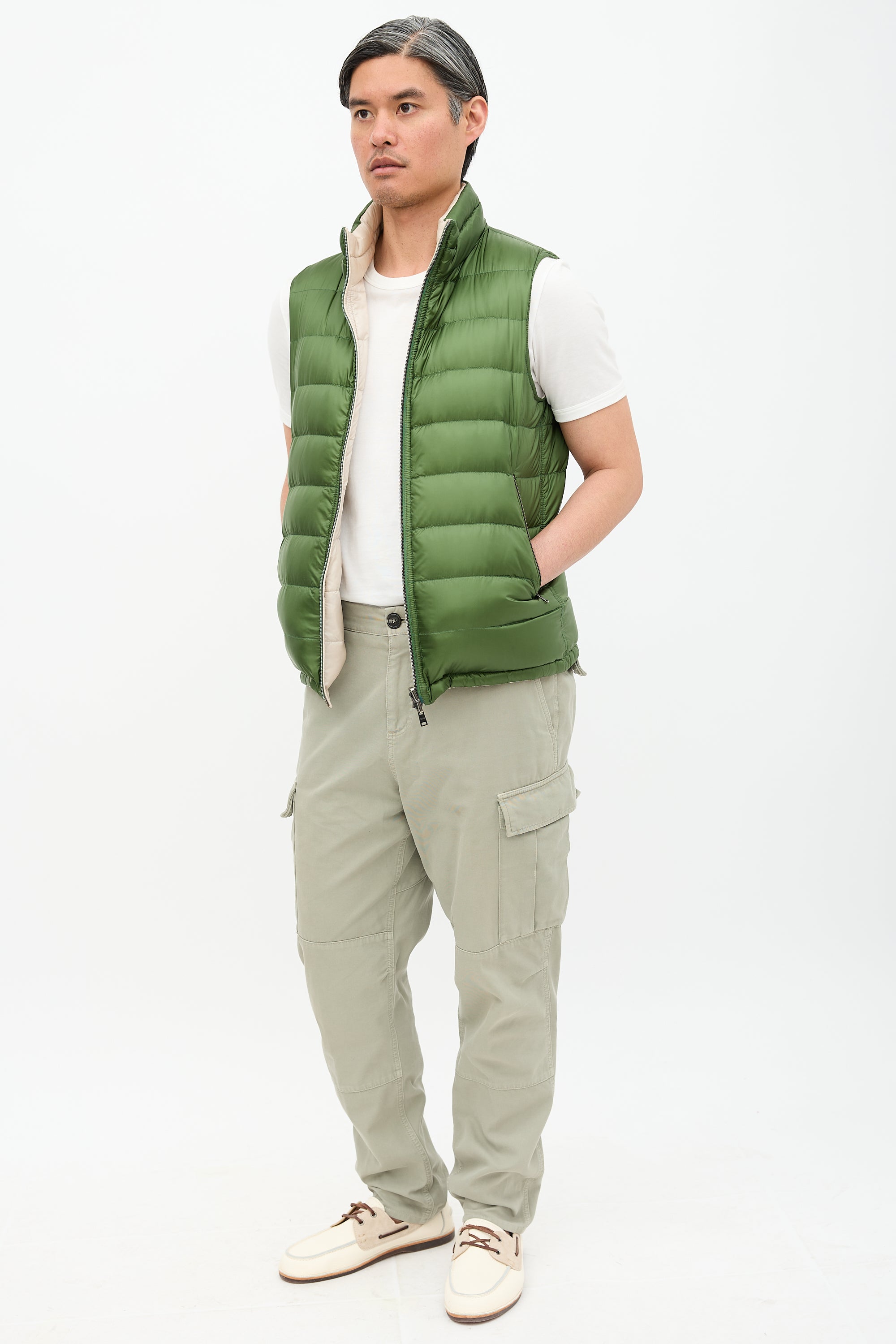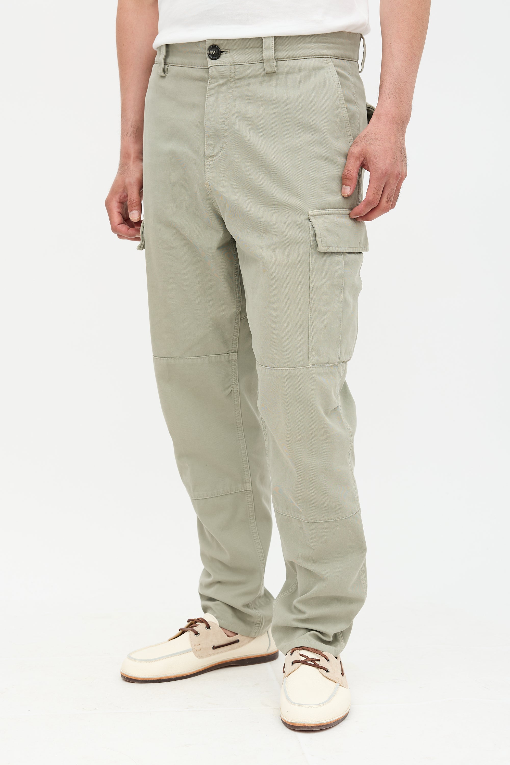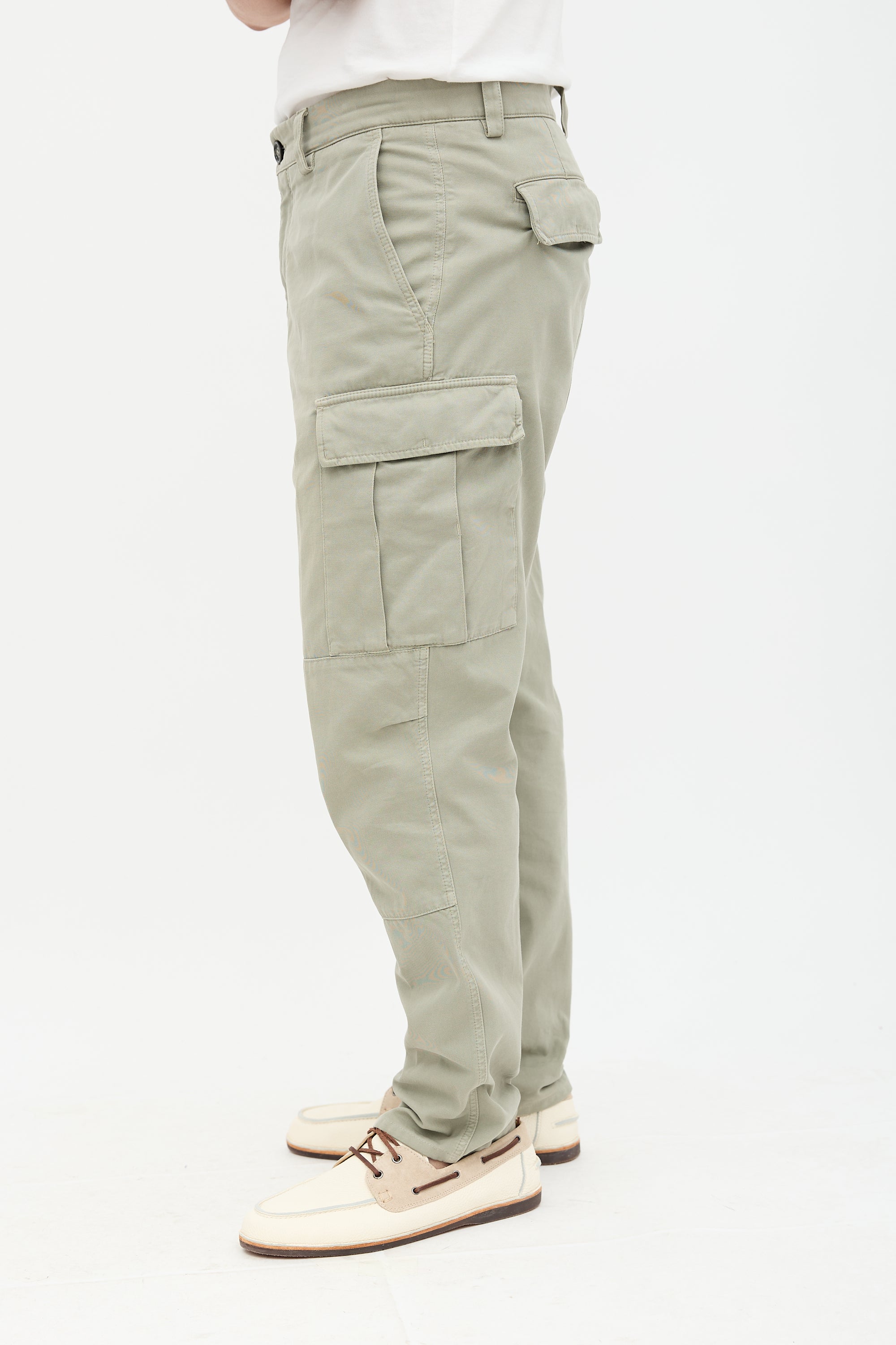 Pre-owned Brunello Cucinelli green easy fit trousers featuring four pocket styling, zip fly with button fastening, belt loops, tapered leg with two cargo pockets at outseam, and articulated knees. Clipped to fit model.