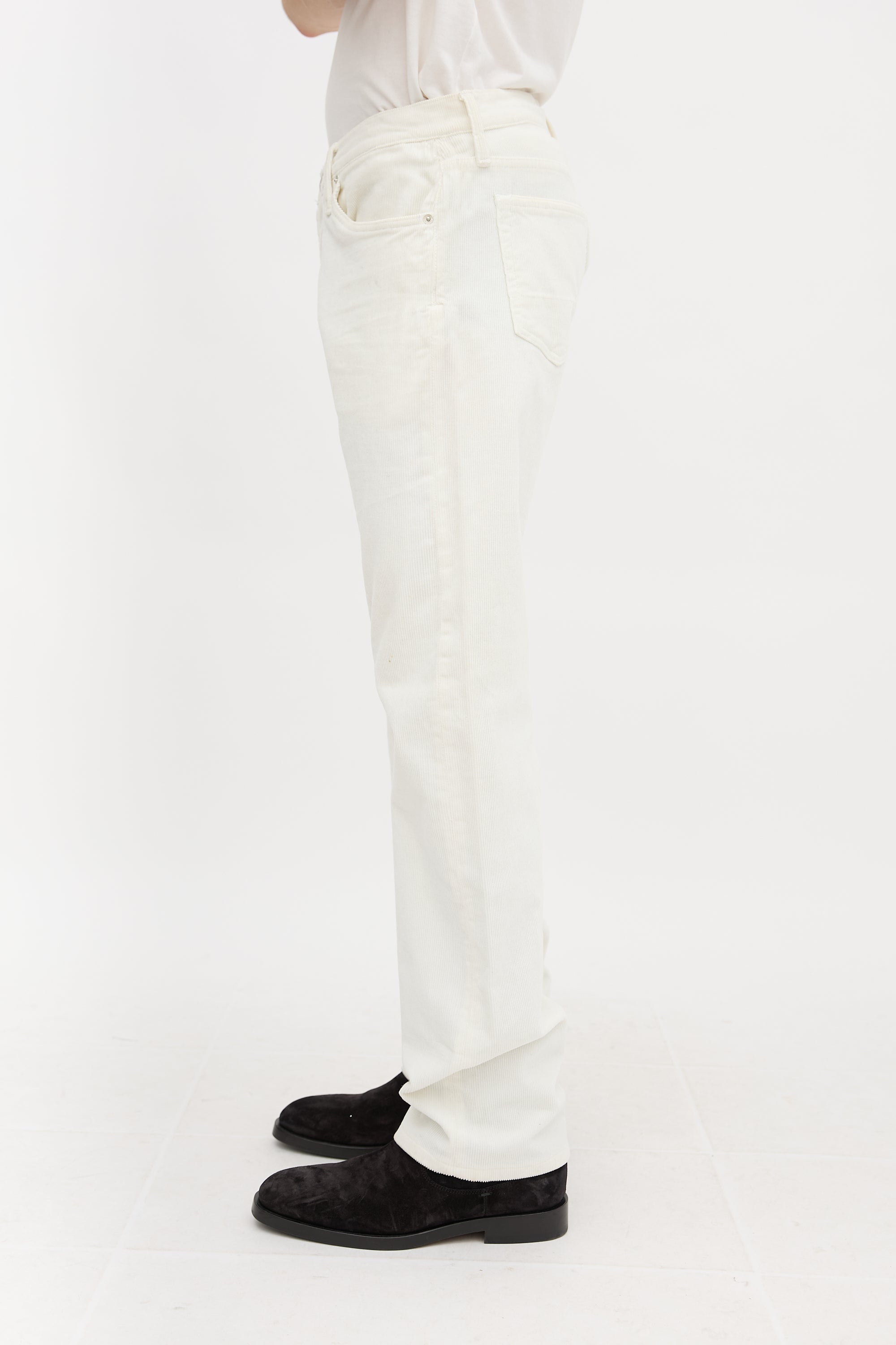 Pre-owned Tom Ford white corduroy pants featuring a button fly, belt loops, five pocket styling, brown suede jacron patch, and a straight leg.