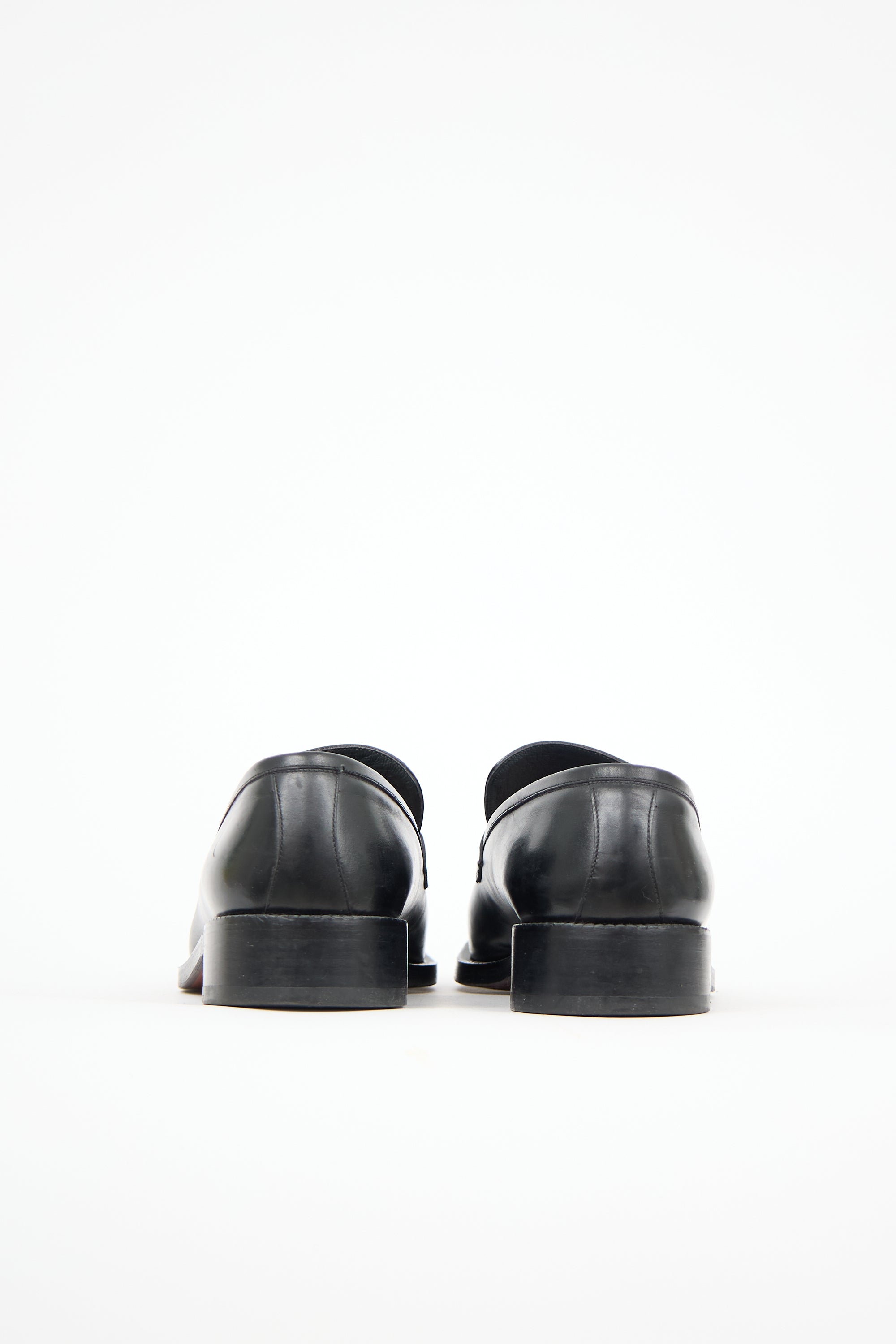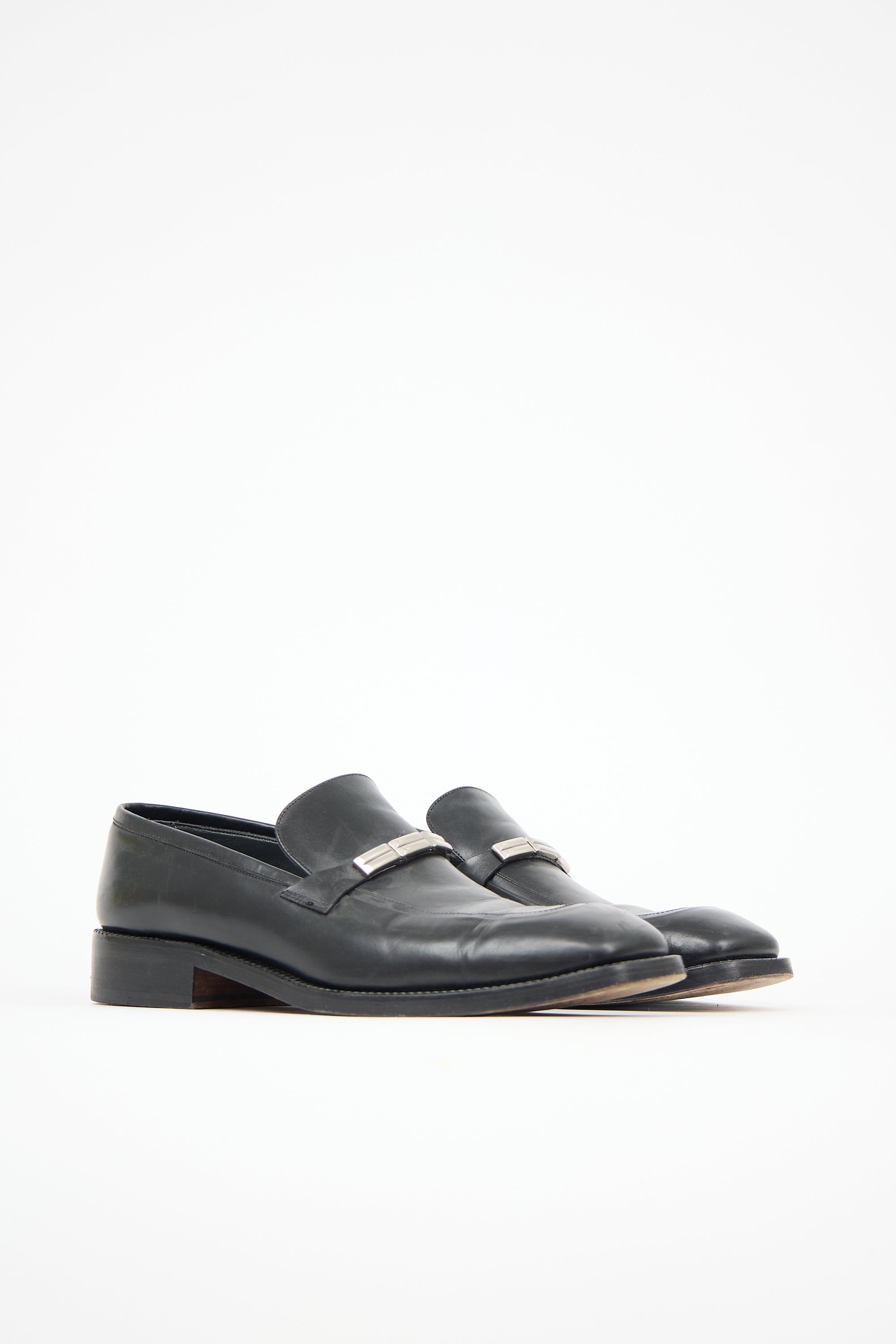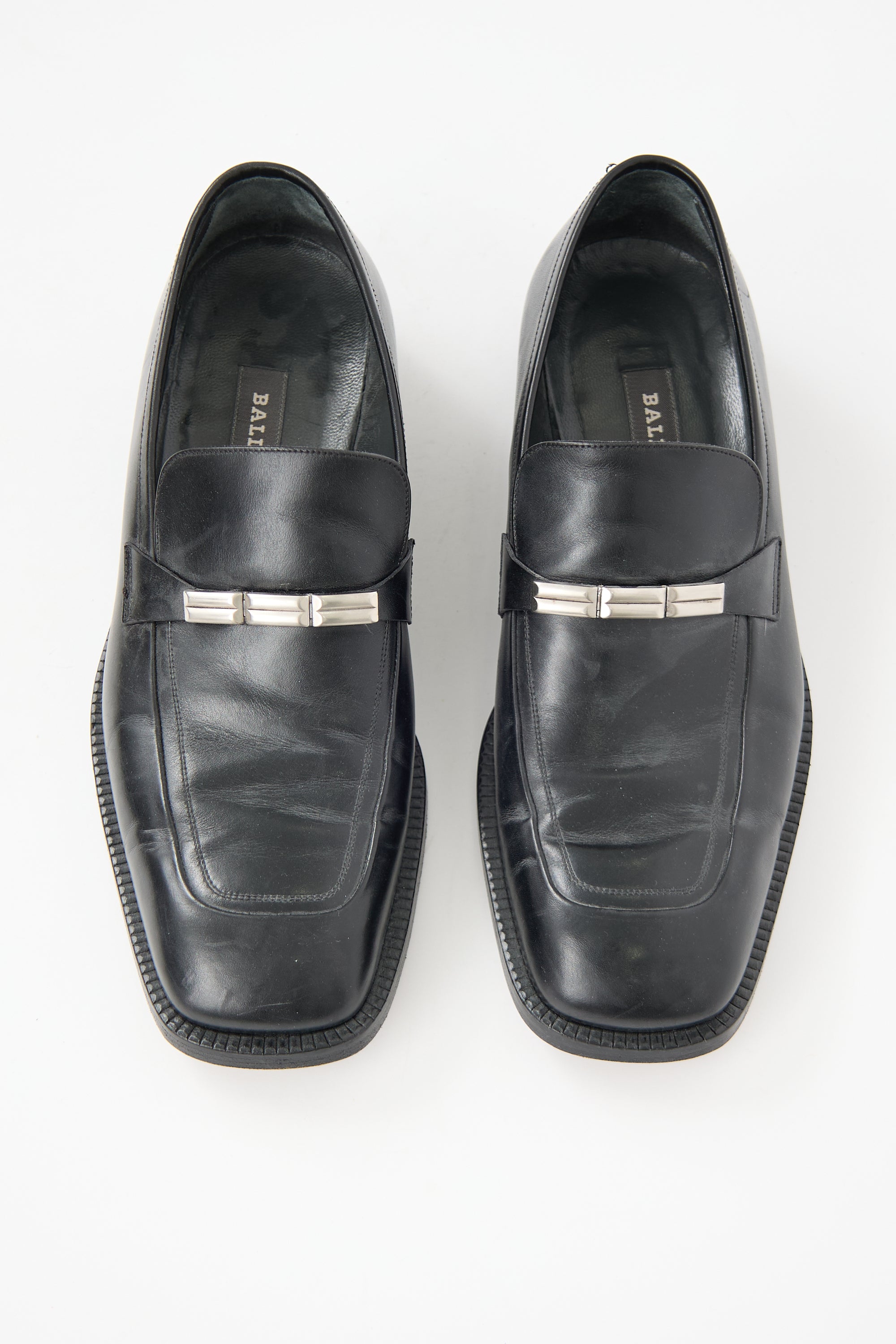 Pre-owned Bally black leather loafers featuring square toe, stacked block heel, and silver tone hardware at front.
