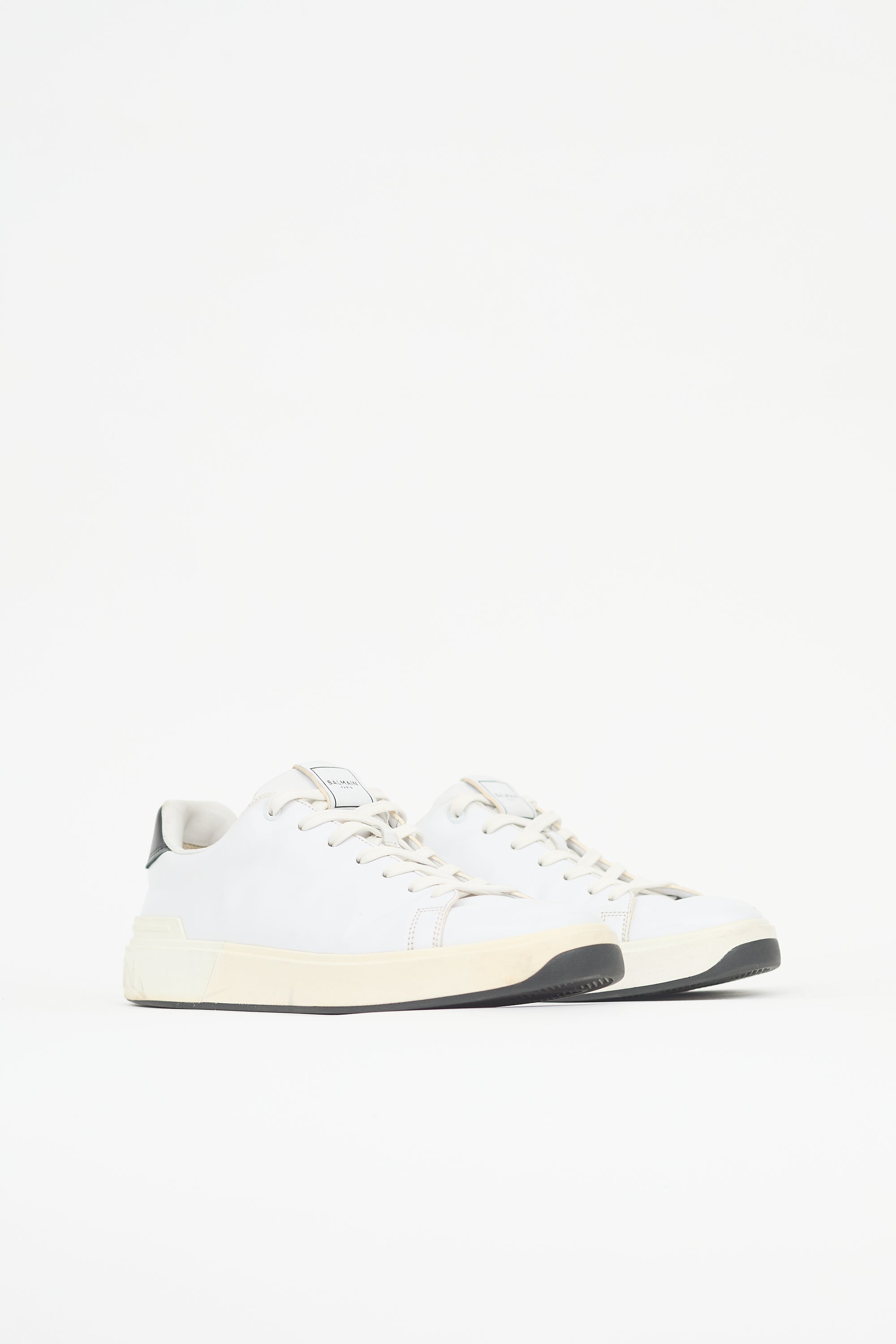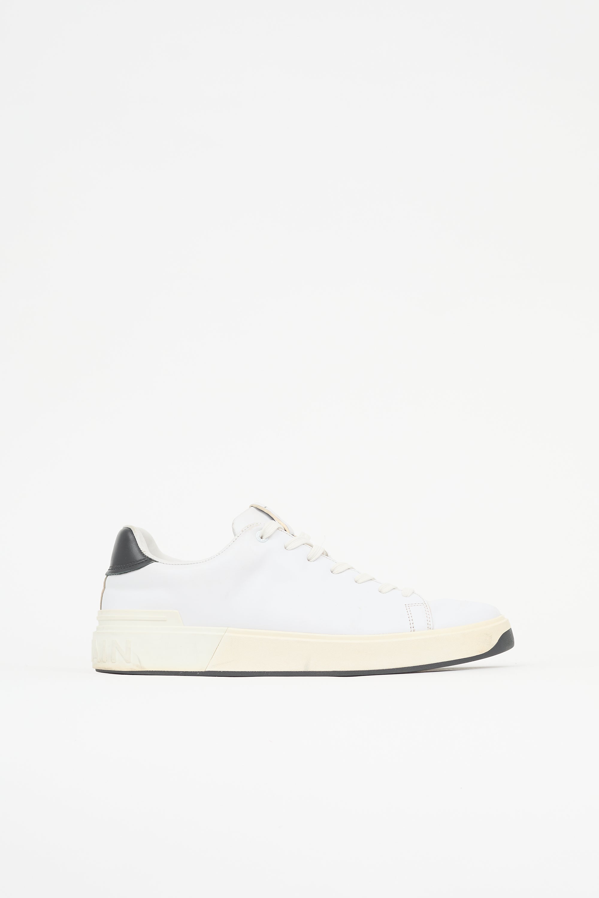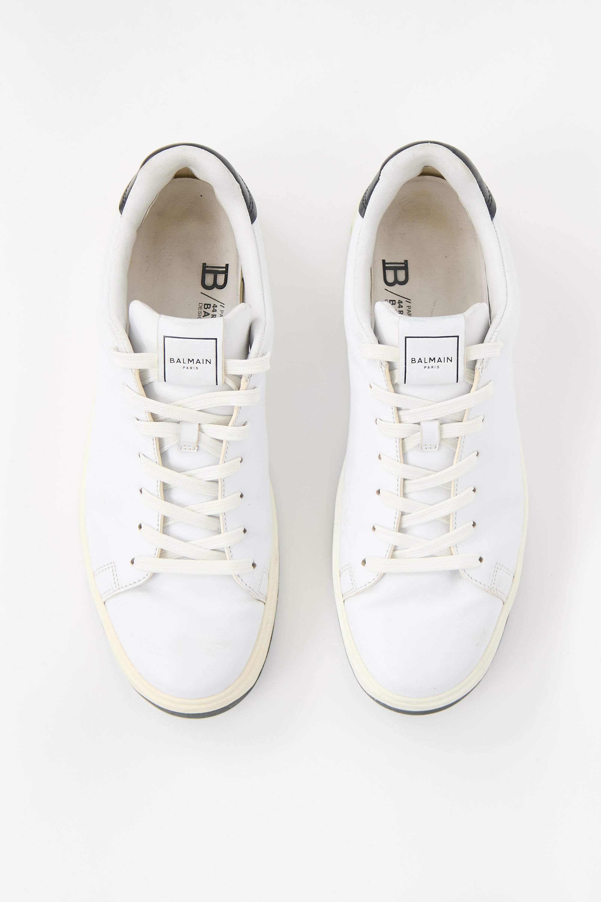 Pre-owned Balmain white leather B-Court sneakers featuring rounded toe, lace up instep, logo tab at tongue, debossed circle logo at black leather counter panel, amd cream rubber sole with embossed logo at heel.
