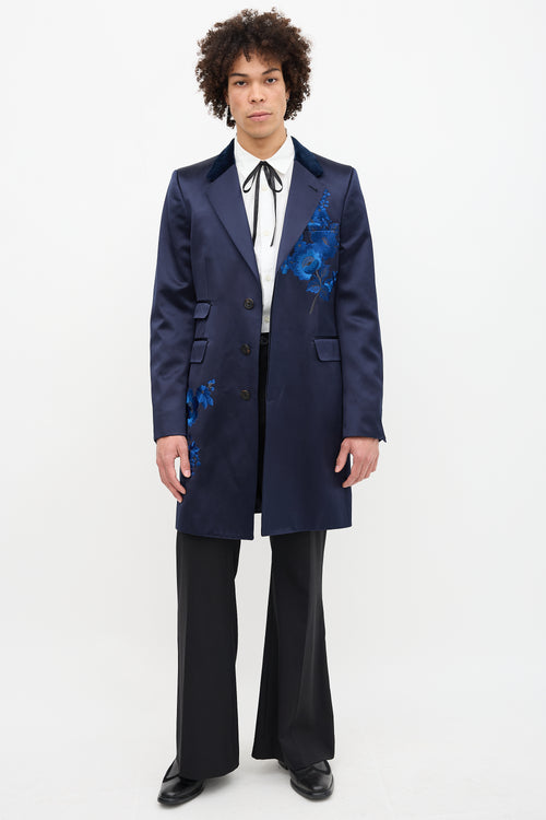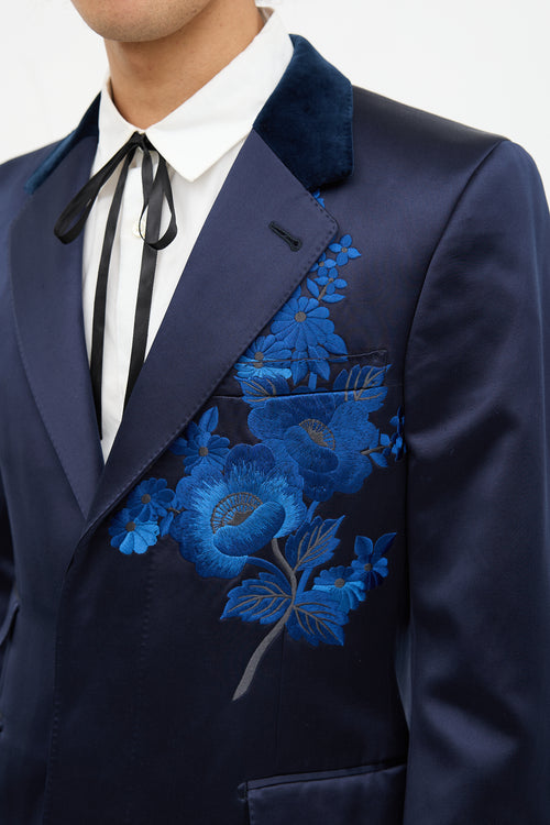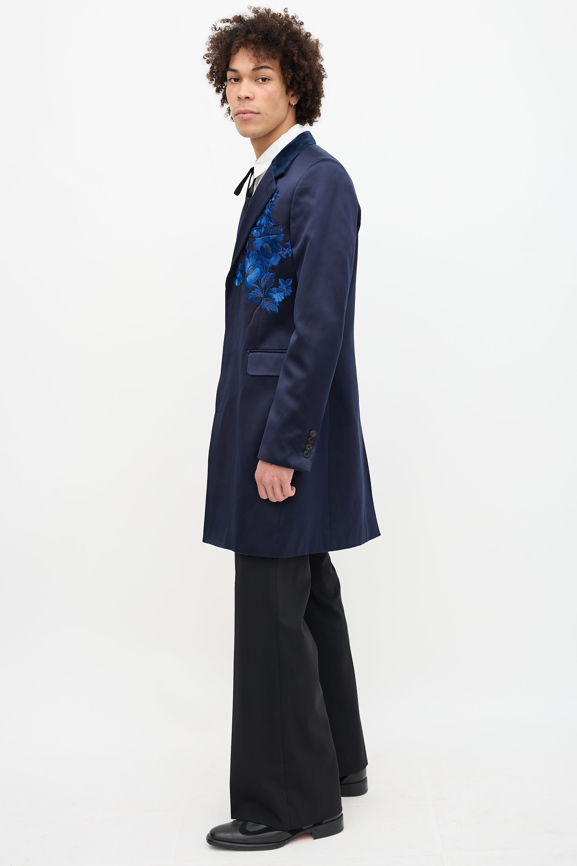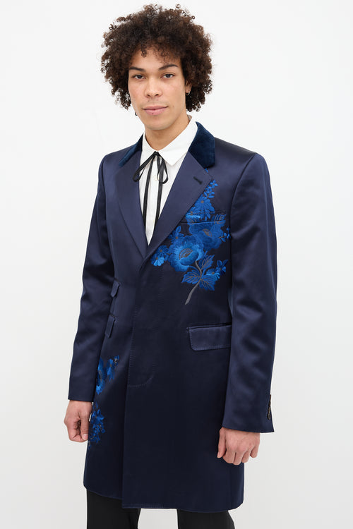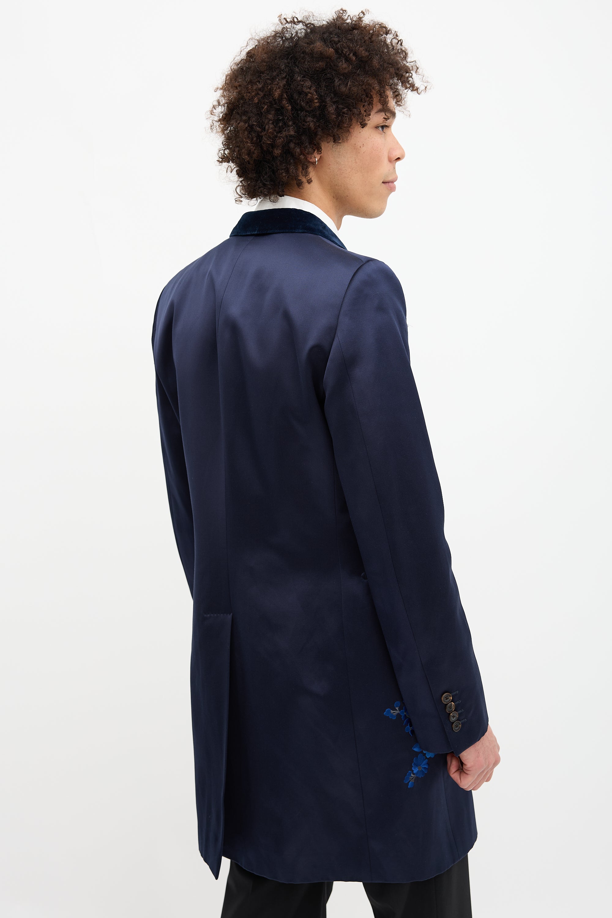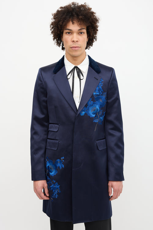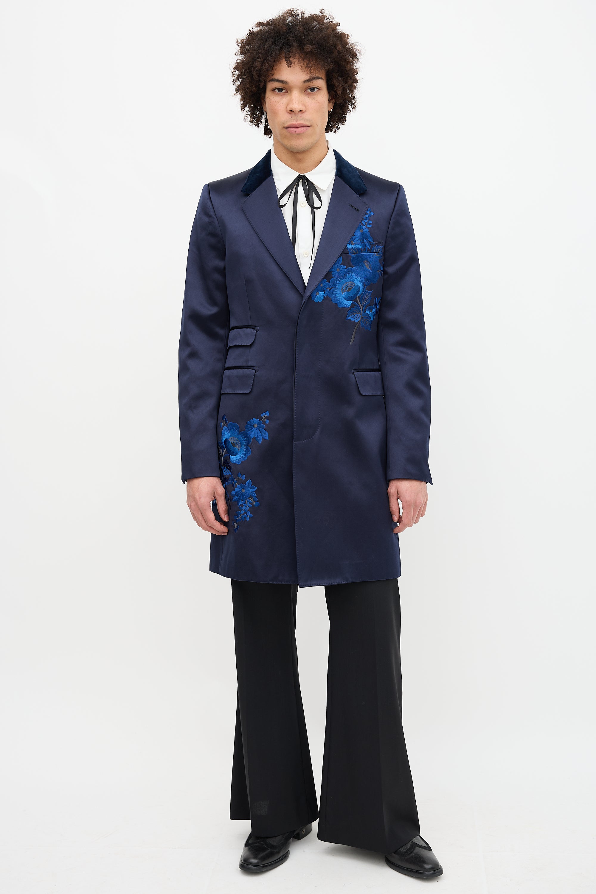 Pre-owned Alexander McQueen navy satin blazer featuring tonal floral embroidery, velvet collar, peak lapels, welt pocket at chest, three outer and two inner double welt pockets, button front and cuffs, and back vent. Lined.