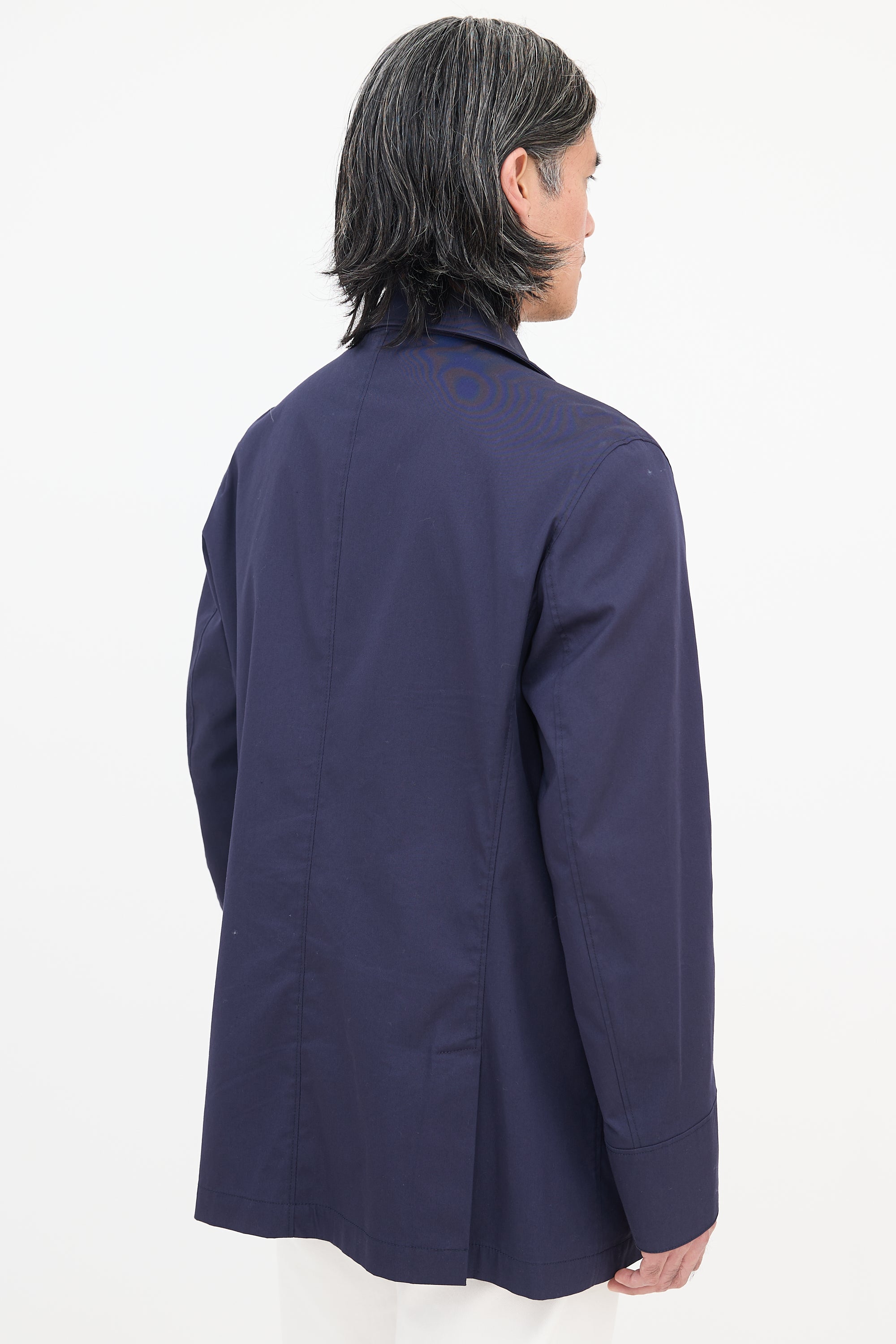 Pre-owned Brunello Cucinelli navy short coat featuring wide collar and lapel, double breasted logo button front, two front pockets, two double welt pockets and one change pocket at interior, and back double vent. Partially lined.