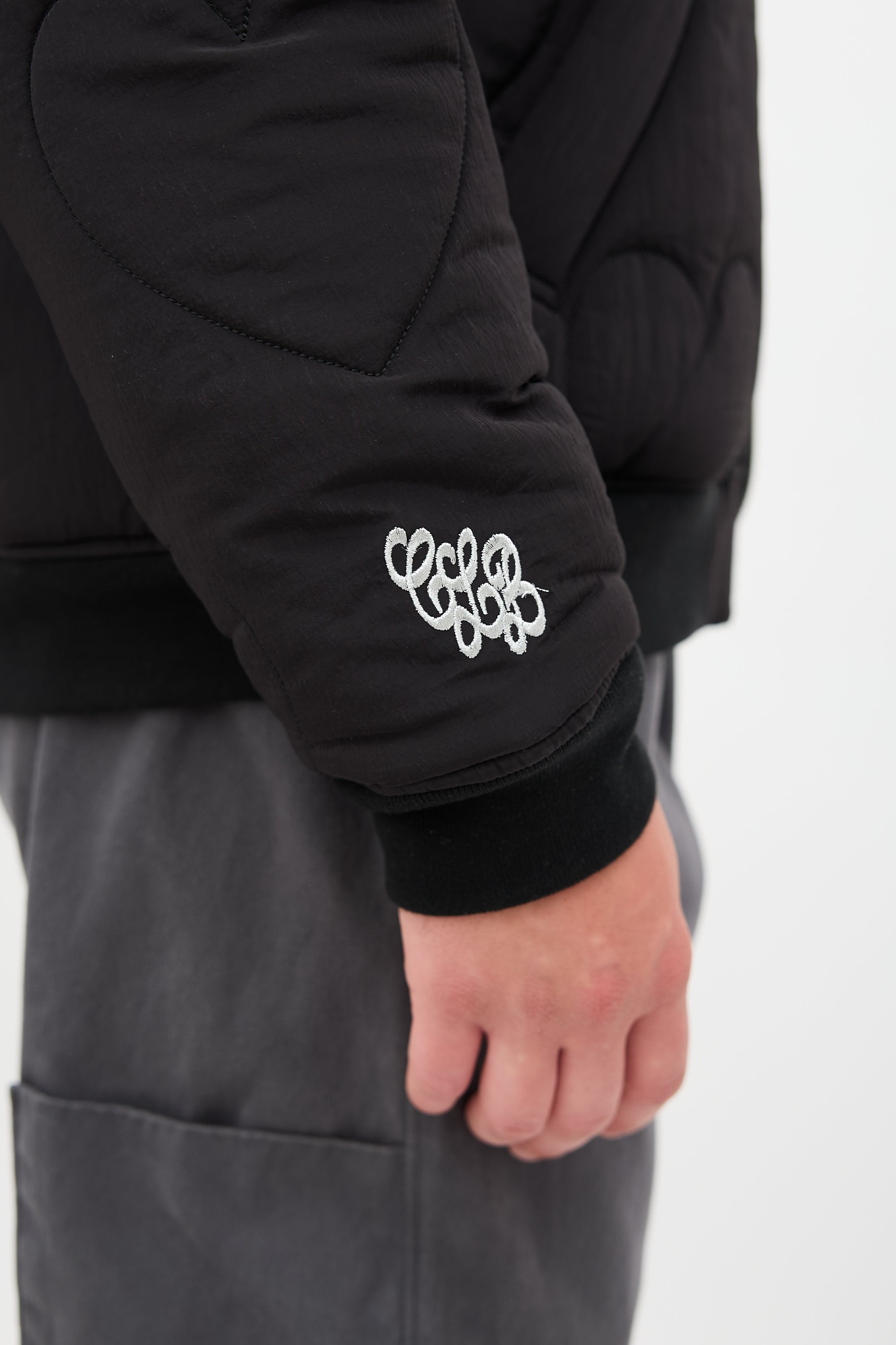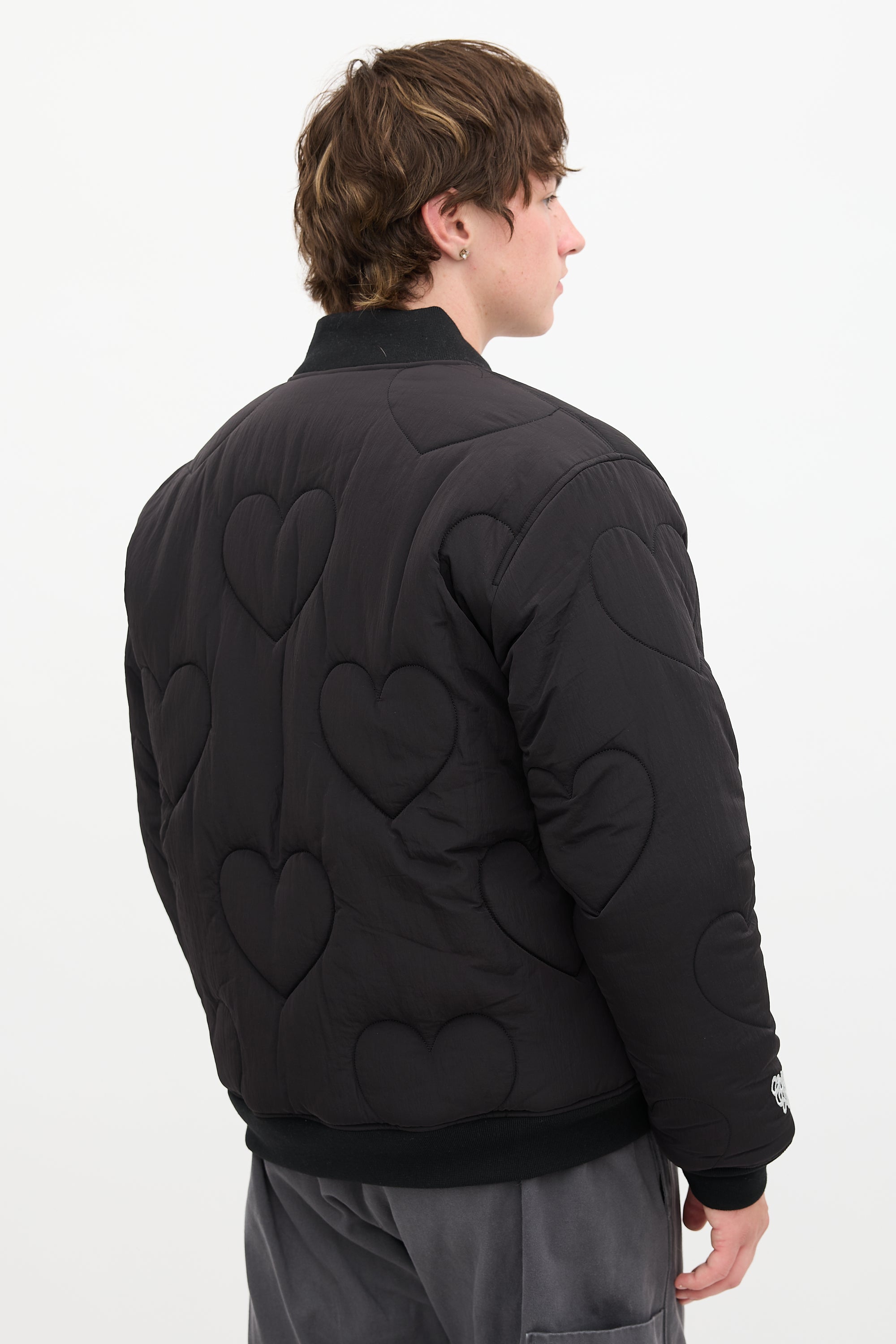 NOCTA x Nike Exclusive black Certified Lover Boy bomber jacket featuring a ribbed stand collar, quilted hearts throughout, full zip front, embroidered white check at chest, two welt pockets, CLB embroidery at right cuff, and a ribbed hem and cuffs.