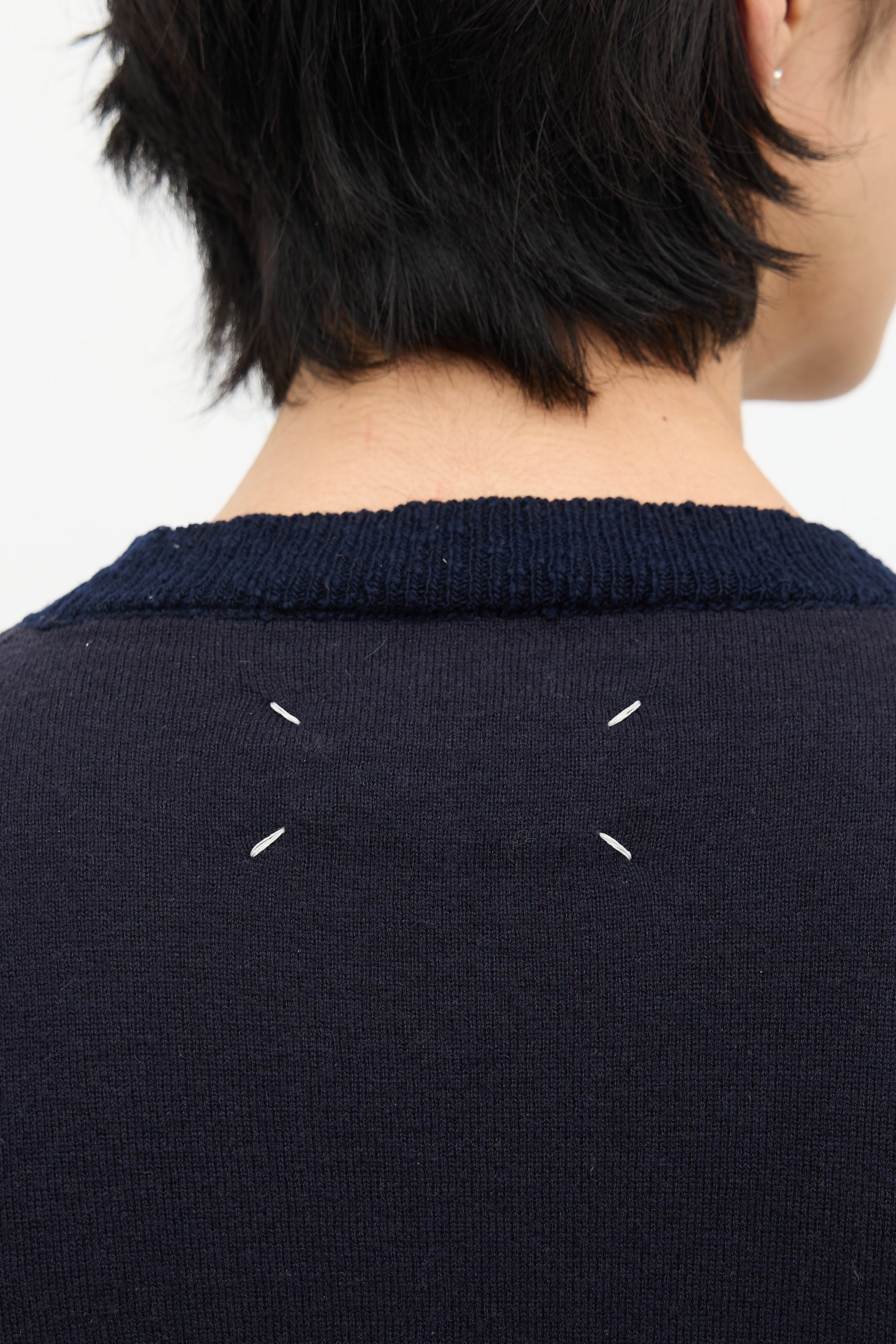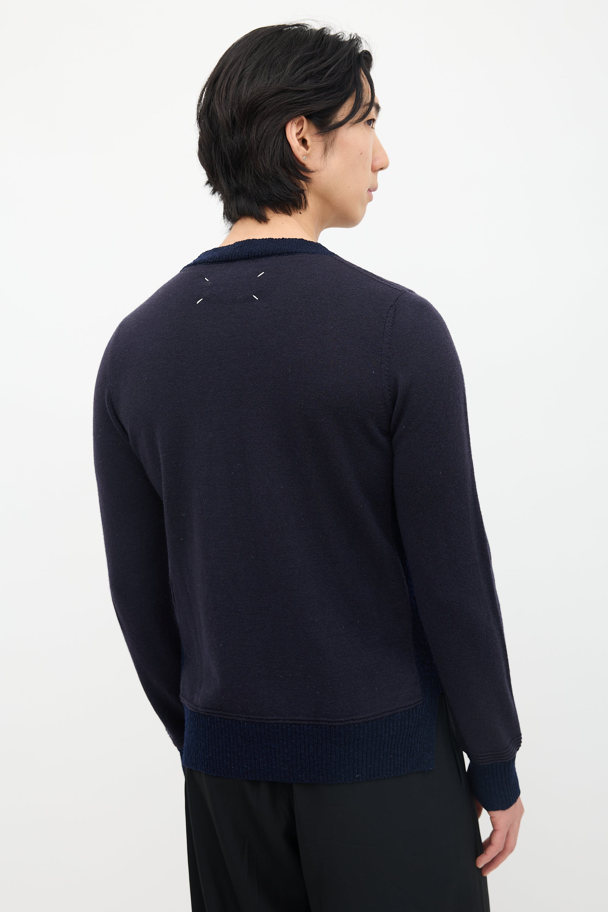 Pre-owned Maison Margiela navy wool sweater featuring crew neckline, signature four white stitches at upper back, side vents, and ribbed collar, sides, hem, and cuff panels.
