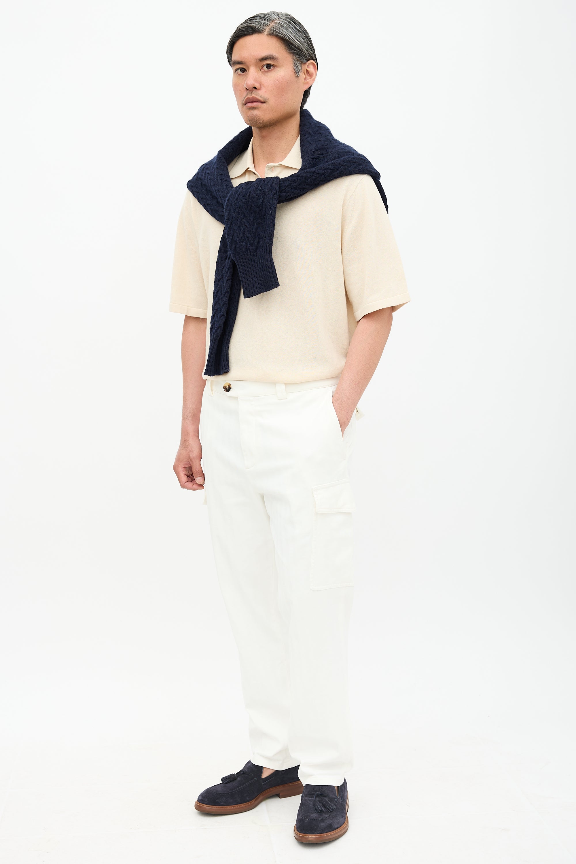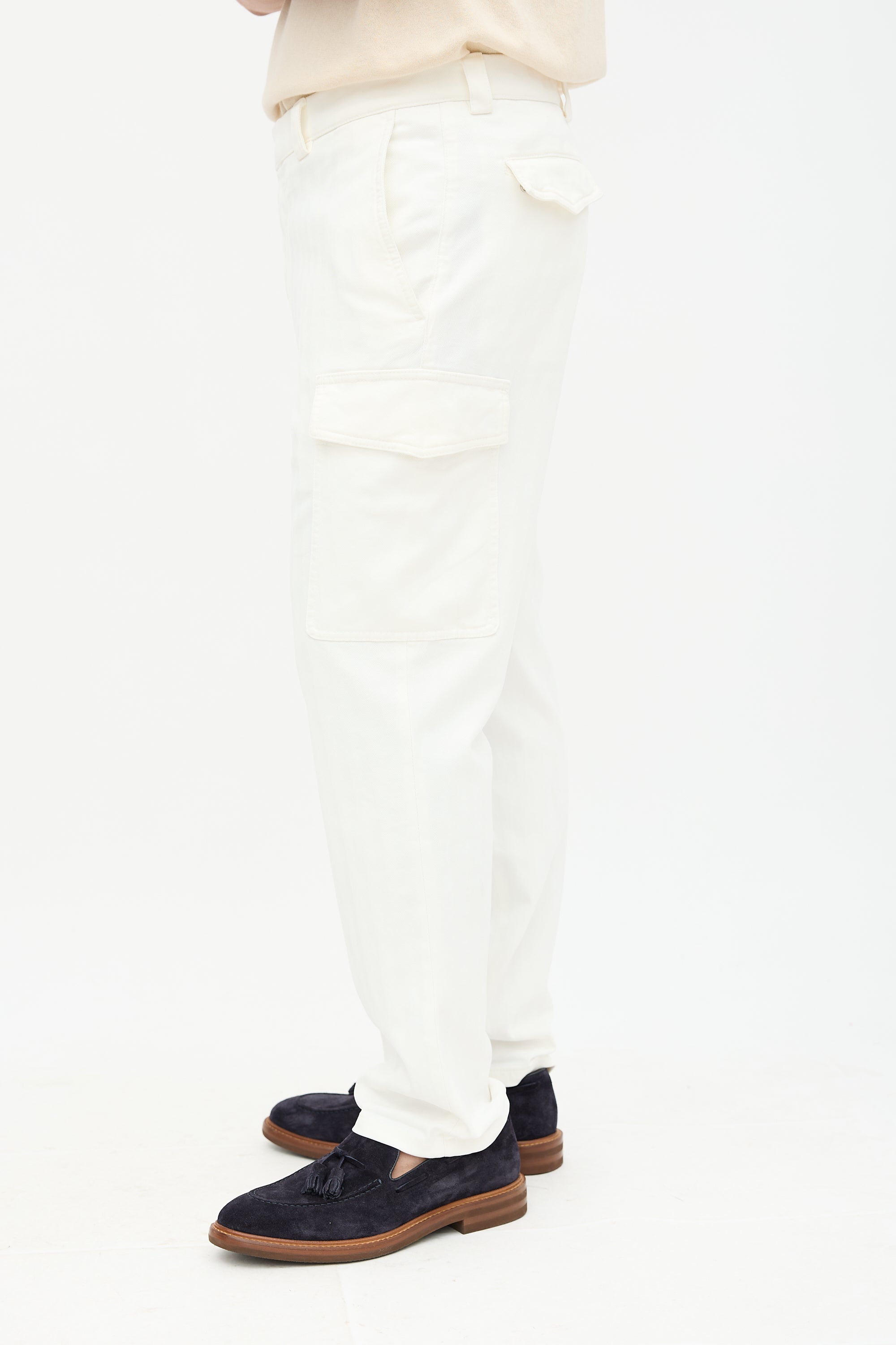 Pre-owned Brunello Cucinelli white leisure fit trousers featuring tonal jacquard stripes, four pocket styling, zip fly with button closure, and tapered leg with two cargo pockets at outseam.