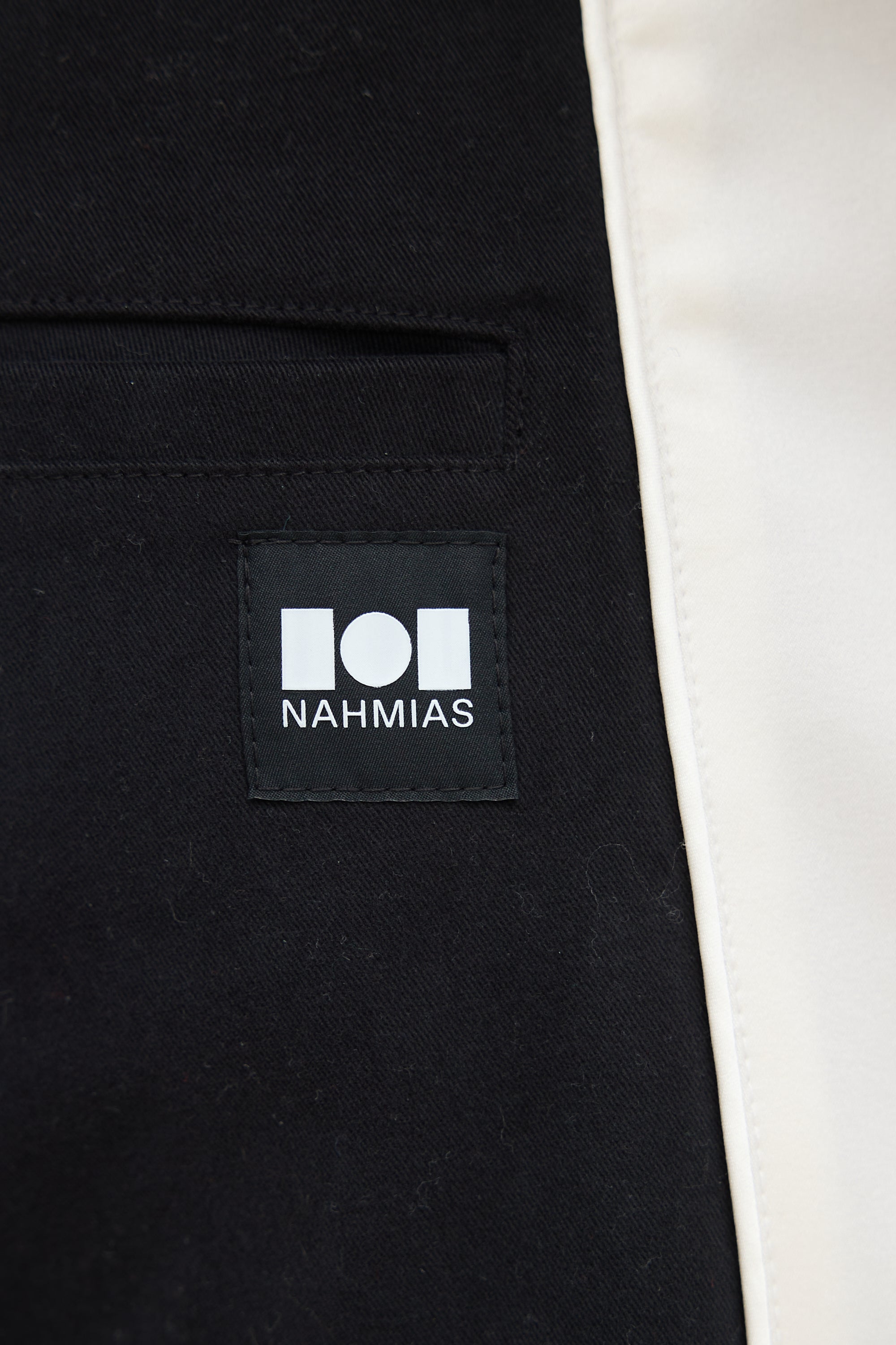 Pre-owned Nahmias black P.E. track pants featuring elasticized drawstring waist, straight leg, white side stripes with button embellishment, two back welt pockets, and logo tab at right pocket.