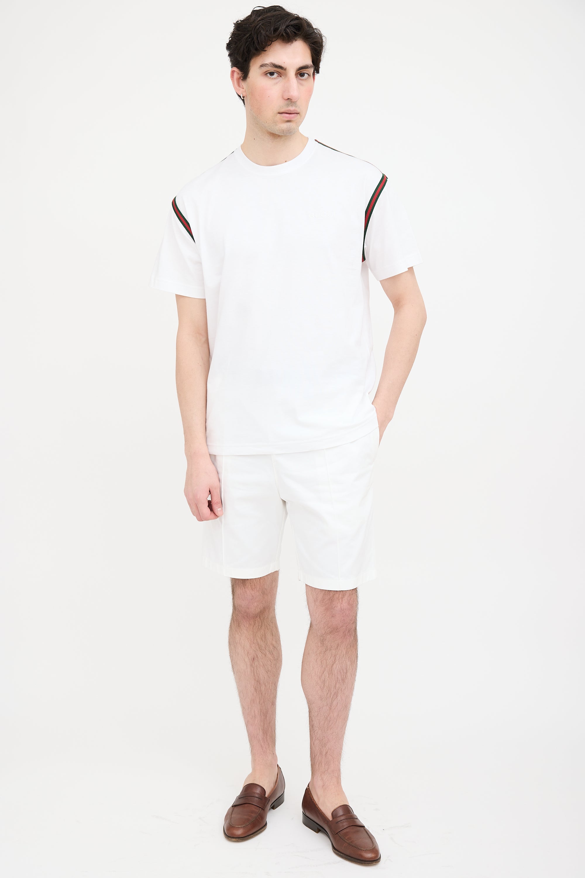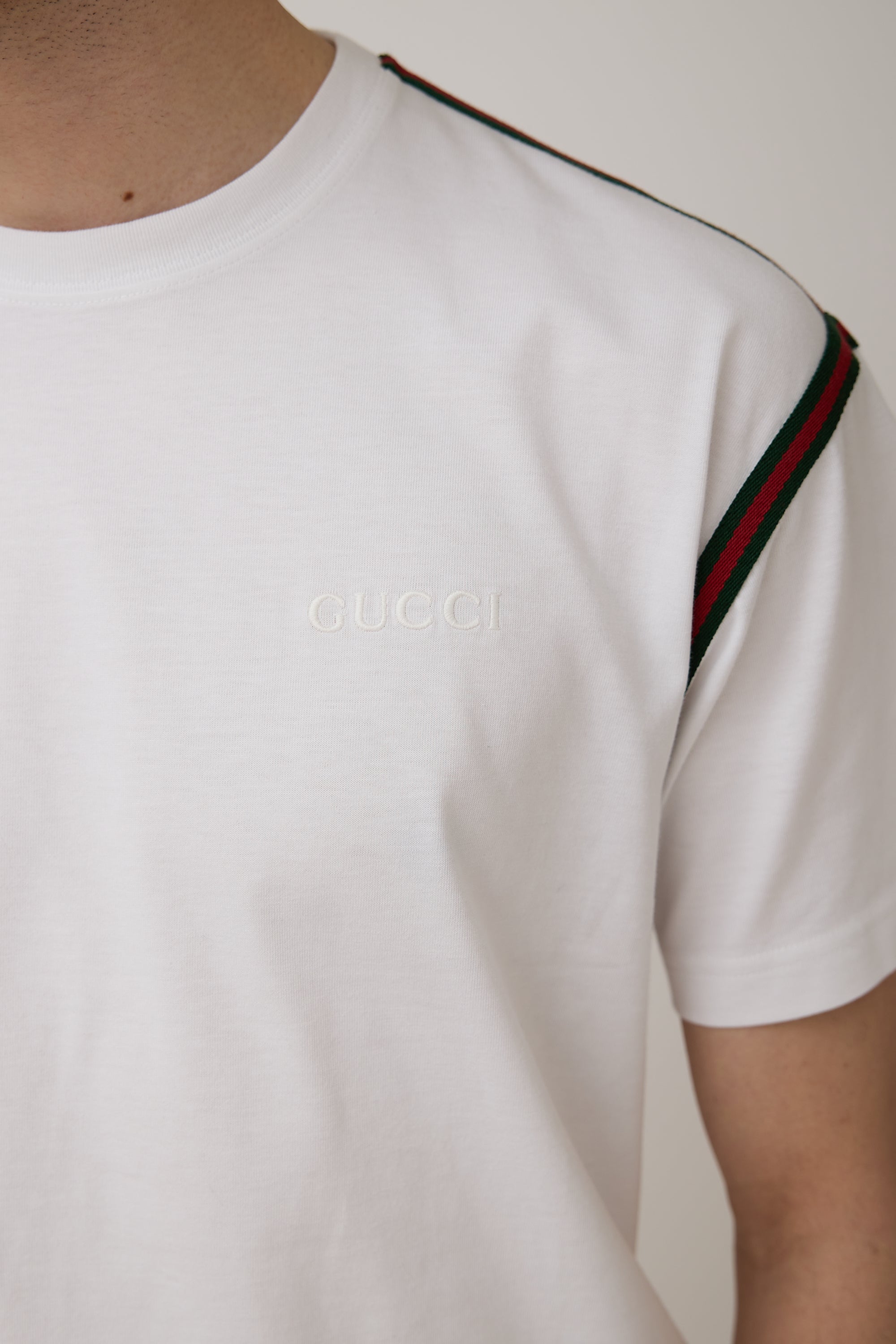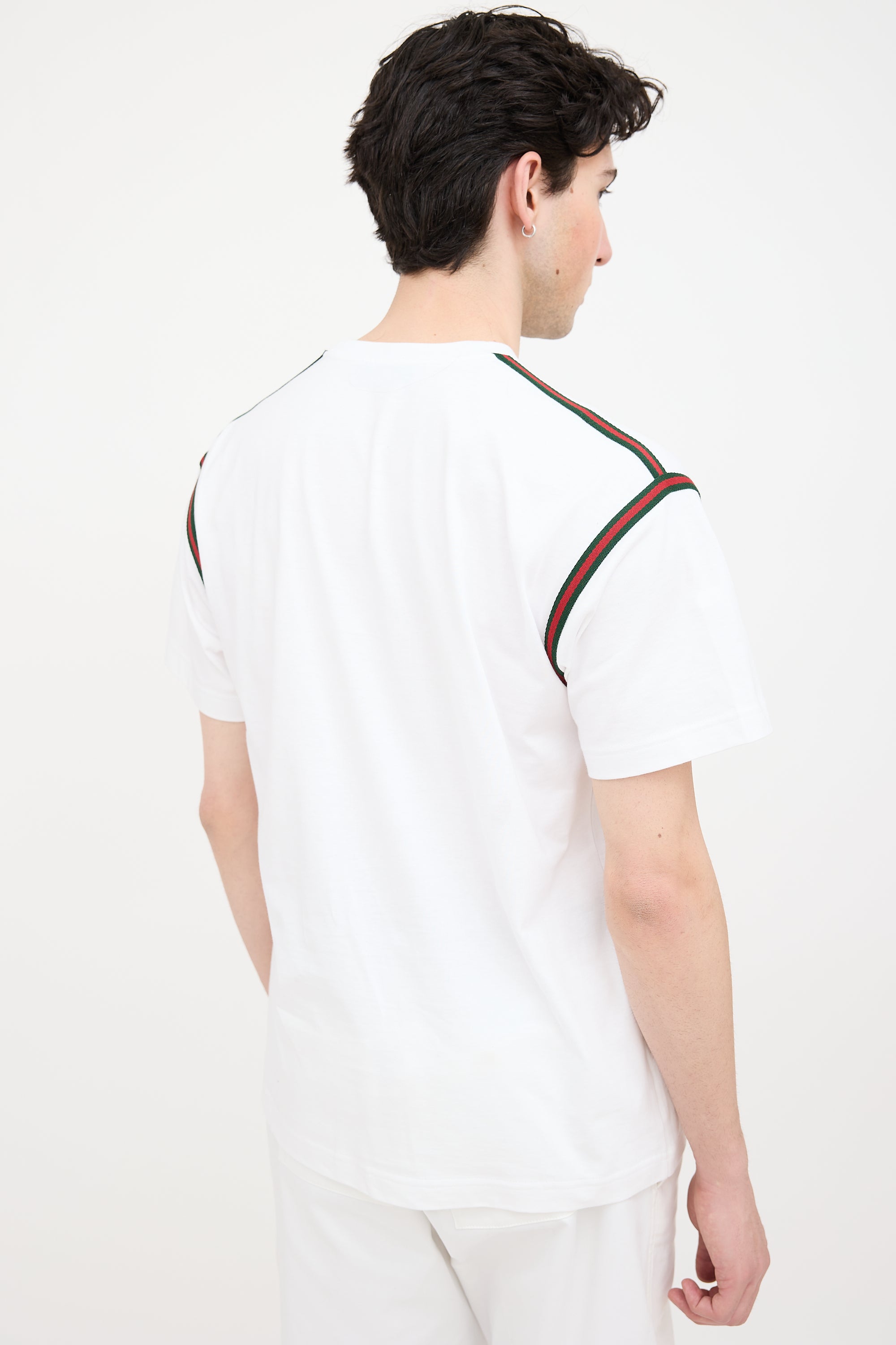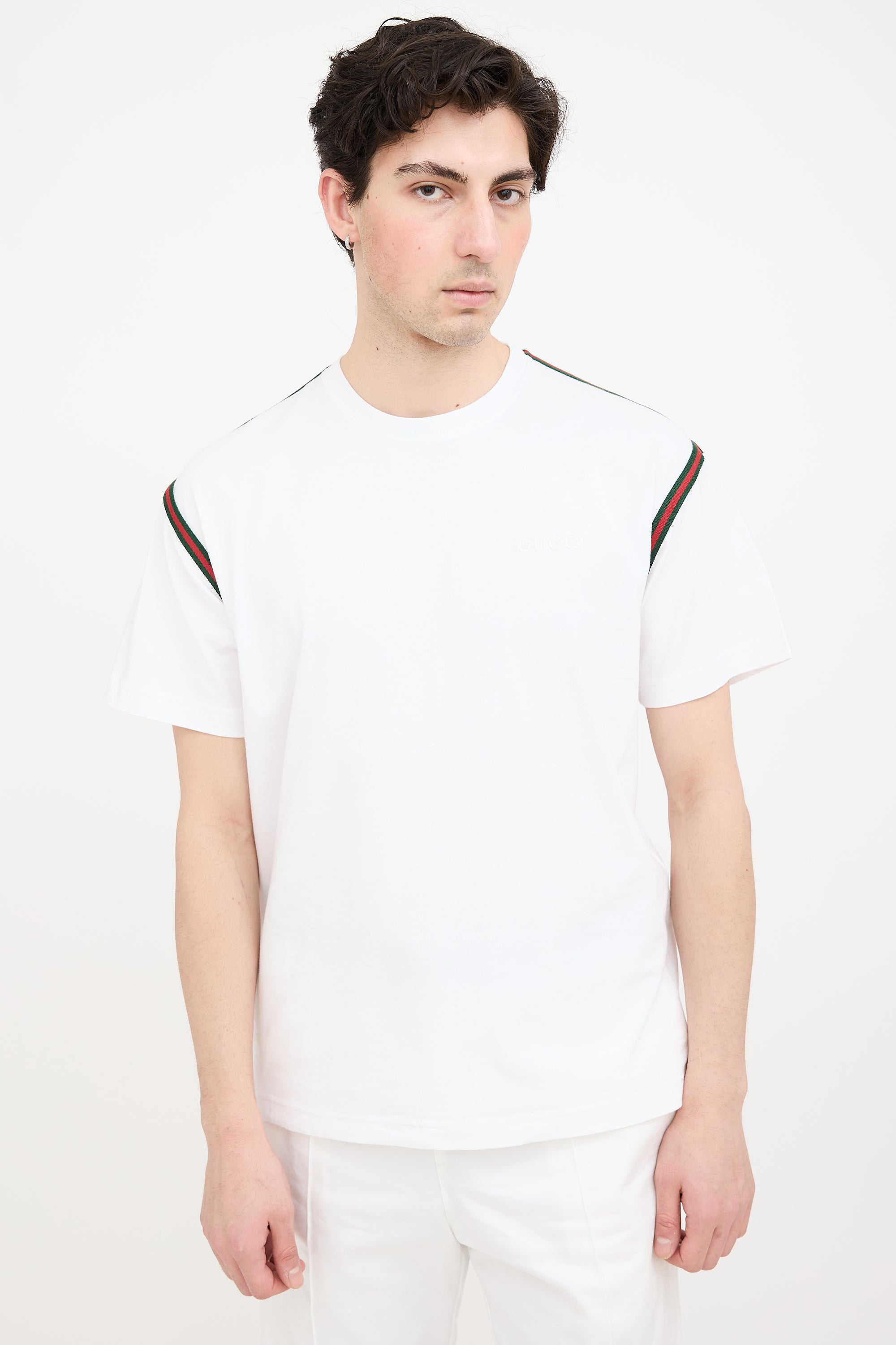Pre-owned Gucci white cotton T-shirt featuring a crew neckline, signature red and green webbed trim at shoulder and sleeve, and tonal embroidered logo at left chest.
