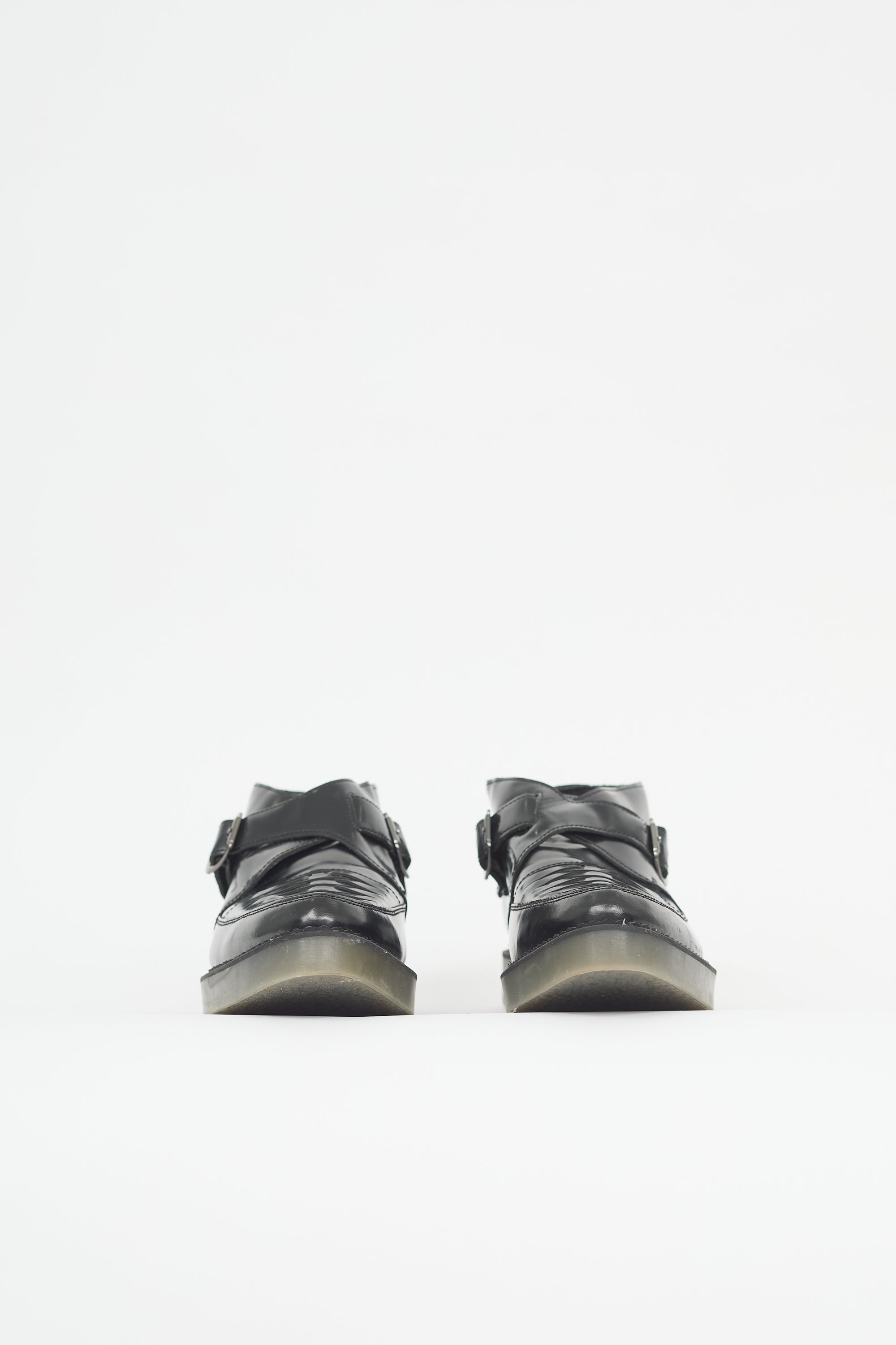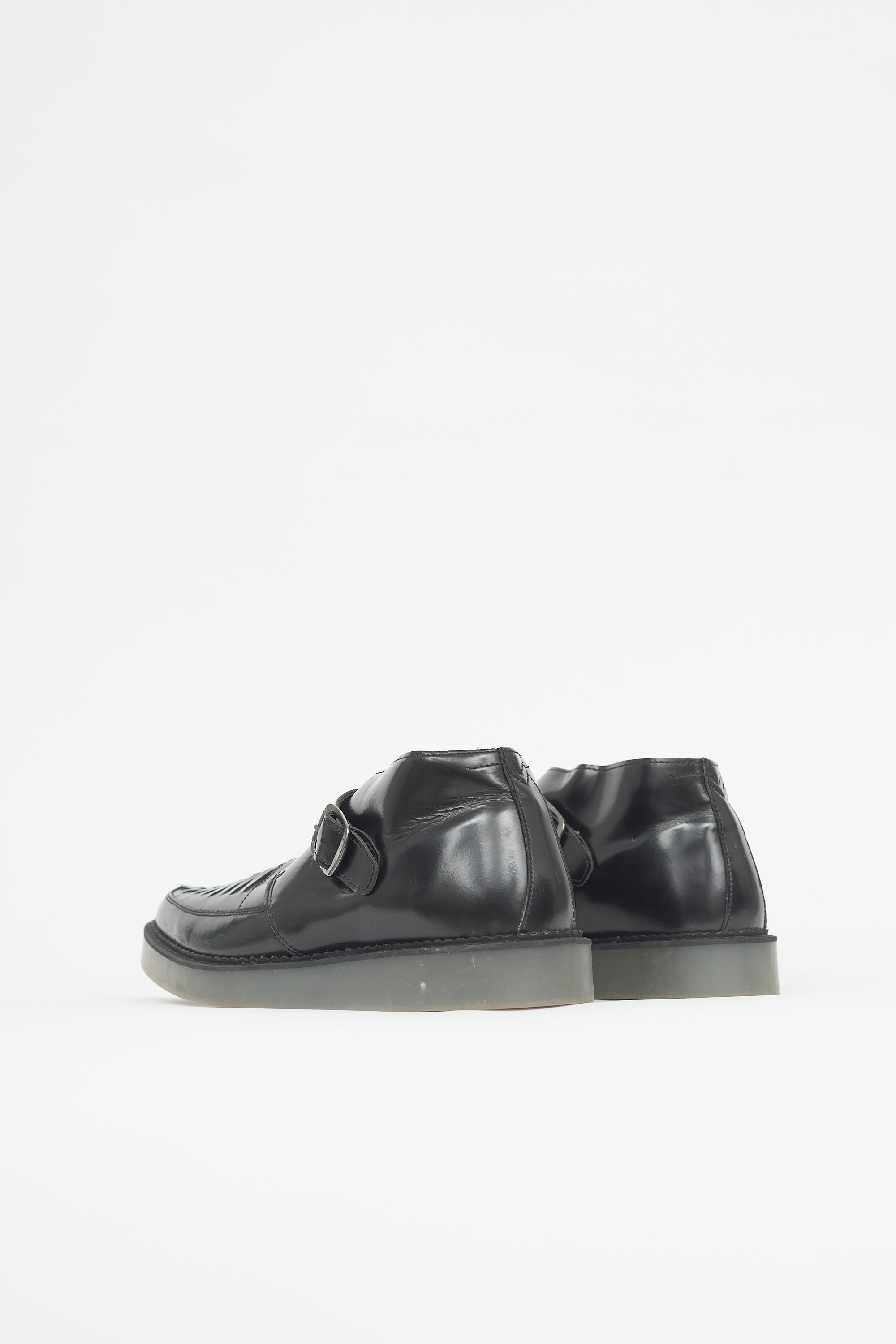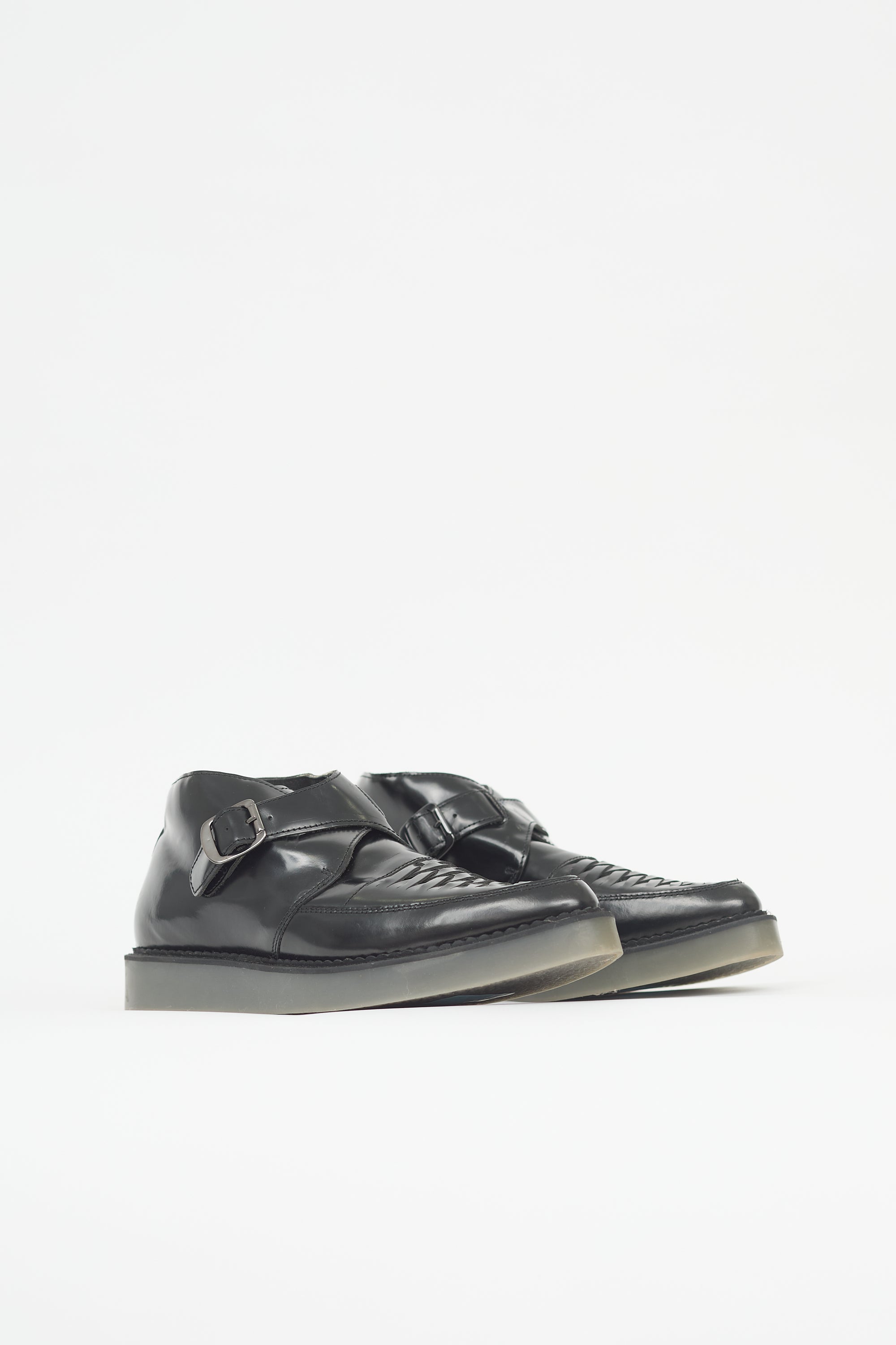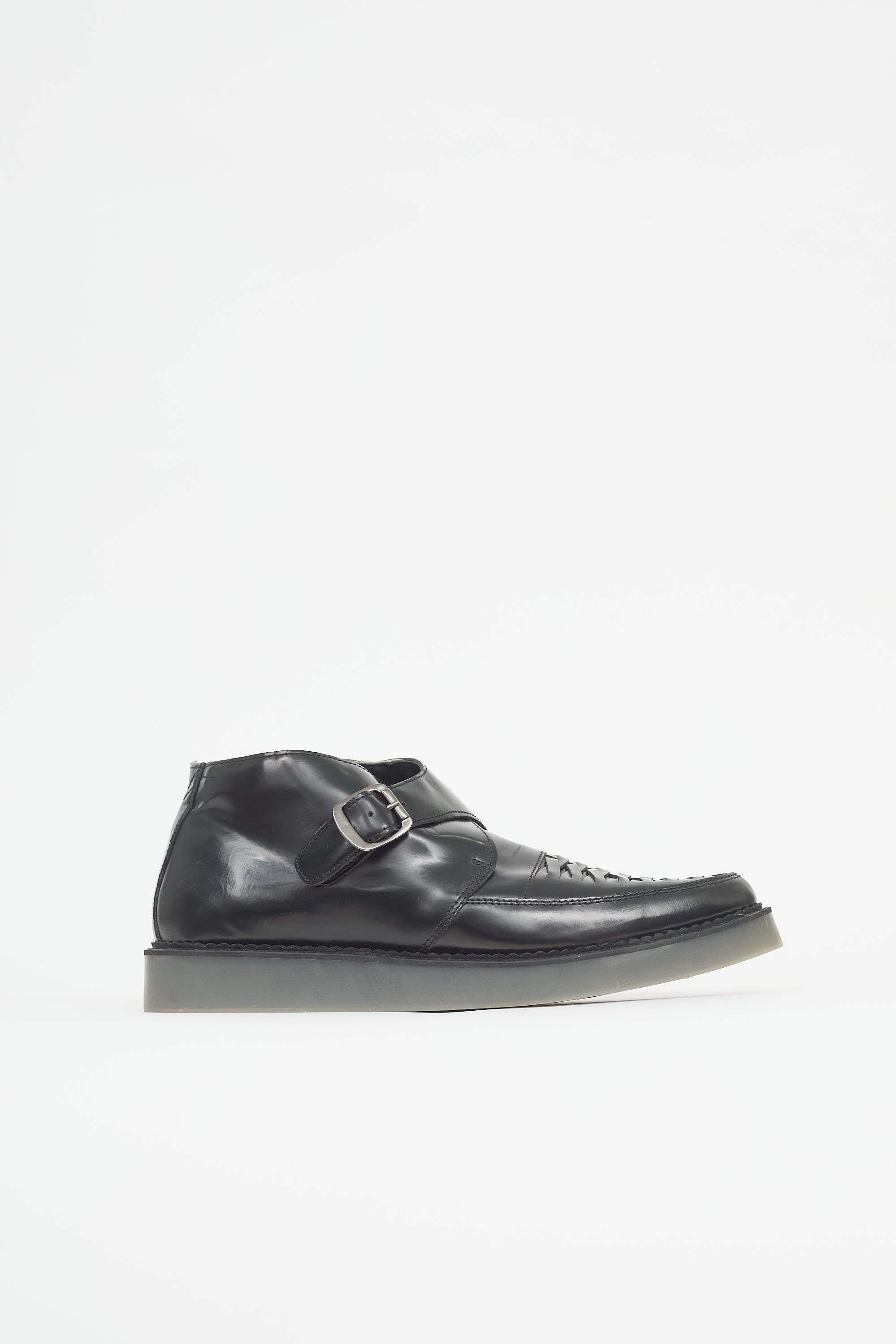 Pre-owned Diesel black leather dress shoes featuring almond toe, woven vamp, criss cross instep strap, and rubber sole.
