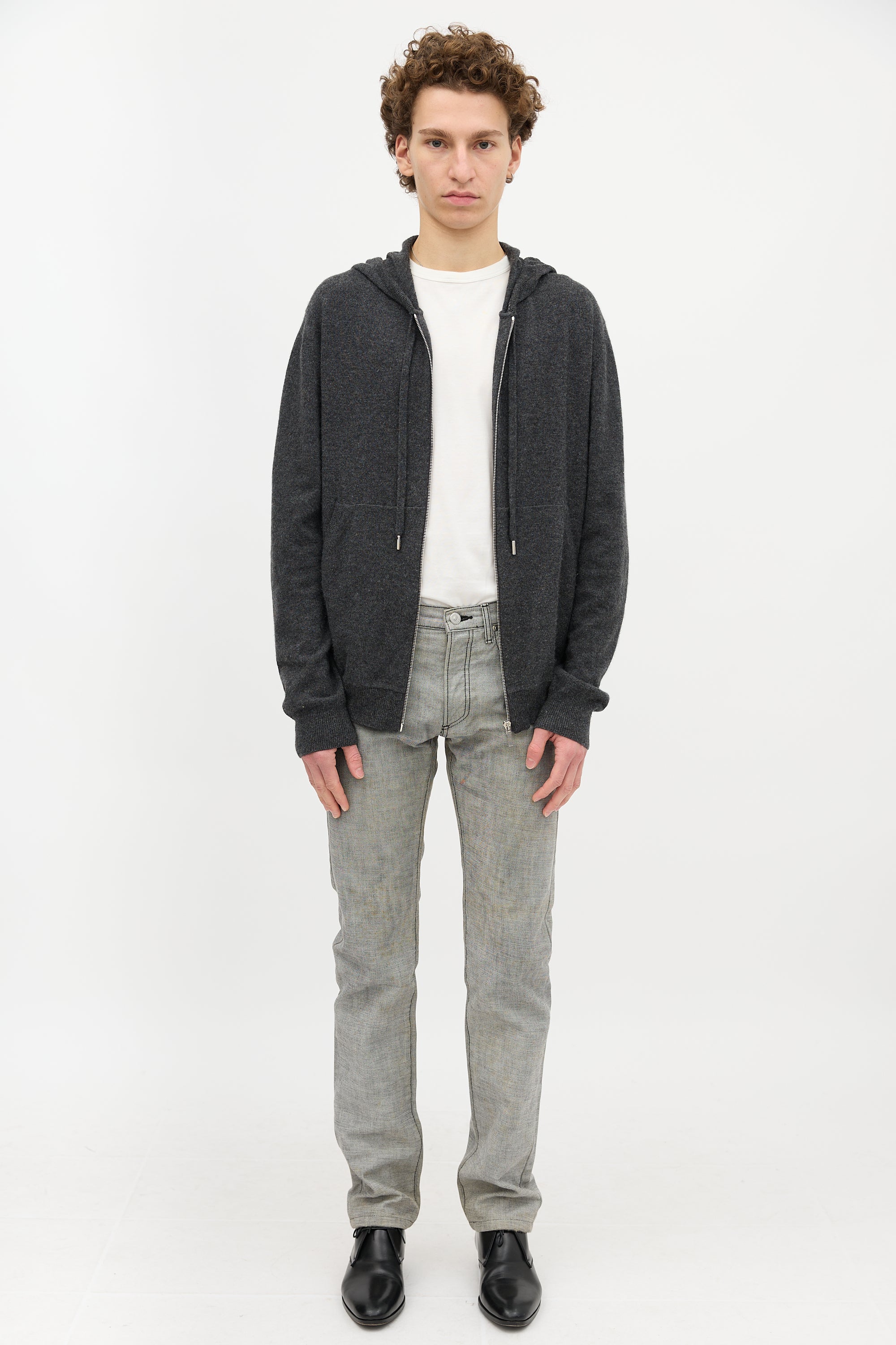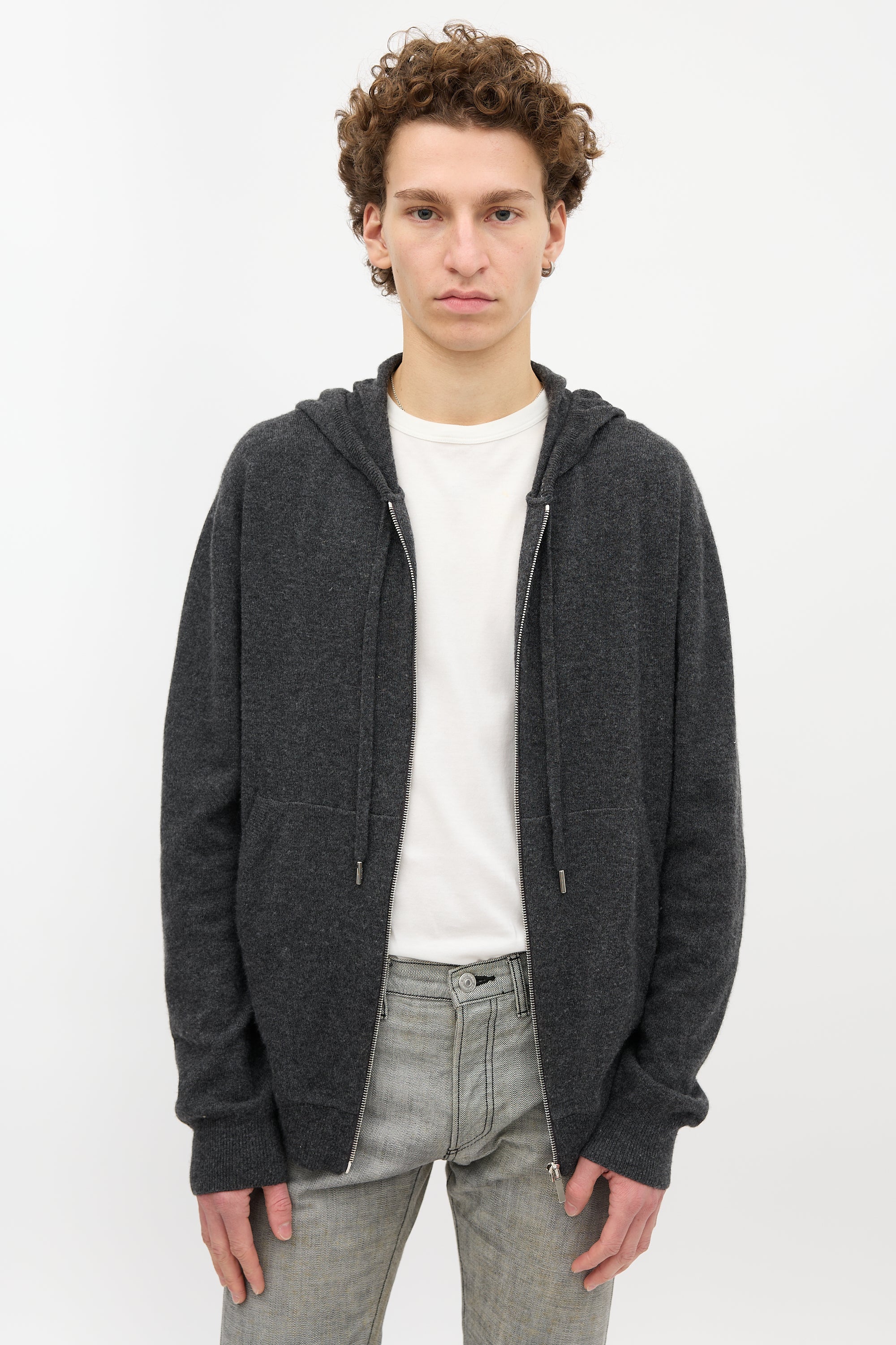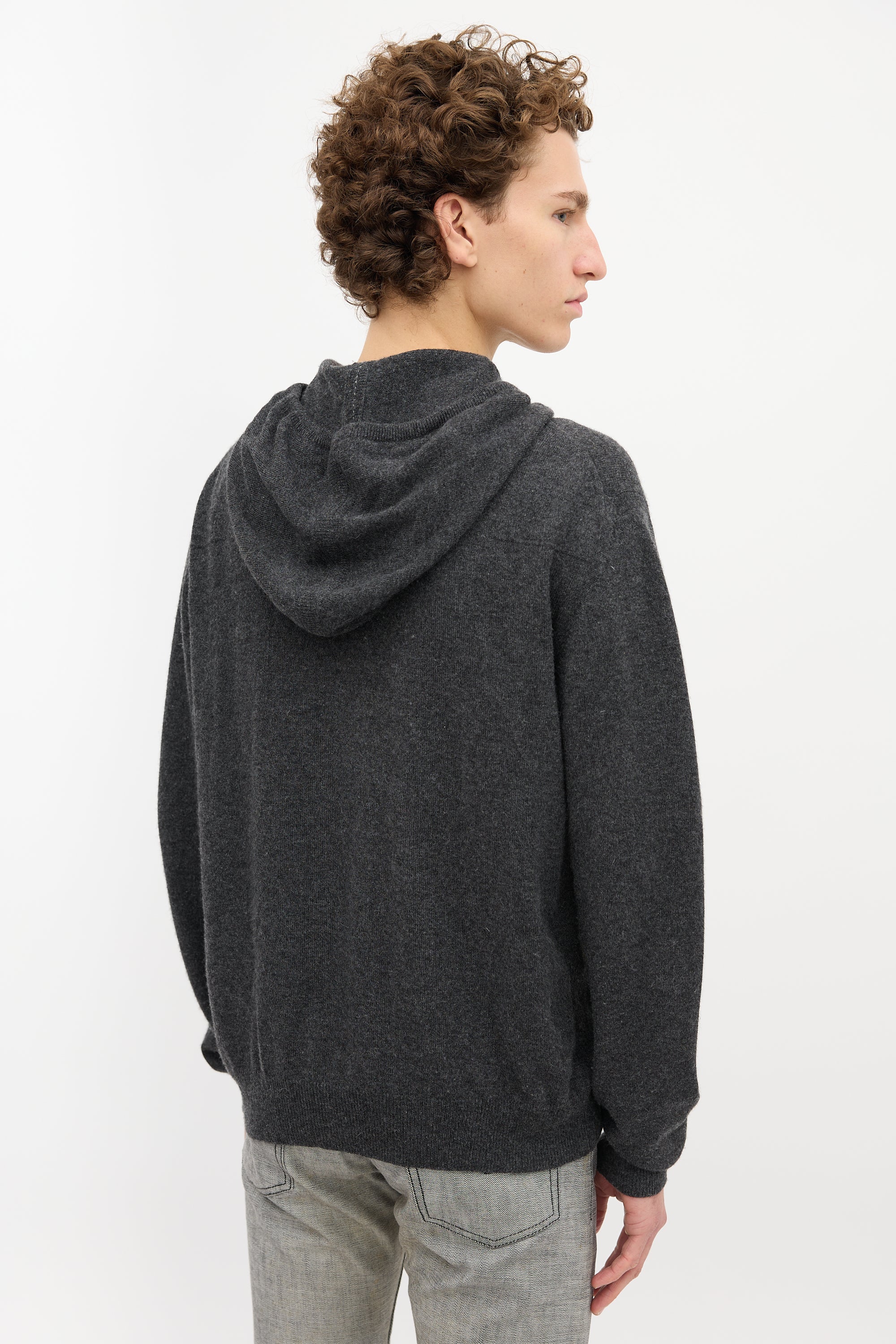 Pre-owned Dior grey cashmere sweater featuring an attached drawstring hood, zip front, split kangaroo pocket, and a ribbed hem and cuffs.
