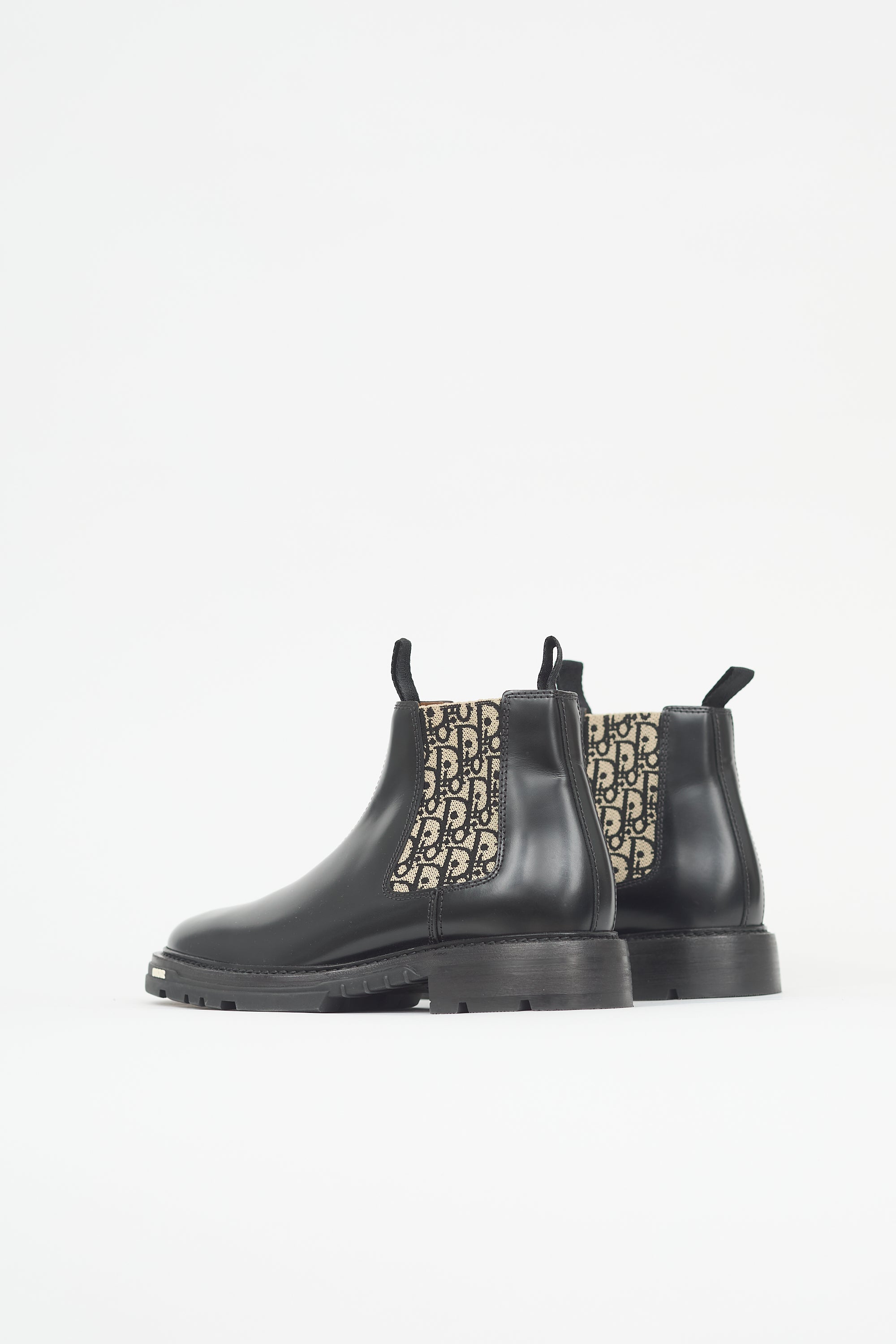 Pre-owned Dior black leather Explorer II Chelsea ankle boots featuring rounded toe, beige and black oblique elastic side panels, pull tabs at front and back topline, and treaded rubber sole with white logo embellishment at outer toe.