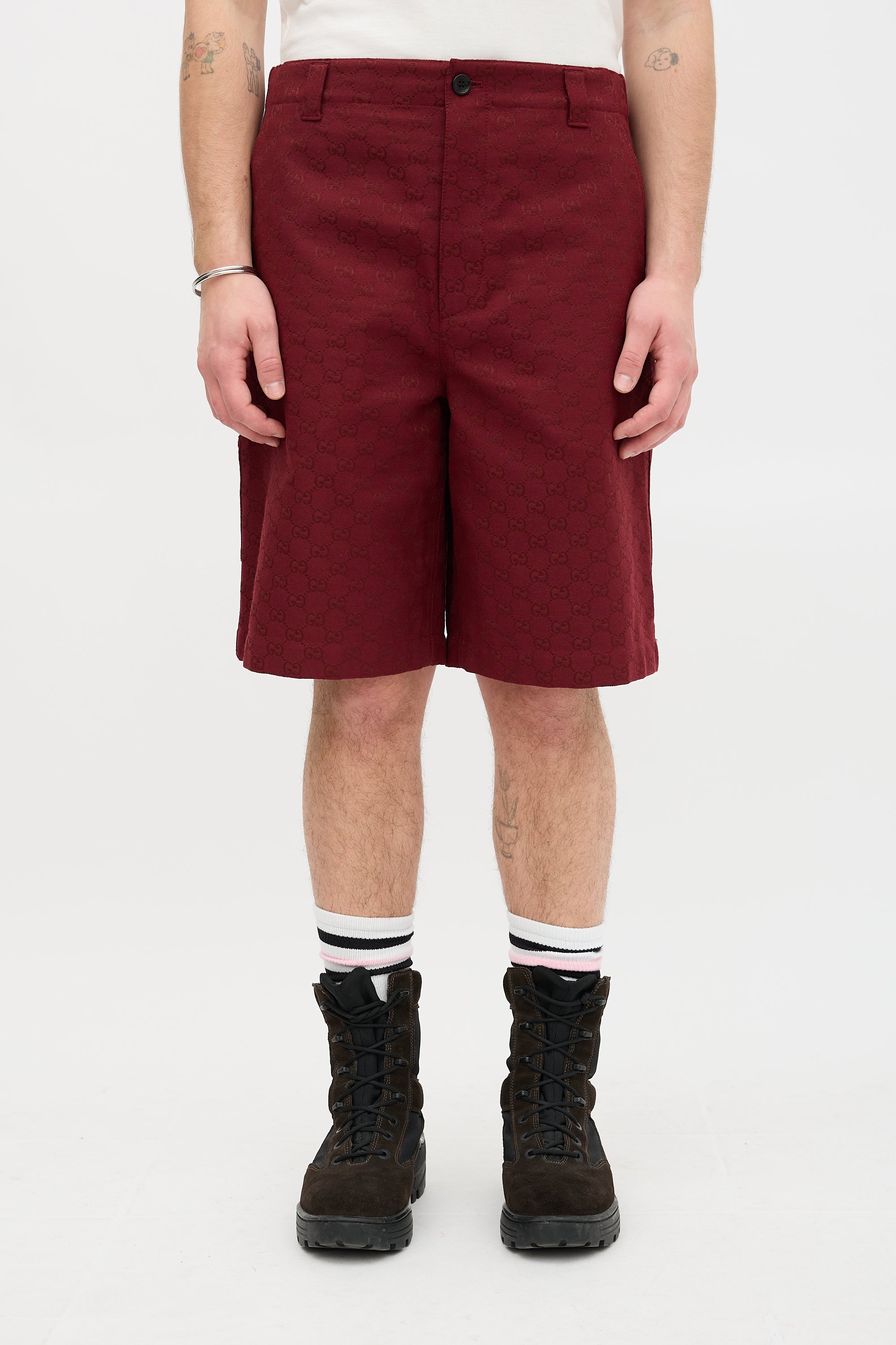 Pre-owned Gucci burgundy canvas shorts featuring a tonal GG monogram throughout, zip fly, four pocket styling, belt loops, tool loop at outseam and pocket at outseams, and a red and green webbed tag at back.