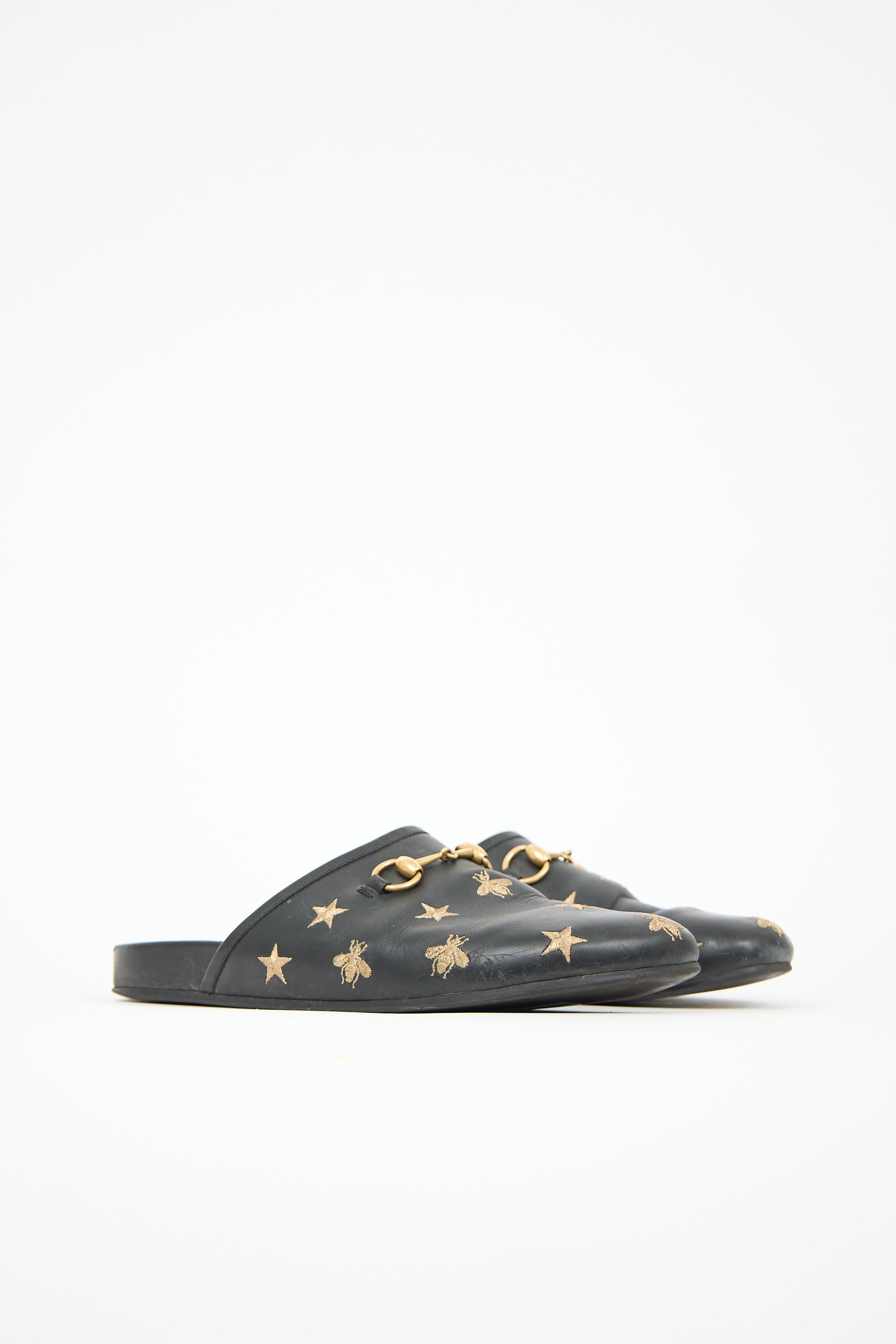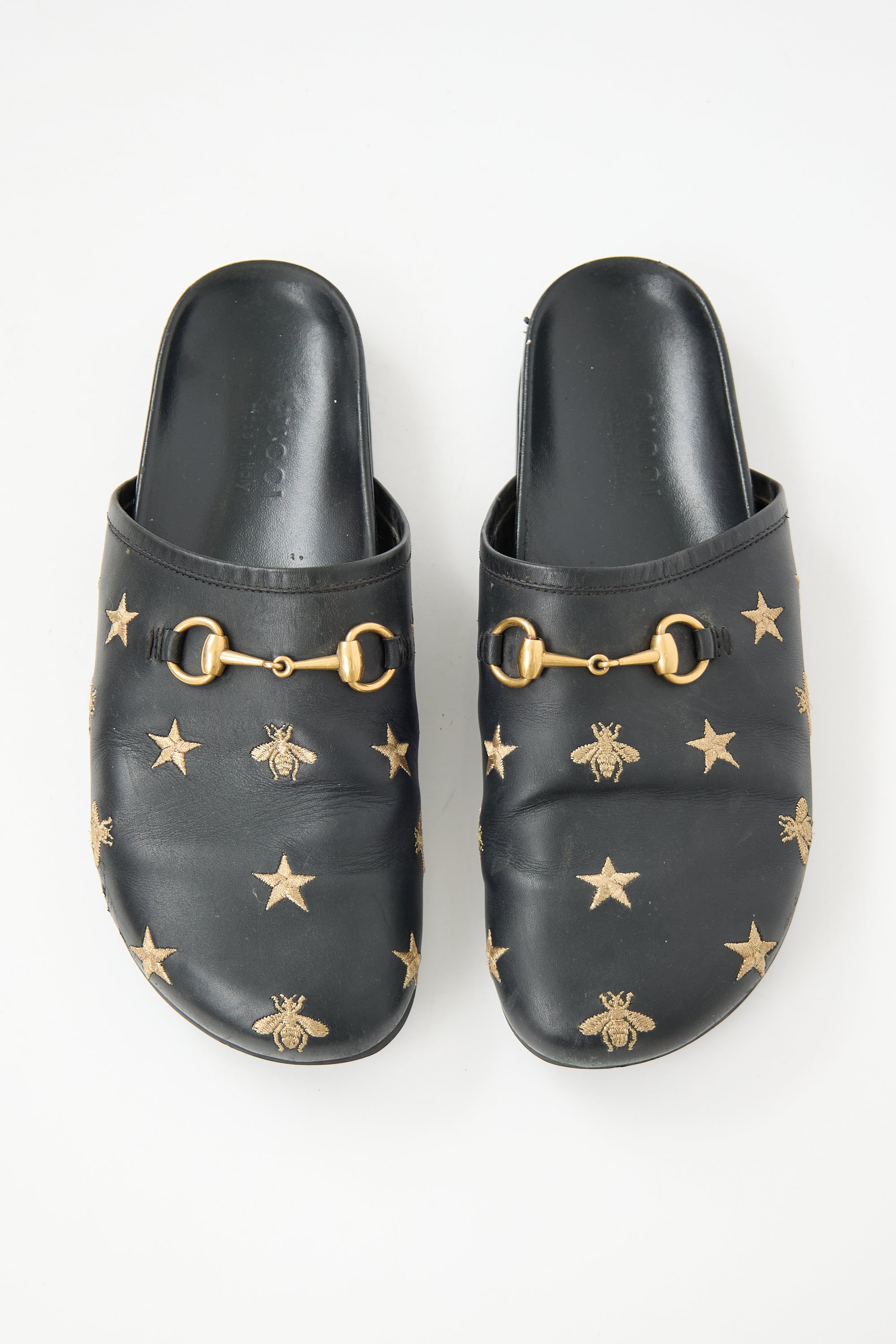 Pre-owned Gucci black leather River mules featuring rounded toe, gold embroidered bee and star, gold tone Horsebit hardware, and molded footbed.